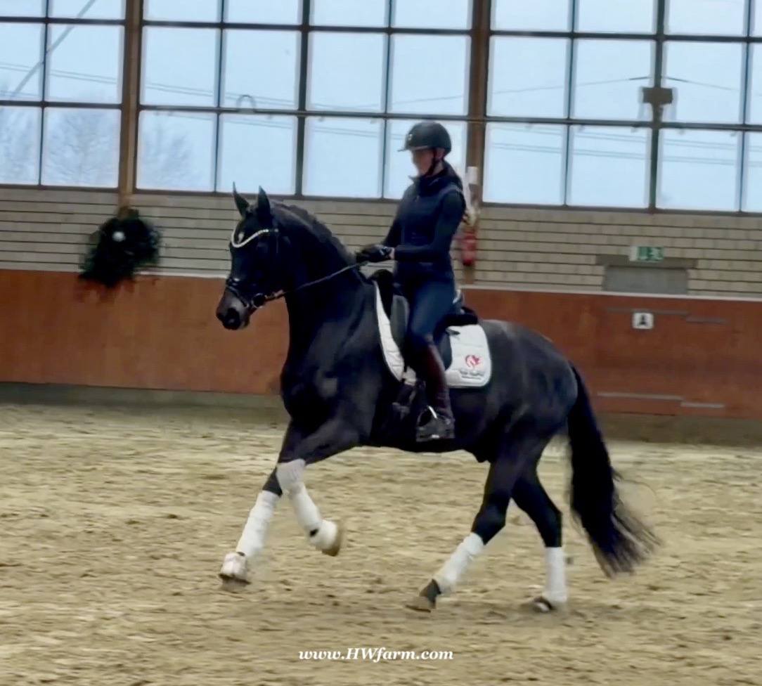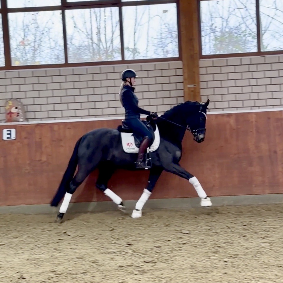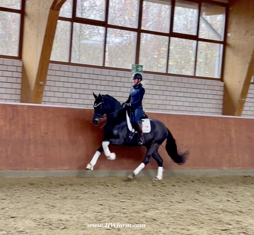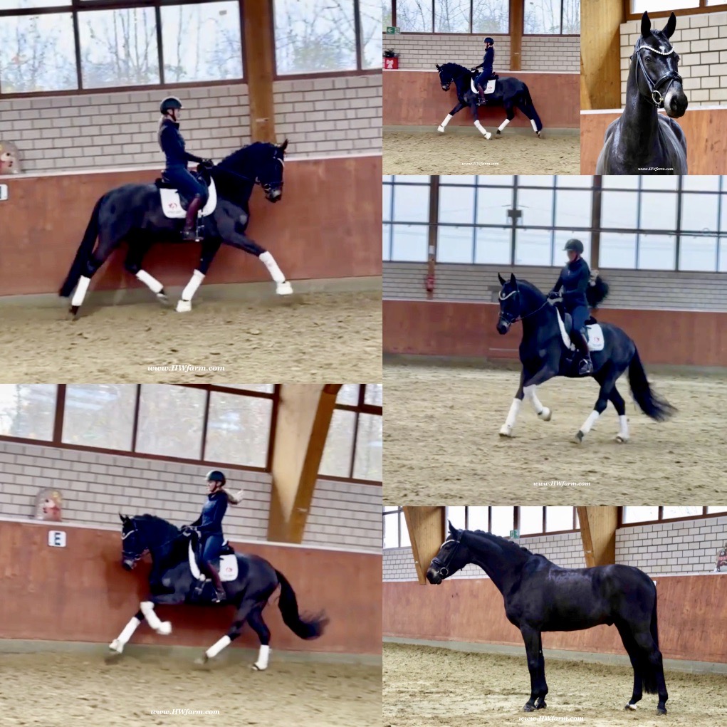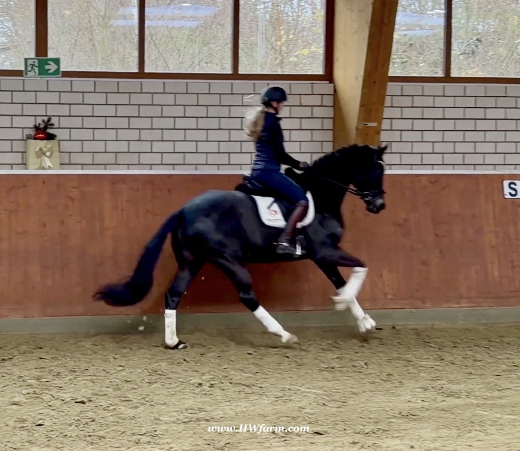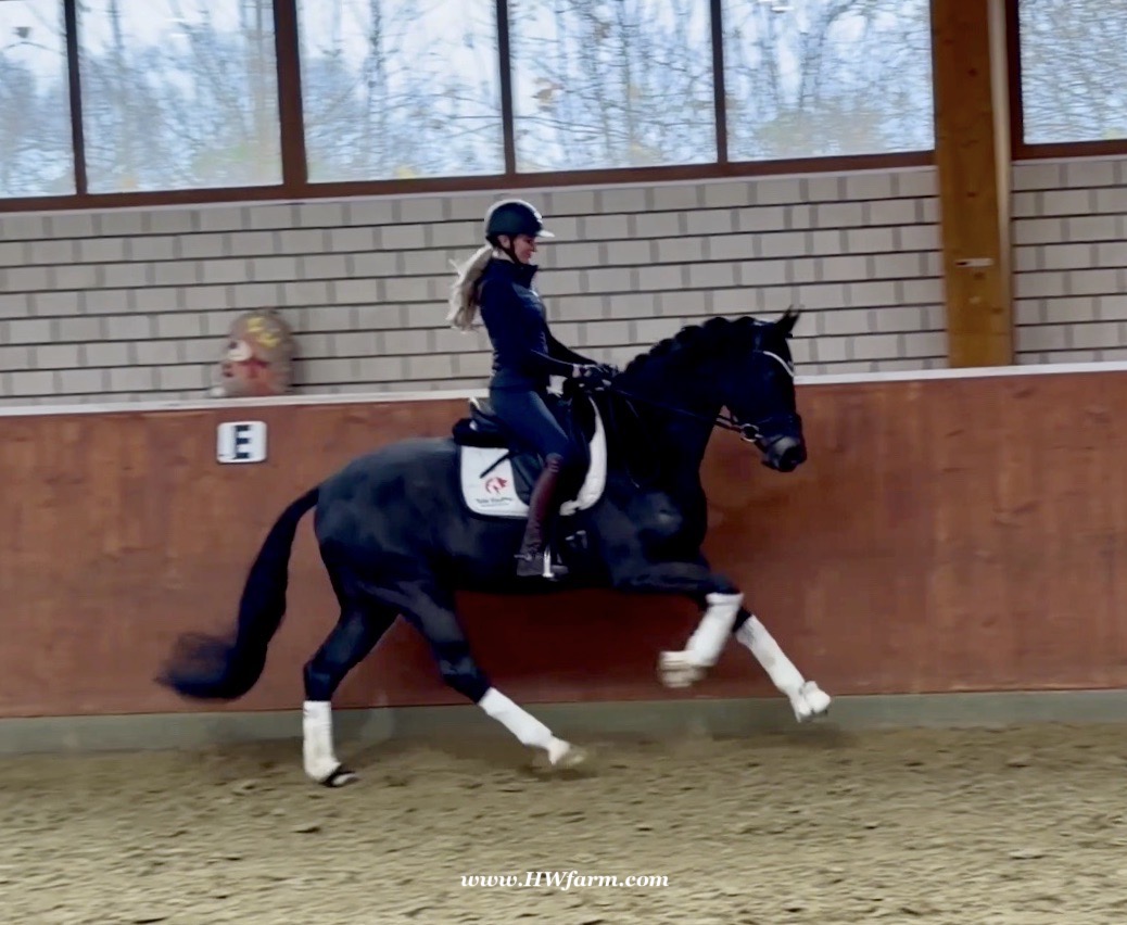 EscaHit HW, black/bay Westphalian gelding, by silver and bronze medallist at the World Championships for young dressage horses Escamillo/German national champion, World Champion of six-year-old dressage horses Sandro Hit, born in 2020, standing approximately 169 cm or 16.2 hands. EscaHit HW has an impressive pedigree and his famous sire is Escamillo, Vice World Champion of six-year-old dressage horses Bronze medal World Championship of seven-year-old horses "What an amazing performance," the judges praised Escamillo's performance in the World Championship final for seven-year-old dressage horses in their commentary, "we love this horse and see a very big future in him." Once again, Escamillo received dream scores at this prestigious meeting of the world's best young dressage horses. 9.5 for trot and perspective, 9.0 for walk and canter, 8.5 for submission - and a fantastic 91 percent and the bronze medal. The year before, Escamillo, ridden by the Spanish rider Manuel Dominguez Bernal, who rides for Helen Langehanenberg's yard, had already received scores of 9.0 and higher in the World Championship's arena, earning him the silver medal in the six-year-olds class. Breeding-wise Escamillo also puts one exclamation mark after the next behind his hereditary power. He has already produced over 30 licensed stallions, among them the Neustadt Champion Stallion Element of Crime, the Hanoverian Premium Stallion and 700,000-euro Stallion Market top price Energy, the Westphalian Reserve Champion Stallions Escaneno, Espléndido MT and Excalibur as well as our stallions Escanto PS, two-time stallion performance test record winner, Expectation PS and Escamour, the stallion performance test winner Eleven HW and the bronze medallist of the Hanoverian Championships, Estupendo. The German and Westphalian Champion Eivissa ridden by Jessica Lynn Thomas/SWE stands out amongst his first sport offspring. She received a 10 for both trot and canter and a 9.5 for rideability and conformation in Warendorf. Embolo, third in the "Westfalen-Wappen" class at the "Turnier der Sieger", achieved the sensational knockdown price of 590,000 euros, the highest price ever achieved by a riding horse at a Westphalian auction. Eyecatcher W won the Austrian Warmblood Championships for three-year-olds in Stadl-Paura/AUT. Escamillo's daughter, Exclusive, won the Herwart van der Decken Show in Verden. Escamillo began his career as premium stallion at his licensing in 2017 in Verden, passed his 14-day test in 2018 with a dressage score of 9.08 and completed his sport test in 2020 with Helen Langehanenberg with a winning score of 9.36. Ridden by the Olympic team silver medallist, he also qualified for the German Championships for young dressage horses as a five-year-old with 9.5. In 2021, with Manuel Dominguez Bernal, he won the intermediate (M) level dressage test for young horses in Haftenkamp with a score of 8.8 (also qualifier for the German Championships for six-year-olds). The same year, Escamillo was awarded the Weltmeyer Prize by the Hanoverian Association. His sire, the Westphalian and double German Champion Escolar, was placed in the final of the Burg Cup, the final of the Louisdor Prize and at the German Championships with the Olympic Champion and riding master Hubertus Schmidt/GER. They were part of the German Olympic squad. His dam Verb.Pr.St. Cassila is the full sister of the licensed stallions Romanist (advanced S* level dressage) and Romeo Niro (intermediate M** level dressage). His grand-sire Rohdiamant was German Champion in 1993 and competed at Grand Prix level with Lisa Wilcox/USA. Around 50 of his sons have been licensed. His most successful offspring include Valentina Truppa's/ITA Olympic partner Eremo del Castegno and Helen Langehanenberg's Responsible OLD. His grand-dam Chantal is the full sister of Dumont/Juliane Brunkhorst/GER and Hartwig Burfeind/GER, licensed stallion and successful in Grand Prix, and her half brother Aquavit (by Argentinus) is successful in competitions for young show jumping horses. De Niro, Landadel and Zeus also appear in the pedigree. His great-grand-dam St.Pr./El.St. Caruge is the full sister of the licensed stallion Laphroaig/Leporello and produced several state premium mares. Her full sister is no other than the German Champion Mare St.Pr./El.St. C-Dur, who produced four licensed stallions. Line of El.St. Cinderella, from which descend the five German Champion full siblings Sir Heinrich OLD, Cindy OLD, Candy OLD, Caty OLD and Casey OLD (all by Sir Donnerhall I), the Grand Prix dressage horse Radondo (by Romanov)/Ashley Holzer/USA, as well as the stallions Zymbal I and II (both by Zeus), First Class I and II (both by Furioso II), Sesostris (by Silvio I), Rubino Rosso (by Rubinstein), Castus I and II (both by Classiker), Stiefelkönig (by Silvano), Grand Marnier (by Galoubet A), Pharaoh (by Parabol), RTL (by Rubinstein), Routinier (by Rohdiamant), Solo Hit (by Sandro Hit), Get Smart (by Granulit), Fortune Hunter (by First Class I), Casanova (by Castro) and Si bon (by Sir Donnerhall I). Closely related to the famous Wendel's German Champion quintet. EscaHit HW's dam sire is the famous Sandro Hit. Sandro Hit has been one of the world's best dressage sires in the WBFSH ranking for twelve years. In 2021 he was even number one. Sandro Hit has left his lasting mark on modern dressage horse breeding with his brilliantly typed and extremely light-footed offspring. He is considered the founding stallion of our station - and line founder. At the Olympic Games in Tokyo, Showtime FRH/Dorothee Schneider and Salvino/Adrienne Lyle were on the gold and silver teams from Germany and the USA. This was the second Olympic gold for Showtime FRH, after European Championship team gold and double individual silver. Salvino was also part of the US dressage silver team at the 2018 World Equestrian Games in Tryon, USA. Also at the start in Tokyo/JPN: Sir Donnerhall II OLD/Morgan Barbançon/FRA, Sebastien/Lindsay 