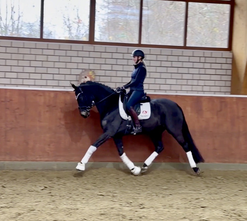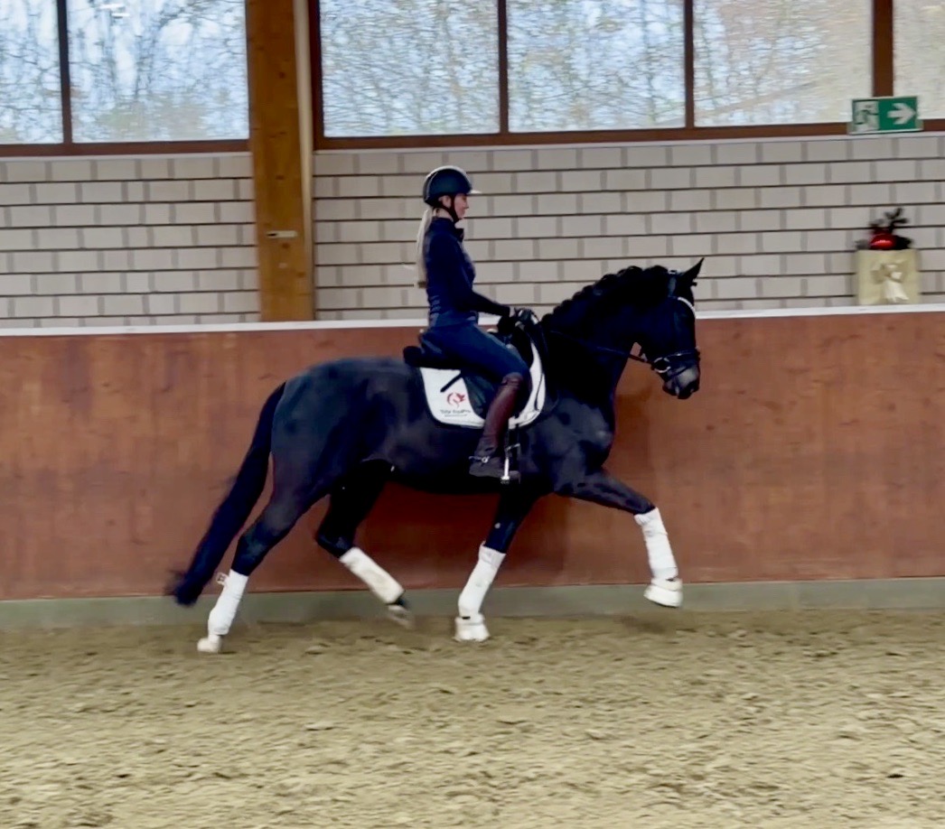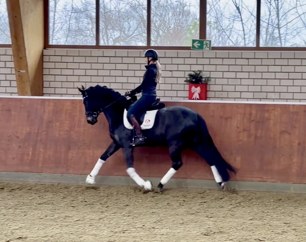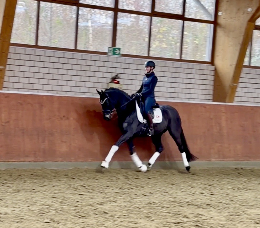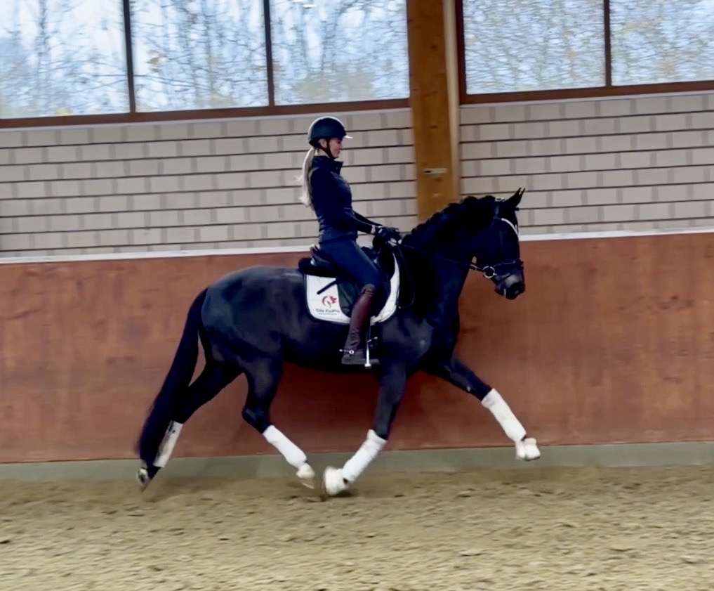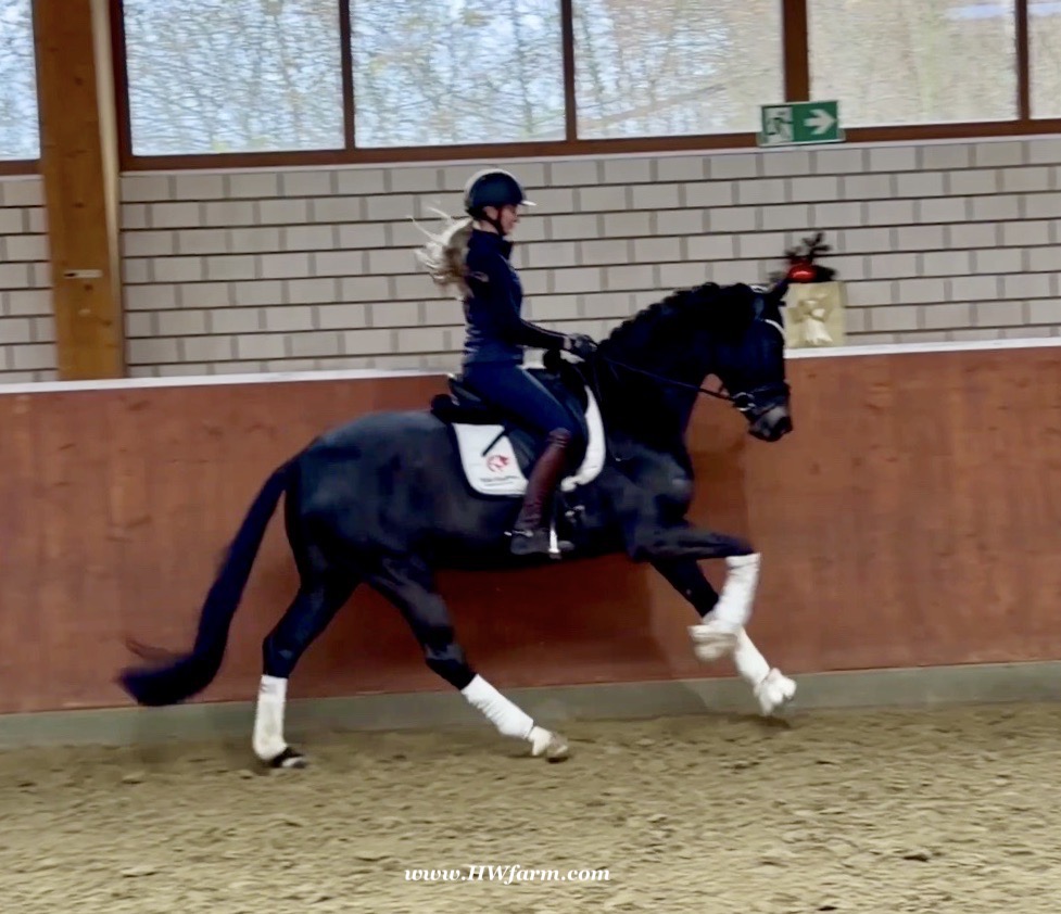 EscaHit HW, black/bay Westphalian gelding, by silver and bronze medallist at the World Championships for young dressage horses Escamillo/German national champion, World Champion of six-year-old dressage horses Sandro Hit, born in 2020, standing approximately 169 cm or 16.2 hands. EscaHit HW has an impressive pedigree and his famous sire is Escamillo, Vice World Champion of six-year-old dressage horses Bronze medal World Championship of seven-year-old horses "What an amazing performance," the judges praised Escamillo's performance in the World Championship final for seven-year-old dressage horses in their commentary, "we love this horse and see a very big future in him." Once again, Escamillo received dream scores at this prestigious meeting of the world's best young dressage horses. 9.5 for trot and perspective, 9.0 for walk and canter, 8.5 for submission - and a fantastic 91 percent and the bronze medal. The year before, Escamillo, ridden by the Spanish rider Manuel Dominguez Bernal, who rides for Helen Langehanenberg's yard, had already received scores of 9.0 and higher in the World Championship's arena, earning him the silver medal in the six-year-olds class. Breeding-wise Escamillo also puts one exclamation mark after the next behind his hereditary power. He has already produced over 30 licensed stallions, among them the Neustadt Champion Stallion Element of Crime, the Hanoverian Premium Stallion and 700,000-euro Stallion Market top price Energy, the Westphalian Reserve Champion Stallions Escaneno, Espléndido MT and Excalibur as well as our stallions Escanto PS, two-time stallion performance test record winner, Expectation PS and Escamour, the stallion performance test winner Eleven HW and the bronze medallist of the Hanoverian Championships, Estupendo. The German and Westphalian Champion Eivissa ridden by Jessica Lynn Thomas/SWE stands out amongst his first sport offspring. She received a 10 for both trot and canter and a 9.5 for rideability and conformation in Warendorf. Embolo, third in the "Westfalen-Wappen" class at the "Turnier der Sieger", achieved the sensational knockdown price of 590,000 euros, the highest price ever achieved by a riding horse at a Westphalian auction. Eyecatcher W won the Austrian Warmblood Championships for three-year-olds in Stadl-Paura/AUT. Escamillo's daughter, Exclusive, won the Herwart van der Decken Show in Verden. Escamillo began his career as premium stallion at his licensing in 2017 in Verden, passed his 14-day test in 2018 with a dressage score of 9.08 and completed his sport test in 2020 with Helen Langehanenberg with a winning score of 9.36. Ridden by the Olympic team silver medallist, he also qualified for the German Championships for young dressage horses as a five-year-old with 9.5. In 2021, with Manuel Dominguez Bernal, he won the intermediate (M) level dressage test for young horses in Haftenkamp with a score of 8.8 (also qualifier for the German Championships for six-year-olds). The same year, Escamillo was awarded the Weltmeyer Prize by the Hanoverian Association. His sire, the Westphalian and double German Champion Escolar, was placed in the final of the Burg Cup, the final of the Louisdor Prize and at the German Championships with the Olympic Champion and riding master Hubertus Schmidt/GER. They were part of the German Olympic squad. His dam Verb.Pr.St. Cassila is the full sister of the licensed stallions Romanist (advanced S* level dressage) and Romeo Niro (intermediate M** level dressage). His grand-sire Rohdiamant was German Champion in 1993 and competed at Grand Prix level with Lisa Wilcox/USA. Around 50 of his sons have been licensed. His most successful offspring include Valentina Truppa's/ITA Olympic partner Eremo del Castegno and Helen Langehanenberg's Responsible OLD. His grand-dam Chantal is the full sister of Dumont/Juliane Brunkhorst/GER and Hartwig Burfeind/GER, licensed stallion and successful in Grand Prix, and her half brother Aquavit (by Argentinus) is successful in competitions for young show jumping horses. De Niro, Landadel and Zeus also appear in the pedigree. His great-grand-dam St.Pr./El.St. Caruge is the full sister of the licensed stallion Laphroaig/Leporello and produced several state premium mares. Her full sister is no other than the German Champion Mare St.Pr./El.St. C-Dur, who produced four licensed stallions. Line of El.St. Cinderella, from which descend the five German Champion full siblings Sir Heinrich OLD, Cindy OLD, Candy OLD, Caty OLD and Casey OLD (all by Sir Donnerhall I), the Grand Prix dressage horse Radondo (by Romanov)/Ashley Holzer/USA, as well as the stallions Zymbal I and II (both by Zeus), First Class I and II (both by Furioso II), Sesostris (by Silvio I), Rubino Rosso (by Rubinstein), Castus I and II (both by Classiker), Stiefelkönig (by Silvano), Grand Marnier (by Galoubet A), Pharaoh (by Parabol), RTL (by Rubinstein), Routinier (by Rohdiamant), Solo Hit (by Sandro Hit), Get Smart (by Granulit), Fortune Hunter (by First Class I), Casanova (by Castro) and Si bon (by Sir Donnerhall I). Closely related to the famous Wendel's German Champion quintet. EscaHit HW's dam sire is the famous Sandro Hit. Sandro Hit has been one of the world's best dressage sires in the WBFSH ranking for twelve years. In 2021 he was even number one. Sandro Hit has left his lasting mark on modern dressage horse breeding with his brilliantly typed and extremely light-footed offspring. He is considered the founding stallion of our station - and line founder. At the Olympic Games in Tokyo, Showtime FRH/Dorothee Schneider and Salvino/Adrienne Lyle were on the gold and silver teams from Germany and the USA. This was the second Olympic gold for Showtime FRH, after European Championship team gold and double individual silver. Salvino was also part of the US dressage silver team at the 2018 World Equestrian Games in Tryon, USA. Also at the start in Tokyo/JPN: Sir Donnerhall II OLD/Morgan Barbançon/FRA, Sebastien/Lindsay 