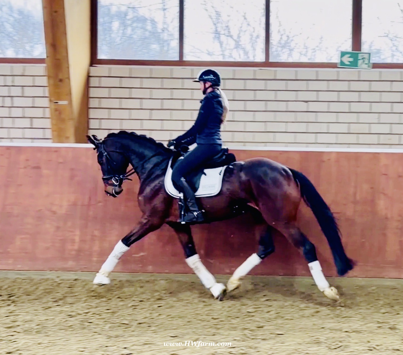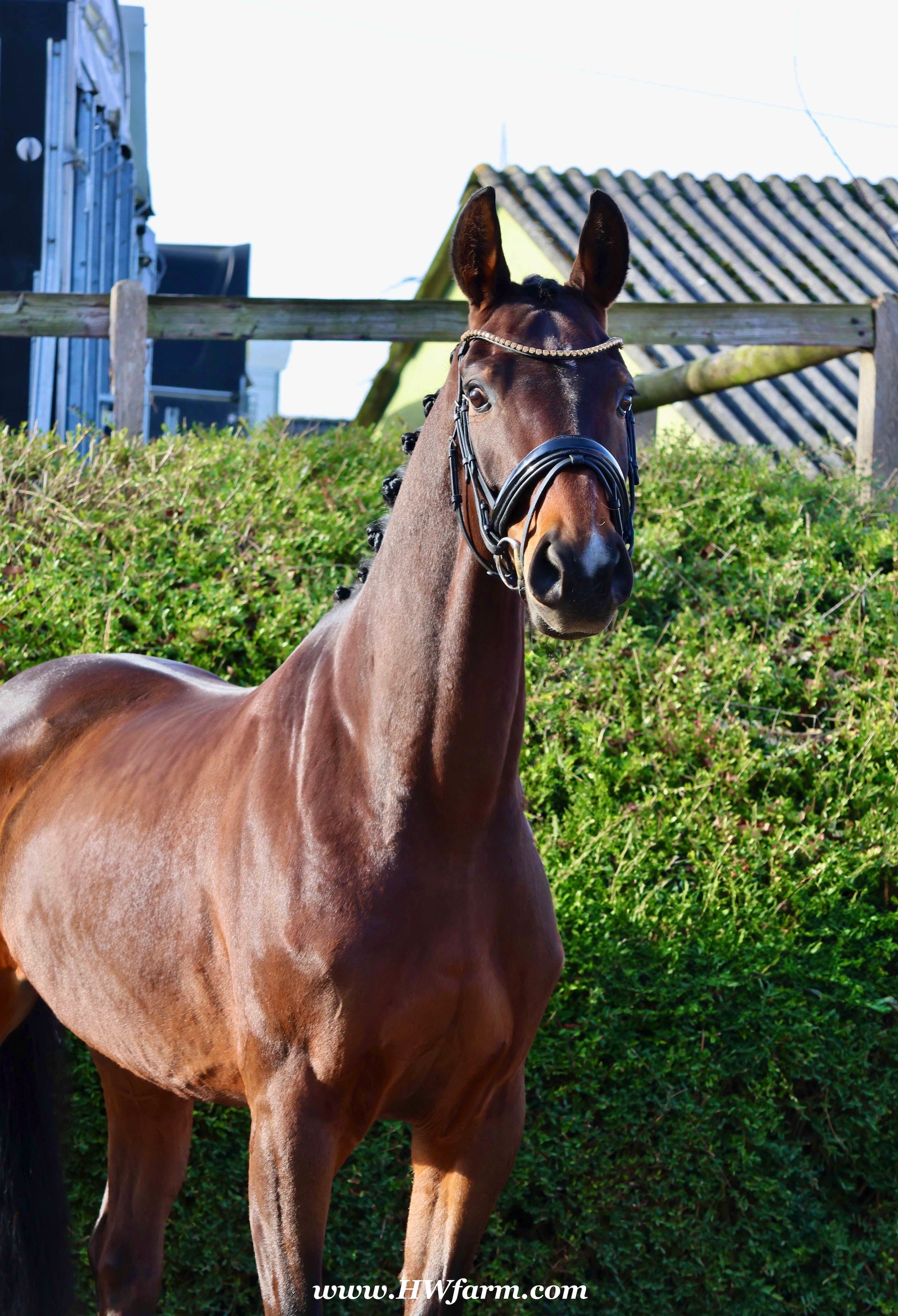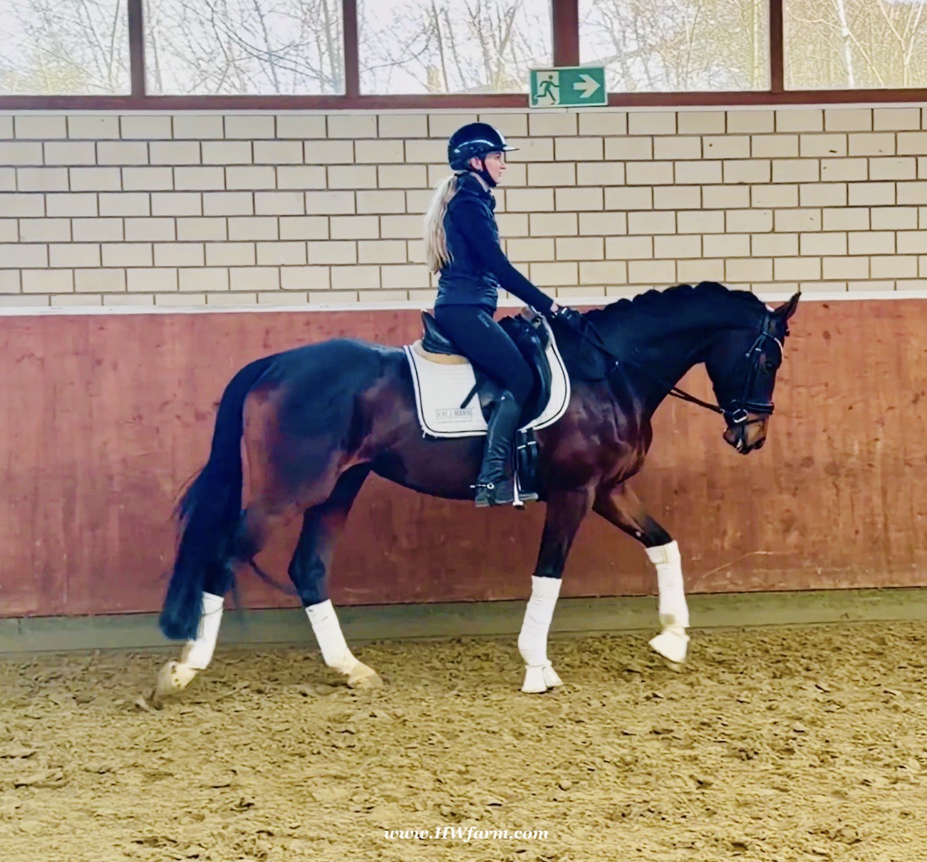 Vivat Rose HW, bay Hanoverian mare by Vivat Rex/Dancier born in 2021, standing approximately 167 cm or 16.2 hands. Vivat Rose HW is by the famous and elegant stallion Vivat Rex, he truly resembles a near copy modernity with ingenuity. Definitely a king, uniquely modeled, he dances into the hearts of the observers. Top quality with great potential. His quality of movement is inspiring and admirable. Father Vivaldi was reserve champion at the performance test in the Netherlands and won the Pavo Cup for five-year-olds in 2007. He was ridden by Hans Peter Minderhoud/NED to victory in the KNHS/KWPN stallion series in 2008 and 2009, receiving a 10.0 for his trot. The sire Krack C is considered a foundation stallion in the Netherlands. The two-time Pavo Cup winner from 1996 and 1997 took eighth place in the individual classification at the 2002 World Equestrian Games in Jerez/ESP under Anky van Grunsven/NED. Vivaldi comes from the Utopia line, the most successful Dutch mare family. Elite mare Symphonie, mother of Vivat Rex, descends from Samarant, one of Sandro Hit x Brentano II, was Hanoverian Vice State Champion and finalist at the Bundeschampionat riding horses. In 2006 he qualified for the Bundeschampionat for 5-year-old dressage horses. In 2008 he was sold to Denmark and presented internationally by Andreas Helgstrand-DEN, among others. Granddam Sandy, also an elite mare, descends from the great Rubinstein. Rubinstein I is a son of the Westphalian Romadour II son Rosenkavalier, who himself was a stallion performance test winner and is now one of the most important Westphalian sires. He was bred from what is probably the most important dressage dynasty in the world. The mother Antine is full sister of the international top dressage horses Ahlerich 2/Dr. Reiner Klimke and Amon/Annemarie Sanders-Keyzer (NL Her full sister Adone gave the multi-Olymionist Rembrandt 24/Nicole Uphoff. Rubinstein I can now look back on a tailor-made career. Winner in the "Optimum" of material horses in Münster 1990, I a- Winner of the main premium in Oldenburg, Vice Bundeschampion of the German dressage horse in Verden in 1992, multiple Oldenburg dressage champion, serial winner in dressage classes at S level and multiple Grand Prix winners. In the meantime, Rubinstein I and Nicole Uphoff can look back to international victories in the dressage arena. Vivat Rex comes from the dam line of Große Liebe: Grand Prix successful horses Pikko del Cerro with Lisa Wilcox and licensing champion Boreas by Bordeaux is with Christina Vinios USA. Modernität mit Genialität Mit seltenem Habitus ausgestatteter König. Einzigartig modelliert, tanzt er in die Herzen der Beobachter. In der Qualität mit großartigem Potenzial. Seine Bewegungsgüte ist begeisternd und bewundernswert. Vater Vivaldi war in den Niederlanden HLP-Reservesieger und gewann 2007 den Pavo Cup der Fünfjährigen. Von Hans Peter Minderhoud/NED wurde er 2008 und 2009 zum Sieg in der KNHS/KWPN Hengste-Serie geritten, wobei er für seinen Trab die 10,0 erhielt. Der Vater Krack C gilt in den Niederlanden als Stempelhengst. Der zweifache Pavo Cup-Sieger von 1996 und 97 belegte unter Anky van Grunsven/NED Platz acht in der Einzelwertung der Weltreiterspiele 2002 in Jerez/ESPDer Muttervater Jazz gehörte 2002 unter Tineke Bartes zur Niederländischen Equipe bei den Weltreiterspielen in Jerez/ESP. Vivaldi entstammt dem Utopia-Stamm, der erfolgreichsten niederländischen Stutenfamilie. Elite Stute Symphonie, Mutter von Vivat Rex, stammt ab vom Samarant, ein des Sandro Hit x Brentano II, war Hannoveraner Vize-Landeschampion und Finalteilnehmer am Bundeschampionat Reitpferde. 2006 hat er sich für das Bundeschampionat der 5-jährigen Dressurpferde qualifiziert. 2008 wurde er nach Dänemark verkauft und u.a. von Andreas Helgstrand-DEN international vorgestellt. Großmutter Sandy auch Elitestute stammt ab vom großartigen Rubinstein. Rubinstein I ist ein Sohn des westfälischen Romadour II-Sohnes Rosenkavalier, der selbst HLP-Sieger war und heute zu den bedeutendsten westfälischen Vererbern zählt. Er ist gezogen aus der wohl bedeutendsten Dressurdynastie der Welt. Die Mutter Antine ist Vollschwester der internationalen Spitzen-Dressurpferde Ahlerich 2/Dr. Reiner Klimke und Amon/Annemarie Sanders-Keyzer (NL Ihre Vollschwester Adone schenkte dem Multi-Olymioniken Rembrandt 24/Nicole Uphoff. Rubinstein I blickt inzwischen auf eine Karriere nach Maß zurück. Sieger im "Optimum" der Materialpferde in Münster 1990, I a- Hauptprämiensieger in Oldenburg, Vize-Bundeschampion des Deutschen Dressurpferdes 1992 in Verden, mehrfacher Oldenburger Dressurchampion, Seriensieger in Dressuren der Klasse S und vielfacher Grand-Prix-Sieger. Inzwischen ist Rubinstein I mit Nicole Uphoff international im Viereck auf Sieg abonniert. Das Paar zählt zum deutschen Dressur-Establishment. Vivat Rex entspringt dem Stutenstamm der Großen Liebe: Grand Prix erfolgreiche Pferde Pikko del Cerro mit Lisa Wilcox und Körsieger Boreas v. Bordeaux heute bei Christina Vinios USA. Vivat Rose HW's dam sire is by the sensational stallion Dancier. Dancier, authoritative winner of his performance test and stallion licensing, was also proclaimed Best Hanoverian Stallion of 2002. This success won him the "Freiherr von Stenglin" award. As a young stallion, Dancier qualified twice for the national Championships in Warendorf and celebrated his first successes in the advanced class at the youthful age of eight. A son of the top class dressage progenitor, De Niro, this noble, attractive black stallion appears on the way to his own excellence as a sire. Dancier Lancier is by the venerable Laurie's Crusador xx, Hanoverian Stallion of the Year 2006, a rare honor for a Thoroughbred stallion. Dancier was awarded the perfect score of 10 for his walk, 9.5 for his canter and 9.2 for his walk. As a four year old he placed third in the Bundeschampionate. He is noted for his exceptional temperament and good ability to work fr