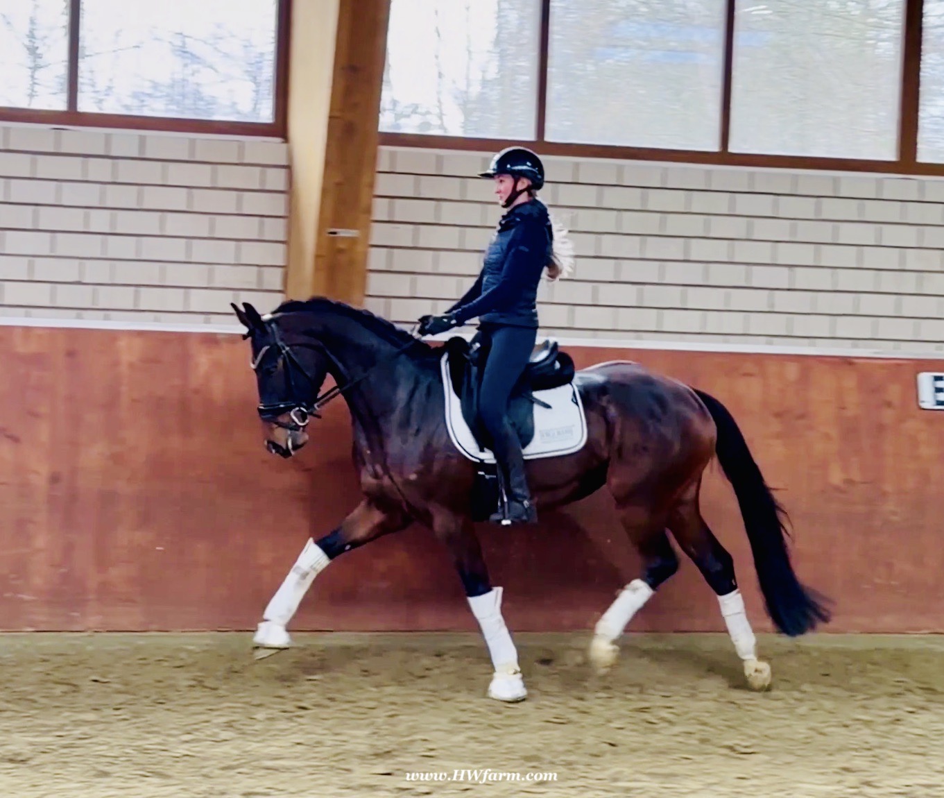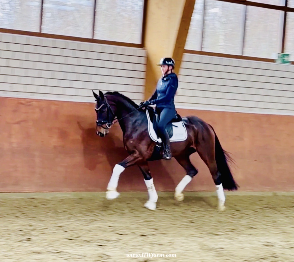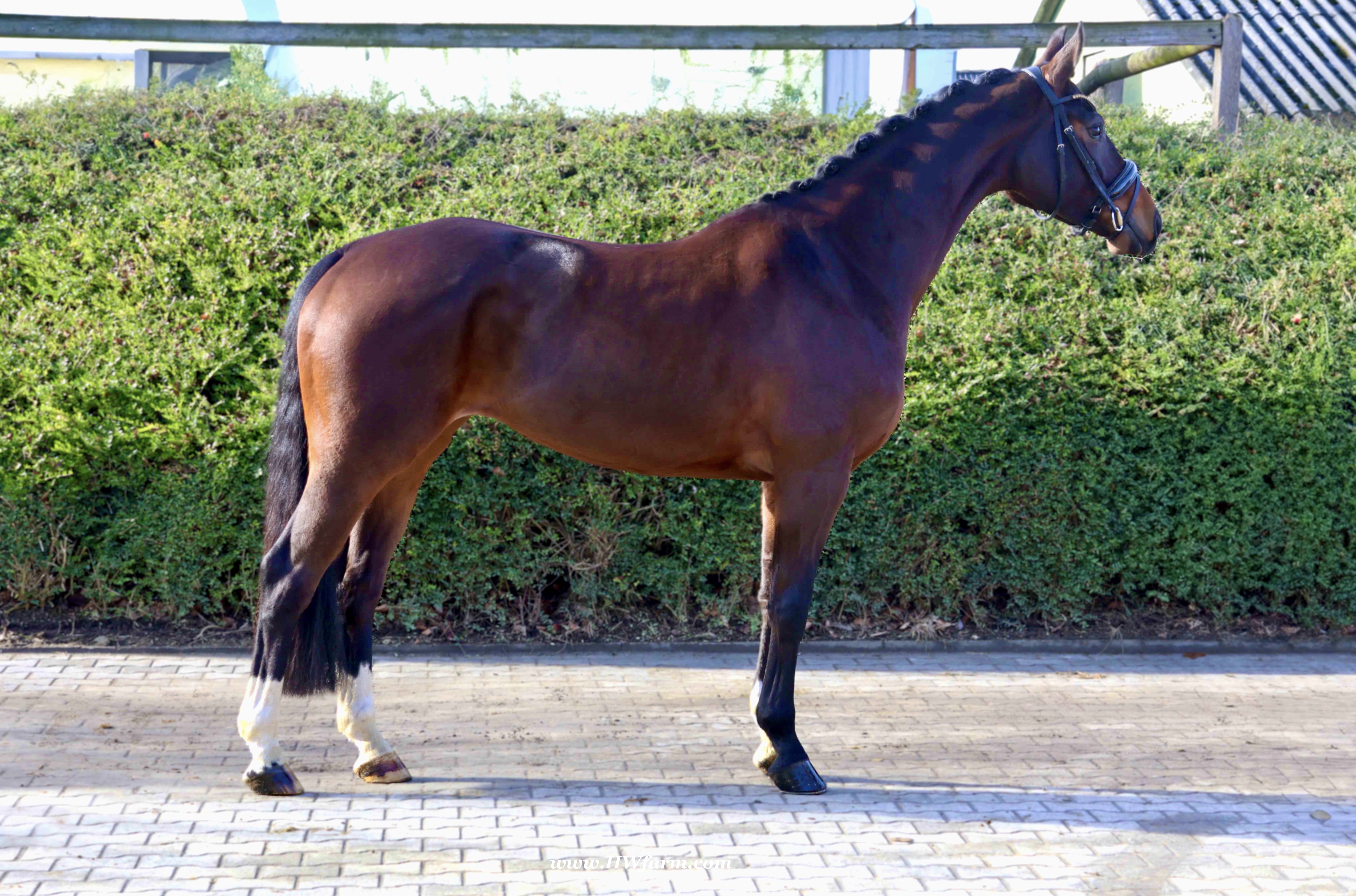 Vivat Rose HW, bay Hanoverian mare by Vivat Rex/Dancier born in 2021, standing approximately 167 cm or 16.2 hands. Vivat Rose HW is by the famous and elegant stallion Vivat Rex, he truly resembles a near copy modernity with ingenuity. Definitely a king, uniquely modeled, he dances into the hearts of the observers. Top quality with great potential. His quality of movement is inspiring and admirable. Father Vivaldi was reserve champion at the performance test in the Netherlands and won the Pavo Cup for five-year-olds in 2007. He was ridden by Hans Peter Minderhoud/NED to victory in the KNHS/KWPN stallion series in 2008 and 2009, receiving a 10.0 for his trot. The sire Krack C is considered a foundation stallion in the Netherlands. The two-time Pavo Cup winner from 1996 and 1997 took eighth place in the individual classification at the 2002 World Equestrian Games in Jerez/ESP under Anky van Grunsven/NED. Vivaldi comes from the Utopia line, the most successful Dutch mare family. Elite mare Symphonie, mother of Vivat Rex, descends from Samarant, one of Sandro Hit x Brentano II, was Hanoverian Vice State Champion and finalist at the Bundeschampionat riding horses. In 2006 he qualified for the Bundeschampionat for 5-year-old dressage horses. In 2008 he was sold to Denmark and presented internationally by Andreas Helgstrand-DEN, among others. Granddam Sandy, also an elite mare, descends from the great Rubinstein. Rubinstein I is a son of the Westphalian Romadour II son Rosenkavalier, who himself was a stallion performance test winner and is now one of the most important Westphalian sires. He was bred from what is probably the most important dressage dynasty in the world. The mother Antine is full sister of the international top dressage horses Ahlerich 2/Dr. Reiner Klimke and Amon/Annemarie Sanders-Keyzer (NL Her full sister Adone gave the multi-Olymionist Rembrandt 24/Nicole Uphoff. Rubinstein I can now look back on a tailor-made career. Winner in the "Optimum" of material horses in Münster 1990, I a- Winner of the main premium in Oldenburg, Vice Bundeschampion of the German dressage horse in Verden in 1992, multiple Oldenburg dressage champion, serial winner in dressage classes at S level and multiple Grand Prix winners. In the meantime, Rubinstein I and Nicole Uphoff can look back to international victories in the dressage arena. Vivat Rex comes from the dam line of Große Liebe: Grand Prix successful horses Pikko del Cerro with Lisa Wilcox and licensing champion Boreas by Bordeaux is with Christina Vinios USA. Modernität mit Genialität Mit seltenem Habitus ausgestatteter König. Einzigartig modelliert, tanzt er in die Herzen der Beobachter. In der Qualität mit großartigem Potenzial. Seine Bewegungsgüte ist begeisternd und bewundernswert. Vater Vivaldi war in den Niederlanden HLP-Reservesieger und gewann 2007 den Pavo Cup der Fünfjährigen. Von Hans Peter Minderhoud/NED wurde er 2008 und 2009 zum Sieg in der KNHS/KWPN Hengste-Serie geritten, wobei er für seinen Trab die 10,0 erhielt. Der Vater Krack C gilt in den Niederlanden als Stempelhengst. Der zweifache Pavo Cup-Sieger von 1996 und 97 belegte unter Anky van Grunsven/NED Platz acht in der Einzelwertung der Weltreiterspiele 2002 in Jerez/ESPDer Muttervater Jazz gehörte 2002 unter Tineke Bartes zur Niederländischen Equipe bei den Weltreiterspielen in Jerez/ESP. Vivaldi entstammt dem Utopia-Stamm, der erfolgreichsten niederländischen Stutenfamilie. Elite Stute Symphonie, Mutter von Vivat Rex, stammt ab vom Samarant, ein des Sandro Hit x Brentano II, war Hannoveraner Vize-Landeschampion und Finalteilnehmer am Bundeschampionat Reitpferde. 2006 hat er sich für das Bundeschampionat der 5-jährigen Dressurpferde qualifiziert. 2008 wurde er nach Dänemark verkauft und u.a. von Andreas Helgstrand-DEN international vorgestellt. Großmutter Sandy auch Elitestute stammt ab vom großartigen Rubinstein. Rubinstein I ist ein Sohn des westfälischen Romadour II-Sohnes Rosenkavalier, der selbst HLP-Sieger war und heute zu den bedeutendsten westfälischen Vererbern zählt. Er ist gezogen aus der wohl bedeutendsten Dressurdynastie der Welt. Die Mutter Antine ist Vollschwester der internationalen Spitzen-Dressurpferde Ahlerich 2/Dr. Reiner Klimke und Amon/Annemarie Sanders-Keyzer (NL Ihre Vollschwester Adone schenkte dem Multi-Olymioniken Rembrandt 24/Nicole Uphoff. Rubinstein I blickt inzwischen auf eine Karriere nach Maß zurück. Sieger im "Optimum" der Materialpferde in Münster 1990, I a- Hauptprämiensieger in Oldenburg, Vize-Bundeschampion des Deutschen Dressurpferdes 1992 in Verden, mehrfacher Oldenburger Dressurchampion, Seriensieger in Dressuren der Klasse S und vielfacher Grand-Prix-Sieger. Inzwischen ist Rubinstein I mit Nicole Uphoff international im Viereck auf Sieg abonniert. Das Paar zählt zum deutschen Dressur-Establishment. Vivat Rex entspringt dem Stutenstamm der Großen Liebe: Grand Prix erfolgreiche Pferde Pikko del Cerro mit Lisa Wilcox und Körsieger Boreas v. Bordeaux heute bei Christina Vinios USA. Vivat Rose HW's dam sire is by the sensational stallion Dancier. Dancier, authoritative winner of his performance test and stallion licensing, was also proclaimed Best Hanoverian Stallion of 2002. This success won him the "Freiherr von Stenglin" award. As a young stallion, Dancier qualified twice for the national Championships in Warendorf and celebrated his first successes in the advanced class at the youthful age of eight. A son of the top class dressage progenitor, De Niro, this noble, attractive black stallion appears on the way to his own excellence as a sire. Dancier Lancier is by the venerable Laurie's Crusador xx, Hanoverian Stallion of the Year 2006, a rare honor for a Thoroughbred stallion. Dancier was awarded the perfect score of 10 for his walk, 9.5 for his canter and 9.2 for his walk. As a four year old he placed third in the Bundeschampionate. He is noted for his exceptional temperament and good ability to work fr