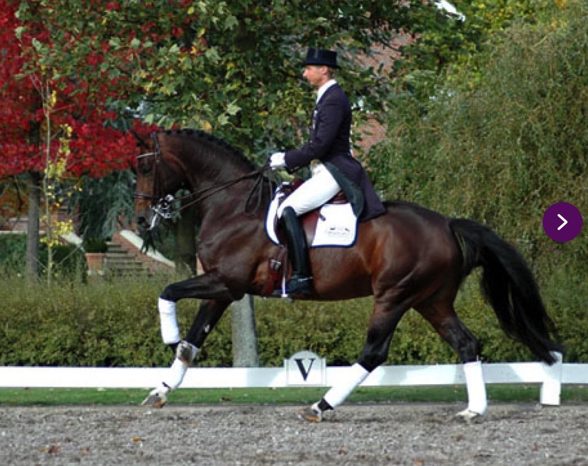 Floresco NRW, bay Westphalian stallion, by Florestan/Rosenkavalier, born in 1998, standing approximately 171 cm or 16.3 hands. Achievement: Premium stallion, noted for his pedigree and performance Achievements: Won the Pavo Cup for five-year-olds in Holland and the five-year-old division at the World Championships Details: Passed his 30-day test at Zweibrücken with a score of 10 for walk. Floresco NRW is a Westphalian Stallion Standing 171cms ~ 16.3½ hands, born 1998 Also known as 95314, FLORESCO Born in Germany. Sired by Florestan I (1986) out of the mare Rosella (1992) from the Westf Stamm 333, ... family. Bred by LANGHORST KONRAD in Germany. Competing in international competitions from 30-01-2015 to 09-01-2016 up to Dressage World Cup Qualifier level with the following riders Yessin RAHMOUNI. He is a Stallion Licensed with the following Studbooks: Swedish Warmblood (SWB), Westfalian. We currently have Photos (3) for this horse. Produced in total 96 offsprings of which 33 have competed in sport up to Dressage: 16-CDI2*-Int I, Eventing: 2-CIC2*, Showjumping: 1-CSI2* 1.45m, Showjumping: 14-CSI2* 1.45m. Please note our summary for this horse may be incomplete as there may be other offspring and competition results that are missing from our records.
