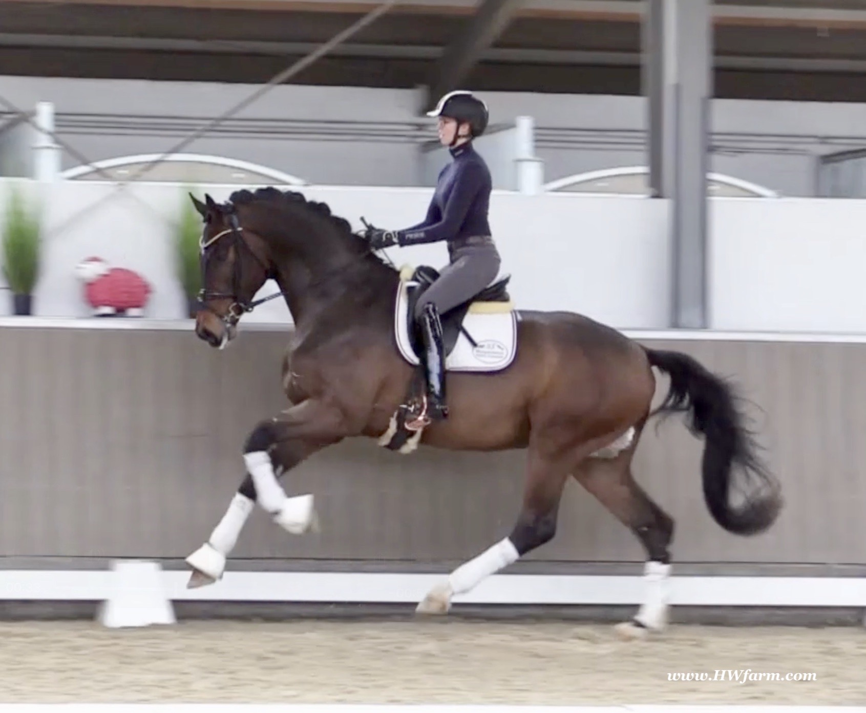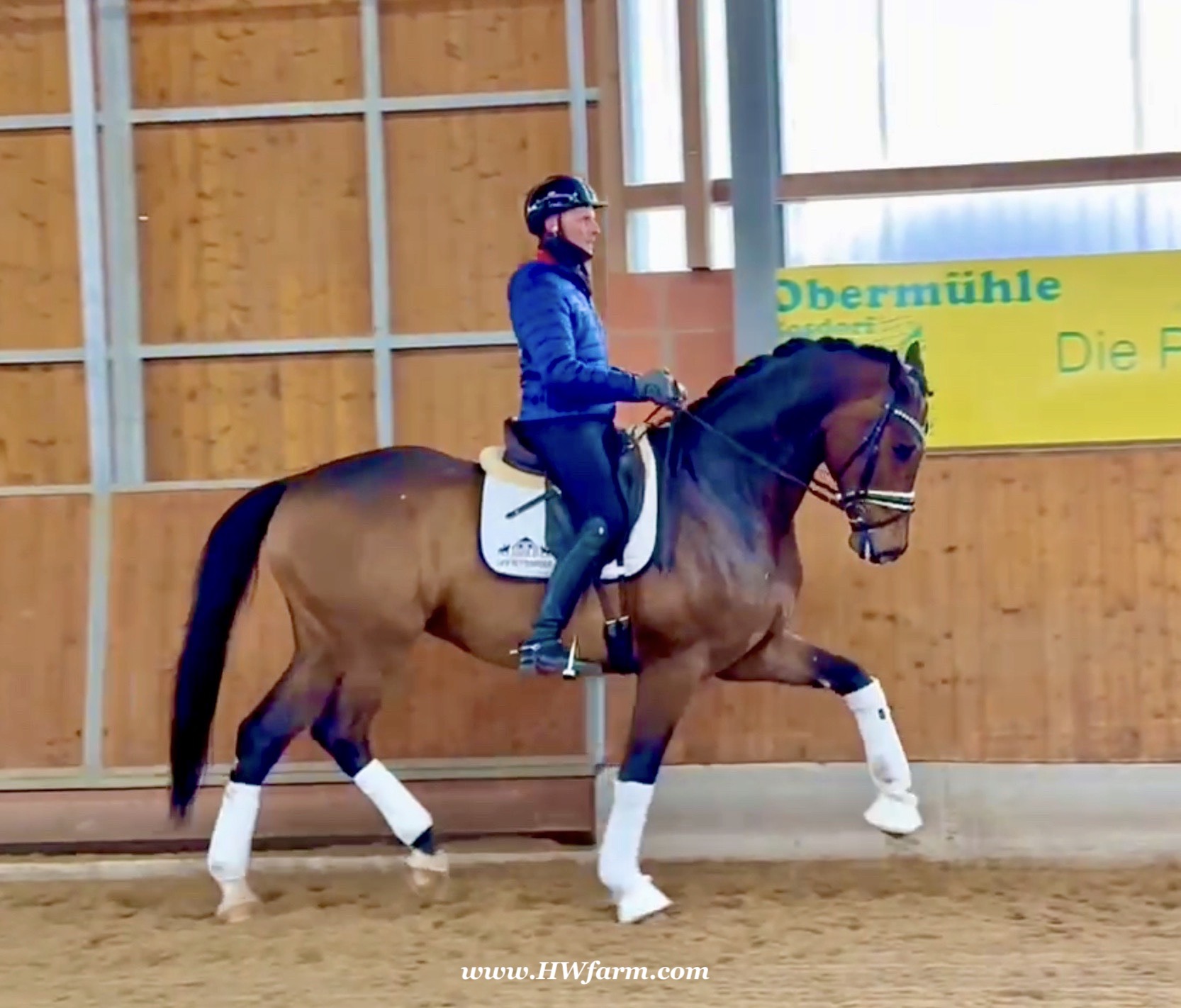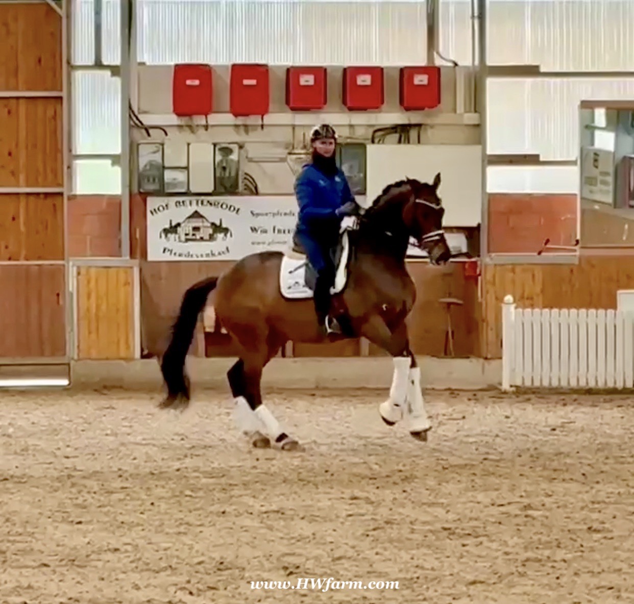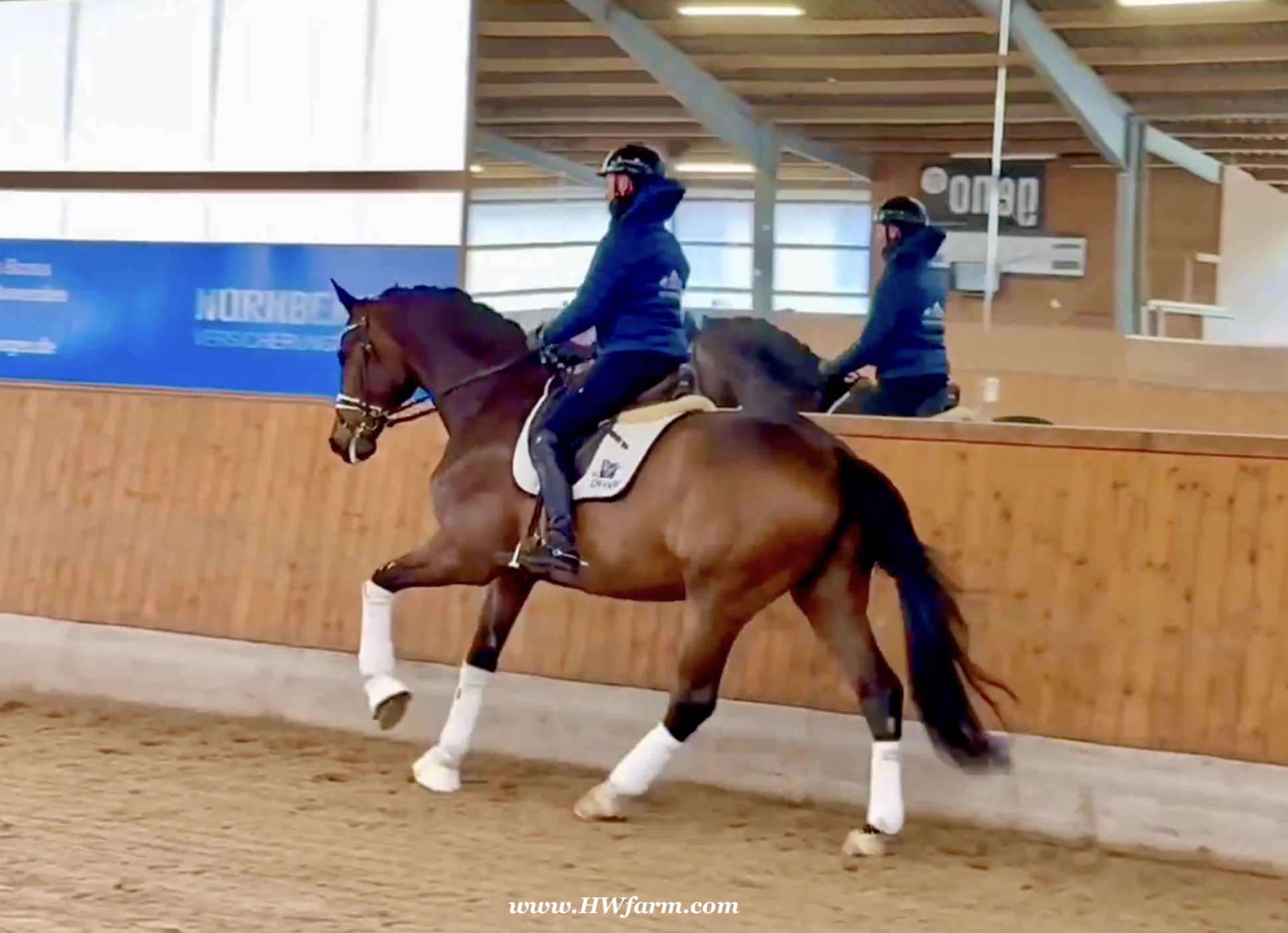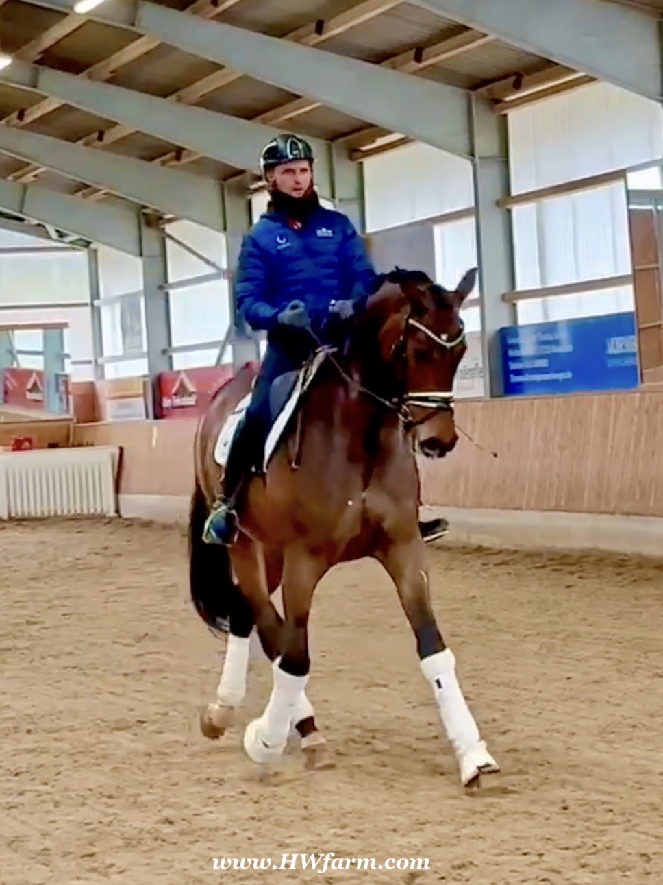 Secret Spice HW bay Oldenburg gelding, by the powerful, dynamic BundesChampion, Vice World Champion Secret/Come On born in 2018, standing approximately 176 cm or 17.1 hands. Secret Spice HW, is one of a kind, a very rare find, his sire is the 2020 Bundeschampion Secret and outstanding National German 6yo Champion, as well as World Champion for young dressage horses Ermelo 2019 - Secret - an exceptional horse and even Vice World Champion! Secret and his rider Jessica Lynn Thomas delivered a spectacular first round in the qualification of the five-year-old dressage horses. They received an 8.8 for the permeability, the step 9.5, the gallop 9.7, the perspective 9.8 and even 9.9 for the trot. All in all, this gave a total result of 9.54 points and the victory was not to be taken from the two. In the final, Secret had to give up just under 0.02 points, despite a further increase. The pair won the silver medal of the five-year-old dressage horses with 9.64 points. The judge's comment: "A fantastic horse! Always in the flow, always easy. It is a pleasure to judge such a horse. " In terms of breeding, the descendants of the Secret also seamlessly linked to his father's success in 2019. Country after country was heard from his descendants. In the far north, in Schleswig-Holstein, Secret set one of the price peaks at the Glanz and Gloria auction in Delingsdorf with € 21,000. In Verden, Status Quo was one of the most sought-after youngsters at € 25,000. With the appropriate name Somebody to Dance, Secret was also among the price peaks in Münster on the occasion of the Westphalia Week. In Vechta, Serge Gainsbourg triumphed as the most expensive foal in 2019 with a hammer price of 150,000 euros. The price structure was followed by Secret Emperor, another son of the Secret. This went to Austria for € 42,000. And also in the south of Germany in Nörtlingen, it was once again a subsidiary of our Secret, which was one of the top prices of the auction with a hammer price of € 25,000. The fact that his offspring are also in demand abroad was demonstrated by a filly from Secret, which took the reserve winner classification of dressage-stressed filly at the Swiss Sport Foal Championships and then found a new owner with a surcharge of 28,000 francs (about 25,000 €). In the Netherlands it was the colt with the appropriate name - One to Remember- that became the top foal in the auction at € 22,000 "The highlight of the day comes from Schwaiger and bears the appropriate name Sensation, from Secret - Fürst Grandios. A colt with a value of 9.67 (type / stature: 10, exterior / correctness: 9, movement: 10) really leaves nothing to be desired and makes words superfluous. "This is how the Austrian Horse Breeding Association described its winning foal 2019. Secret easily met the expectations placed on him. He completed his 14-day test in Schlieckau with a dressage final score of 9.5. He was able to shine again at the Bundeschampionat in Warendorf, where he was only named Vice Bundeschampion due to the rider marks. No more words need be said about father Sezuan, the celebrated triple world champion of young dressage horses. The mother line of the Secret, line 853 of the Sudette, produced numerous internationally represented performance horses. Already 38 other licensed stallions originate from this dam line. As the dam's sire, we find St. Moritz, which has only been well remembered at our station, and which, due to the fact that it was too short to work at Gestüt WM, produced a whole range of interesting, sporty and successful offspring. The maternal pedigree is rounded off by the proven successful combination of the Celler state stud stallions Rotspon, Argentan, Woermann and Lugano. Another flagship of this mother line is the Bundeschampion of five-year-old dressage horses and world champion of six-year-old dressage horses Lordwoods Dancing Diamond. Due to the genetic blood combination of the top class in this flagship pedigree, coupled with the high level of commitment of this rough diamond, we offer today's savvy dressage horse breeder a very special offer. Secret Spice HW's dam sire is Come On, first competed by Harm Thormählen, he continued his career in 1991 with Carsten-Otto Nagel. With Ludger Beerbaum and Ralf Schneider, numerous international successes were added, such as the victory at the German Masters, a second place in the Grand Prix of Göteborg/SWE, a third place in the Hickstead Derby/GBR and a fourth place in the Hamburg Jumping Derby. Ridden by Her Royal Highness Princess Haya of Jordan, Come On was very successful from 1997, notably at the CHIO Aachen. Come On produced eight licensed stallions from his time at stud, including Clever Boy, Come Well and Checker, and Cosmic FRH, Champion of the Nuremberg Burg Cup. Come On, a tough international competitor with Ludger Beerbaum and Ralf Schneider, yet gentleman enough to be a pleasant partner on the international stage for Princess Haya. Secret Spice HW, a gentleman with a golden heart, check out that freedom in the shoulder and active hind leg! He has a superb rhythm and swings softly through his back, he is very easy to sit. His gaits are just breathtaking, he barely touches the ground. The canter comes with a phenomenal uphill movement with lots of air time, jumping well up, out and under every single time. He is so much fun to watch. The trot is supple and as elastic as it gets, his front legs reach far out and up, totally amazing. His active hind end enables him to look effortless and his hind legs are reaching far under his body. He will be a piaffe and passage machine, that's very obvious already. A modern dressage horse as it should be. Already successfully shown, Secret Spice HW loves collected work, he goes easily through the neck, on the bit, featherlight for the riders hand. He is just stunning and a horse of a lifetime. His lateral work is a blast, half steps seem easy, flying changes on top, wow - what a horse! A definite GP