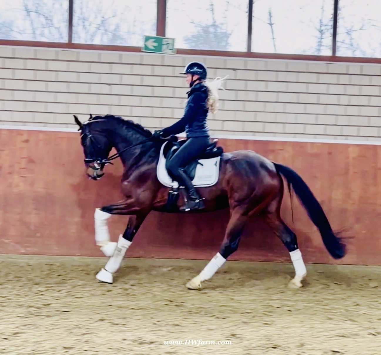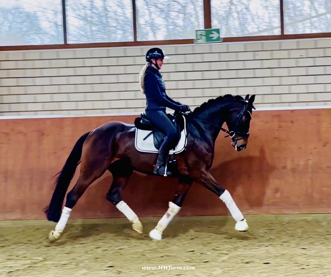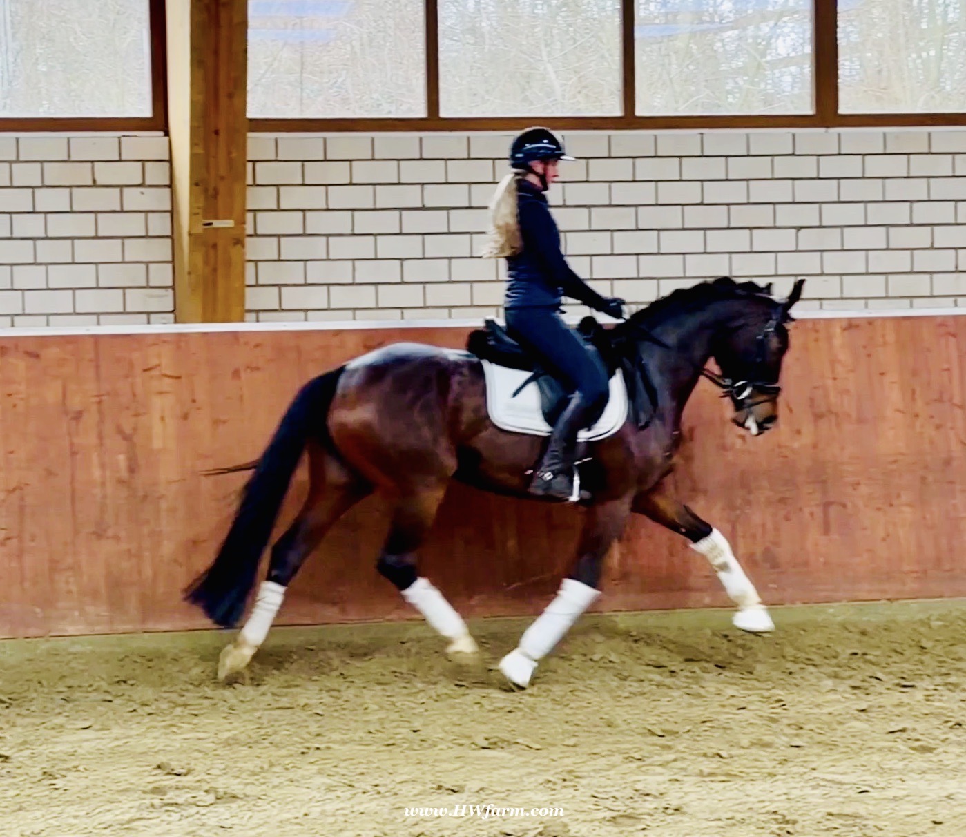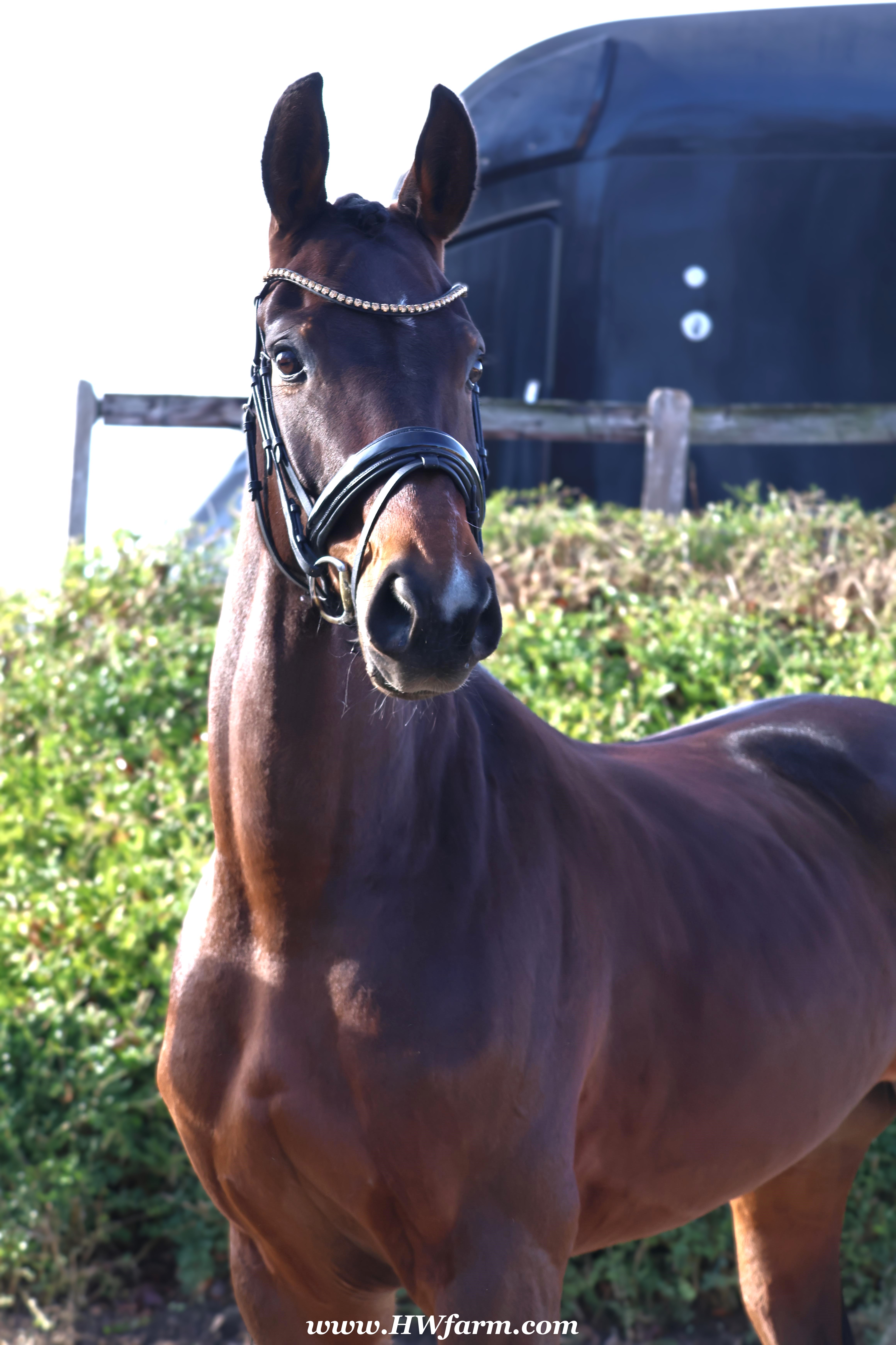 Vivat Rose HW, bay Hanoverian mare by Vivat Rex/Dancier born in 2021, standing approximately 167 cm or 16.2 hands. Vivat Rose HW is by the famous and elegant stallion Vivat Rex, he truly resembles a near copy modernity with ingenuity. Definitely a king, uniquely modeled, he dances into the hearts of the observers. Top quality with great potential. His quality of movement is inspiring and admirable. Father Vivaldi was reserve champion at the performance test in the Netherlands and won the Pavo Cup for five-year-olds in 2007. He was ridden by Hans Peter Minderhoud/NED to victory in the KNHS/KWPN stallion series in 2008 and 2009, receiving a 10.0 for his trot. The sire Krack C is considered a foundation stallion in the Netherlands. The two-time Pavo Cup winner from 1996 and 1997 took eighth place in the individual classification at the 2002 World Equestrian Games in Jerez/ESP under Anky van Grunsven/NED. Vivaldi comes from the Utopia line, the most successful Dutch mare family. Elite mare Symphonie, mother of Vivat Rex, descends from Samarant, one of Sandro Hit x Brentano II, was Hanoverian Vice State Champion and finalist at the Bundeschampionat riding horses. In 2006 he qualified for the Bundeschampionat for 5-year-old dressage horses. In 2008 he was sold to Denmark and presented internationally by Andreas Helgstrand-DEN, among others. Granddam Sandy, also an elite mare, descends from the great Rubinstein. Rubinstein I is a son of the Westphalian Romadour II son Rosenkavalier, who himself was a stallion performance test winner and is now one of the most important Westphalian sires. He was bred from what is probably the most important dressage dynasty in the world. The mother Antine is full sister of the international top dressage horses Ahlerich 2/Dr. Reiner Klimke and Amon/Annemarie Sanders-Keyzer (NL Her full sister Adone gave the multi-Olymionist Rembrandt 24/Nicole Uphoff. Rubinstein I can now look back on a tailor-made career. Winner in the "Optimum" of material horses in Münster 1990, I a- Winner of the main premium in Oldenburg, Vice Bundeschampion of the German dressage horse in Verden in 1992, multiple Oldenburg dressage champion, serial winner in dressage classes at S level and multiple Grand Prix winners. In the meantime, Rubinstein I and Nicole Uphoff can look back to international victories in the dressage arena. Vivat Rex comes from the dam line of Große Liebe: Grand Prix successful horses Pikko del Cerro with Lisa Wilcox and licensing champion Boreas by Bordeaux is with Christina Vinios USA. Modernität mit Genialität Mit seltenem Habitus ausgestatteter König. Einzigartig modelliert, tanzt er in die Herzen der Beobachter. In der Qualität mit großartigem Potenzial. Seine Bewegungsgüte ist begeisternd und bewundernswert. Vater Vivaldi war in den Niederlanden HLP-Reservesieger und gewann 2007 den Pavo Cup der Fünfjährigen. Von Hans Peter Minderhoud/NED wurde er 2008 und 2009 zum Sieg in der KNHS/KWPN Hengste-Serie geritten, wobei er für seinen Trab die 10,0 erhielt. Der Vater Krack C gilt in den Niederlanden als Stempelhengst. Der zweifache Pavo Cup-Sieger von 1996 und 97 belegte unter Anky van Grunsven/NED Platz acht in der Einzelwertung der Weltreiterspiele 2002 in Jerez/ESPDer Muttervater Jazz gehörte 2002 unter Tineke Bartes zur Niederländischen Equipe bei den Weltreiterspielen in Jerez/ESP. Vivaldi entstammt dem Utopia-Stamm, der erfolgreichsten niederländischen Stutenfamilie. Elite Stute Symphonie, Mutter von Vivat Rex, stammt ab vom Samarant, ein des Sandro Hit x Brentano II, war Hannoveraner Vize-Landeschampion und Finalteilnehmer am Bundeschampionat Reitpferde. 2006 hat er sich für das Bundeschampionat der 5-jährigen Dressurpferde qualifiziert. 2008 wurde er nach Dänemark verkauft und u.a. von Andreas Helgstrand-DEN international vorgestellt. Großmutter Sandy auch Elitestute stammt ab vom großartigen Rubinstein. Rubinstein I ist ein Sohn des westfälischen Romadour II-Sohnes Rosenkavalier, der selbst HLP-Sieger war und heute zu den bedeutendsten westfälischen Vererbern zählt. Er ist gezogen aus der wohl bedeutendsten Dressurdynastie der Welt. Die Mutter Antine ist Vollschwester der internationalen Spitzen-Dressurpferde Ahlerich 2/Dr. Reiner Klimke und Amon/Annemarie Sanders-Keyzer (NL Ihre Vollschwester Adone schenkte dem Multi-Olymioniken Rembrandt 24/Nicole Uphoff. Rubinstein I blickt inzwischen auf eine Karriere nach Maß zurück. Sieger im "Optimum" der Materialpferde in Münster 1990, I a- Hauptprämiensieger in Oldenburg, Vize-Bundeschampion des Deutschen Dressurpferdes 1992 in Verden, mehrfacher Oldenburger Dressurchampion, Seriensieger in Dressuren der Klasse S und vielfacher Grand-Prix-Sieger. Inzwischen ist Rubinstein I mit Nicole Uphoff international im Viereck auf Sieg abonniert. Das Paar zählt zum deutschen Dressur-Establishment. Vivat Rex entspringt dem Stutenstamm der Großen Liebe: Grand Prix erfolgreiche Pferde Pikko del Cerro mit Lisa Wilcox und Körsieger Boreas v. Bordeaux heute bei Christina Vinios USA. Vivat Rose HW's dam sire is by the sensational stallion Dancier. Dancier, authoritative winner of his performance test and stallion licensing, was also proclaimed Best Hanoverian Stallion of 2002. This success won him the "Freiherr von Stenglin" award. As a young stallion, Dancier qualified twice for the national Championships in Warendorf and celebrated his first successes in the advanced class at the youthful age of eight. A son of the top class dressage progenitor, De Niro, this noble, attractive black stallion appears on the way to his own excellence as a sire. Dancier Lancier is by the venerable Laurie's Crusador xx, Hanoverian Stallion of the Year 2006, a rare honor for a Thoroughbred stallion. Dancier was awarded the perfect score of 10 for his walk, 9.5 for his canter and 9.2 for his walk. As a four year old he placed third in the Bundeschampionate. He is noted for his exceptional temperament and good ability to work fr