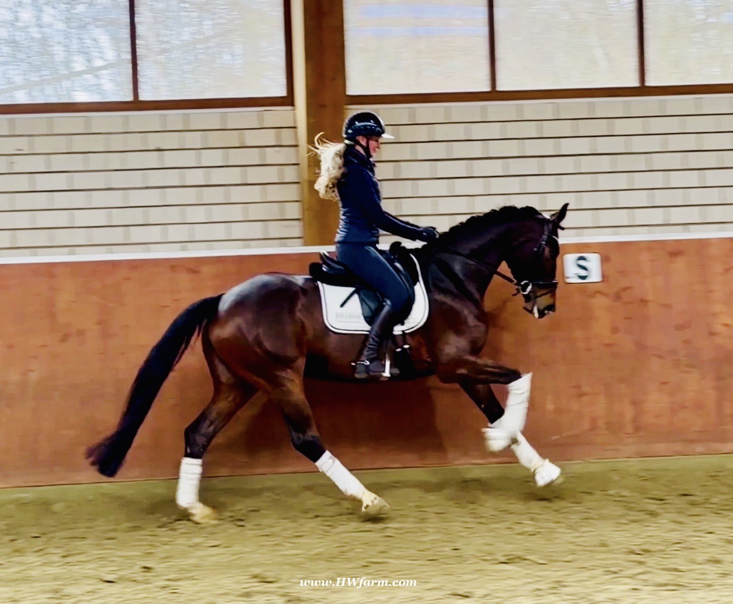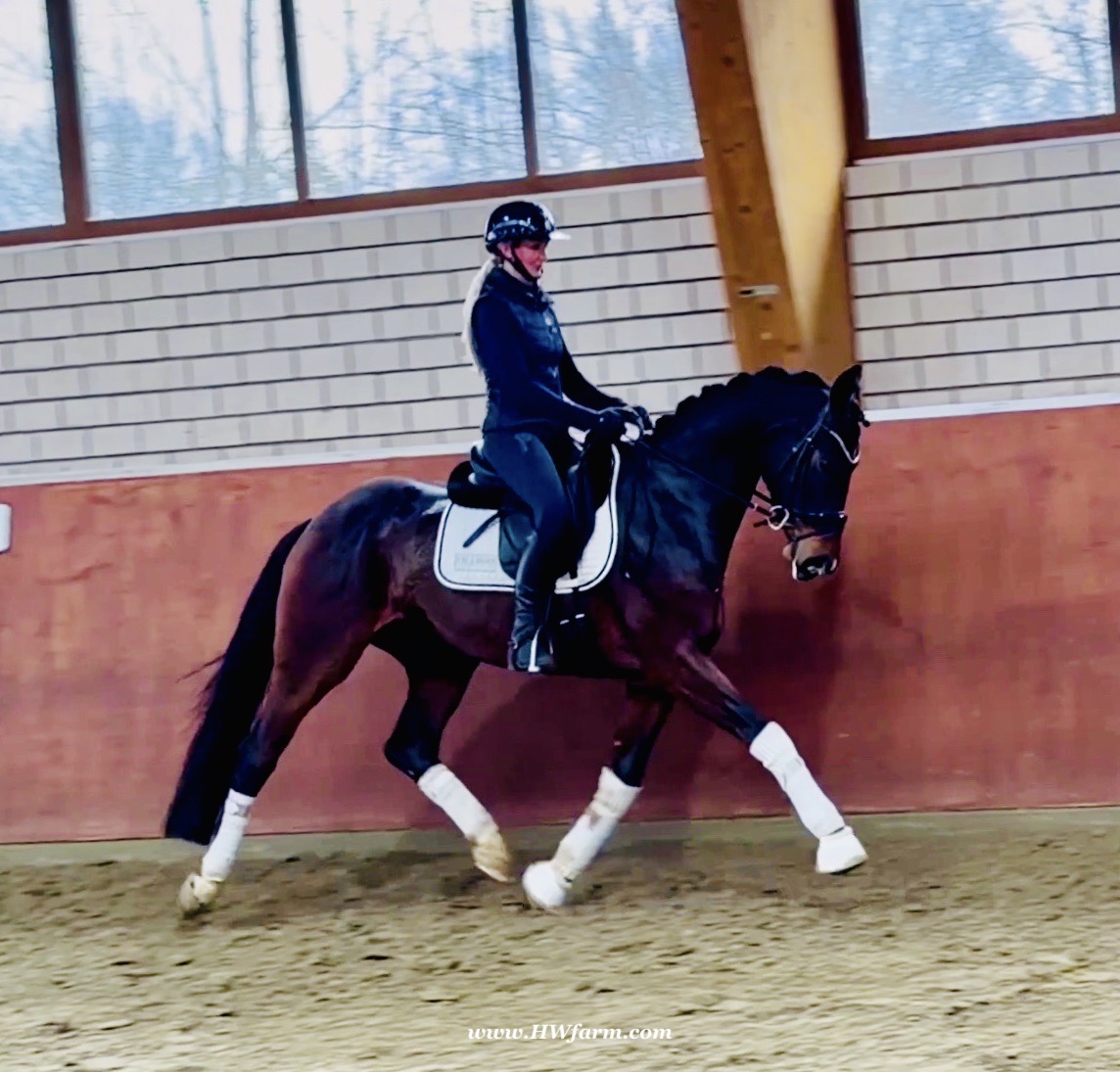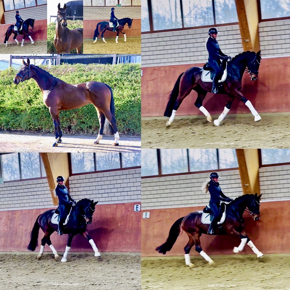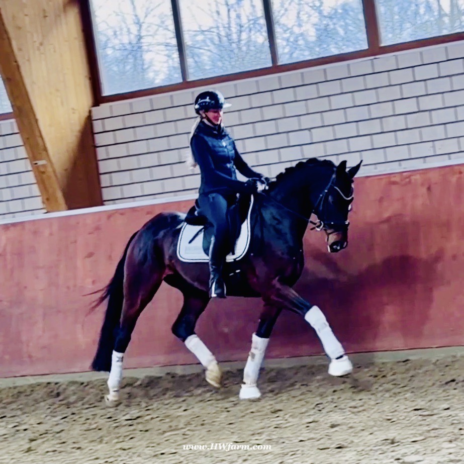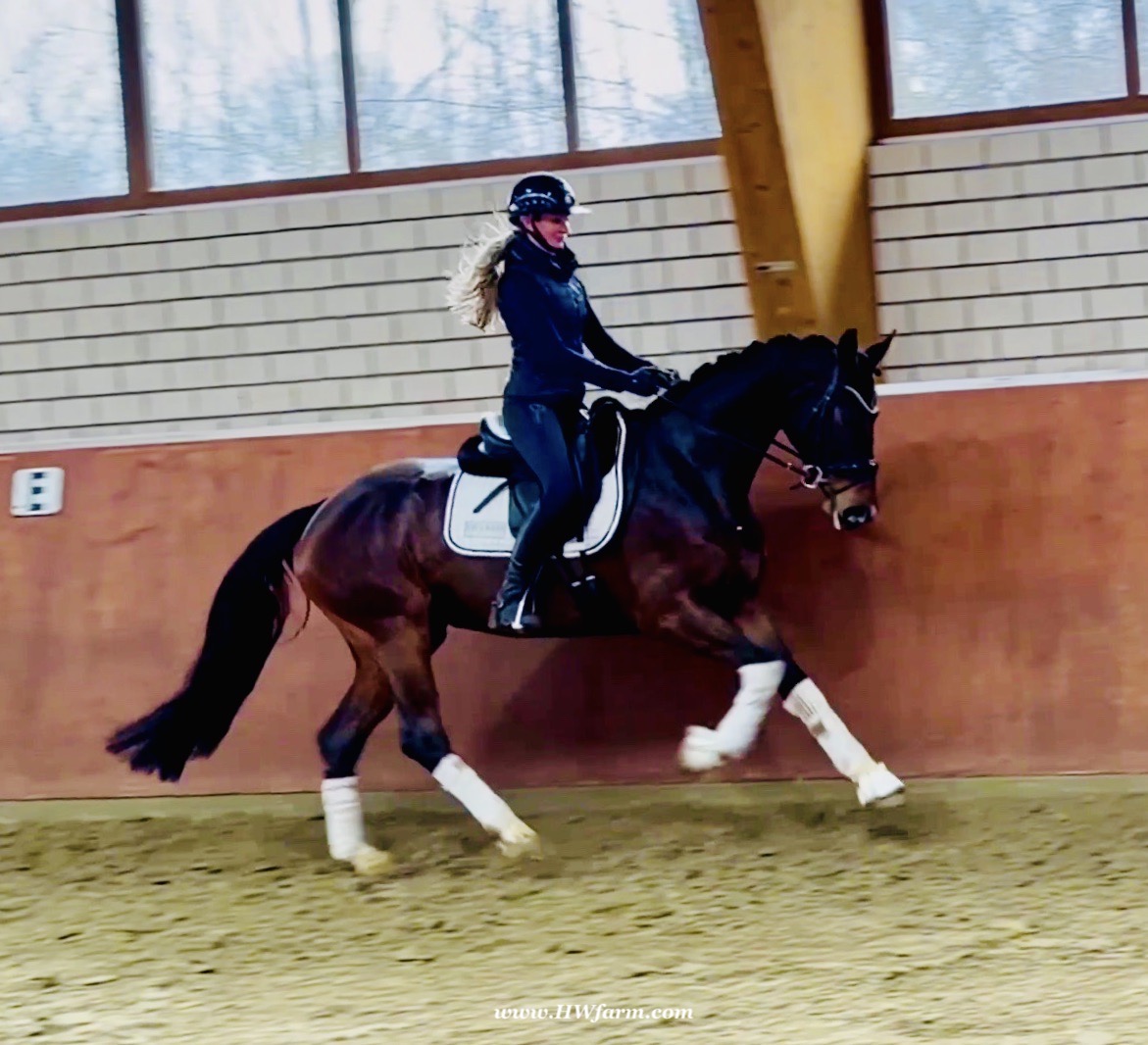 Vivat Rose HW, bay Hanoverian mare by Vivat Rex/Dancier born in 2021, standing approximately 167 cm or 16.2 hands. Vivat Rose HW is by the famous and elegant stallion Vivat Rex, he truly resembles a near copy modernity with ingenuity. Definitely a king, uniquely modeled, he dances into the hearts of the observers. Top quality with great potential. His quality of movement is inspiring and admirable. Father Vivaldi was reserve champion at the performance test in the Netherlands and won the Pavo Cup for five-year-olds in 2007. He was ridden by Hans Peter Minderhoud/NED to victory in the KNHS/KWPN stallion series in 2008 and 2009, receiving a 10.0 for his trot. The sire Krack C is considered a foundation stallion in the Netherlands. The two-time Pavo Cup winner from 1996 and 1997 took eighth place in the individual classification at the 2002 World Equestrian Games in Jerez/ESP under Anky van Grunsven/NED. Vivaldi comes from the Utopia line, the most successful Dutch mare family. Elite mare Symphonie, mother of Vivat Rex, descends from Samarant, one of Sandro Hit x Brentano II, was Hanoverian Vice State Champion and finalist at the Bundeschampionat riding horses. In 2006 he qualified for the Bundeschampionat for 5-year-old dressage horses. In 2008 he was sold to Denmark and presented internationally by Andreas Helgstrand-DEN, among others. Granddam Sandy, also an elite mare, descends from the great Rubinstein. Rubinstein I is a son of the Westphalian Romadour II son Rosenkavalier, who himself was a stallion performance test winner and is now one of the most important Westphalian sires. He was bred from what is probably the most important dressage dynasty in the world. The mother Antine is full sister of the international top dressage horses Ahlerich 2/Dr. Reiner Klimke and Amon/Annemarie Sanders-Keyzer (NL Her full sister Adone gave the multi-Olymionist Rembrandt 24/Nicole Uphoff. Rubinstein I can now look back on a tailor-made career. Winner in the "Optimum" of material horses in Münster 1990, I a- Winner of the main premium in Oldenburg, Vice Bundeschampion of the German dressage horse in Verden in 1992, multiple Oldenburg dressage champion, serial winner in dressage classes at S level and multiple Grand Prix winners. In the meantime, Rubinstein I and Nicole Uphoff can look back to international victories in the dressage arena. Vivat Rex comes from the dam line of Große Liebe: Grand Prix successful horses Pikko del Cerro with Lisa Wilcox and licensing champion Boreas by Bordeaux is with Christina Vinios USA. Modernität mit Genialität Mit seltenem Habitus ausgestatteter König. Einzigartig modelliert, tanzt er in die Herzen der Beobachter. In der Qualität mit großartigem Potenzial. Seine Bewegungsgüte ist begeisternd und bewundernswert. Vater Vivaldi war in den Niederlanden HLP-Reservesieger und gewann 2007 den Pavo Cup der Fünfjährigen. Von Hans Peter Minderhoud/NED wurde er 2008 und 2009 zum Sieg in der KNHS/KWPN Hengste-Serie geritten, wobei er für seinen Trab die 10,0 erhielt. Der Vater Krack C gilt in den Niederlanden als Stempelhengst. Der zweifache Pavo Cup-Sieger von 1996 und 97 belegte unter Anky van Grunsven/NED Platz acht in der Einzelwertung der Weltreiterspiele 2002 in Jerez/ESPDer Muttervater Jazz gehörte 2002 unter Tineke Bartes zur Niederländischen Equipe bei den Weltreiterspielen in Jerez/ESP. Vivaldi entstammt dem Utopia-Stamm, der erfolgreichsten niederländischen Stutenfamilie. Elite Stute Symphonie, Mutter von Vivat Rex, stammt ab vom Samarant, ein des Sandro Hit x Brentano II, war Hannoveraner Vize-Landeschampion und Finalteilnehmer am Bundeschampionat Reitpferde. 2006 hat er sich für das Bundeschampionat der 5-jährigen Dressurpferde qualifiziert. 2008 wurde er nach Dänemark verkauft und u.a. von Andreas Helgstrand-DEN international vorgestellt. Großmutter Sandy auch Elitestute stammt ab vom großartigen Rubinstein. Rubinstein I ist ein Sohn des westfälischen Romadour II-Sohnes Rosenkavalier, der selbst HLP-Sieger war und heute zu den bedeutendsten westfälischen Vererbern zählt. Er ist gezogen aus der wohl bedeutendsten Dressurdynastie der Welt. Die Mutter Antine ist Vollschwester der internationalen Spitzen-Dressurpferde Ahlerich 2/Dr. Reiner Klimke und Amon/Annemarie Sanders-Keyzer (NL Ihre Vollschwester Adone schenkte dem Multi-Olymioniken Rembrandt 24/Nicole Uphoff. Rubinstein I blickt inzwischen auf eine Karriere nach Maß zurück. Sieger im "Optimum" der Materialpferde in Münster 1990, I a- Hauptprämiensieger in Oldenburg, Vize-Bundeschampion des Deutschen Dressurpferdes 1992 in Verden, mehrfacher Oldenburger Dressurchampion, Seriensieger in Dressuren der Klasse S und vielfacher Grand-Prix-Sieger. Inzwischen ist Rubinstein I mit Nicole Uphoff international im Viereck auf Sieg abonniert. Das Paar zählt zum deutschen Dressur-Establishment. Vivat Rex entspringt dem Stutenstamm der Großen Liebe: Grand Prix erfolgreiche Pferde Pikko del Cerro mit Lisa Wilcox und Körsieger Boreas v. Bordeaux heute bei Christina Vinios USA. Vivat Rose HW's dam sire is by the sensational stallion Dancier. Dancier, authoritative winner of his performance test and stallion licensing, was also proclaimed Best Hanoverian Stallion of 2002. This success won him the "Freiherr von Stenglin" award. As a young stallion, Dancier qualified twice for the national Championships in Warendorf and celebrated his first successes in the advanced class at the youthful age of eight. A son of the top class dressage progenitor, De Niro, this noble, attractive black stallion appears on the way to his own excellence as a sire. Dancier Lancier is by the venerable Laurie's Crusador xx, Hanoverian Stallion of the Year 2006, a rare honor for a Thoroughbred stallion. Dancier was awarded the perfect score of 10 for his walk, 9.5 for his canter and 9.2 for his walk. As a four year old he placed third in the Bundeschampionate. He is noted for his exceptional temperament and good ability to work fr
