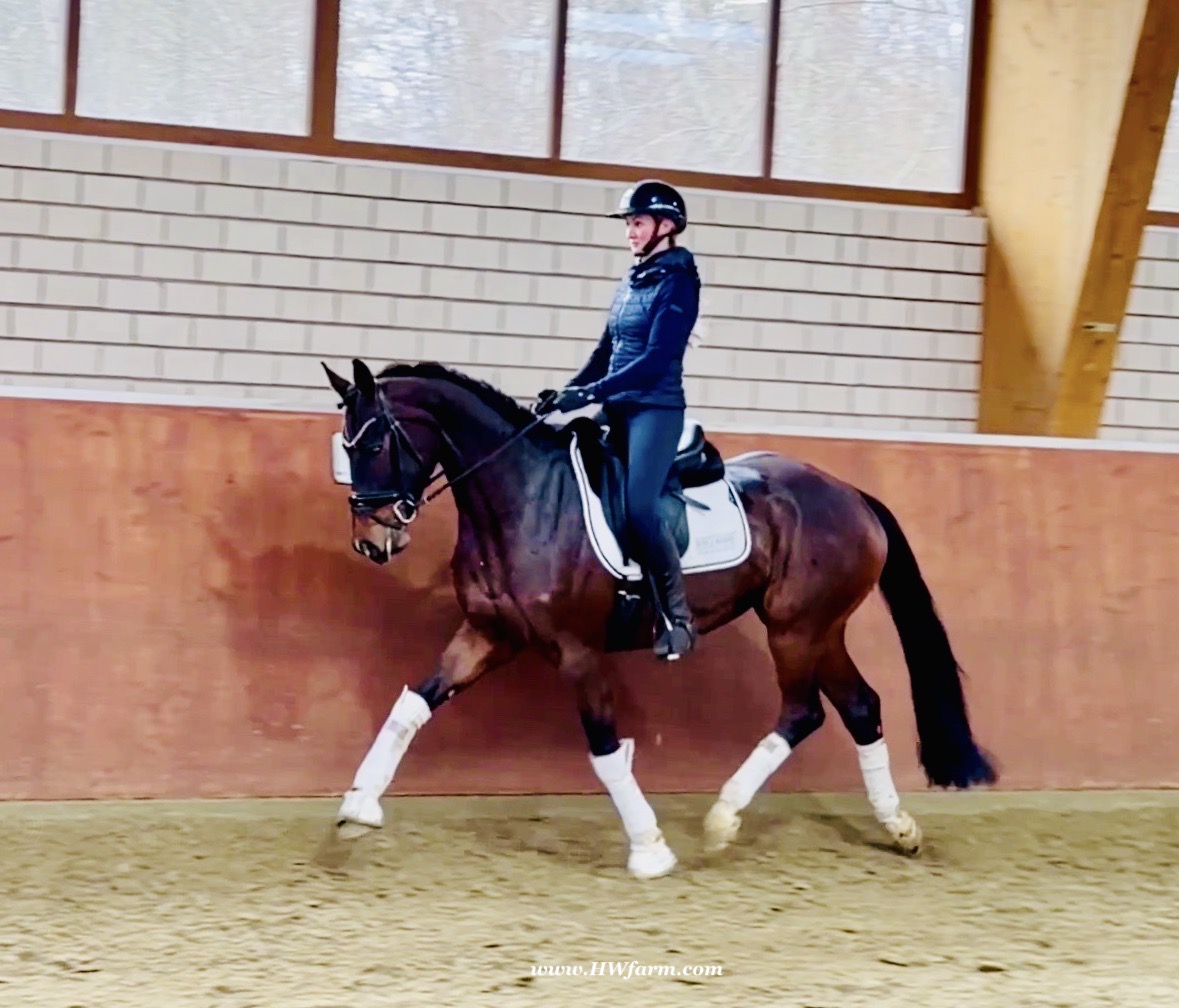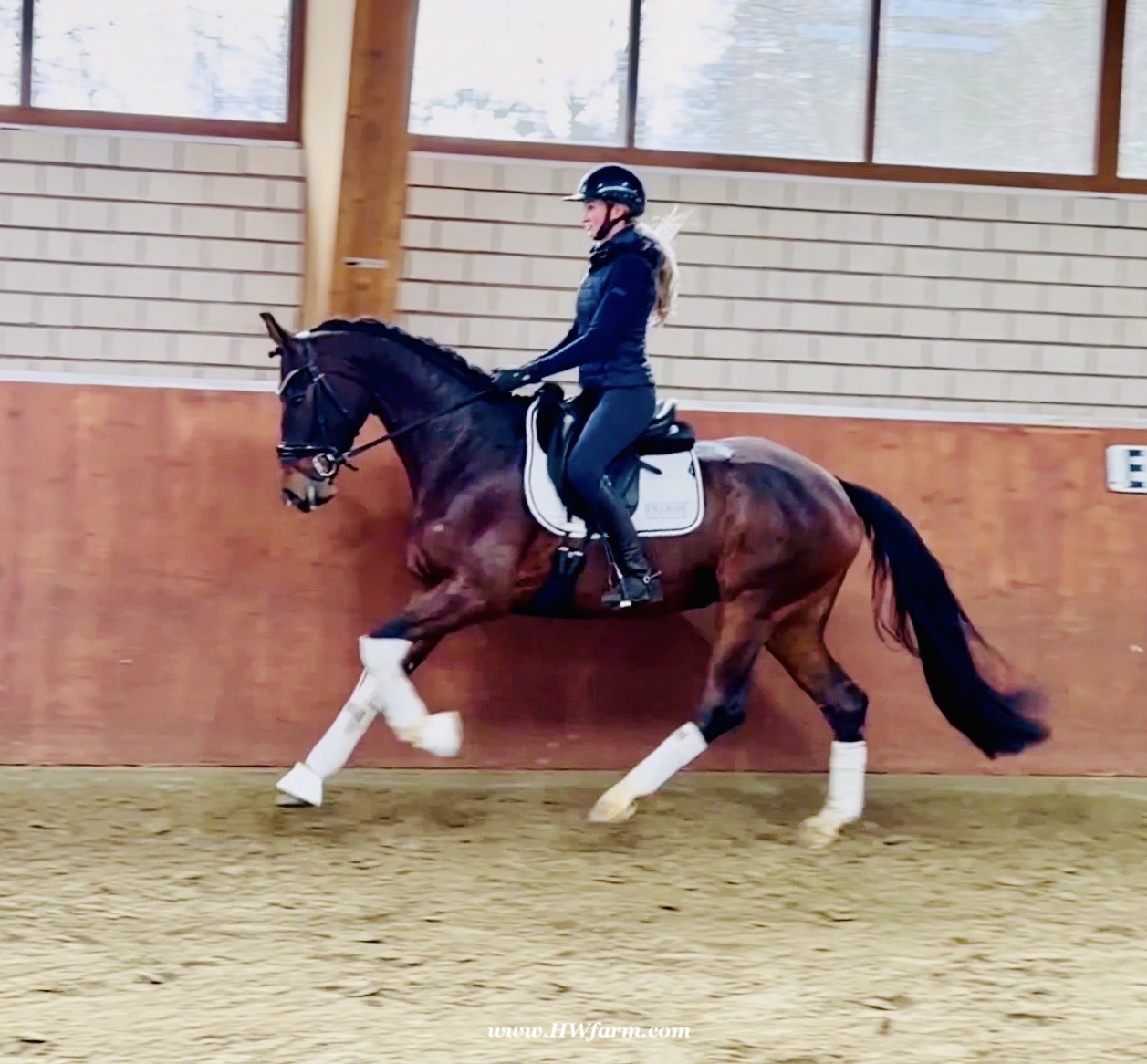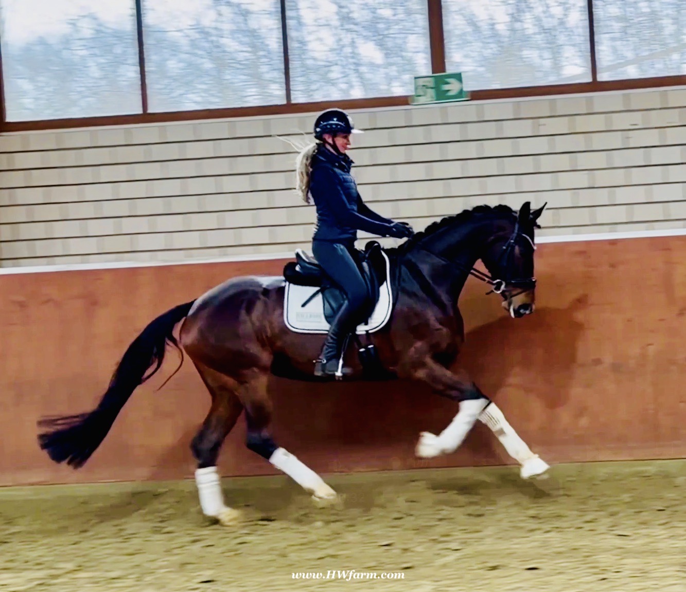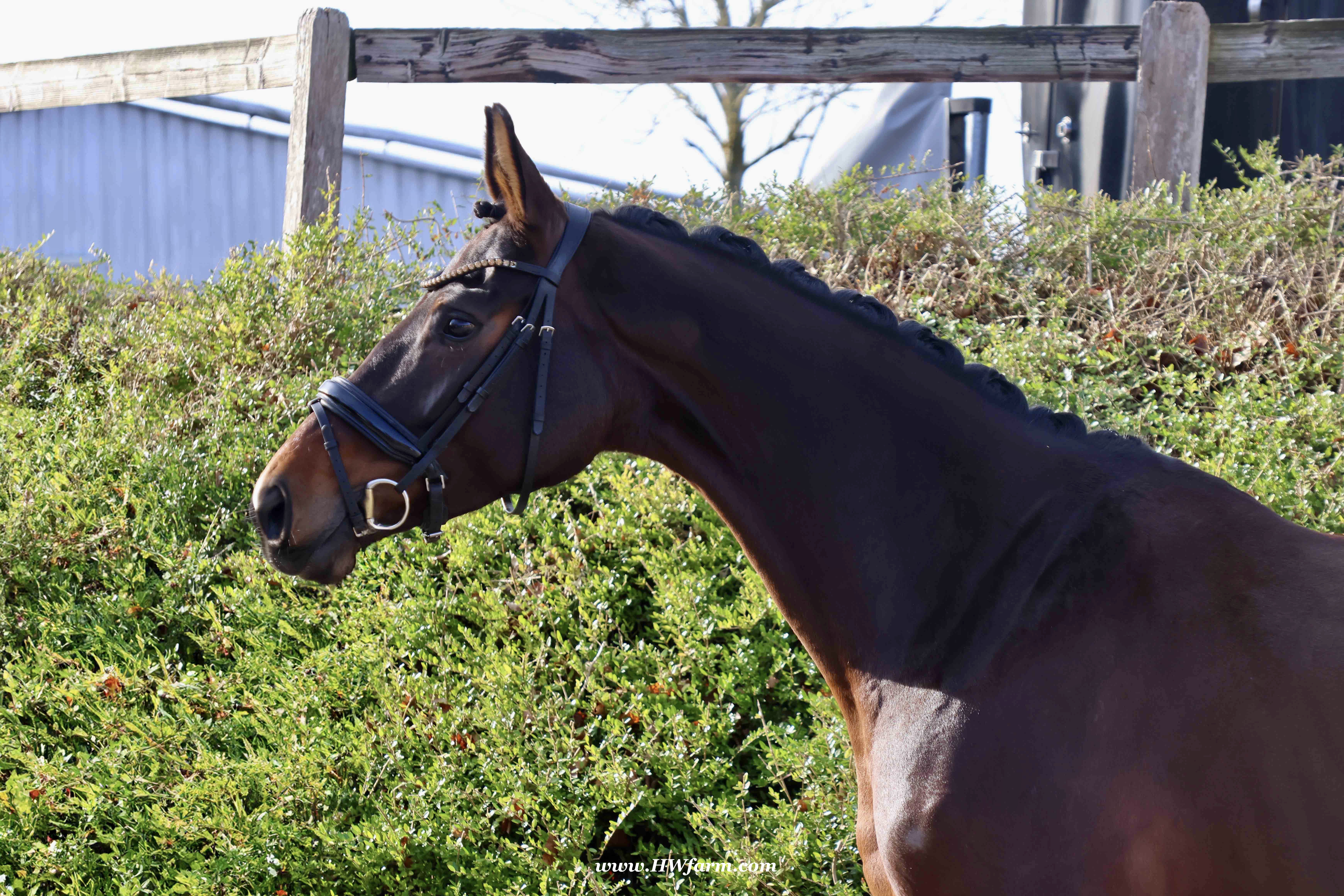 Vivat Rose HW, bay Hanoverian mare by Vivat Rex/Dancier born in 2021, standing approximately 167 cm or 16.2 hands. Vivat Rose HW is by the famous and elegant stallion Vivat Rex, he truly resembles a near copy modernity with ingenuity. Definitely a king, uniquely modeled, he dances into the hearts of the observers. Top quality with great potential. His quality of movement is inspiring and admirable. Father Vivaldi was reserve champion at the performance test in the Netherlands and won the Pavo Cup for five-year-olds in 2007. He was ridden by Hans Peter Minderhoud/NED to victory in the KNHS/KWPN stallion series in 2008 and 2009, receiving a 10.0 for his trot. The sire Krack C is considered a foundation stallion in the Netherlands. The two-time Pavo Cup winner from 1996 and 1997 took eighth place in the individual classification at the 2002 World Equestrian Games in Jerez/ESP under Anky van Grunsven/NED. Vivaldi comes from the Utopia line, the most successful Dutch mare family. Elite mare Symphonie, mother of Vivat Rex, descends from Samarant, one of Sandro Hit x Brentano II, was Hanoverian Vice State Champion and finalist at the Bundeschampionat riding horses. In 2006 he qualified for the Bundeschampionat for 5-year-old dressage horses. In 2008 he was sold to Denmark and presented internationally by Andreas Helgstrand-DEN, among others. Granddam Sandy, also an elite mare, descends from the great Rubinstein. Rubinstein I is a son of the Westphalian Romadour II son Rosenkavalier, who himself was a stallion performance test winner and is now one of the most important Westphalian sires. He was bred from what is probably the most important dressage dynasty in the world. The mother Antine is full sister of the international top dressage horses Ahlerich 2/Dr. Reiner Klimke and Amon/Annemarie Sanders-Keyzer (NL Her full sister Adone gave the multi-Olymionist Rembrandt 24/Nicole Uphoff. Rubinstein I can now look back on a tailor-made career. Winner in the "Optimum" of material horses in Münster 1990, I a- Winner of the main premium in Oldenburg, Vice Bundeschampion of the German dressage horse in Verden in 1992, multiple Oldenburg dressage champion, serial winner in dressage classes at S level and multiple Grand Prix winners. In the meantime, Rubinstein I and Nicole Uphoff can look back to international victories in the dressage arena. Vivat Rex comes from the dam line of Große Liebe: Grand Prix successful horses Pikko del Cerro with Lisa Wilcox and licensing champion Boreas by Bordeaux is with Christina Vinios USA. Modernität mit Genialität Mit seltenem Habitus ausgestatteter König. Einzigartig modelliert, tanzt er in die Herzen der Beobachter. In der Qualität mit großartigem Potenzial. Seine Bewegungsgüte ist begeisternd und bewundernswert. Vater Vivaldi war in den Niederlanden HLP-Reservesieger und gewann 2007 den Pavo Cup der Fünfjährigen. Von Hans Peter Minderhoud/NED wurde er 2008 und 2009 zum Sieg in der KNHS/KWPN Hengste-Serie geritten, wobei er für seinen Trab die 10,0 erhielt. Der Vater Krack C gilt in den Niederlanden als Stempelhengst. Der zweifache Pavo Cup-Sieger von 1996 und 97 belegte unter Anky van Grunsven/NED Platz acht in der Einzelwertung der Weltreiterspiele 2002 in Jerez/ESPDer Muttervater Jazz gehörte 2002 unter Tineke Bartes zur Niederländischen Equipe bei den Weltreiterspielen in Jerez/ESP. Vivaldi entstammt dem Utopia-Stamm, der erfolgreichsten niederländischen Stutenfamilie. Elite Stute Symphonie, Mutter von Vivat Rex, stammt ab vom Samarant, ein des Sandro Hit x Brentano II, war Hannoveraner Vize-Landeschampion und Finalteilnehmer am Bundeschampionat Reitpferde. 2006 hat er sich für das Bundeschampionat der 5-jährigen Dressurpferde qualifiziert. 2008 wurde er nach Dänemark verkauft und u.a. von Andreas Helgstrand-DEN international vorgestellt. Großmutter Sandy auch Elitestute stammt ab vom großartigen Rubinstein. Rubinstein I ist ein Sohn des westfälischen Romadour II-Sohnes Rosenkavalier, der selbst HLP-Sieger war und heute zu den bedeutendsten westfälischen Vererbern zählt. Er ist gezogen aus der wohl bedeutendsten Dressurdynastie der Welt. Die Mutter Antine ist Vollschwester der internationalen Spitzen-Dressurpferde Ahlerich 2/Dr. Reiner Klimke und Amon/Annemarie Sanders-Keyzer (NL Ihre Vollschwester Adone schenkte dem Multi-Olymioniken Rembrandt 24/Nicole Uphoff. Rubinstein I blickt inzwischen auf eine Karriere nach Maß zurück. Sieger im "Optimum" der Materialpferde in Münster 1990, I a- Hauptprämiensieger in Oldenburg, Vize-Bundeschampion des Deutschen Dressurpferdes 1992 in Verden, mehrfacher Oldenburger Dressurchampion, Seriensieger in Dressuren der Klasse S und vielfacher Grand-Prix-Sieger. Inzwischen ist Rubinstein I mit Nicole Uphoff international im Viereck auf Sieg abonniert. Das Paar zählt zum deutschen Dressur-Establishment. Vivat Rex entspringt dem Stutenstamm der Großen Liebe: Grand Prix erfolgreiche Pferde Pikko del Cerro mit Lisa Wilcox und Körsieger Boreas v. Bordeaux heute bei Christina Vinios USA. Vivat Rose HW's dam sire is by the sensational stallion Dancier. Dancier, authoritative winner of his performance test and stallion licensing, was also proclaimed Best Hanoverian Stallion of 2002. This success won him the "Freiherr von Stenglin" award. As a young stallion, Dancier qualified twice for the national Championships in Warendorf and celebrated his first successes in the advanced class at the youthful age of eight. A son of the top class dressage progenitor, De Niro, this noble, attractive black stallion appears on the way to his own excellence as a sire. Dancier Lancier is by the venerable Laurie's Crusador xx, Hanoverian Stallion of the Year 2006, a rare honor for a Thoroughbred stallion. Dancier was awarded the perfect score of 10 for his walk, 9.5 for his canter and 9.2 for his walk. As a four year old he placed third in the Bundeschampionate. He is noted for his exceptional temperament and good ability to work fr