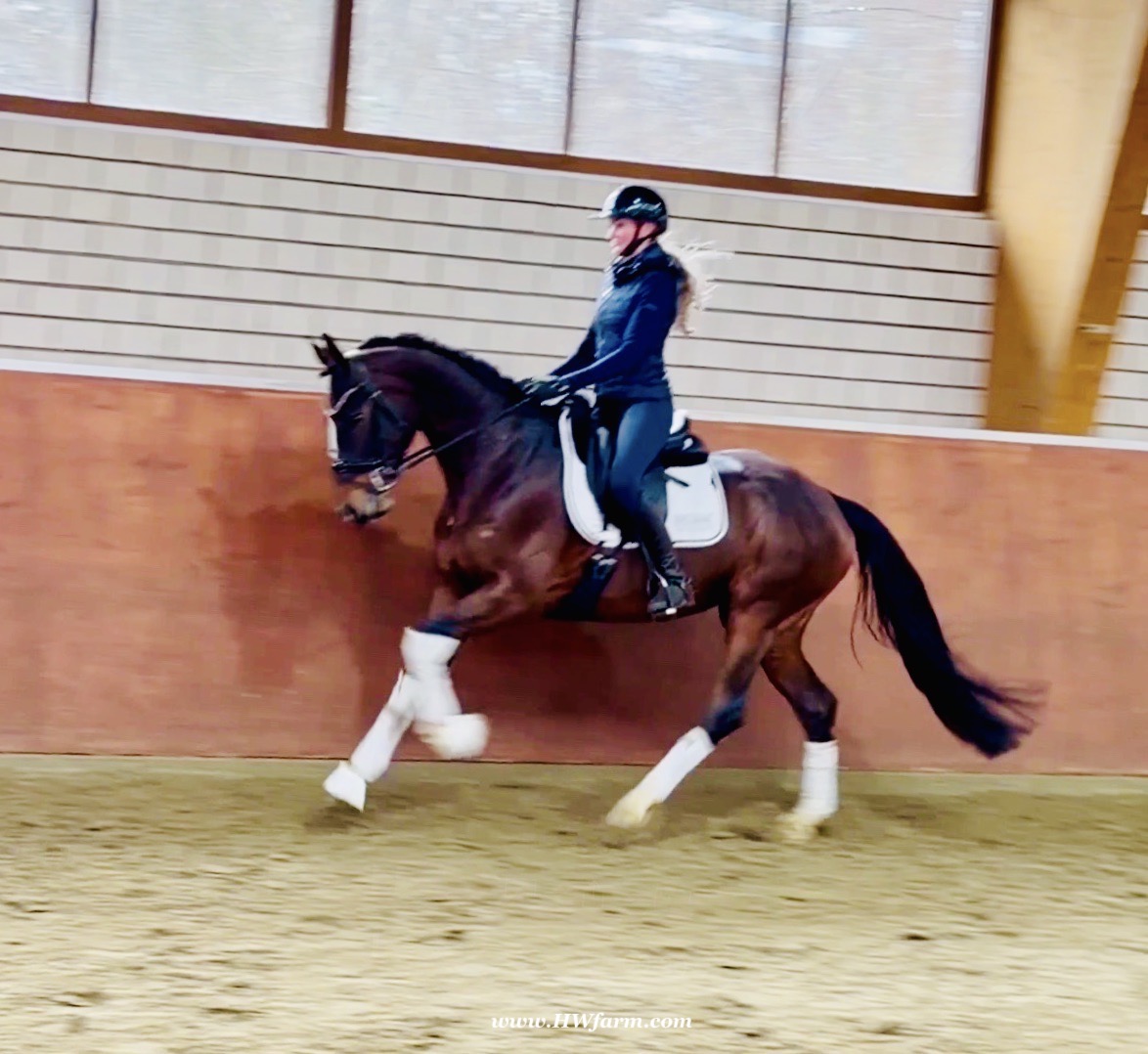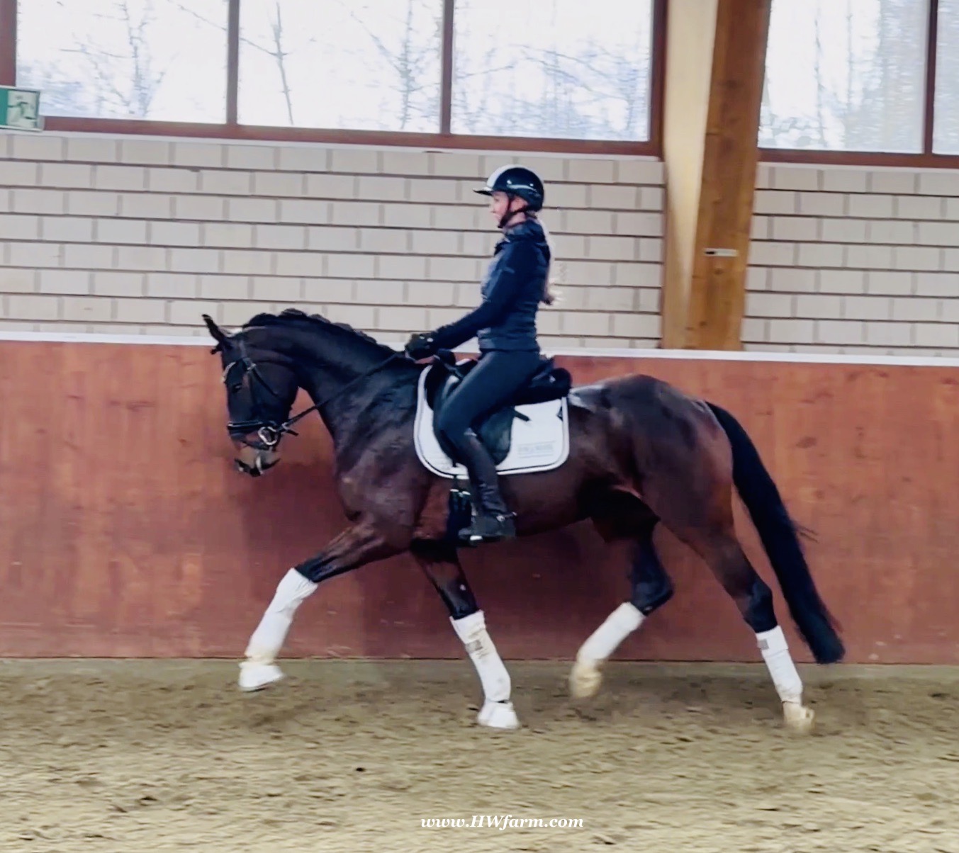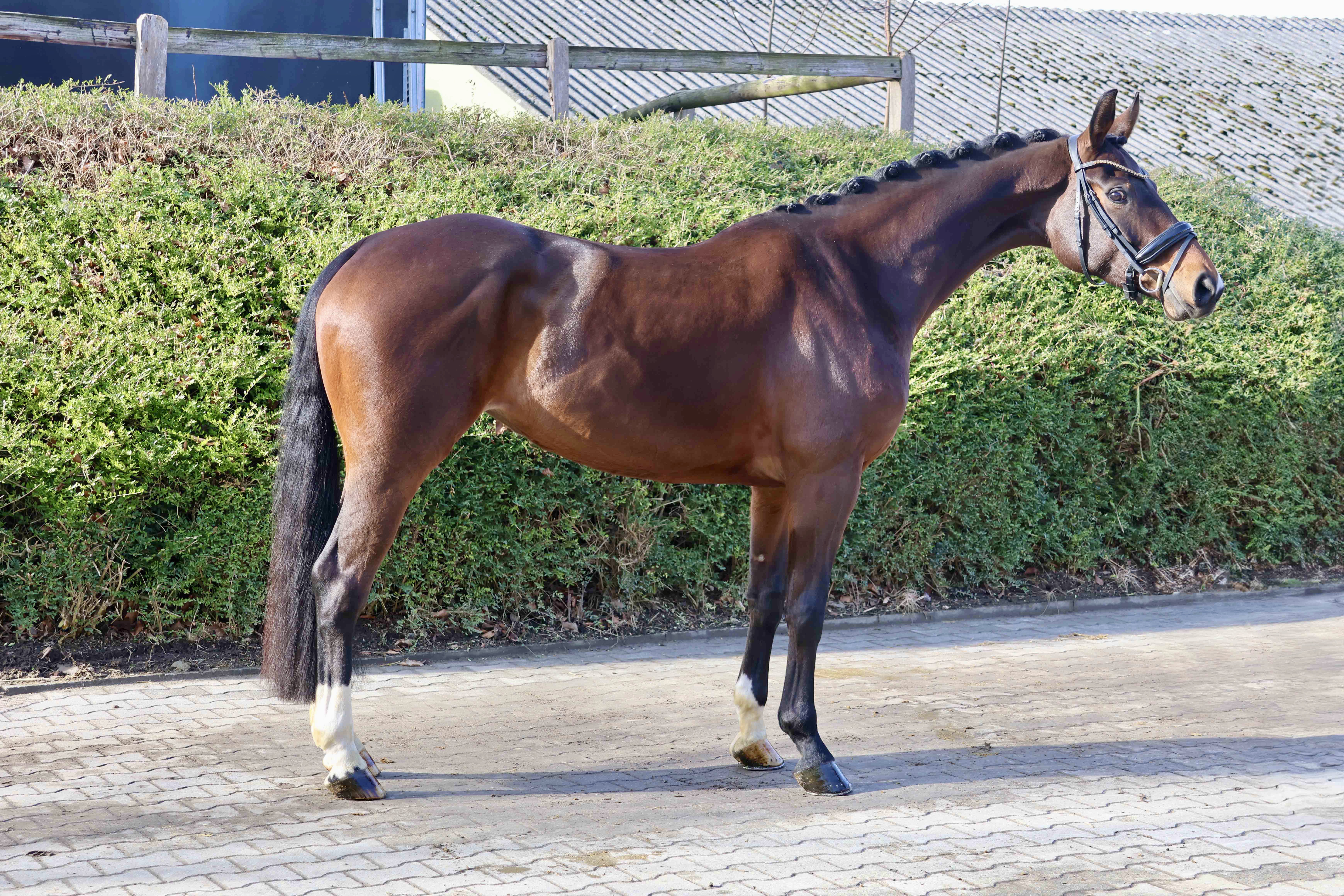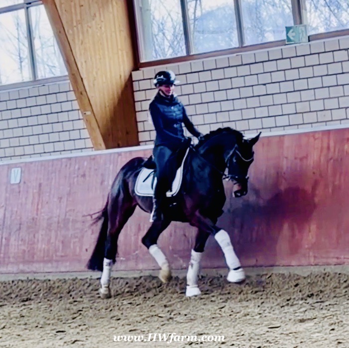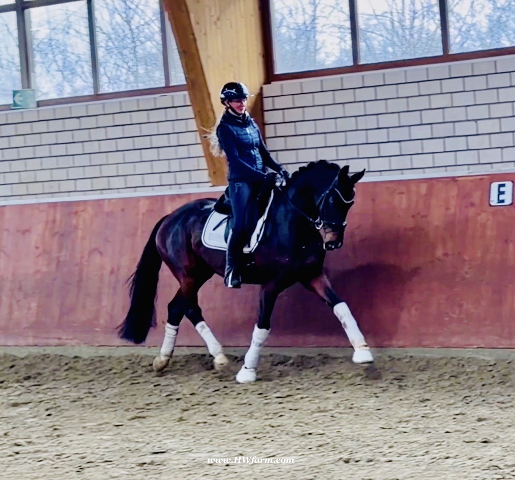 Vivat Rose HW, bay Hanoverian mare by Vivat Rex/Dancier born in 2021, standing approximately 167 cm or 16.2 hands. Vivat Rose HW is by the famous and elegant stallion Vivat Rex, he truly resembles a near copy modernity with ingenuity. Definitely a king, uniquely modeled, he dances into the hearts of the observers. Top quality with great potential. His quality of movement is inspiring and admirable. Father Vivaldi was reserve champion at the performance test in the Netherlands and won the Pavo Cup for five-year-olds in 2007. He was ridden by Hans Peter Minderhoud/NED to victory in the KNHS/KWPN stallion series in 2008 and 2009, receiving a 10.0 for his trot. The sire Krack C is considered a foundation stallion in the Netherlands. The two-time Pavo Cup winner from 1996 and 1997 took eighth place in the individual classification at the 2002 World Equestrian Games in Jerez/ESP under Anky van Grunsven/NED. Vivaldi comes from the Utopia line, the most successful Dutch mare family. Elite mare Symphonie, mother of Vivat Rex, descends from Samarant, one of Sandro Hit x Brentano II, was Hanoverian Vice State Champion and finalist at the Bundeschampionat riding horses. In 2006 he qualified for the Bundeschampionat for 5-year-old dressage horses. In 2008 he was sold to Denmark and presented internationally by Andreas Helgstrand-DEN, among others. Granddam Sandy, also an elite mare, descends from the great Rubinstein. Rubinstein I is a son of the Westphalian Romadour II son Rosenkavalier, who himself was a stallion performance test winner and is now one of the most important Westphalian sires. He was bred from what is probably the most important dressage dynasty in the world. The mother Antine is full sister of the international top dressage horses Ahlerich 2/Dr. Reiner Klimke and Amon/Annemarie Sanders-Keyzer (NL Her full sister Adone gave the multi-Olymionist Rembrandt 24/Nicole Uphoff. Rubinstein I can now look back on a tailor-made career. Winner in the "Optimum" of material horses in Münster 1990, I a- Winner of the main premium in Oldenburg, Vice Bundeschampion of the German dressage horse in Verden in 1992, multiple Oldenburg dressage champion, serial winner in dressage classes at S level and multiple Grand Prix winners. In the meantime, Rubinstein I and Nicole Uphoff can look back to international victories in the dressage arena. Vivat Rex comes from the dam line of Große Liebe: Grand Prix successful horses Pikko del Cerro with Lisa Wilcox and licensing champion Boreas by Bordeaux is with Christina Vinios USA. Modernität mit Genialität Mit seltenem Habitus ausgestatteter König. Einzigartig modelliert, tanzt er in die Herzen der Beobachter. In der Qualität mit großartigem Potenzial. Seine Bewegungsgüte ist begeisternd und bewundernswert. Vater Vivaldi war in den Niederlanden HLP-Reservesieger und gewann 2007 den Pavo Cup der Fünfjährigen. Von Hans Peter Minderhoud/NED wurde er 2008 und 2009 zum Sieg in der KNHS/KWPN Hengste-Serie geritten, wobei er für seinen Trab die 10,0 erhielt. Der Vater Krack C gilt in den Niederlanden als Stempelhengst. Der zweifache Pavo Cup-Sieger von 1996 und 97 belegte unter Anky van Grunsven/NED Platz acht in der Einzelwertung der Weltreiterspiele 2002 in Jerez/ESPDer Muttervater Jazz gehörte 2002 unter Tineke Bartes zur Niederländischen Equipe bei den Weltreiterspielen in Jerez/ESP. Vivaldi entstammt dem Utopia-Stamm, der erfolgreichsten niederländischen Stutenfamilie. Elite Stute Symphonie, Mutter von Vivat Rex, stammt ab vom Samarant, ein des Sandro Hit x Brentano II, war Hannoveraner Vize-Landeschampion und Finalteilnehmer am Bundeschampionat Reitpferde. 2006 hat er sich für das Bundeschampionat der 5-jährigen Dressurpferde qualifiziert. 2008 wurde er nach Dänemark verkauft und u.a. von Andreas Helgstrand-DEN international vorgestellt. Großmutter Sandy auch Elitestute stammt ab vom großartigen Rubinstein. Rubinstein I ist ein Sohn des westfälischen Romadour II-Sohnes Rosenkavalier, der selbst HLP-Sieger war und heute zu den bedeutendsten westfälischen Vererbern zählt. Er ist gezogen aus der wohl bedeutendsten Dressurdynastie der Welt. Die Mutter Antine ist Vollschwester der internationalen Spitzen-Dressurpferde Ahlerich 2/Dr. Reiner Klimke und Amon/Annemarie Sanders-Keyzer (NL Ihre Vollschwester Adone schenkte dem Multi-Olymioniken Rembrandt 24/Nicole Uphoff. Rubinstein I blickt inzwischen auf eine Karriere nach Maß zurück. Sieger im "Optimum" der Materialpferde in Münster 1990, I a- Hauptprämiensieger in Oldenburg, Vize-Bundeschampion des Deutschen Dressurpferdes 1992 in Verden, mehrfacher Oldenburger Dressurchampion, Seriensieger in Dressuren der Klasse S und vielfacher Grand-Prix-Sieger. Inzwischen ist Rubinstein I mit Nicole Uphoff international im Viereck auf Sieg abonniert. Das Paar zählt zum deutschen Dressur-Establishment. Vivat Rex entspringt dem Stutenstamm der Großen Liebe: Grand Prix erfolgreiche Pferde Pikko del Cerro mit Lisa Wilcox und Körsieger Boreas v. Bordeaux heute bei Christina Vinios USA. Vivat Rose HW's dam sire is by the sensational stallion Dancier. Dancier, authoritative winner of his performance test and stallion licensing, was also proclaimed Best Hanoverian Stallion of 2002. This success won him the "Freiherr von Stenglin" award. As a young stallion, Dancier qualified twice for the national Championships in Warendorf and celebrated his first successes in the advanced class at the youthful age of eight. A son of the top class dressage progenitor, De Niro, this noble, attractive black stallion appears on the way to his own excellence as a sire. Dancier Lancier is by the venerable Laurie's Crusador xx, Hanoverian Stallion of the Year 2006, a rare honor for a Thoroughbred stallion. Dancier was awarded the perfect score of 10 for his walk, 9.5 for his canter and 9.2 for his walk. As a four year old he placed third in the Bundeschampionate. He is noted for his exceptional temperament and good ability to work fr