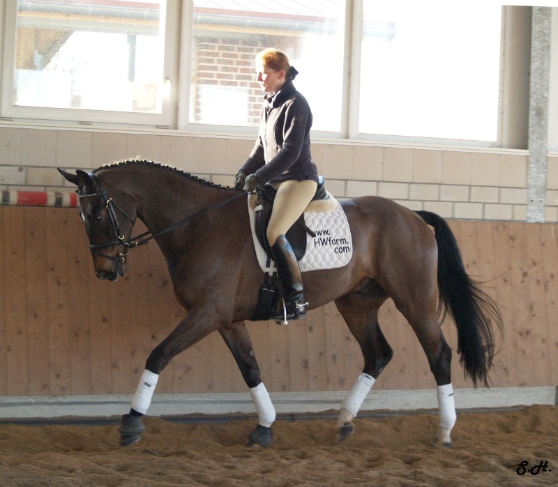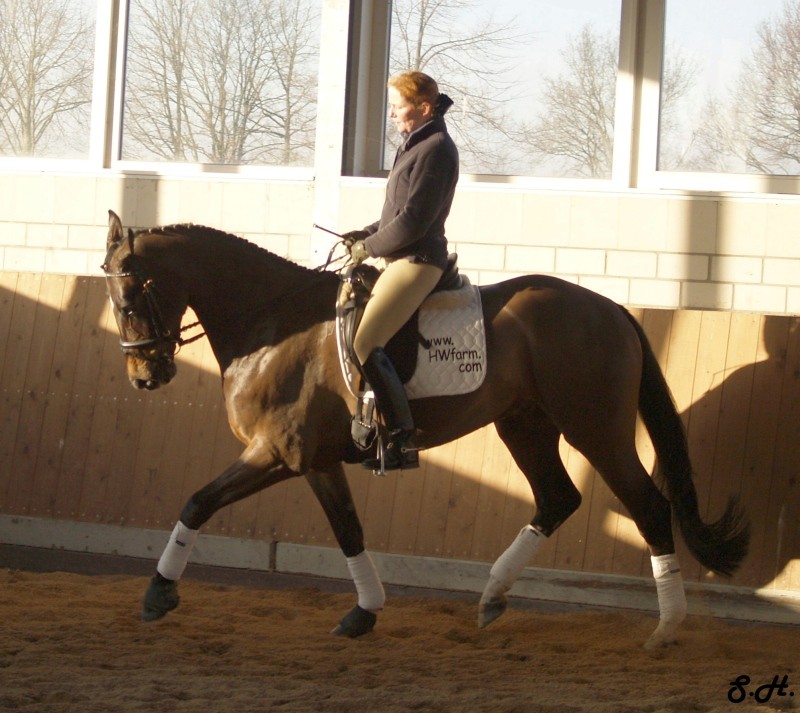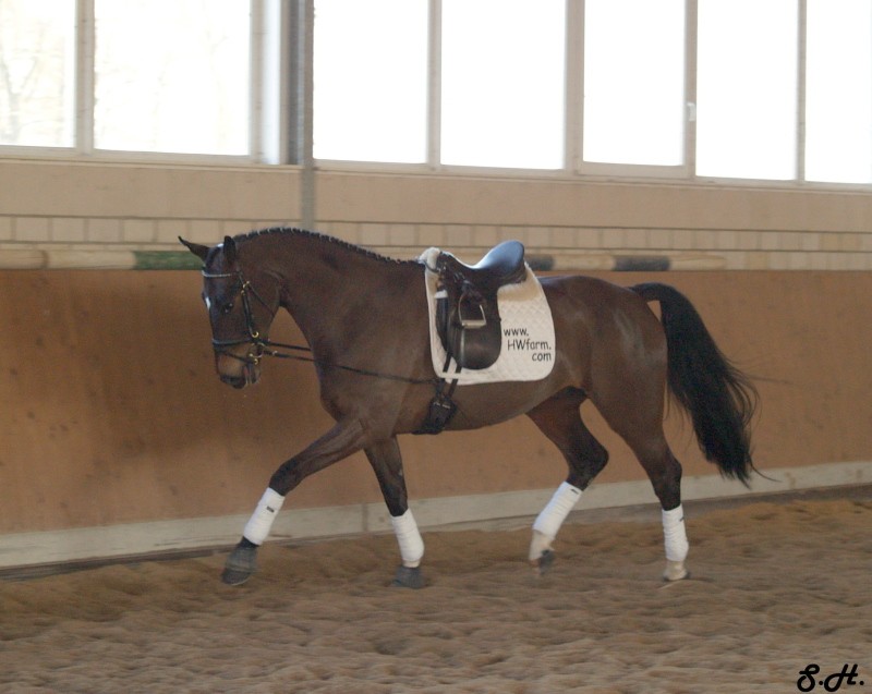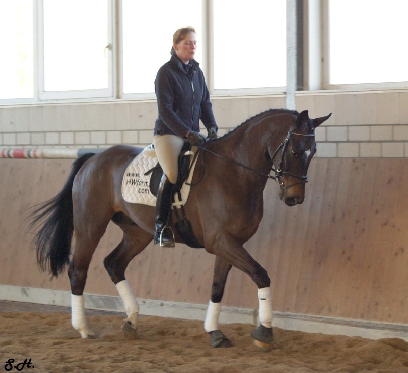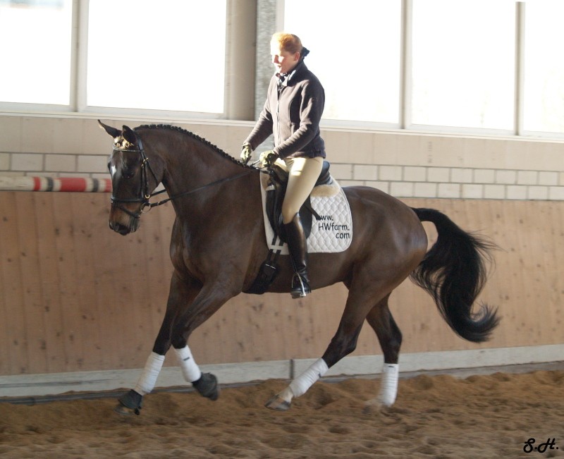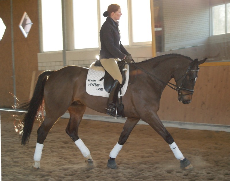 Darling HW is a dark bay Oldenburger gelding by Davignon II/Grand Ferdinand II, born in 2002 and is approximately 16.3 hands. IMPORTED, now in Darling HW can proudly look back on solid Hanoverian bloodlines with the famous Donnerhall, Pik Pube and Grande to name just a few. His sire Davignon II is a modern stallion with a dark jacket and a glamorous face. His body type, ride ability, basic gaits , temperament and character are the most spectacular attributes of Davignon II. Darling HW’s grandfather Donnerhall is well known for his high sport level and his excellent descendants - is surely the most important dressage stallion in the last years. The combination of Donnerhall with mares of Pik Bube - is nearly a guarantee for horses with extra class and high talent. Davignon II is a very special stallion for breeders and a high talented sport horse, so Darling HW has all the ingredients for a successful carrier. Darling HW may go all the way up the levels, be a star in FEI classes and draw attention to himself with his spectacular looks and movement. He has a very good work ethic combined with three very competitive gaits. His trot has a wonderful swinging quality that is not often found in horses this young. It is comfortable to sit, while remaining scopey and forward. He can pursue a dressage carrier, he jumps and would also be a good 3 day eventer. He is an energetic (but not hot), forward moving and fun horse for every day fun. Steady in the bit, with a phenomenal rhythm as well as balance and outstanding gaits will give you the feeling that you are sitting on clouds. He is really easy to sit because he swings through his whole body including the back and will not bounce you around in the saddle. He is a solid First Level horse right