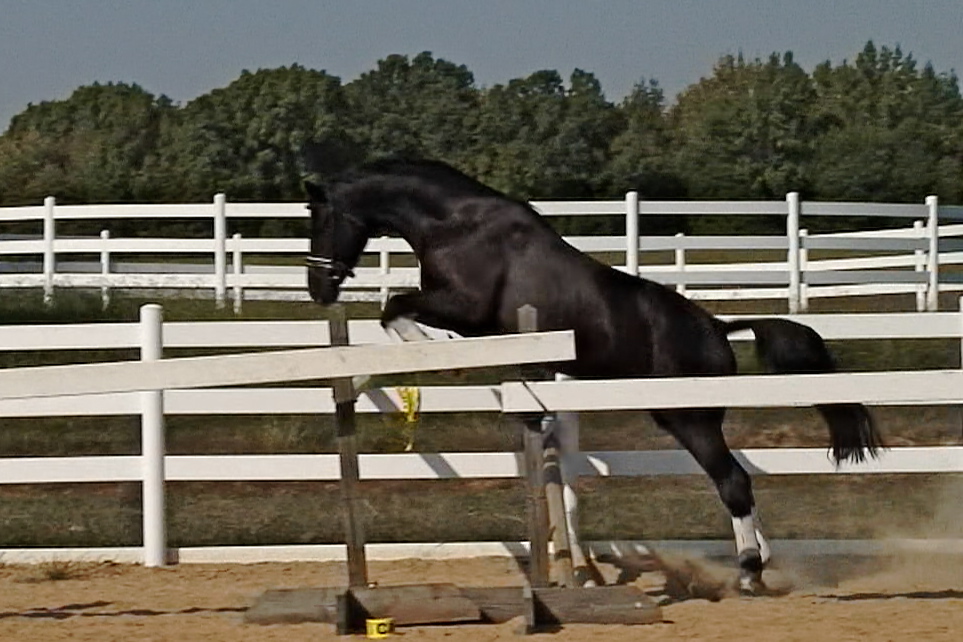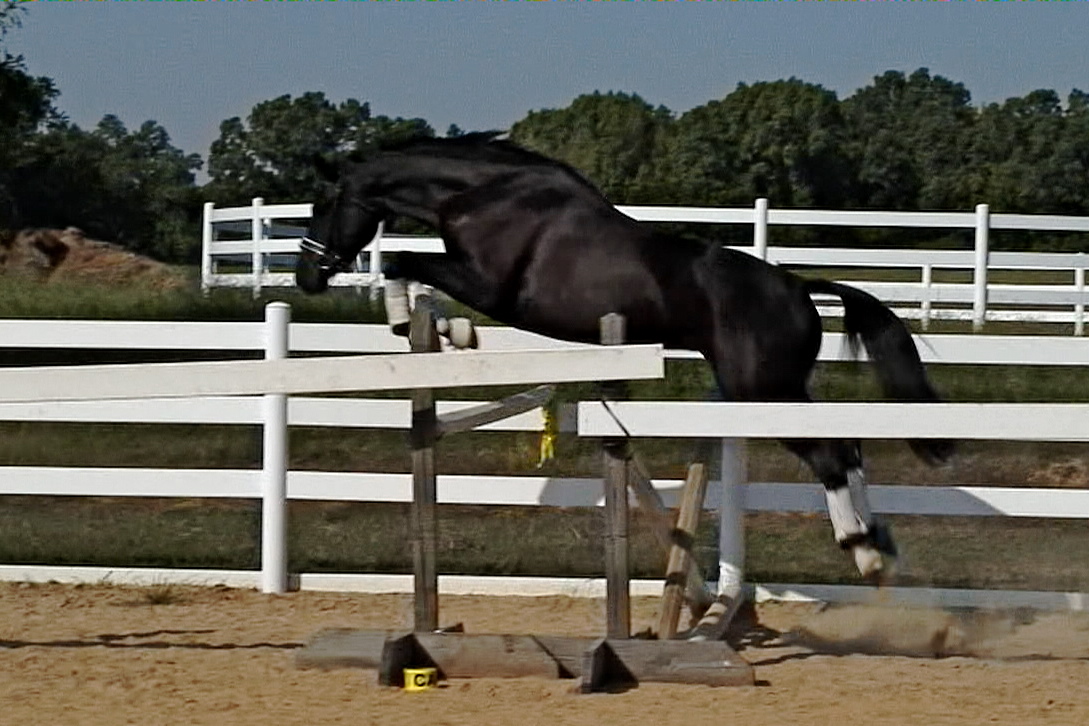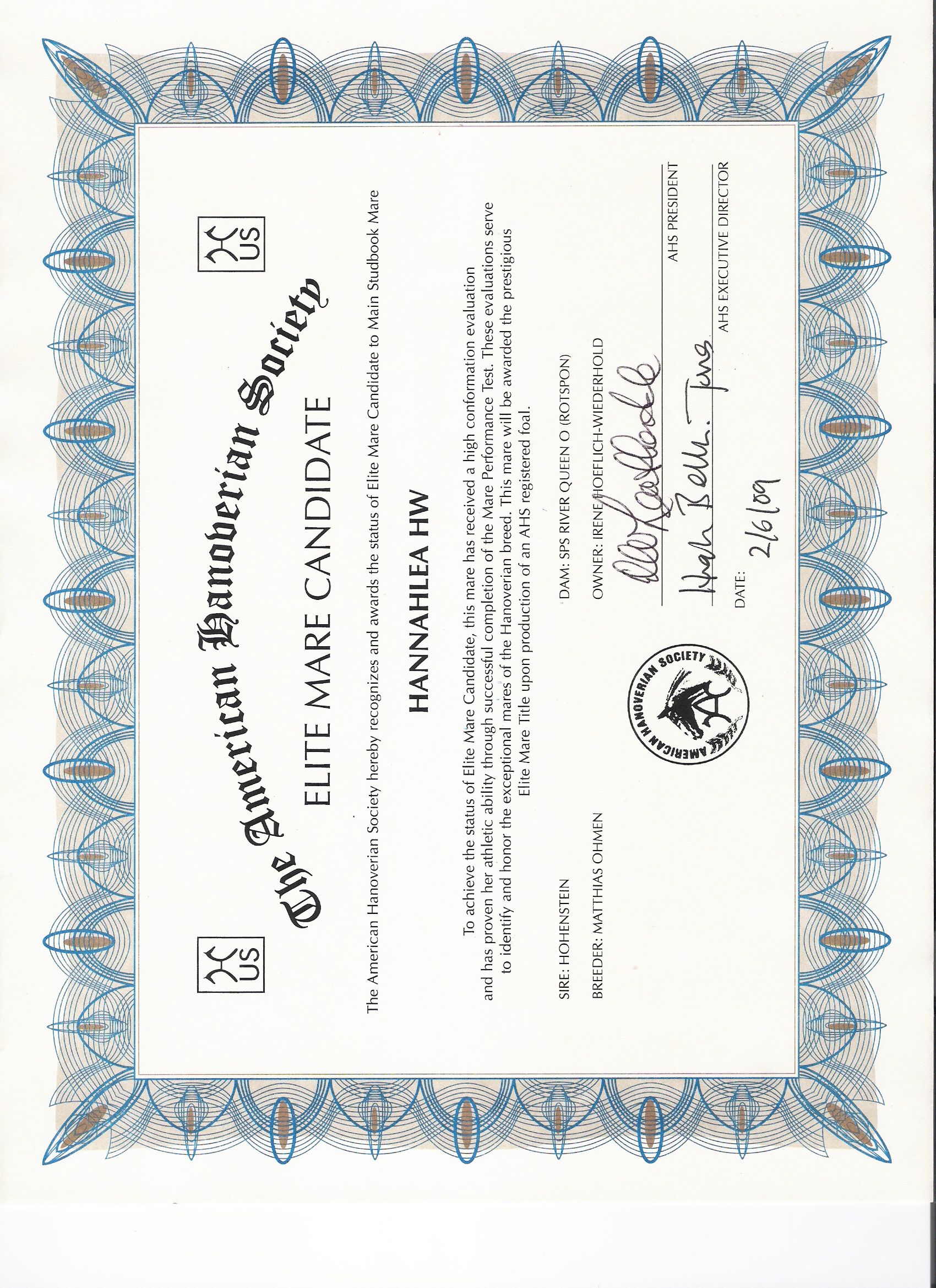 Hannahlea HW, jet black Hanoverian mare by Hohenstein/Rotspon/Weltmeyer/Matcho, born in 2005, standing approximately 16 hands. June 2009: Again, Hannahlea HW gave us many reasons to be proud of her. Blue ribbons and super scores at Training and First Level as well as a great performance in the young horse class! Super well behaved, easy and fun to ride. She is a star, no doubt about it. She was again awarded an 8 for gaits and won one of the tests with a huge score of 72.4%. She also won the High Point award for the show in her division. February 23rd, 2009: Yeah, we just received the documentation and certificates from the AHS (American Hanoverian Society) for the new Elite mare candidates Hannahlea HW and Santina HW. How exciting is this! They two mares were presented at the tender age of only 3, just some weeks under saddle and were just outstanding. Good breeding shows, these girls are truly special! January 25th, 2009: Hannahlea HW was at her first show in 2009. As usual, she was very successful and always in the ribbons, placing a 2nd and winning her First Level class, congratulations to Amanda Bailey, what a super safe and wonderful horse, way to go. She is for sale, price to go up with further training and success. This is an outstanding and experienced youngster. October 8th, 2008: Hannahlea HW was the Super Star at the Oklahoma Hanoverian (AHS) mare inspection and she won her mare performance test as well as the inspection itself and was declared CHAMPION MARE! This is the 3rd horse imported by HW Farm whom can claim this valuable title within just 3 years! She is a super lovely girl whom got lots and lots of 8’s and the judges and the audience absolutely adored her. She was well behaved, showed off her super rideability, scoring an 8.5 (!!!!) and was even taped for the TV showing off her Champion ribbons. Amanda Bailey did an outstanding job to prepare her properly for this important day in a mares life in all disciplines. She showed outstanding in the jump chute, in hand as well as under saddle. A huge thank you to Amanda, you go girl!!! They are a match made in heaven and we’d love to see Amanda and Hannah in the future together as well, sadly Hannahlea HW is for sale as we can’t keep them all and somebody else will be the lucky person to buy and show her as well as to breed her now or later. ET comes to mind with a mare like her, she is out of a super strong dam line and all her family is very successful. What a day – what a mare and yes, what did we say? Good breeding always shows!