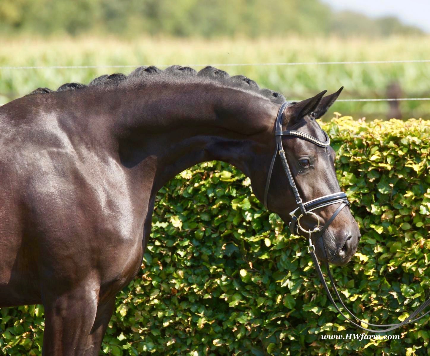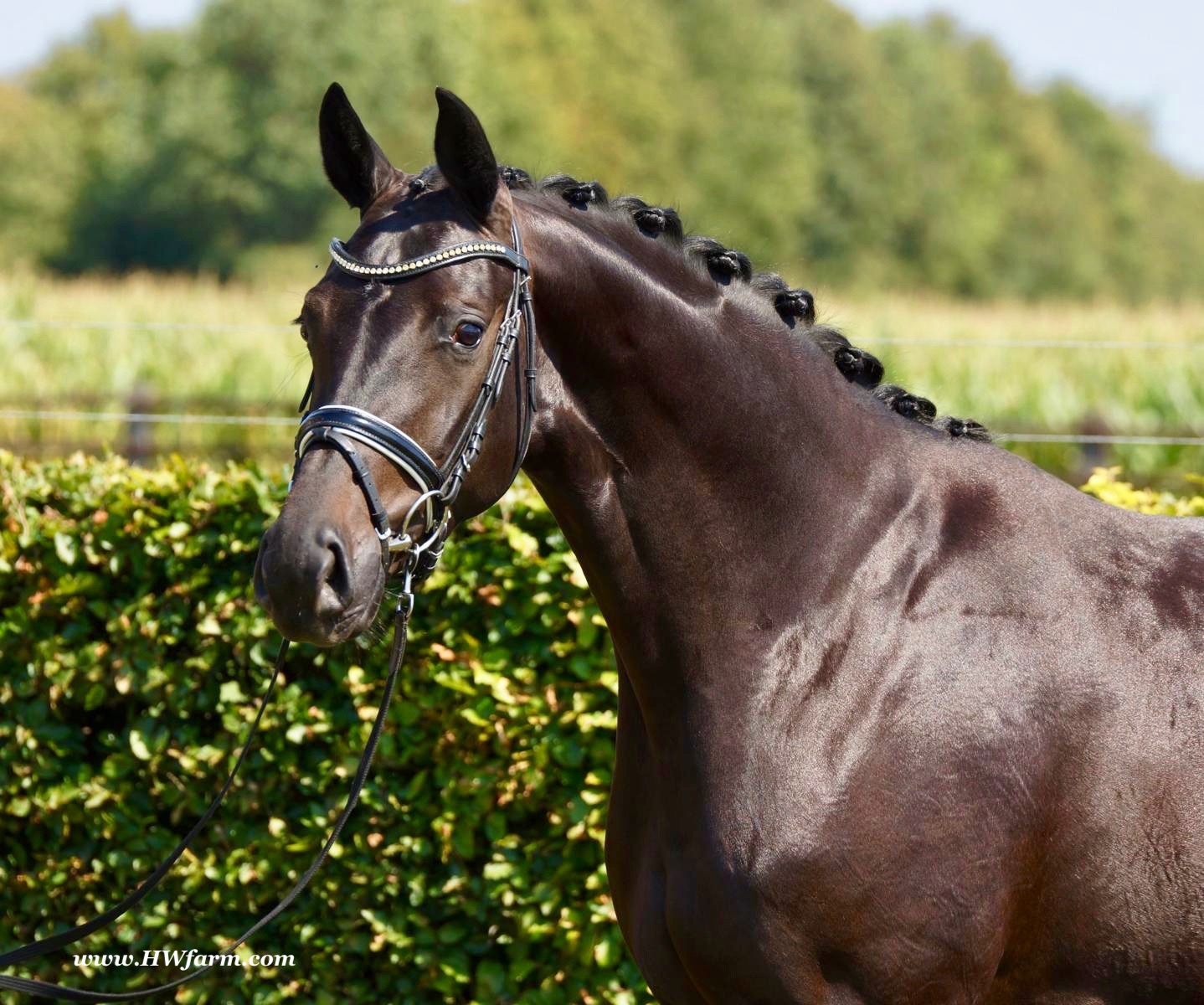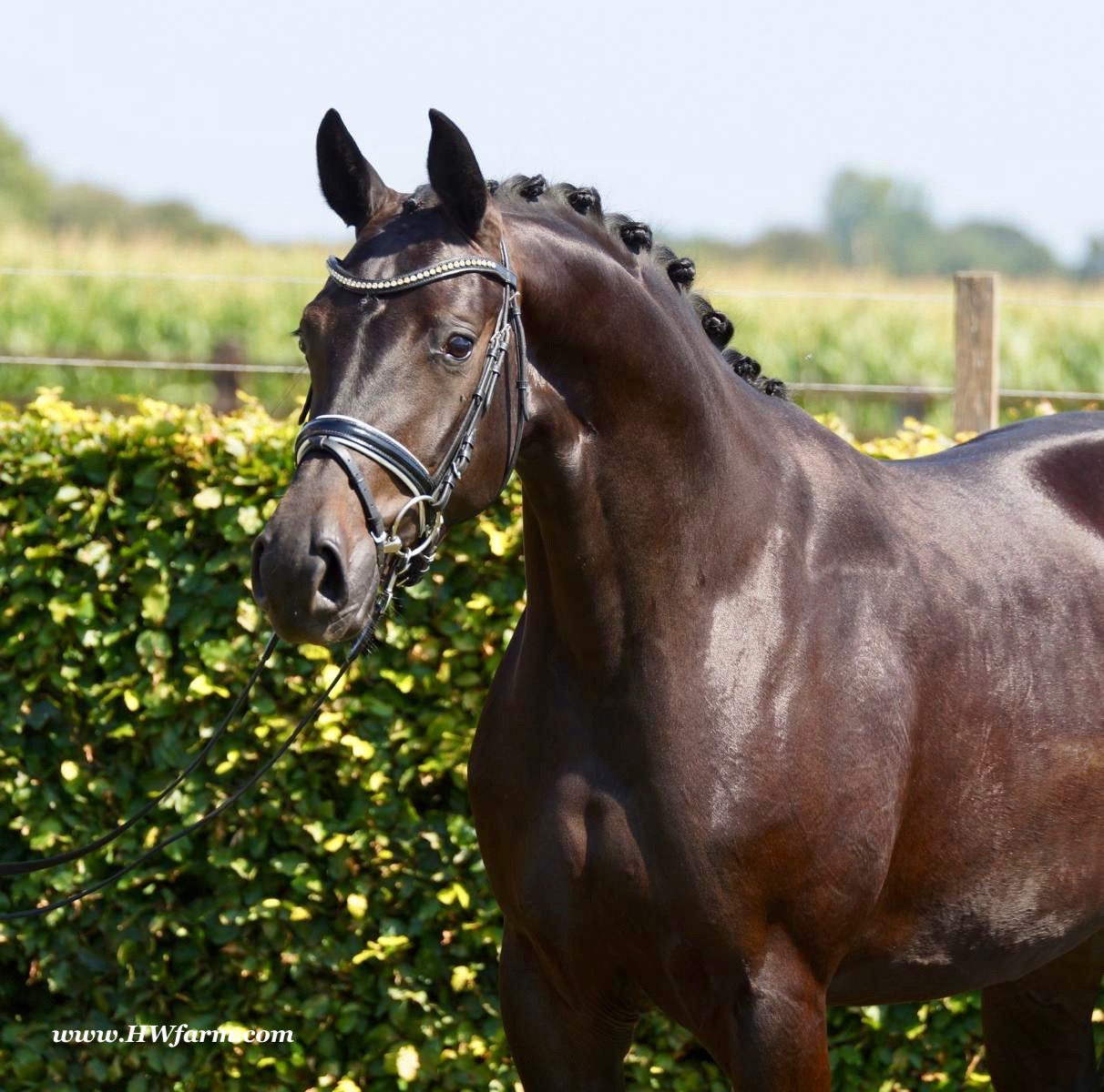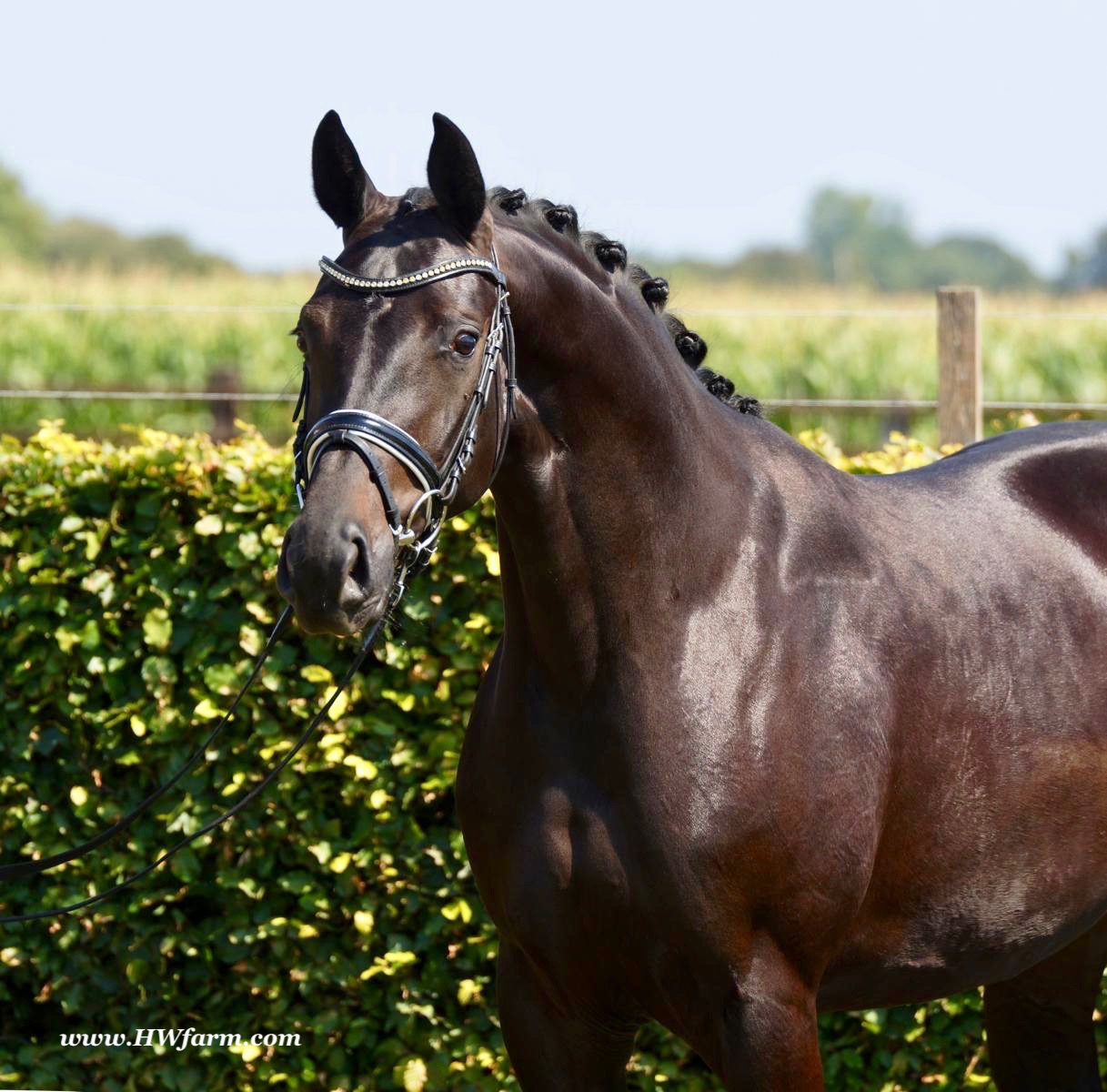 BellaRoyal HW, dark bay Rhineland mare by 2 x Vice Bundeschampion Bon Coeur/Sir Donnerhall, born in 2016, standing approximately 167 cm or 16.2 hands. BellaRoyal HW is by the remarkable stallion Bon Coeur, an impressive moving premium stallion at the Verden licensing 2014, dressage champion of his 30-day test, Hanoverian Champion 2016 and two times Vice-Bundeschampion in Warendorf! "Bon Coeur" - literally translated means "good heart"! With his heart in the right place, this extremely talented black horse can easily meet, perhaps even surpass, the expectations placed under saddle. This handsome black stallion is an exceptionally powerful and active mover. He has almost unlimited elasticity and shows already good carrying power in his hindlegs. His natural uphill movement and his unique work ethic coupled with the fascinating mechanics of movement in all its three gaits make him the epitome of the modern sport horse. All of his natural qualities, coupled with the best rideability under saddle leaves nothing to be desired. His genetics are obviously inherited through strong dressage genes: his father Benetton Dream was Bundeschampion of the three-year stallions 2007, qualified at the ages of 5 & 6 for the Bundeschampionat. Now Benetton Dream has victories in several Grand Prix and moved in 2013 as Olympic hope to Tinne Vilhelmson Silvfén of Sweden, where he currently has a breeding value of 153 points. Also in this pedigree sire Sandro Hit performance impresses his own performance (Federal champion and champion of the 6 year old dressage horses), as well as his superior sires - (numerous Federal champions dressage Champion, several breed winner, offspring and World Cup successes in Grand Prix win). In the third generation, we find well-tried Hanovarian performance blood from Carismo (test winner at the time) v. Calypso II, which had several times internationally winning offspring in both divisions of the tournament sport. Especially in combination with Sandro Hit, Calypso II has repeatedly delivered highly successful dressage horses. His Stallion Performance test at Schliekau was a tremendous success! He was the winner (in a super field of your stallions)with the following notes: In