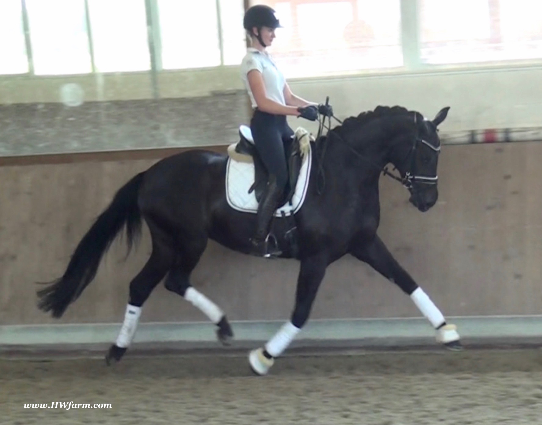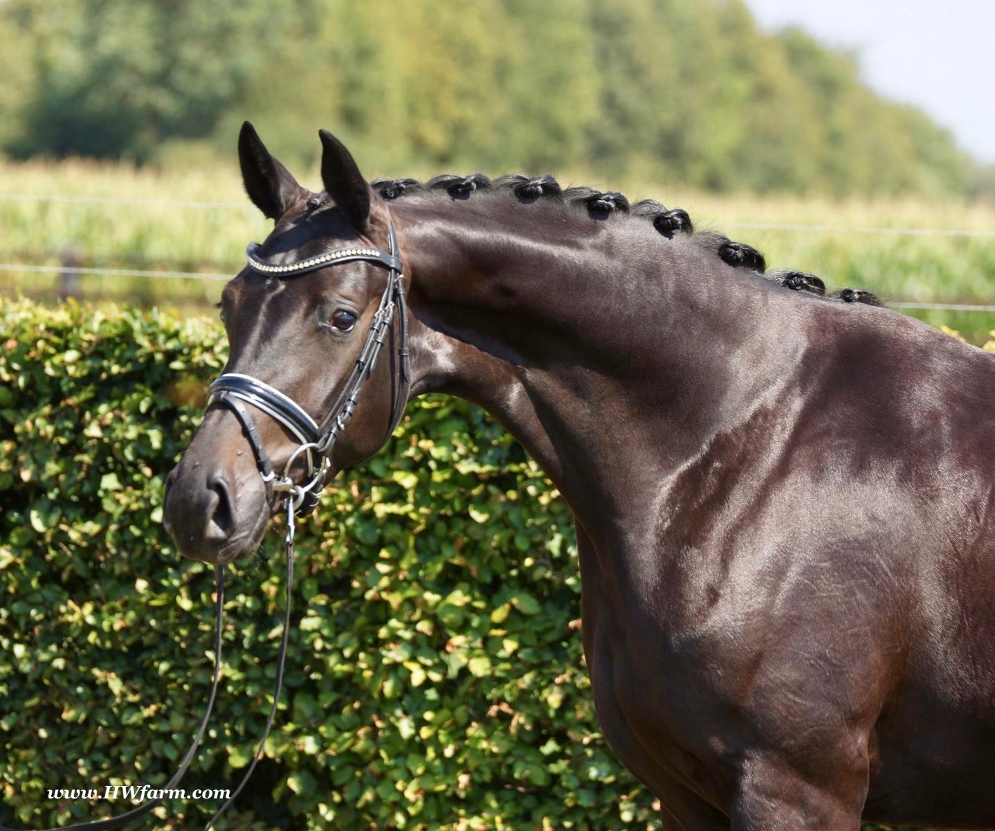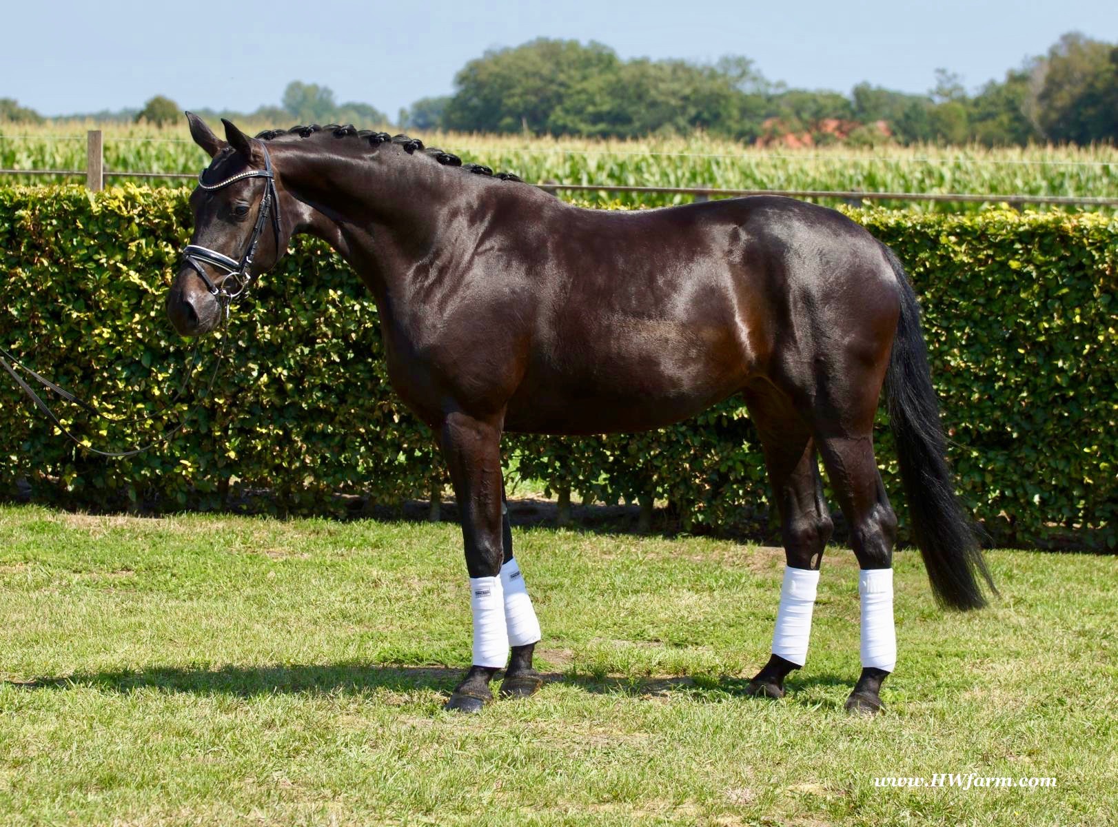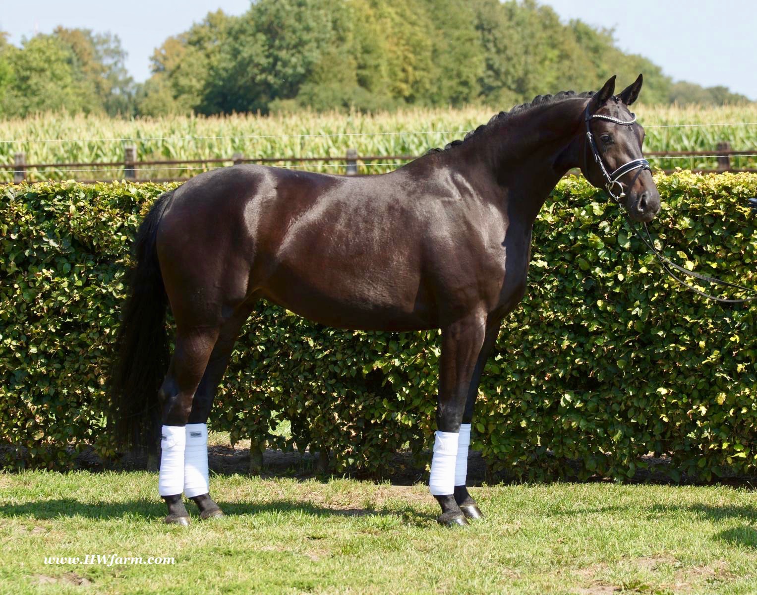 BellaRoyal HW, dark bay Rhineland mare by 2 x Vice Bundeschampion Bon Coeur/Sir Donnerhall, born in 2016, standing approximately 167 cm or 16.2 hands. BellaRoyal HW is by the remarkable stallion Bon Coeur, an impressive moving premium stallion at the Verden licensing 2014, dressage champion of his 30-day test, Hanoverian Champion 2016 and two times Vice-Bundeschampion in Warendorf! "Bon Coeur" - literally translated means "good heart"! With his heart in the right place, this extremely talented black horse can easily meet, perhaps even surpass, the expectations placed under saddle. This handsome black stallion is an exceptionally powerful and active mover. He has almost unlimited elasticity and shows already good carrying power in his hindlegs. His natural uphill movement and his unique work ethic coupled with the fascinating mechanics of movement in all its three gaits make him the epitome of the modern sport horse. All of his natural qualities, coupled with the best rideability under saddle leaves nothing to be desired. His genetics are obviously inherited through strong dressage genes: his father Benetton Dream was Bundeschampion of the three-year stallions 2007, qualified at the ages of 5 & 6 for the Bundeschampionat. Now Benetton Dream has victories in several Grand Prix and moved in 2013 as Olympic hope to Tinne Vilhelmson Silvfén of Sweden, where he currently has a breeding value of 153 points. Also in this pedigree sire Sandro Hit performance impresses his own performance (Federal champion and champion of the 6 year old dressage horses), as well as his superior sires - (numerous Federal champions dressage Champion, several breed winner, offspring and World Cup successes in Grand Prix win). In the third generation, we find well-tried Hanovarian performance blood from Carismo (test winner at the time) v. Calypso II, which had several times internationally winning offspring in both divisions of the tournament sport. Especially in combination with Sandro Hit, Calypso II has repeatedly delivered highly successful dressage horses. His Stallion Performance test at Schliekau was a tremendous success! He was the winner (in a super field of your stallions)with the following notes: In