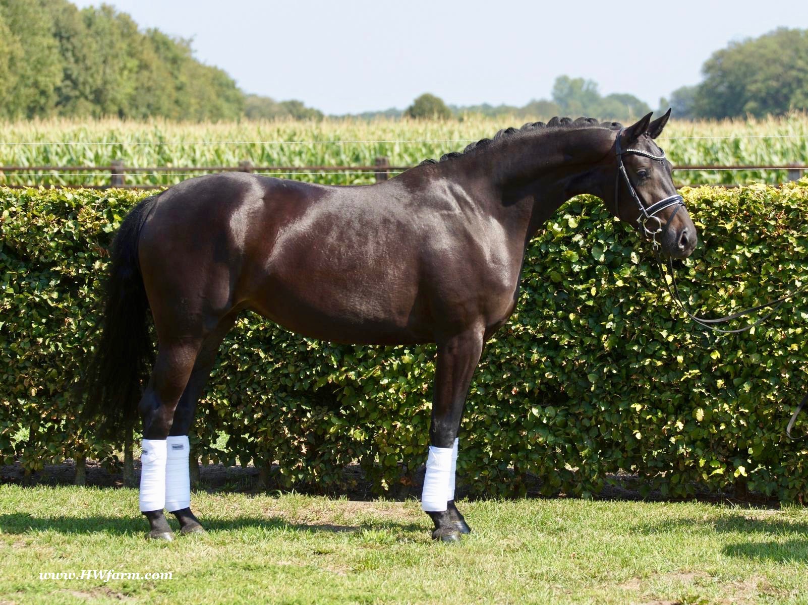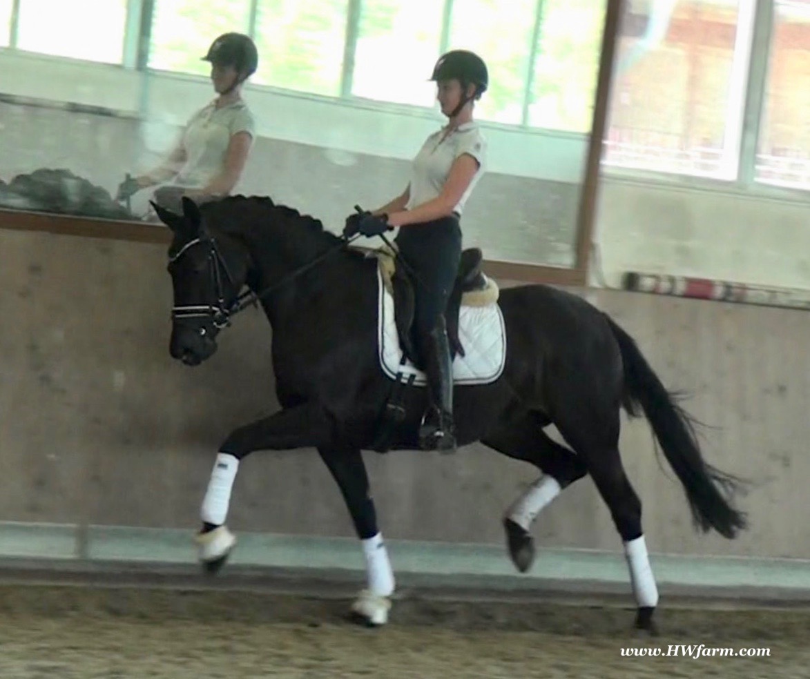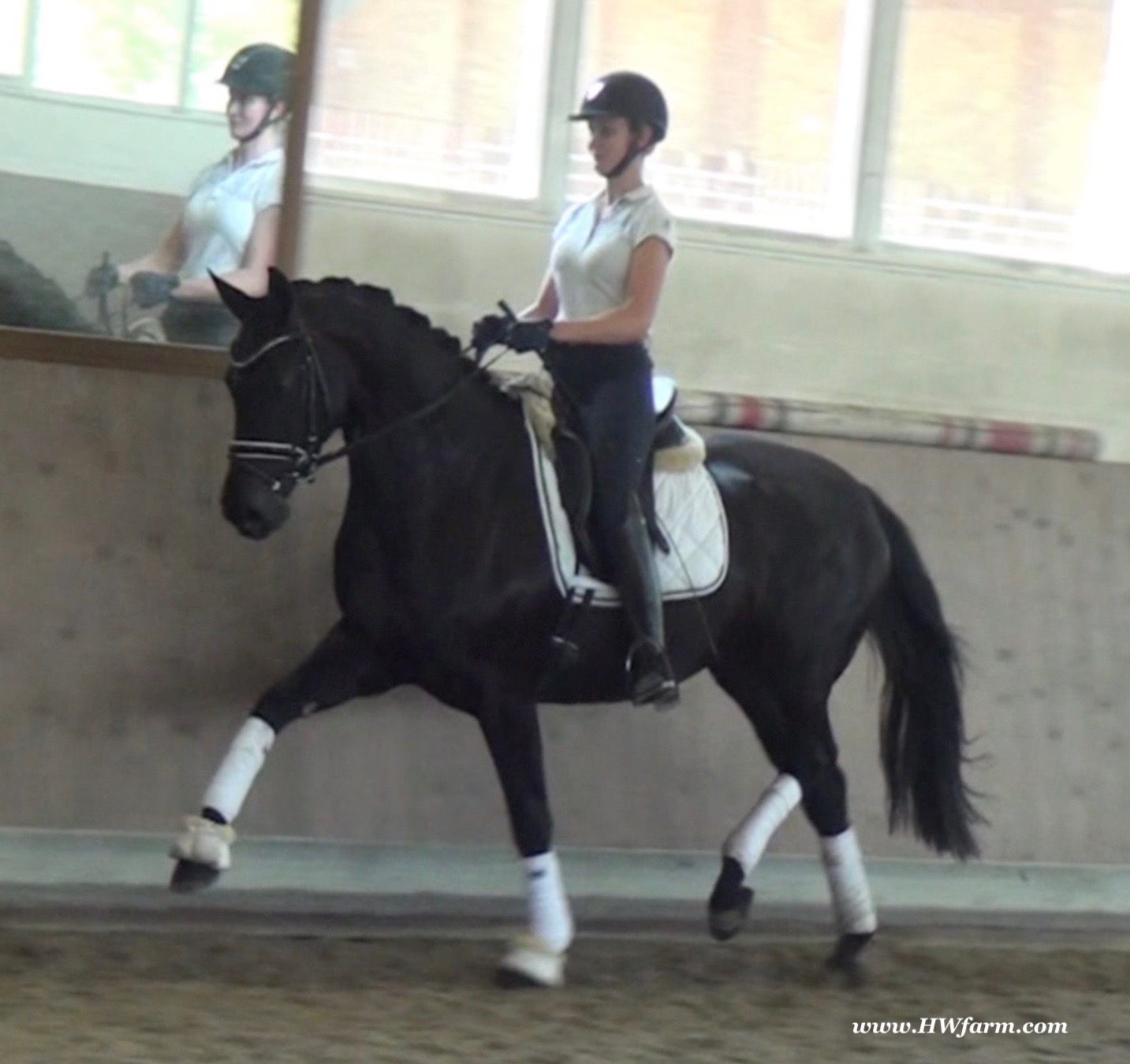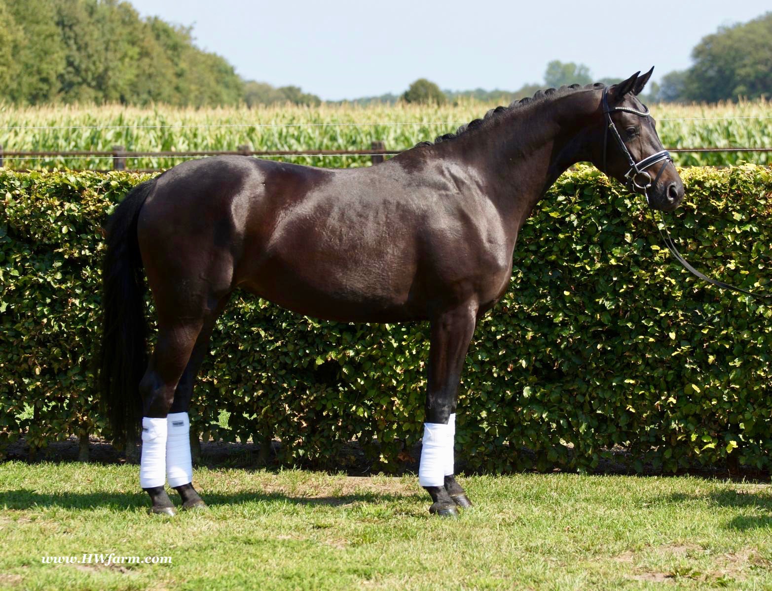 BellaRoyal HW, dark bay Rhineland mare by 2 x Vice Bundeschampion Bon Coeur/Sir Donnerhall, born in 2016, standing approximately 167 cm or 16.2 hands. BellaRoyal HW is by the remarkable stallion Bon Coeur, an impressive moving premium stallion at the Verden licensing 2014, dressage champion of his 30-day test, Hanoverian Champion 2016 and two times Vice-Bundeschampion in Warendorf! "Bon Coeur" - literally translated means "good heart"! With his heart in the right place, this extremely talented black horse can easily meet, perhaps even surpass, the expectations placed under saddle. This handsome black stallion is an exceptionally powerful and active mover. He has almost unlimited elasticity and shows already good carrying power in his hindlegs. His natural uphill movement and his unique work ethic coupled with the fascinating mechanics of movement in all its three gaits make him the epitome of the modern sport horse. All of his natural qualities, coupled with the best rideability under saddle leaves nothing to be desired. His genetics are obviously inherited through strong dressage genes: his father Benetton Dream was Bundeschampion of the three-year stallions 2007, qualified at the ages of 5 & 6 for the Bundeschampionat. Now Benetton Dream has victories in several Grand Prix and moved in 2013 as Olympic hope to Tinne Vilhelmson Silvfén of Sweden, where he currently has a breeding value of 153 points. Also in this pedigree sire Sandro Hit performance impresses his own performance (Federal champion and champion of the 6 year old dressage horses), as well as his superior sires - (numerous Federal champions dressage Champion, several breed winner, offspring and World Cup successes in Grand Prix win). In the third generation, we find well-tried Hanovarian performance blood from Carismo (test winner at the time) v. Calypso II, which had several times internationally winning offspring in both divisions of the tournament sport. Especially in combination with Sandro Hit, Calypso II has repeatedly delivered highly successful dressage horses. His Stallion Performance test at Schliekau was a tremendous success! He was the winner (in a super field of your stallions)with the following notes: In