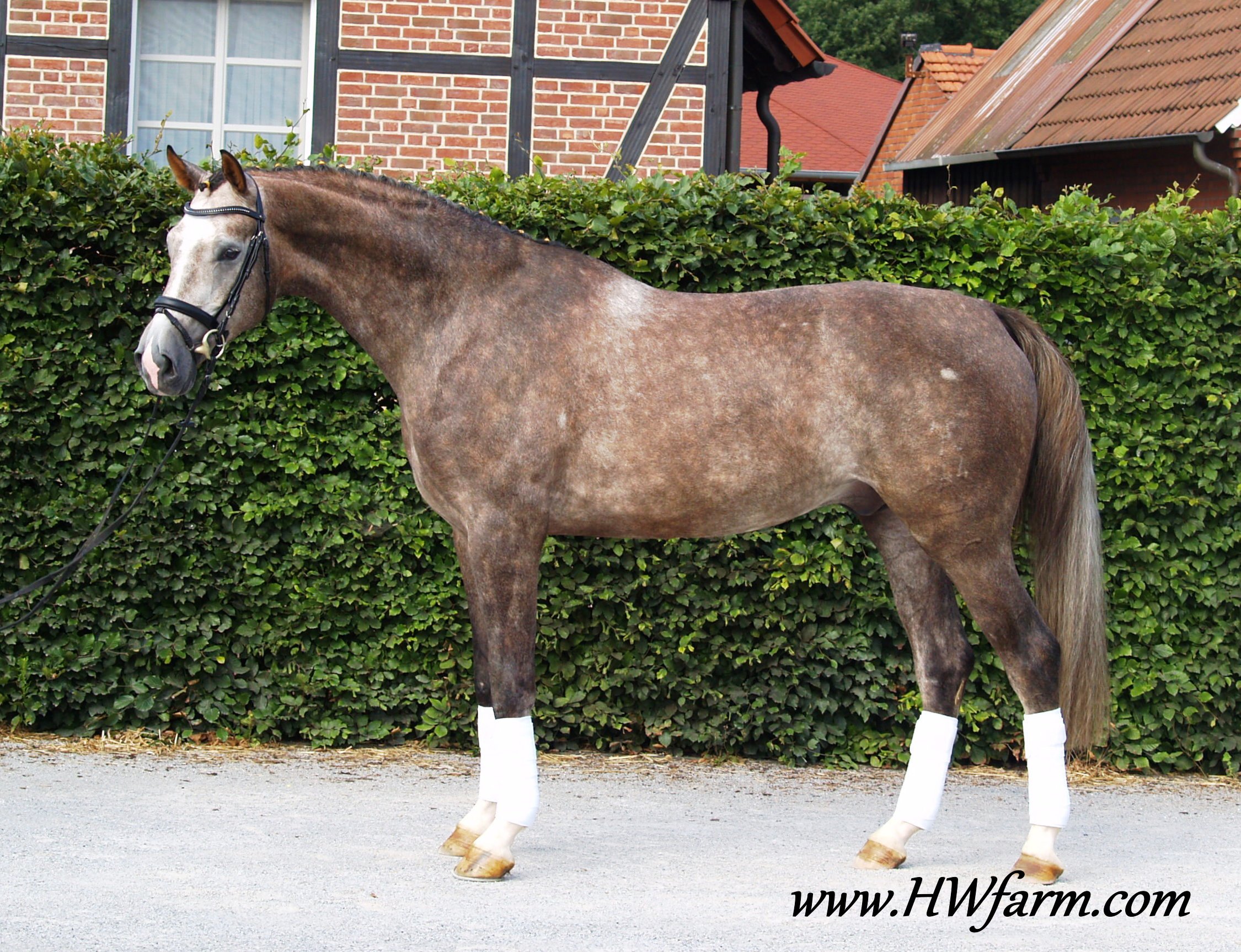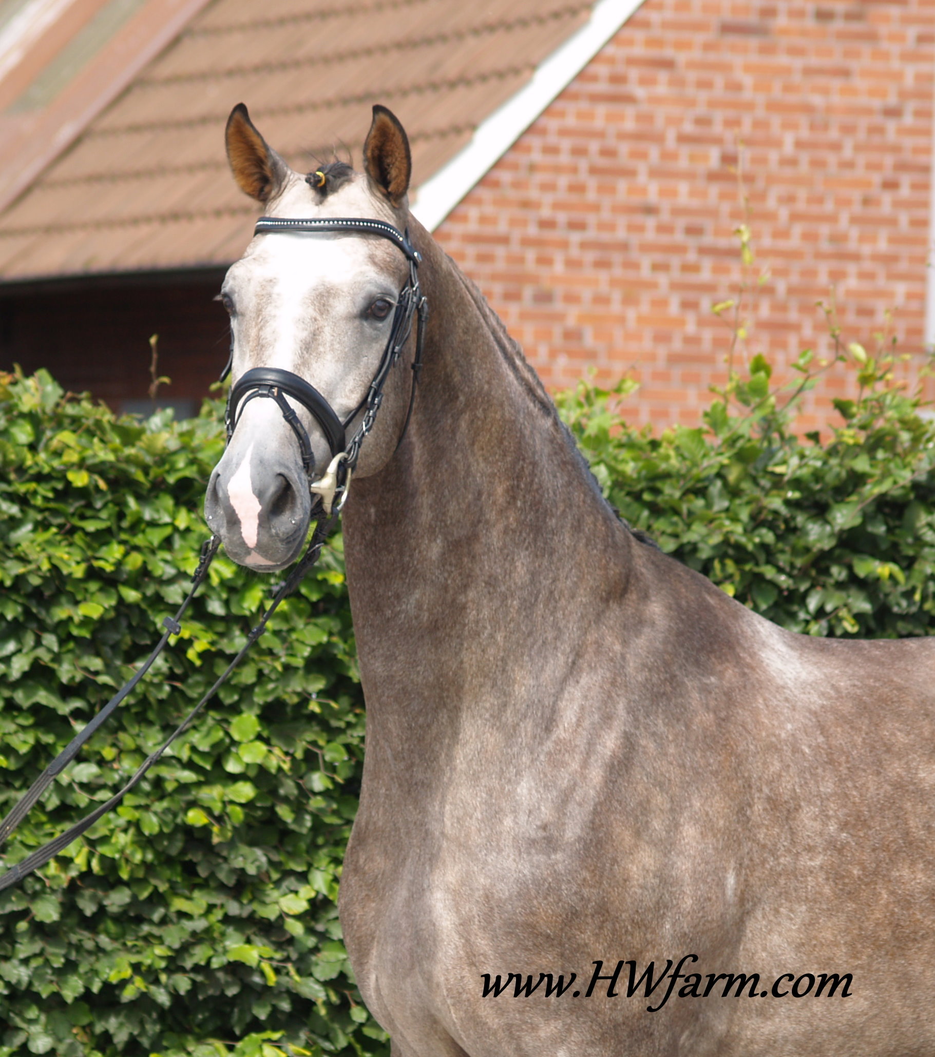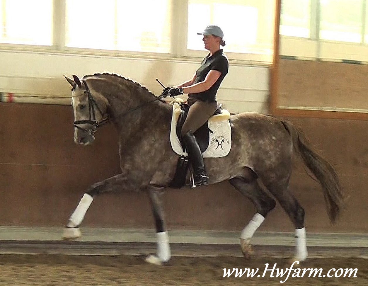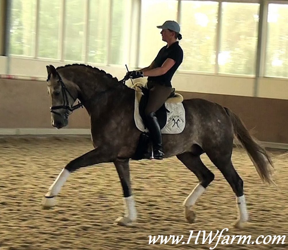 Brilliantly HW is out of a Westerland dam. You'll find more information about the bloodlines on the stallion site. Brilliantly HW, an absolute dream horse! Very noble gray eye catcher, his fur shimmers in all kinds of gray and bronze colors and with his black forelock; he for sure catches the attention of the audience. This horse will blow everybody away with his freedom in the shoulders and a very strong motor and active hind leg. We love his elegant movement and his modern built, there are many reasons to look forward to a bright future in the highest levels of dressage with this young gentleman. He has definitely three above average gaits, all clear and already well balanced with a good rhythm. Victory at 1st Level, solid at 2nd, training 3rd, many ribbons against huge competitions, successfully shown. He is a dream for every rider, fun every day, over and over again. Well behaved at the show grounds, a huge love all around. Brilliantly HW is a horse that does what he is asked to do. Nothing seems too much for him and he always gives 100% and more. He has super nerves and perfect ride ability. Friendly and sane in the barn and under saddle, he is a magnet for everybody alike. Vivienne Wiederhold (age 20) saw him in Germany and she is still begging to have him imported for her, his color, attitude, character, just everything about him is mesmerizing. If she'd have more time (she is in college and has a job), he'd already be here! He has tons of airtime and hang time, floats above the ground and is a teddy bear that loves to cuddle and have his own person to take care of him. He has the energy to do it all, but he is relaxed enough to concentrate and be safe and reliable. With Brilliantly HW, there is no limit to any level, he will compete in the big ring and he will be a phenomenal FEI horse. Judges will love and remember him with his fancy color, you can be sure to attract the attention. He is very elastic and a fast learner, he works with schwung and ease. He'll make the perfect horse for everybody alike, for a young rider, an adult amateur, a professional (professionals want sane horses too!!!) or even an older person looking for the perfect young horse for the future, without sacrificing the super gaits and the ability to go all the way to the top with a future FEI horse. This horse is a true diamond in the rough, he loves to learn, is easy to sit and light in the hand. He is a safe horse, especially for his age and gets even ridden without the fuzz of longing first. He works as well inside the covered arena as he does in the outside arena. After his workout, he gets to go with long reins around the barn and loves it. Brilliantly is used to go in the hot walker, loves his solarium time and grooming is his favorite! He stands for the farrier, loads and bathing is fun for him too. Super uncomplicated, a truly rare find. X-rays on file. Please contact Irene: Irene@HWfarm.com 239-772-7722 (ask for Irene, managing member of Horse Sales LLC) We take pride in answering every e-mail right away (at least at the same day) and to return each call. If you don't get a reply - please try again, our spam filter might have gotten in the way?!