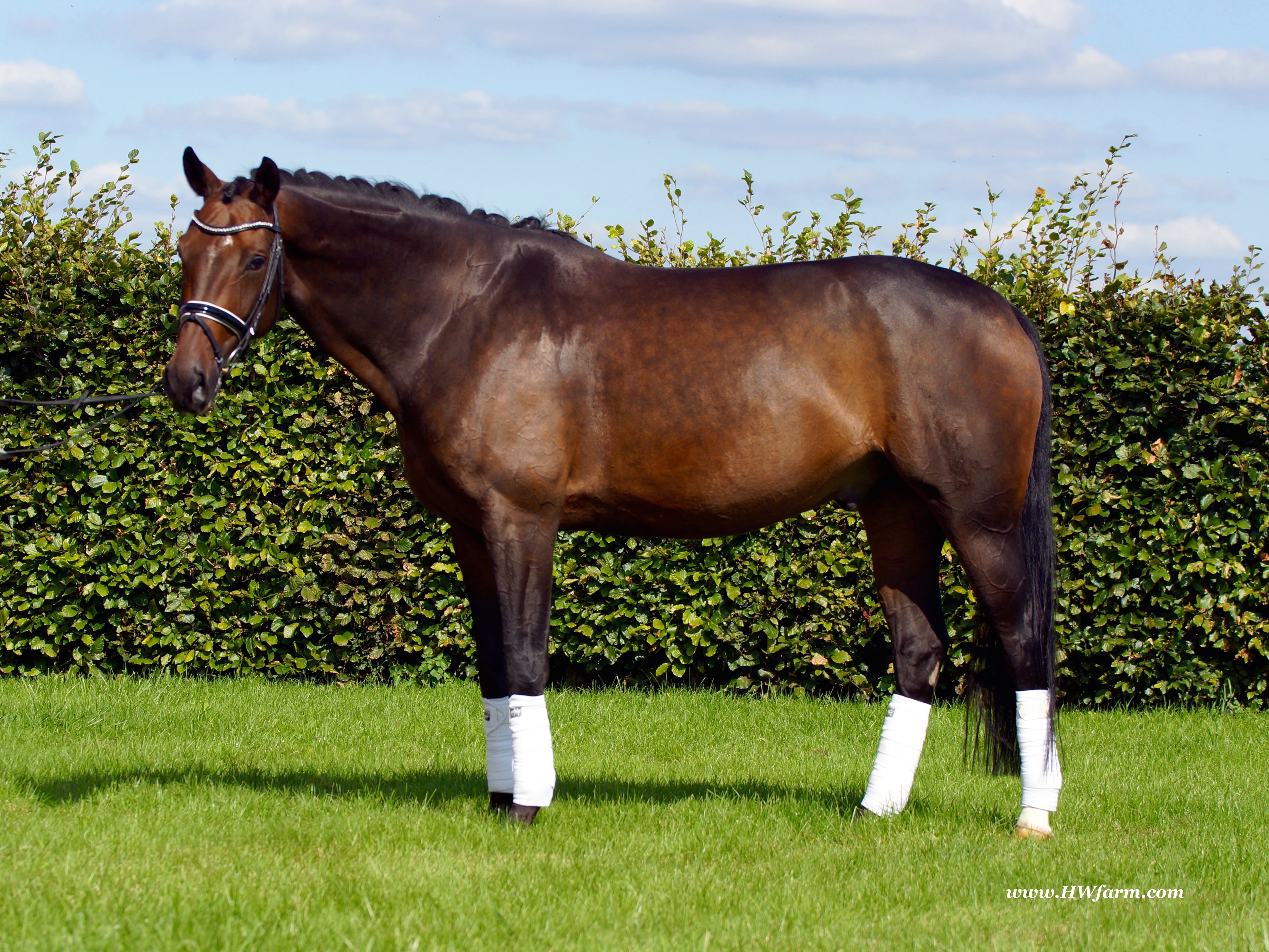Dantino HW, bay Oldenburg gelding by Daddy Cool / Sandro Hit born in 2008, standing approximately 170 cm or 16.2 and 3/4 hands.