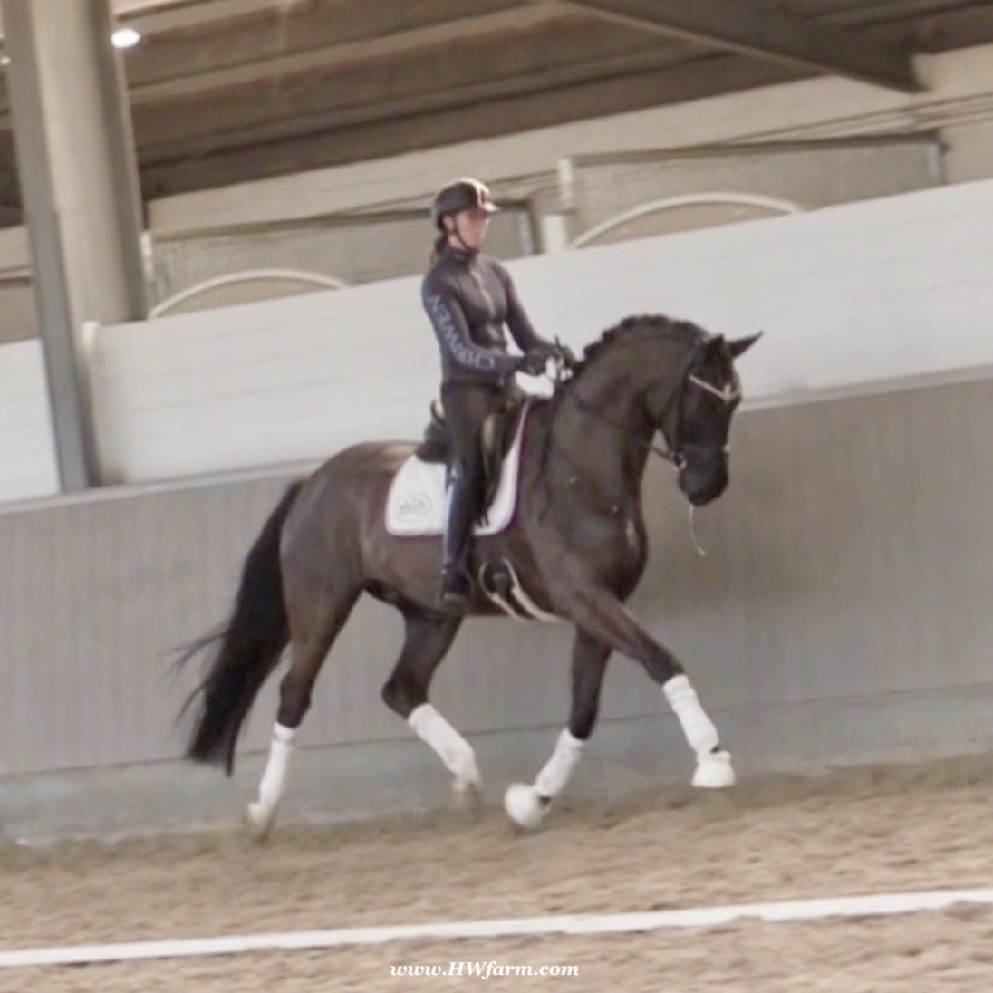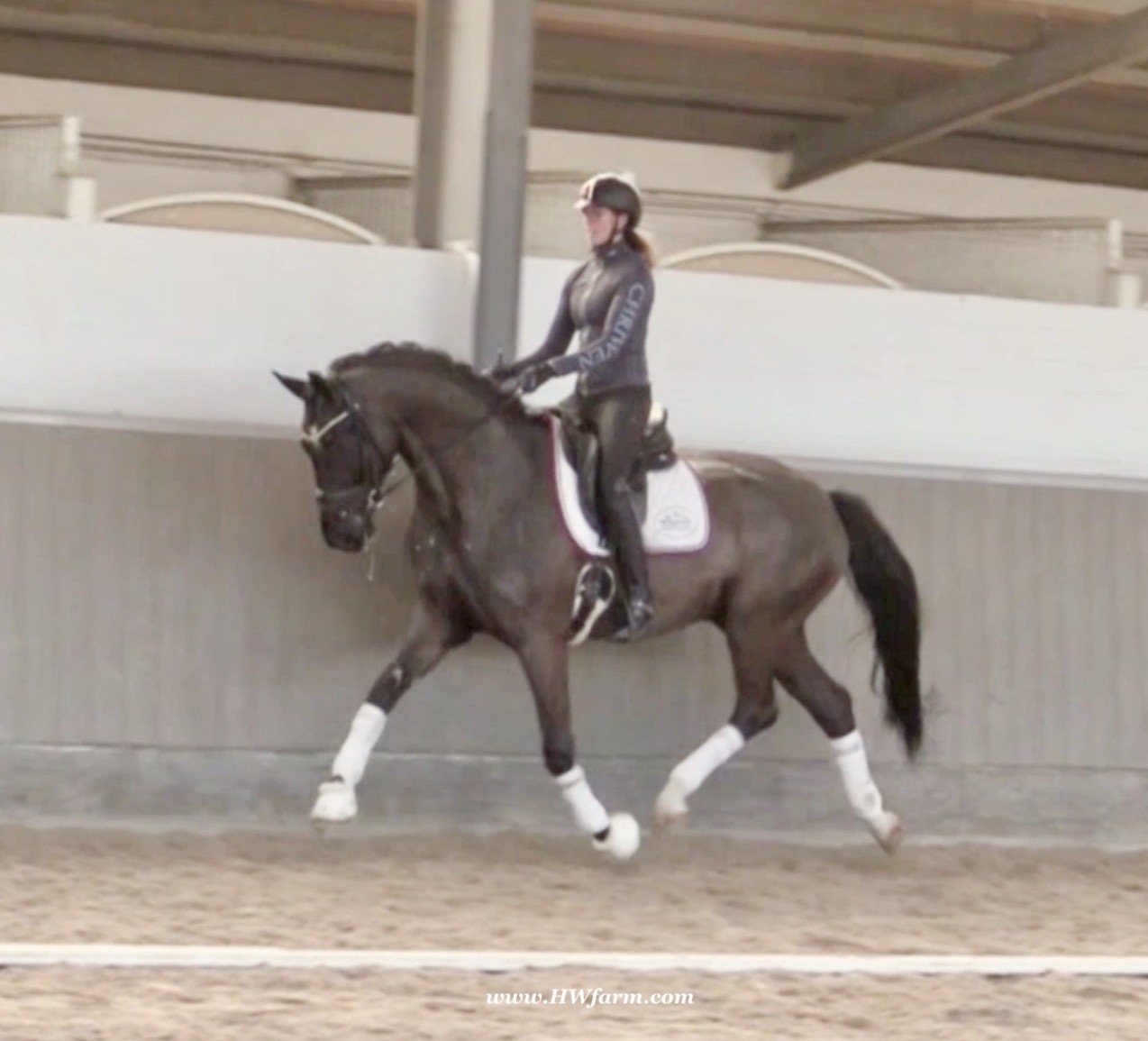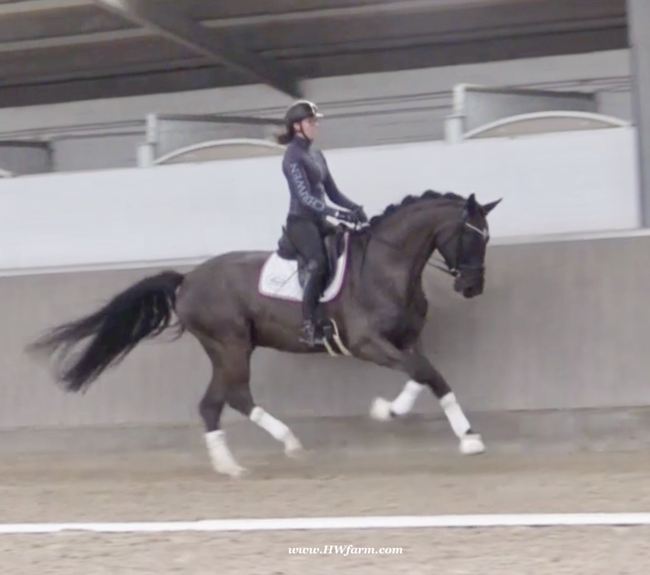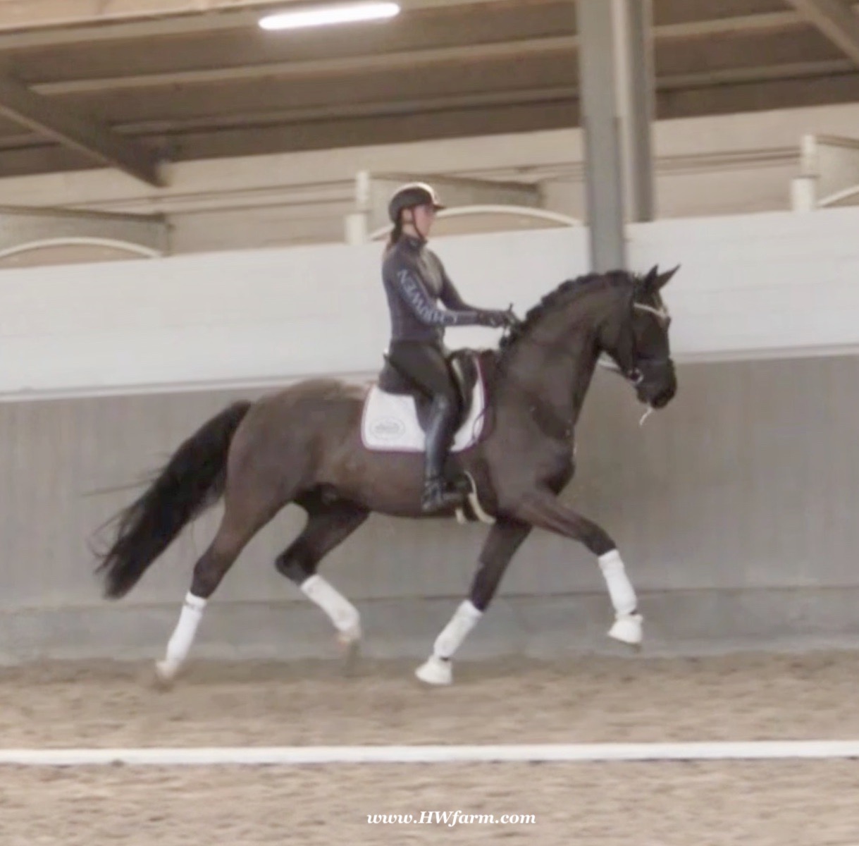 Dark Star HW, black Hanoverian gelding by Vice Bundeschampion Despacito/Hanoverian of the year Rotspon, born in 2021, standing approximately 170 cm or 16.2 hands. Dark Star HW, a clone to his sire and ancestors, in everything we could hope for. Despacito caught the interest of breeders very early on in his career with his stunning appearance and great pedigree. With the clear victory in the Hanoverian Championships in Verden with the dream grade 8.8 and the subsequent win of the silver medal at the Bundeschampionat in Warendorf, he put himself in the spotlight for breeders. As the son of the impressive Don Nobless, out of a dam by Sandro Hit-De Niro-Ehrentusch, his genetics leave nothing to be desired. His love for work and his extremely pleasant nature complete the picture of a stallion, who raises many expectations. This was also confirmed in his 50-day test, which he finished with a very good final score of 8.56. Don Nobless competed at the Bundeschampionat as a five-year-old, and he is now successful at international grand prix under Susan Pape; winning his first grand prix special in January 2017 and since picking up a host of placings at the level with scores over 70% and making his first Nations Cup appearance at the CHIO in Rotterdam. His grand-sire Dancier was champion of the 2004 Hanoverian Stallion Licensing in Verden and the 2005 stallion performance test in Adelheidsdorf; after his performance test, he sold for €330,000 to the state stud at Celle. As a young horse, he was reserve champion of the Hanoverian Young Horse Championships, and was third in the four-year-old Bundeschampionat final. Second dam Donja produced premium mares Selina and Donata, dam Selina is by the great stallion Sandro Hit who was Bundeschampion and World Champion as a six-year-old in 1999, dominating both competitions from start to finish. Sandro Hit's sons and grandsons pass on his excellent genes and their offspring include many top competition and breeding horses. One of the most outstanding examples is Sir Donnerhall, who also tops the FN breeding stallion rating. Sandro Hit's son San Amour won the Hauptprämie title by a wide margin, while his full sister, Victoria, won the Oldenburg Regional Championship. Dark Star HW's dam is by the very famous Rotspon. After years of producing quality offspring, in 2017 Rotspon was awarded 'Hanoverian Stallion of the Year' by the Hanoverian Verband in Verden, Germany. Rotspon is a top quality son of the dressage stallion Rubinstein I. He was the sovereign winner of the Hanoverian stallion performance test in 1998, scoring an excellent 148.82 points in the dressage category. Like his father, Rotspon is a very impressive horse with a great rideability, outstanding movements and a high ability for dressage. He also has a good jumping technique which is above average. He is an elegantly made sire in a noble black coat with a lot of expression and appearance. Rotspon's son, Rosevelt, competed for Team USA at the 2016 Rio Olympics. With his rider Allison Brock, Team USA won Bronze. Rosevelt also won the 2015 Grand Prix in Wellington, FL and did it again one month later at the Grand Prix CD13*. The first crop of offspring by Rotspon were born in the year 2000. The foals have beautiful heads and a good conformation (long sloping shoulder, long well set up neck). They are equipped with a very elastic trot and a ground covering walk, and have been very much in demand. In the 2015, according to the Hanoverian Stallion Book, Rotspon is credited with 888 competition progeny with winnings of €680,105 - 767 dressage placegetters with 80 progeny competing at S level. In the 2016 Hanoverian book, the progeny stands at 913, with winnings of €759,161. Although he has produced nine horses that have won more than €10,000 in the dressage ring, none are stars. His FN breeding value for dressage is 132, for jumping, 72. His Hanoverian values are 126 for dressage and 80 for jumping. He is the sire of 17 licensed sons including Rascalino and Royal Blend. Rotspon offspring qualify for the New England Dressage Association (NEDA) Foal Futurity. Dark Star HW always impresses with incredible beauty and movement. His stallion type (he is a gelding!!) will mesmerize everybody alike and he is dressed in a stunning black coat with just enough chrome. He looks like a clone to his sire, He was born to step in his father's footsteps. He is out of world-famous dressage lines and is equipped with absolutely phenomenal gaits und has many Champions on sire and dam site. Dark Star HW has super fancy, cat like/elastic, swinging movements and knows to get attention with rhythm, balance and always gives his best effort. This stunning horse has all, the looks and the personality a person could ever hope for. Super pretty head, perfect set on neck and superb conformation. His athleticism and gentleman like attitude, is nearly indescribable. This boy is so much fun to ride, with a soft mouth and lots of impulsion. He eagerly works under saddle. He is all concentrated on his job in the dressage arena and with his quick, far reaching hind leg, passage and piaffe will come naturally to him. Dark Star HW is incredible supple and has a ton of air time. He just floats above the ground. With his free shoulder and huge suspension, he swings nicely through his back and is easy to sit. This extremely talented gentleman has definite international potential. This young stunner will go far in the dressage ring, he is your ticket to the top! He was always handled and trained correctly, even as a young stallion in hand, to continue his career under saddle, comes naturally to him. With this horse, you will be the star in FEI classes and at clinics, the judges and onlookers will remember him where ever he goes. This is a stunning horse, that has it all and loves to give it all, used to go in the hot walker, loves his shower and solarium time. Stands for the farrier, loads and appreciates his personal grooming time. Th