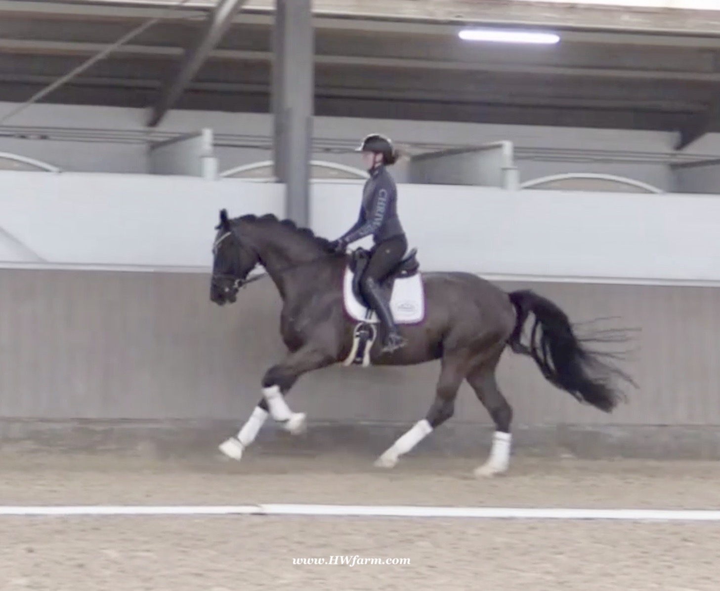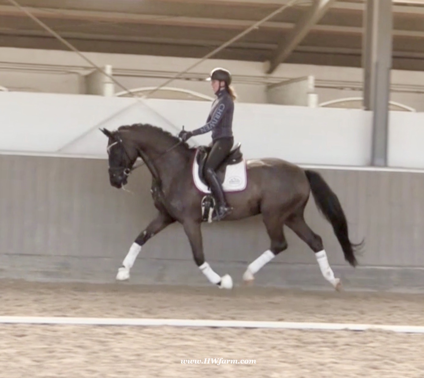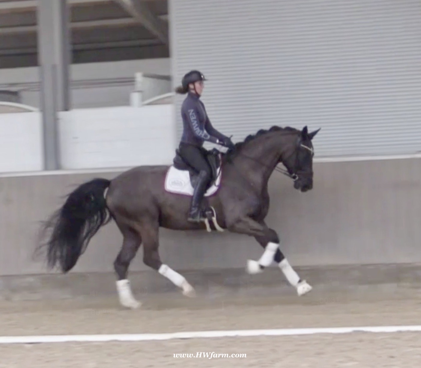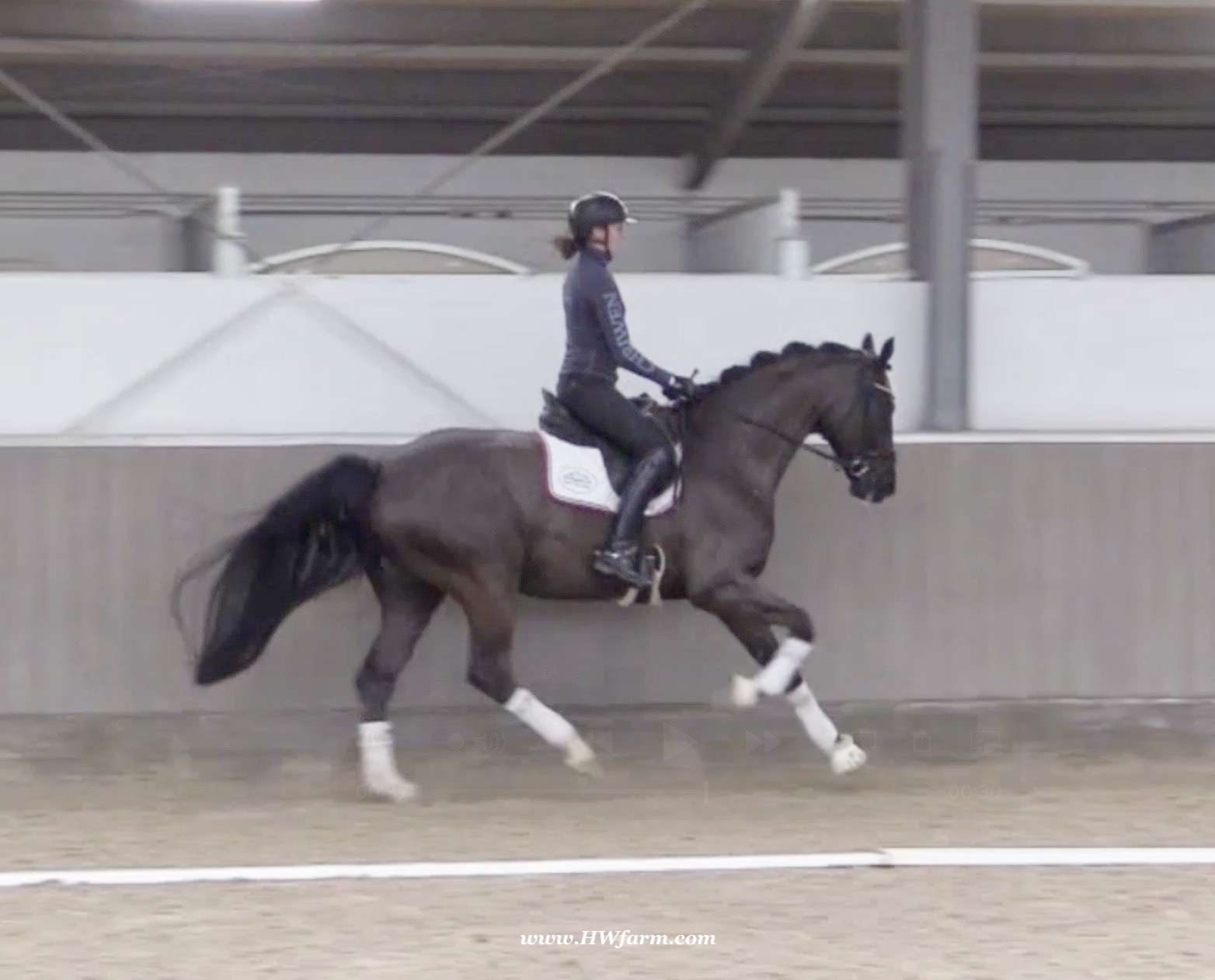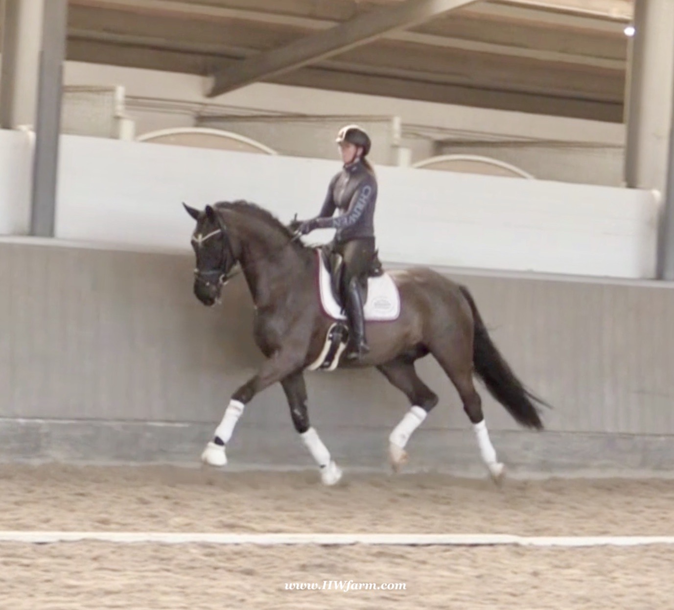 Dark Star HW, black Hanoverian gelding by Vice Bundeschampion Despacito/Hanoverian of the year Rotspon, born in 2021, standing approximately 170 cm or 16.2 hands. Dark Star HW, a clone to his sire and ancestors, in everything we could hope for. Despacito caught the interest of breeders very early on in his career with his stunning appearance and great pedigree. With the clear victory in the Hanoverian Championships in Verden with the dream grade 8.8 and the subsequent win of the silver medal at the Bundeschampionat in Warendorf, he put himself in the spotlight for breeders. As the son of the impressive Don Nobless, out of a dam by Sandro Hit-De Niro-Ehrentusch, his genetics leave nothing to be desired. His love for work and his extremely pleasant nature complete the picture of a stallion, who raises many expectations. This was also confirmed in his 50-day test, which he finished with a very good final score of 8.56. Don Nobless competed at the Bundeschampionat as a five-year-old, and he is now successful at international grand prix under Susan Pape; winning his first grand prix special in January 2017 and since picking up a host of placings at the level with scores over 70% and making his first Nations Cup appearance at the CHIO in Rotterdam. His grand-sire Dancier was champion of the 2004 Hanoverian Stallion Licensing in Verden and the 2005 stallion performance test in Adelheidsdorf; after his performance test, he sold for €330,000 to the state stud at Celle. As a young horse, he was reserve champion of the Hanoverian Young Horse Championships, and was third in the four-year-old Bundeschampionat final. Second dam Donja produced premium mares Selina and Donata, dam Selina is by the great stallion Sandro Hit who was Bundeschampion and World Champion as a six-year-old in 1999, dominating both competitions from start to finish. Sandro Hit's sons and grandsons pass on his excellent genes and their offspring include many top competition and breeding horses. One of the most outstanding examples is Sir Donnerhall, who also tops the FN breeding stallion rating. Sandro Hit's son San Amour won the Hauptprämie title by a wide margin, while his full sister, Victoria, won the Oldenburg Regional Championship. Dark Star HW's dam is by the very famous Rotspon. After years of producing quality offspring, in 2017 Rotspon was awarded 'Hanoverian Stallion of the Year' by the Hanoverian Verband in Verden, Germany. Rotspon is a top quality son of the dressage stallion Rubinstein I. He was the sovereign winner of the Hanoverian stallion performance test in 1998, scoring an excellent 148.82 points in the dressage category. Like his father, Rotspon is a very impressive horse with a great rideability, outstanding movements and a high ability for dressage. He also has a good jumping technique which is above average. He is an elegantly made sire in a noble black coat with a lot of expression and appearance. Rotspon's son, Rosevelt, competed for Team USA at the 2016 Rio Olympics. With his rider Allison Brock, Team USA won Bronze. Rosevelt also won the 2015 Grand Prix in Wellington, FL and did it again one month later at the Grand Prix CD13*. The first crop of offspring by Rotspon were born in the year 2000. The foals have beautiful heads and a good conformation (long sloping shoulder, long well set up neck). They are equipped with a very elastic trot and a ground covering walk, and have been very much in demand. In the 2015, according to the Hanoverian Stallion Book, Rotspon is credited with 888 competition progeny with winnings of €680,105 - 767 dressage placegetters with 80 progeny competing at S level. In the 2016 Hanoverian book, the progeny stands at 913, with winnings of €759,161. Although he has produced nine horses that have won more than €10,000 in the dressage ring, none are stars. His FN breeding value for dressage is 132, for jumping, 72. His Hanoverian values are 126 for dressage and 80 for jumping. He is the sire of 17 licensed sons including Rascalino and Royal Blend. Rotspon offspring qualify for the New England Dressage Association (NEDA) Foal Futurity. Dark Star HW always impresses with incredible beauty and movement. His stallion type (he is a gelding!!) will mesmerize everybody alike and he is dressed in a stunning black coat with just enough chrome. He looks like a clone to his sire, He was born to step in his father's footsteps. He is out of world-famous dressage lines and is equipped with absolutely phenomenal gaits und has many Champions on sire and dam site. Dark Star HW has super fancy, cat like/elastic, swinging movements and knows to get attention with rhythm, balance and always gives his best effort. This stunning horse has all, the looks and the personality a person could ever hope for. Super pretty head, perfect set on neck and superb conformation. His athleticism and gentleman like attitude, is nearly indescribable. This boy is so much fun to ride, with a soft mouth and lots of impulsion. He eagerly works under saddle. He is all concentrated on his job in the dressage arena and with his quick, far reaching hind leg, passage and piaffe will come naturally to him. Dark Star HW is incredible supple and has a ton of air time. He just floats above the ground. With his free shoulder and huge suspension, he swings nicely through his back and is easy to sit. This extremely talented gentleman has definite international potential. This young stunner will go far in the dressage ring, he is your ticket to the top! He was always handled and trained correctly, even as a young stallion in hand, to continue his career under saddle, comes naturally to him. With this horse, you will be the star in FEI classes and at clinics, the judges and onlookers will remember him where ever he goes. This is a stunning horse, that has it all and loves to give it all, used to go in the hot walker, loves his shower and solarium time. Stands for the farrier, loads and appreciates his personal grooming time. Th