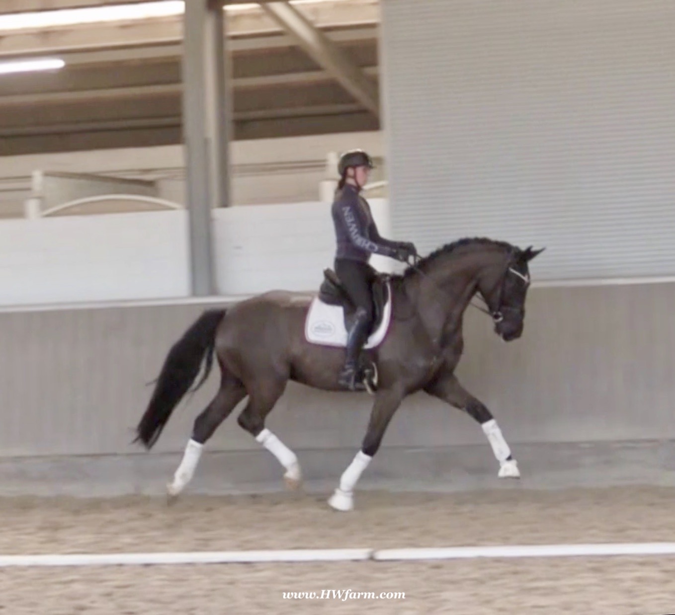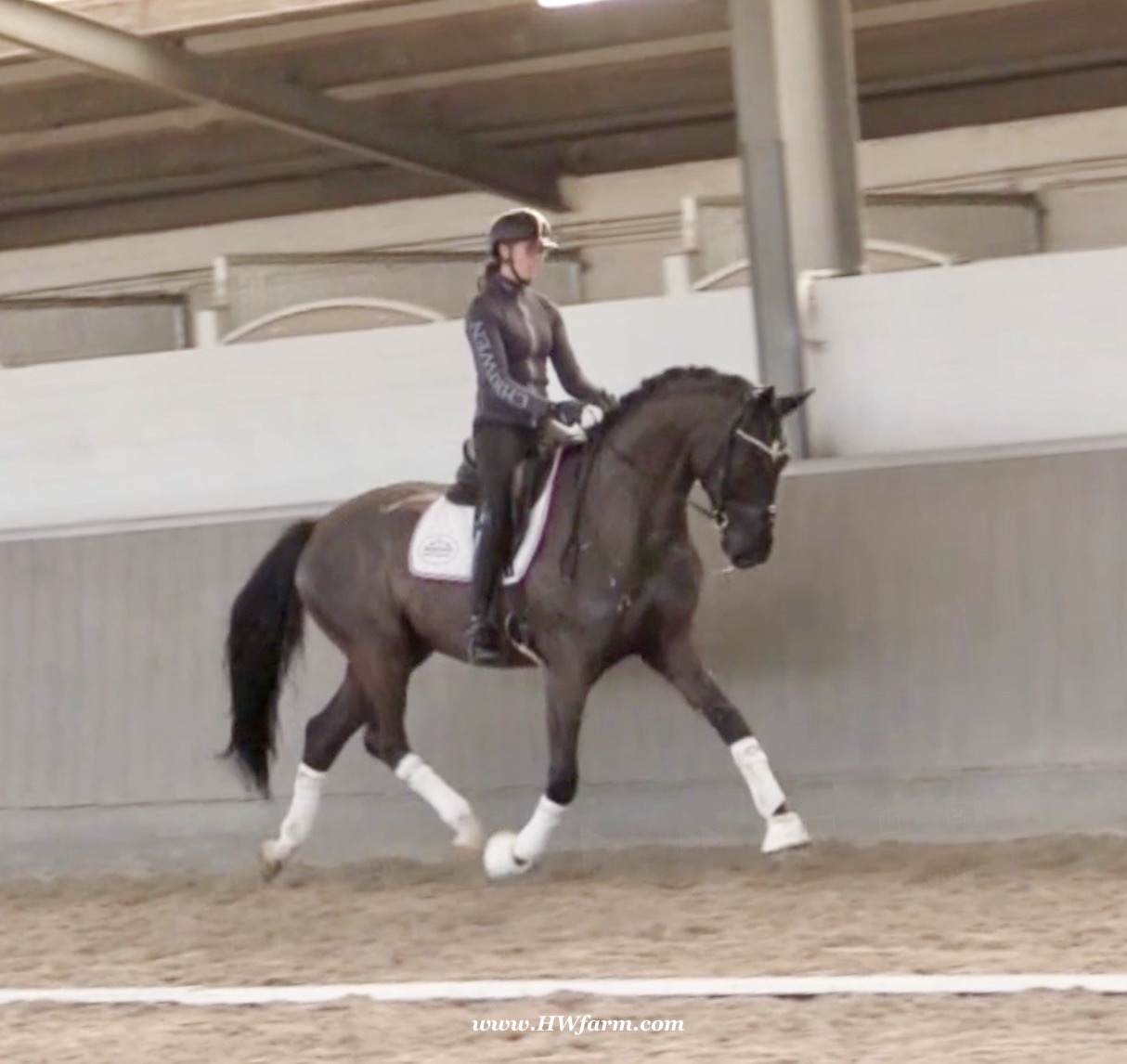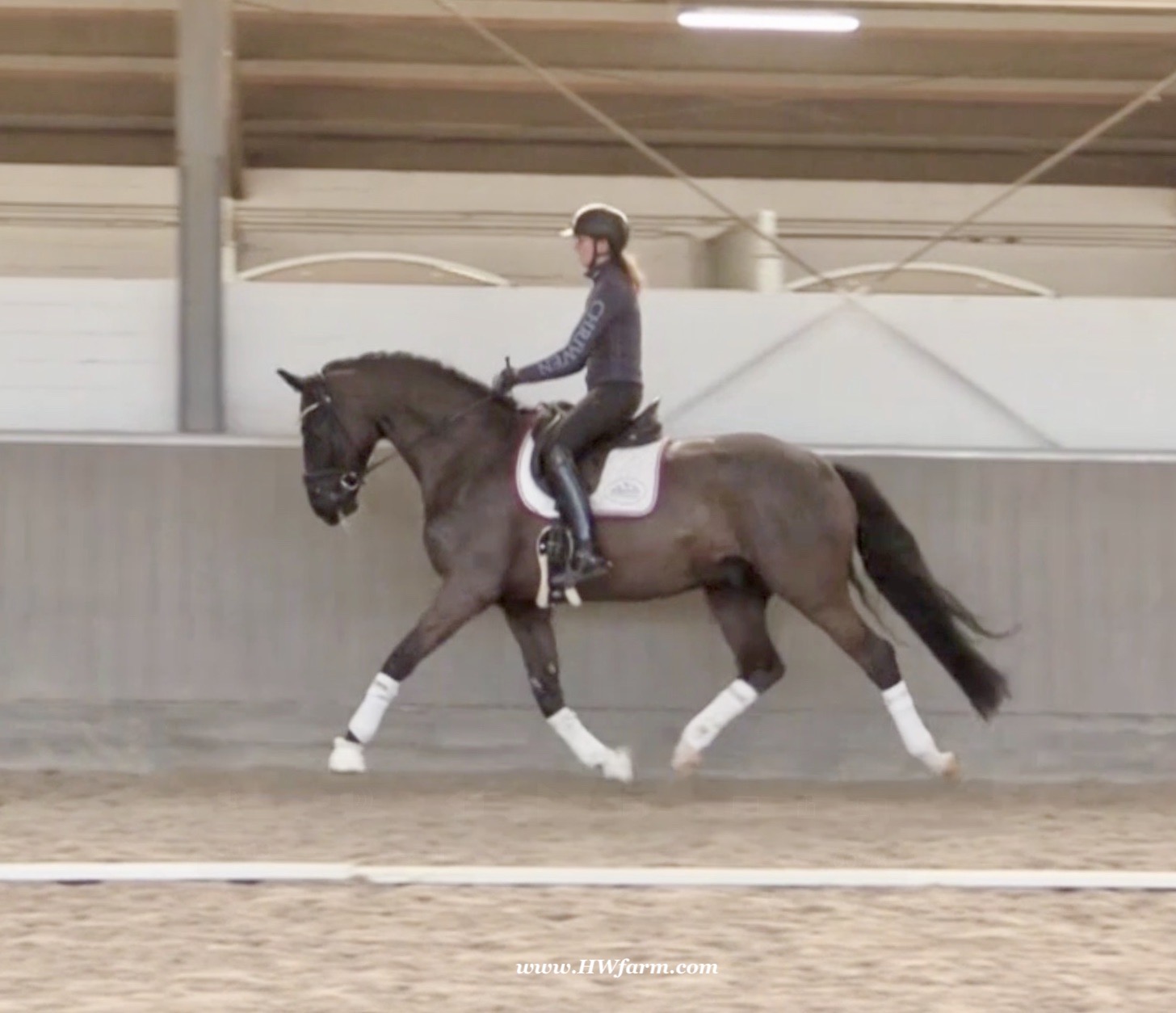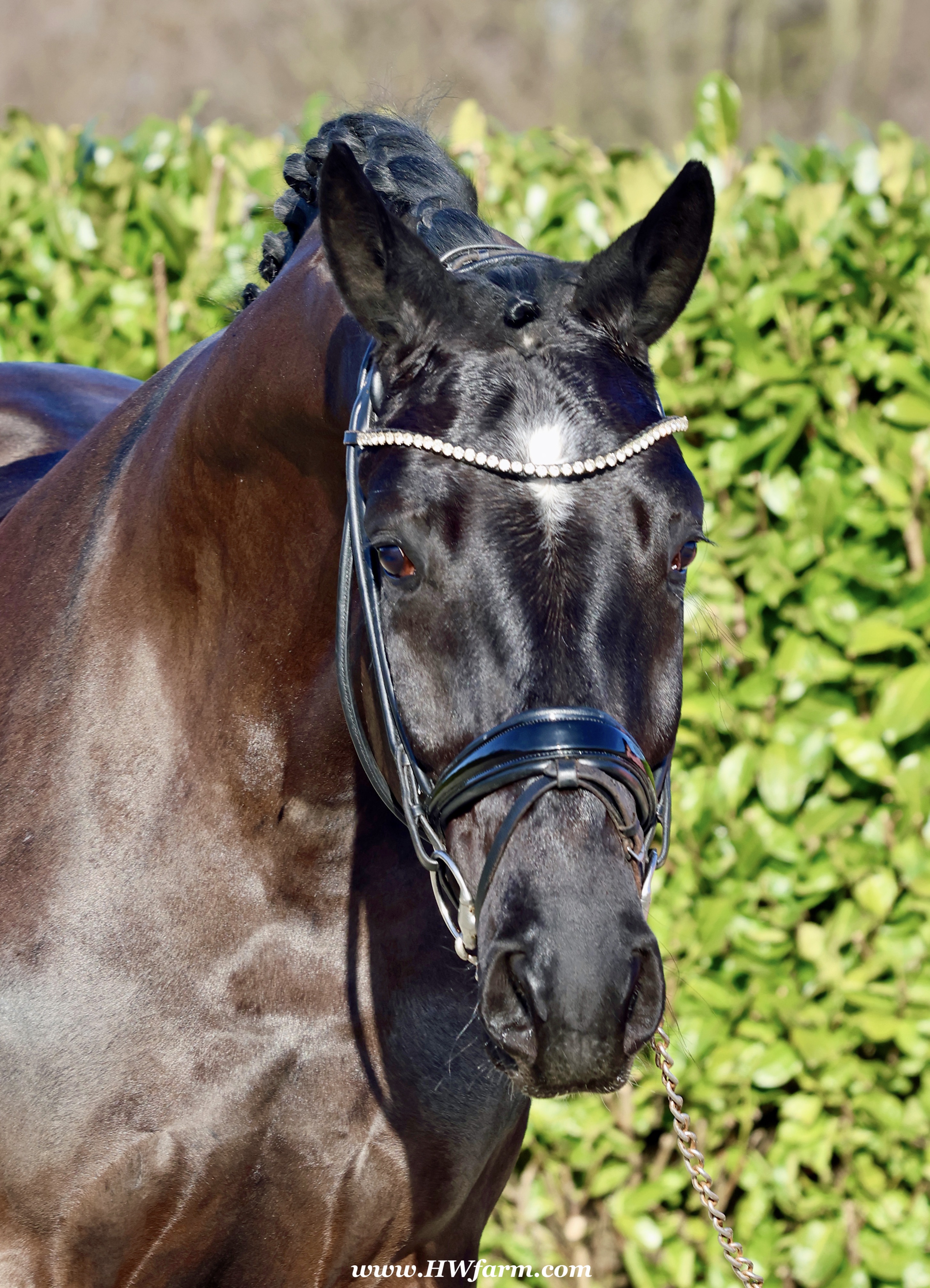 Dark Star HW, black Hanoverian gelding by Vice Bundeschampion Despacito/Hanoverian of the year Rotspon, born in 2021, standing approximately 170 cm or 16.2 hands. Dark Star HW, a clone to his sire and ancestors, in everything we could hope for. Despacito caught the interest of breeders very early on in his career with his stunning appearance and great pedigree. With the clear victory in the Hanoverian Championships in Verden with the dream grade 8.8 and the subsequent win of the silver medal at the Bundeschampionat in Warendorf, he put himself in the spotlight for breeders. As the son of the impressive Don Nobless, out of a dam by Sandro Hit-De Niro-Ehrentusch, his genetics leave nothing to be desired. His love for work and his extremely pleasant nature complete the picture of a stallion, who raises many expectations. This was also confirmed in his 50-day test, which he finished with a very good final score of 8.56. Don Nobless competed at the Bundeschampionat as a five-year-old, and he is now successful at international grand prix under Susan Pape; winning his first grand prix special in January 2017 and since picking up a host of placings at the level with scores over 70% and making his first Nations Cup appearance at the CHIO in Rotterdam. His grand-sire Dancier was champion of the 2004 Hanoverian Stallion Licensing in Verden and the 2005 stallion performance test in Adelheidsdorf; after his performance test, he sold for €330,000 to the state stud at Celle. As a young horse, he was reserve champion of the Hanoverian Young Horse Championships, and was third in the four-year-old Bundeschampionat final. Second dam Donja produced premium mares Selina and Donata, dam Selina is by the great stallion Sandro Hit who was Bundeschampion and World Champion as a six-year-old in 1999, dominating both competitions from start to finish. Sandro Hit's sons and grandsons pass on his excellent genes and their offspring include many top competition and breeding horses. One of the most outstanding examples is Sir Donnerhall, who also tops the FN breeding stallion rating. Sandro Hit's son San Amour won the Hauptprämie title by a wide margin, while his full sister, Victoria, won the Oldenburg Regional Championship. Dark Star HW's dam is by the very famous Rotspon. After years of producing quality offspring, in 2017 Rotspon was awarded 'Hanoverian Stallion of the Year' by the Hanoverian Verband in Verden, Germany. Rotspon is a top quality son of the dressage stallion Rubinstein I. He was the sovereign winner of the Hanoverian stallion performance test in 1998, scoring an excellent 148.82 points in the dressage category. Like his father, Rotspon is a very impressive horse with a great rideability, outstanding movements and a high ability for dressage. He also has a good jumping technique which is above average. He is an elegantly made sire in a noble black coat with a lot of expression and appearance. Rotspon's son, Rosevelt, competed for Team USA at the 2016 Rio Olympics. With his rider Allison Brock, Team USA won Bronze. Rosevelt also won the 2015 Grand Prix in Wellington, FL and did it again one month later at the Grand Prix CD13*. The first crop of offspring by Rotspon were born in the year 2000. The foals have beautiful heads and a good conformation (long sloping shoulder, long well set up neck). They are equipped with a very elastic trot and a ground covering walk, and have been very much in demand. In the 2015, according to the Hanoverian Stallion Book, Rotspon is credited with 888 competition progeny with winnings of €680,105 - 767 dressage placegetters with 80 progeny competing at S level. In the 2016 Hanoverian book, the progeny stands at 913, with winnings of €759,161. Although he has produced nine horses that have won more than €10,000 in the dressage ring, none are stars. His FN breeding value for dressage is 132, for jumping, 72. His Hanoverian values are 126 for dressage and 80 for jumping. He is the sire of 17 licensed sons including Rascalino and Royal Blend. Rotspon offspring qualify for the New England Dressage Association (NEDA) Foal Futurity. Dark Star HW always impresses with incredible beauty and movement. His stallion type (he is a gelding!!) will mesmerize everybody alike and he is dressed in a stunning black coat with just enough chrome. He looks like a clone to his sire, He was born to step in his father's footsteps. He is out of world-famous dressage lines and is equipped with absolutely phenomenal gaits und has many Champions on sire and dam site. Dark Star HW has super fancy, cat like/elastic, swinging movements and knows to get attention with rhythm, balance and always gives his best effort. This stunning horse has all, the looks and the personality a person could ever hope for. Super pretty head, perfect set on neck and superb conformation. His athleticism and gentleman like attitude, is nearly indescribable. This boy is so much fun to ride, with a soft mouth and lots of impulsion. He eagerly works under saddle. He is all concentrated on his job in the dressage arena and with his quick, far reaching hind leg, passage and piaffe will come naturally to him. Dark Star HW is incredible supple and has a ton of air time. He just floats above the ground. With his free shoulder and huge suspension, he swings nicely through his back and is easy to sit. This extremely talented gentleman has definite international potential. This young stunner will go far in the dressage ring, he is your ticket to the top! He was always handled and trained correctly, even as a young stallion in hand, to continue his career under saddle, comes naturally to him. With this horse, you will be the star in FEI classes and at clinics, the judges and onlookers will remember him where ever he goes. This is a stunning horse, that has it all and loves to give it all, used to go in the hot walker, loves his shower and solarium time. Stands for the farrier, loads and appreciates his personal grooming time. Th