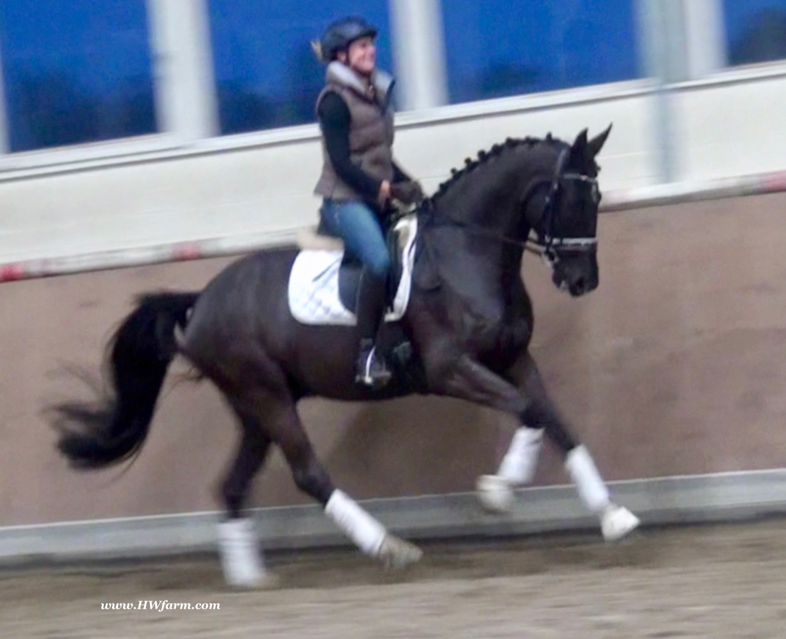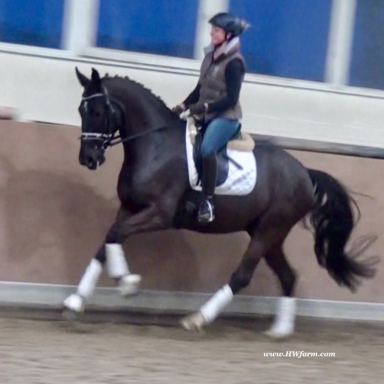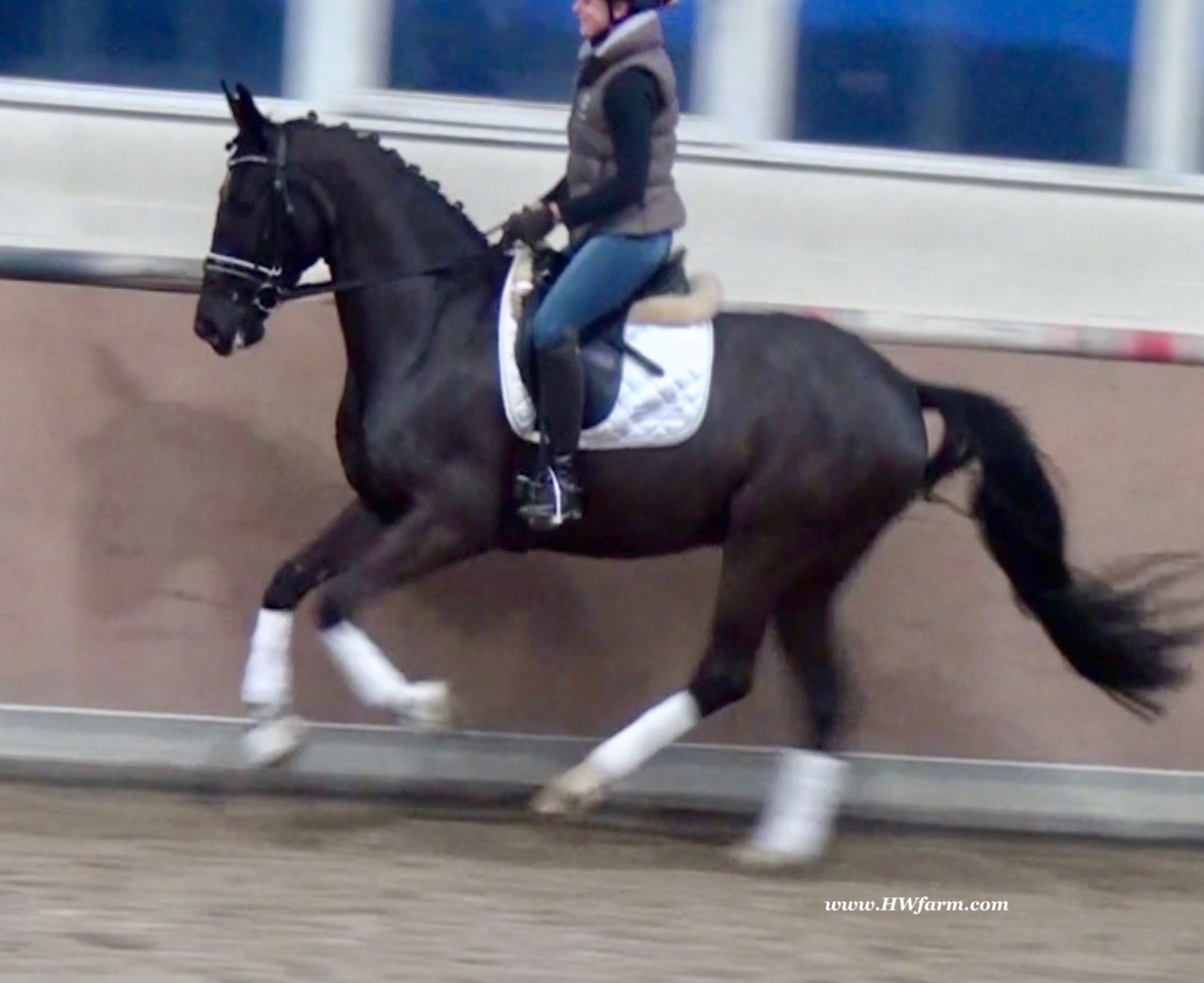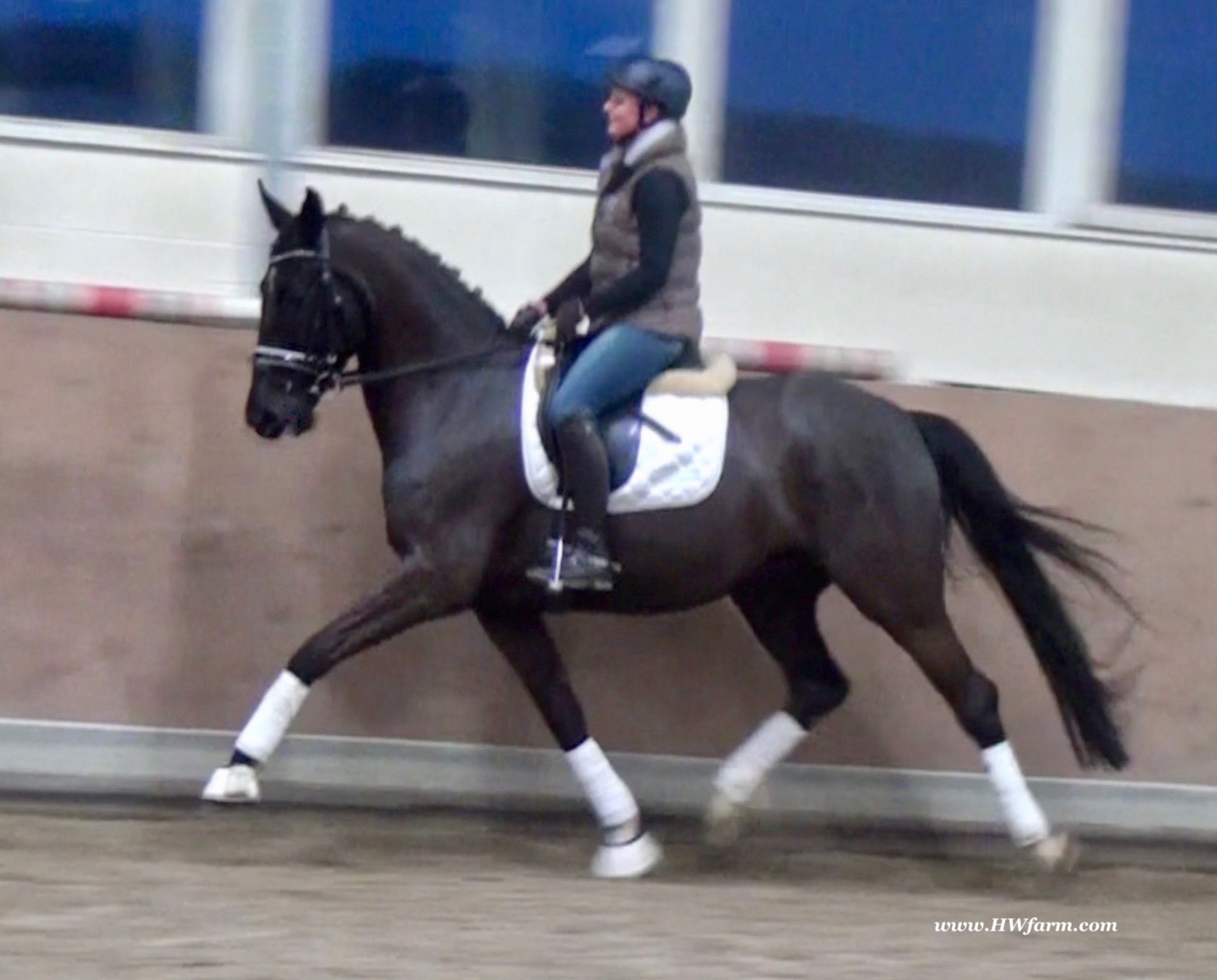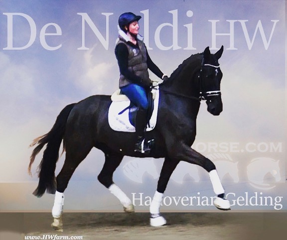 De Naldi HW, black Westphalian gelding, by Hanoverian stallion of the year De Niro/Gribaldi (sire of Totilas), born in 2015, standing approximately 169 cm or 16.2 hands. De Naldi HW, sired by the famous Hanoverian stallion of the year, De Niro. An exceptional stallion of superlative type and performance. De Niro's sire, Donnerhall, holds the highest dressage breeding value index (271) of all stallions. He placed second among 70 stallions at his performance test and went on to become DLG Champion in 1986. Donnerhall won more than 65 FEI Level and Grand Prix competitions and competed successfully until he was retired at 17-years of age. De Niro's dam was a successful dressage competitor producing an Approved stallion in Westfalia. His dam's sire, Akzent II, is regarded as one of the best sires of rideability in modern sport horse breeding producing many Approved stallions and expensive auction horses.