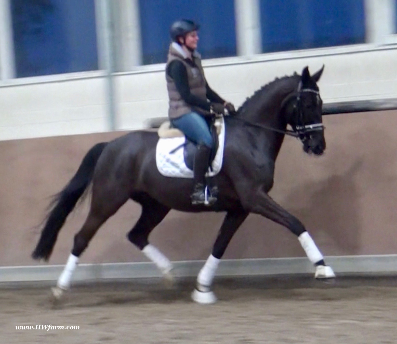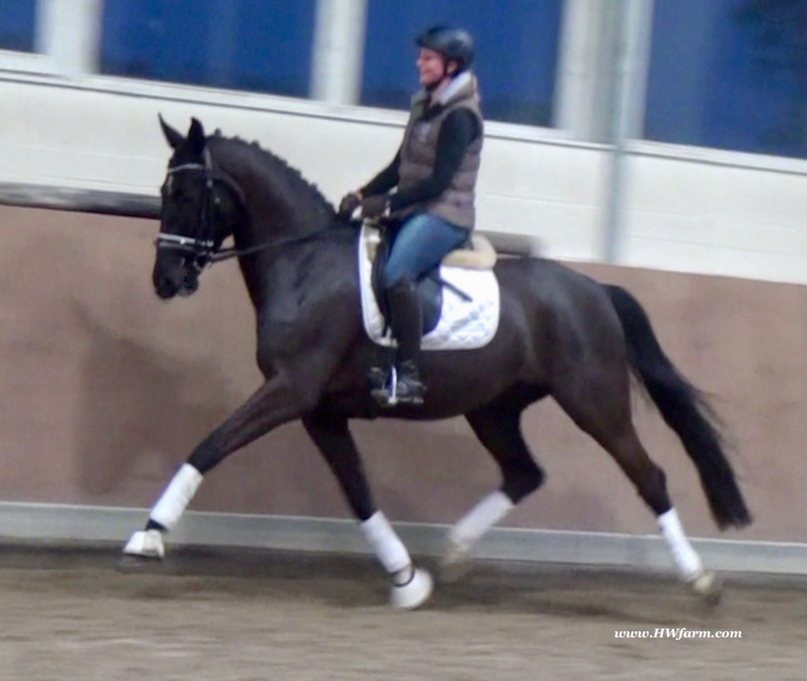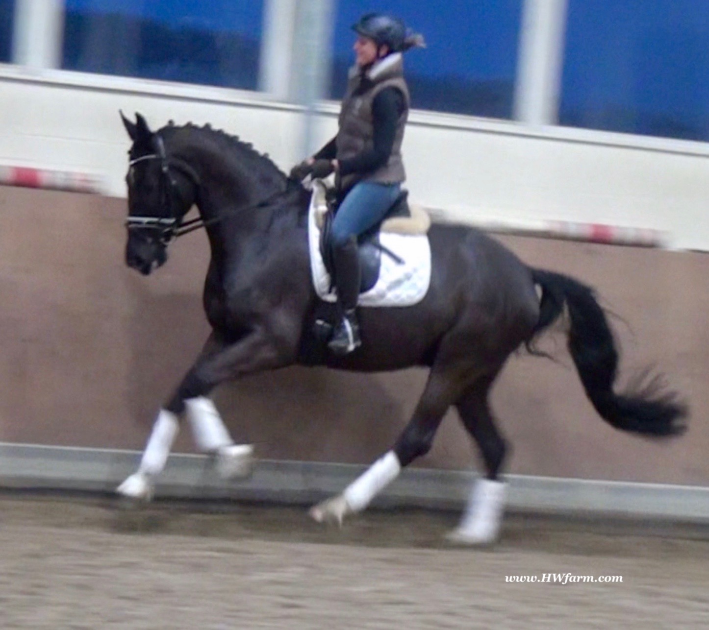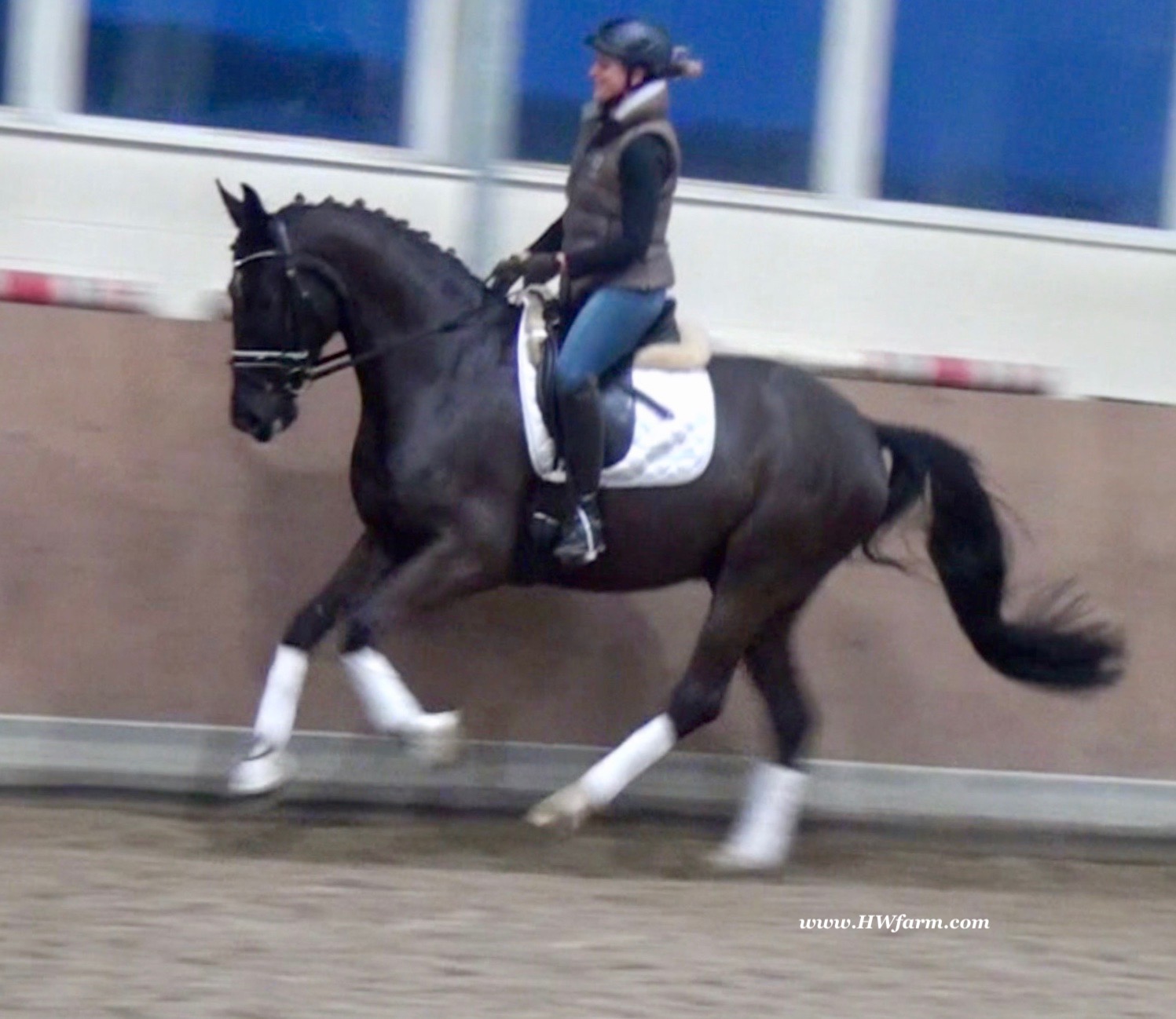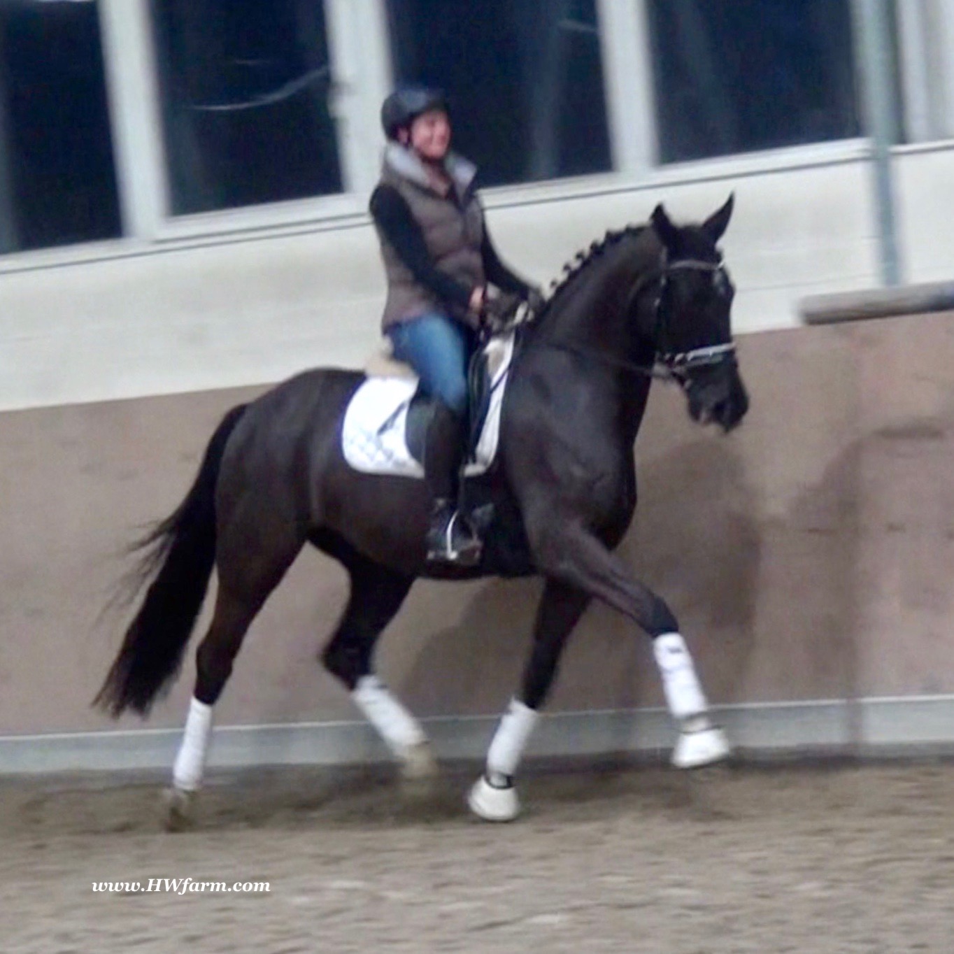 De Naldi HW, black Westphalian gelding, by Hanoverian stallion of the year De Niro/Gribaldi (sire of Totilas), born in 2015, standing approximately 169 cm or 16.2 hands. De Naldi HW, sired by the famous Hanoverian stallion of the year, De Niro. An exceptional stallion of superlative type and performance. De Niro's sire, Donnerhall, holds the highest dressage breeding value index (271) of all stallions. He placed second among 70 stallions at his performance test and went on to become DLG Champion in 1986. Donnerhall won more than 65 FEI Level and Grand Prix competitions and competed successfully until he was retired at 17-years of age. De Niro's dam was a successful dressage competitor producing an Approved stallion in Westfalia. His dam's sire, Akzent II, is regarded as one of the best sires of rideability in modern sport horse breeding producing many Approved stallions and expensive auction horses.