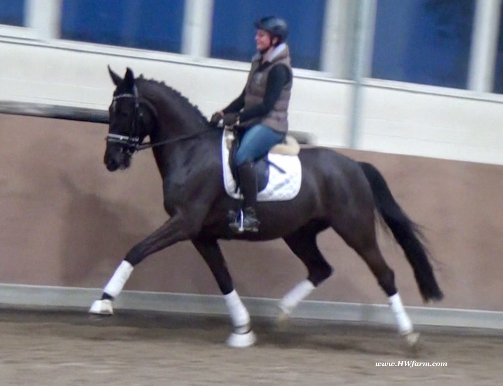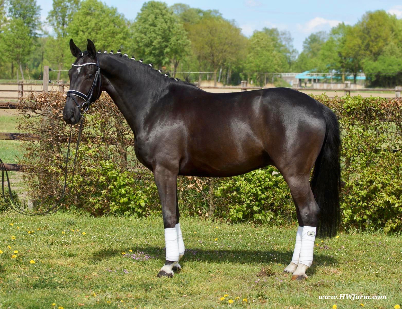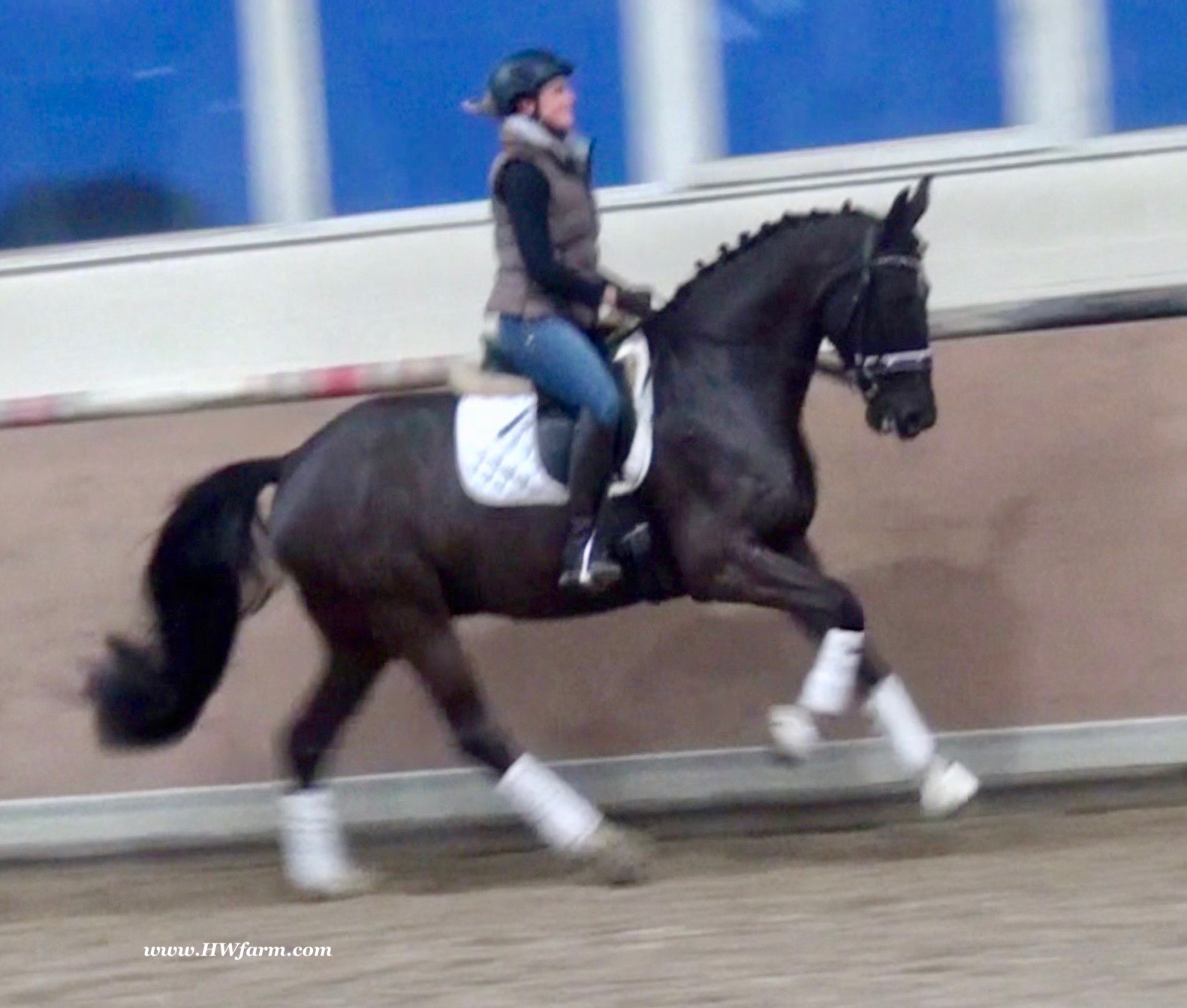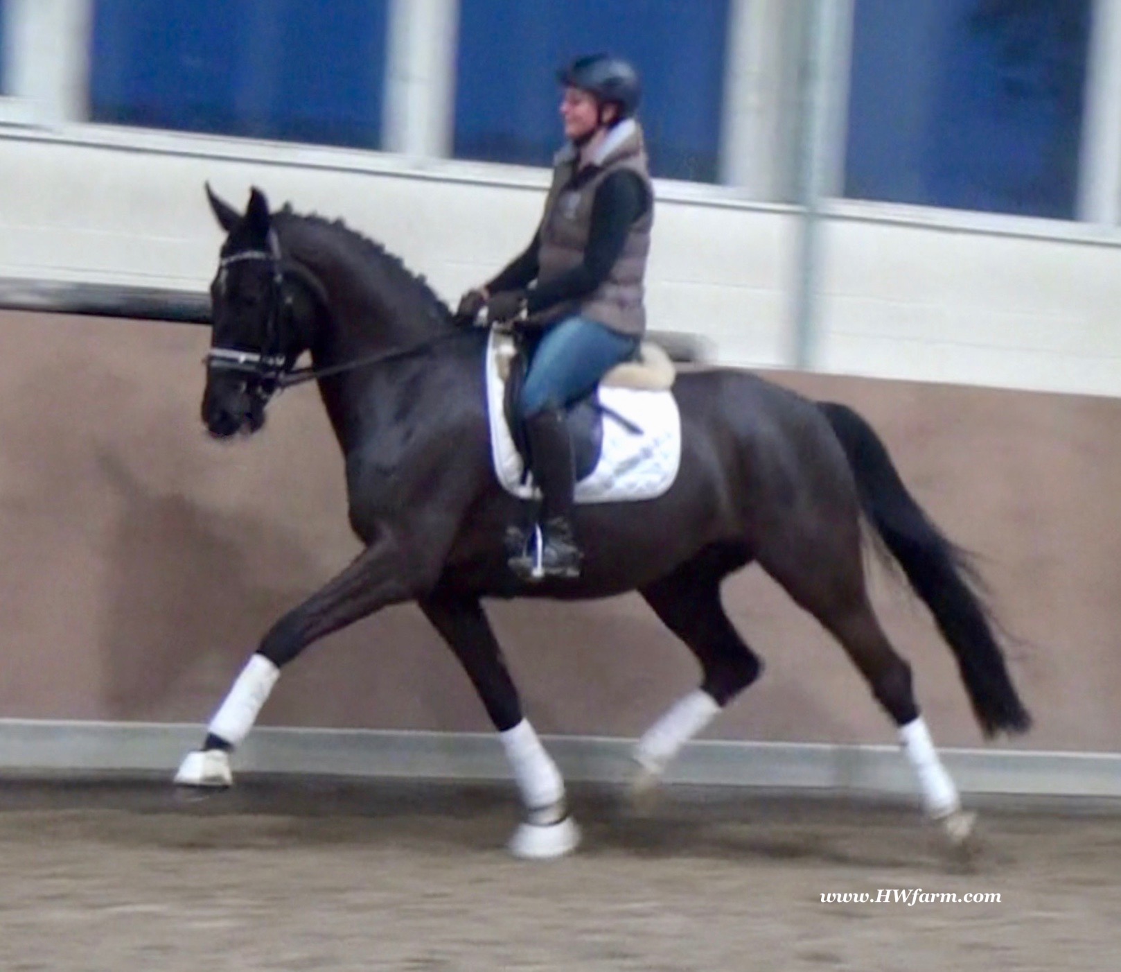 De Naldi HW, black Westphalian gelding, by Hanoverian stallion of the year De Niro/Gribaldi (sire of Totilas), born in 2015, standing approximately 169 cm or 16.2 hands. De Naldi HW, sired by the famous Hanoverian stallion of the year, De Niro. An exceptional stallion of superlative type and performance. De Niro's sire, Donnerhall, holds the highest dressage breeding value index (271) of all stallions. He placed second among 70 stallions at his performance test and went on to become DLG Champion in 1986. Donnerhall won more than 65 FEI Level and Grand Prix competitions and competed successfully until he was retired at 17-years of age. De Niro's dam was a successful dressage competitor producing an Approved stallion in Westfalia. His dam's sire, Akzent II, is regarded as one of the best sires of rideability in modern sport horse breeding producing many Approved stallions and expensive auction horses.