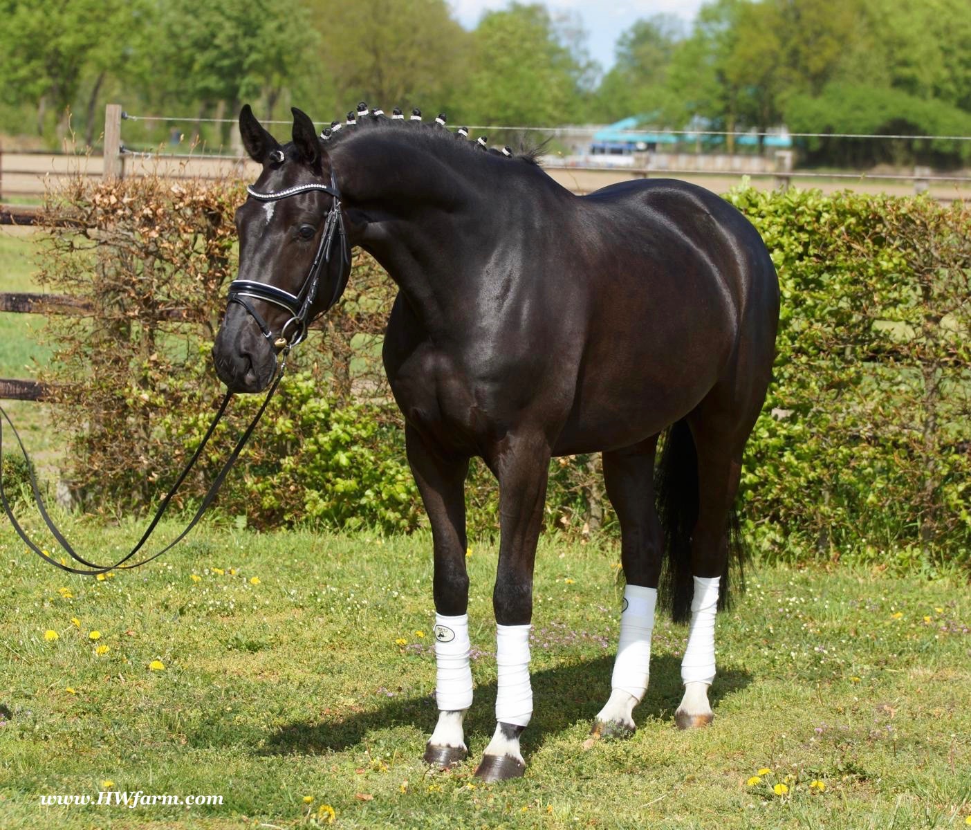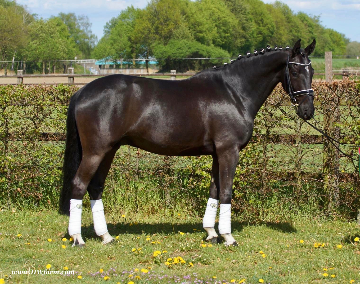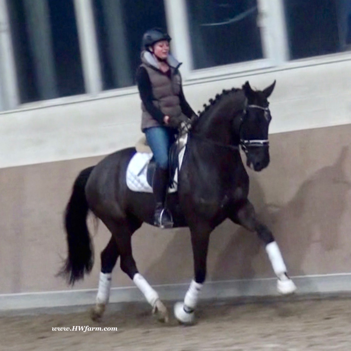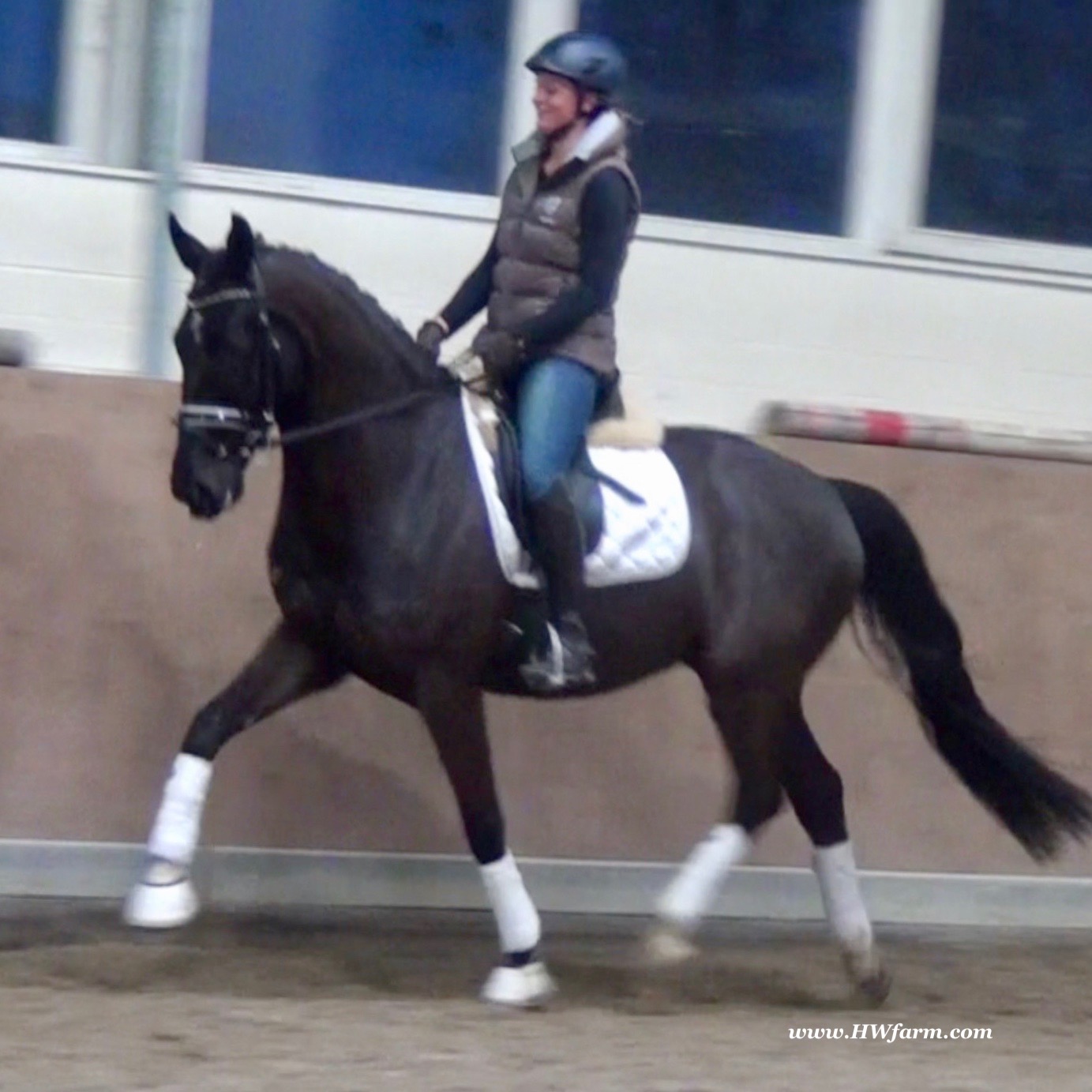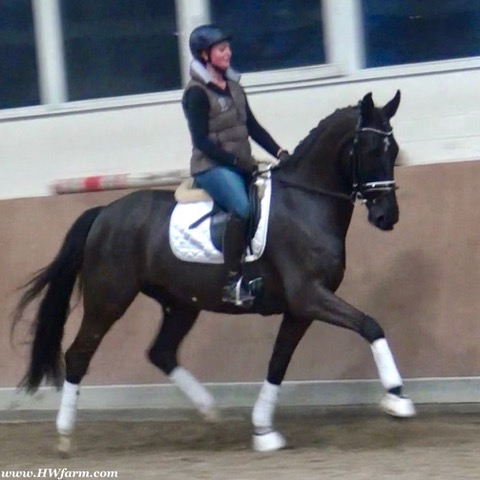 De Naldi HW, black Westphalian gelding, by Hanoverian stallion of the year De Niro/Gribaldi (sire of Totilas), born in 2015, standing approximately 169 cm or 16.2 hands. De Naldi HW, sired by the famous Hanoverian stallion of the year, De Niro. An exceptional stallion of superlative type and performance. De Niro's sire, Donnerhall, holds the highest dressage breeding value index (271) of all stallions. He placed second among 70 stallions at his performance test and went on to become DLG Champion in 1986. Donnerhall won more than 65 FEI Level and Grand Prix competitions and competed successfully until he was retired at 17-years of age. De Niro's dam was a successful dressage competitor producing an Approved stallion in Westfalia. His dam's sire, Akzent II, is regarded as one of the best sires of rideability in modern sport horse breeding producing many Approved stallions and expensive auction horses.