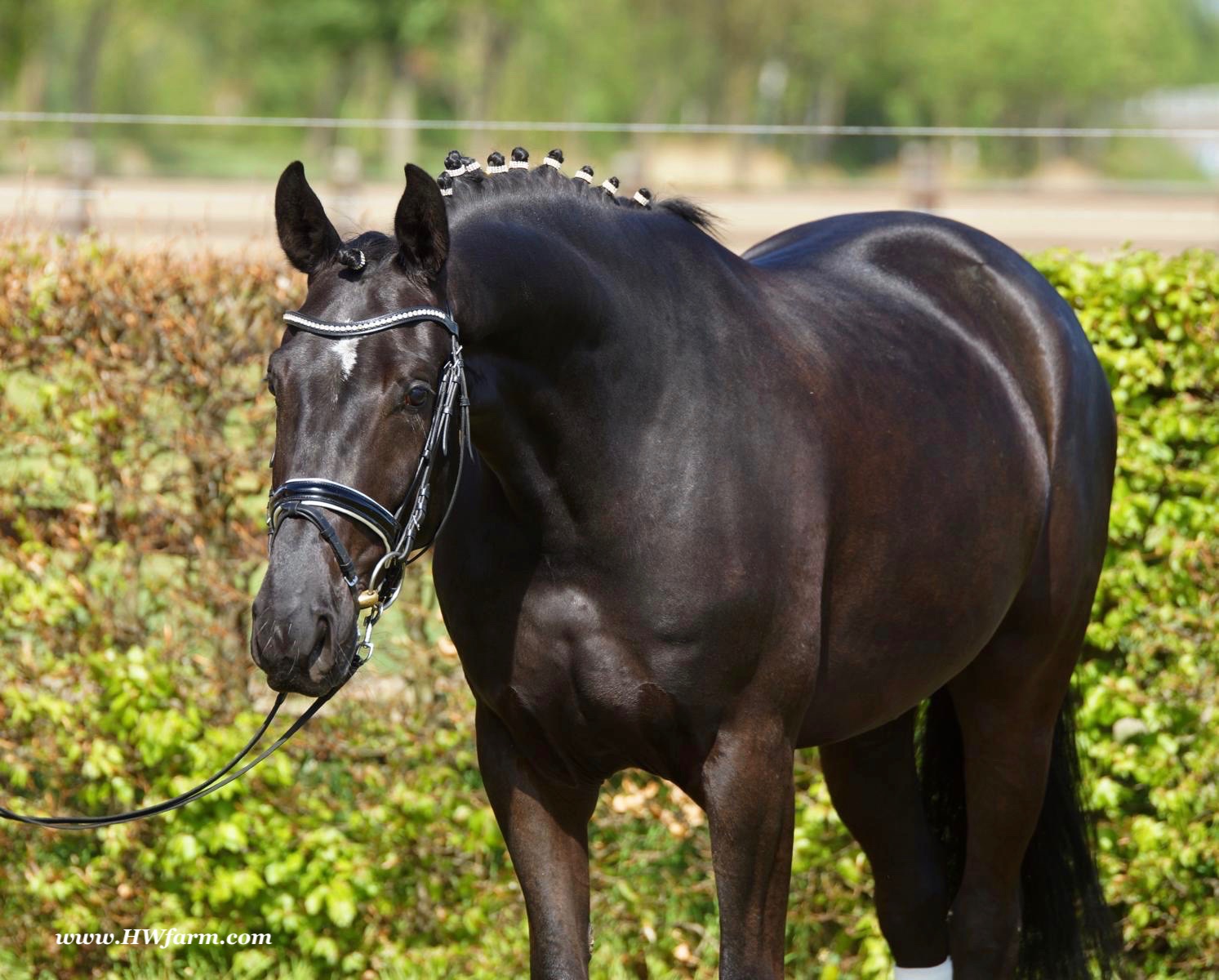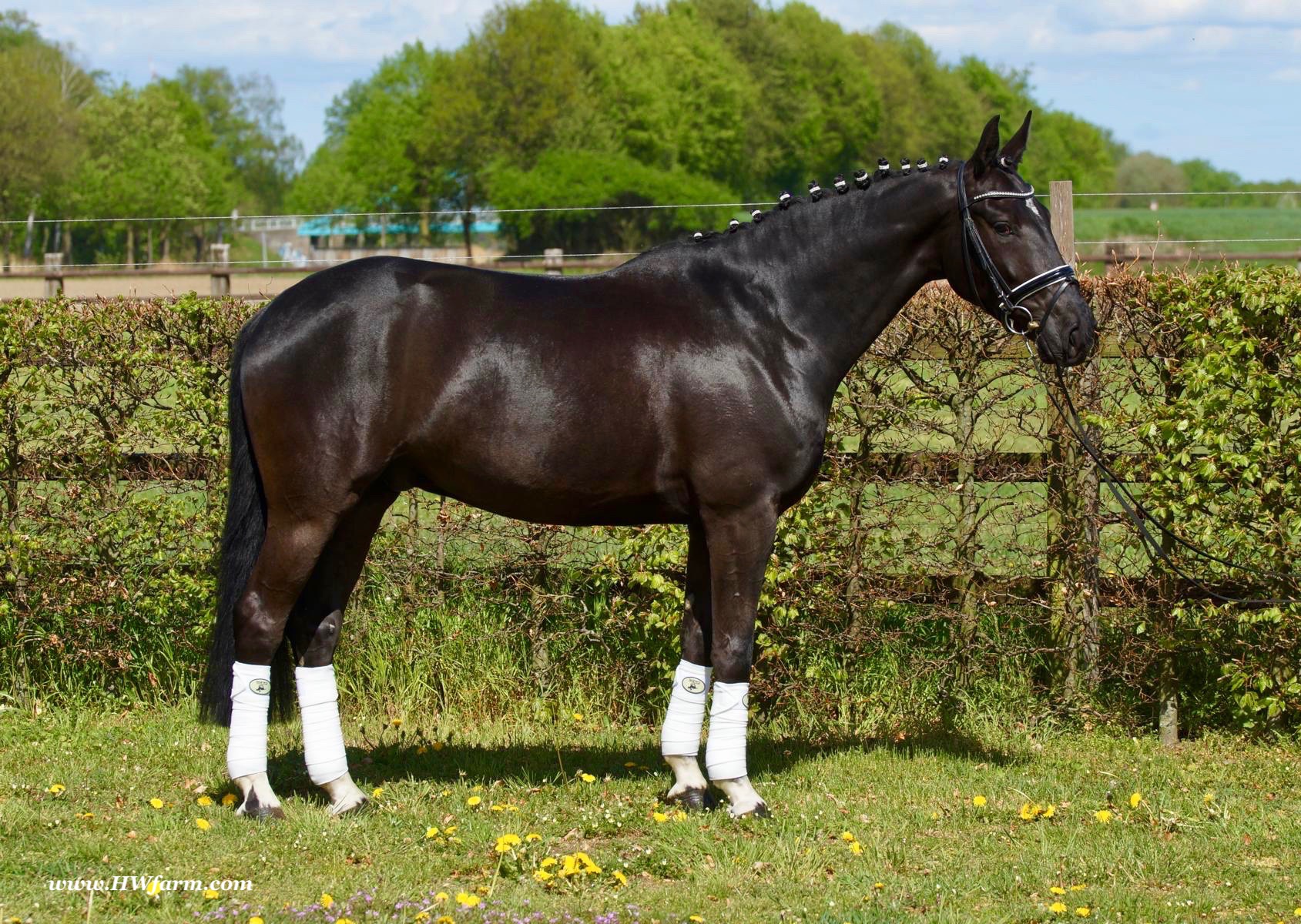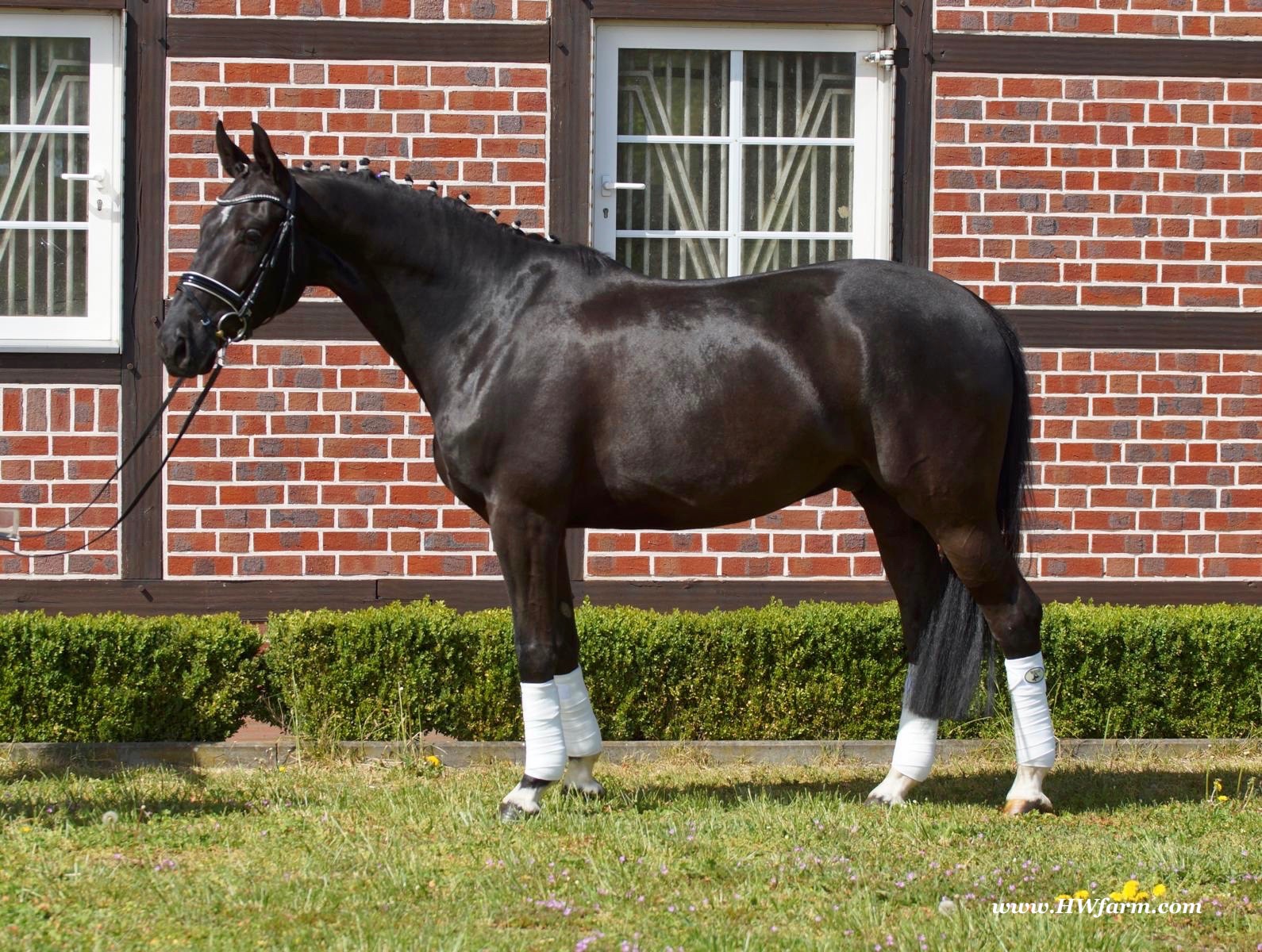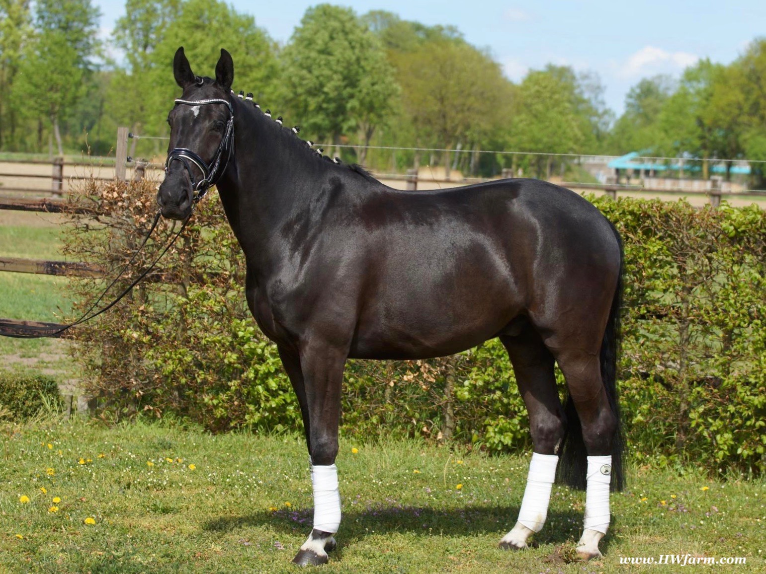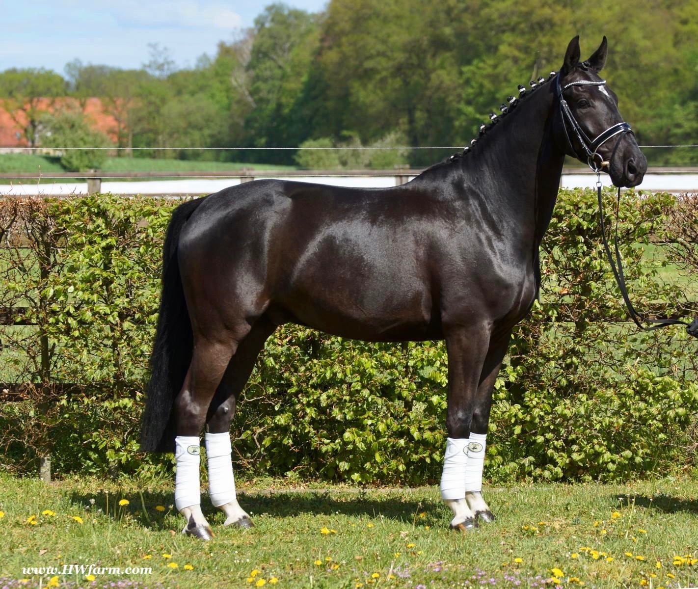 De Naldi HW, black Westphalian gelding, by Hanoverian stallion of the year De Niro/Gribaldi (sire of Totilas), born in 2015, standing approximately 169 cm or 16.2 hands. De Naldi HW, sired by the famous Hanoverian stallion of the year, De Niro. An exceptional stallion of superlative type and performance. De Niro's sire, Donnerhall, holds the highest dressage breeding value index (271) of all stallions. He placed second among 70 stallions at his performance test and went on to become DLG Champion in 1986. Donnerhall won more than 65 FEI Level and Grand Prix competitions and competed successfully until he was retired at 17-years of age. De Niro's dam was a successful dressage competitor producing an Approved stallion in Westfalia. His dam's sire, Akzent II, is regarded as one of the best sires of rideability in modern sport horse breeding producing many Approved stallions and expensive auction horses.