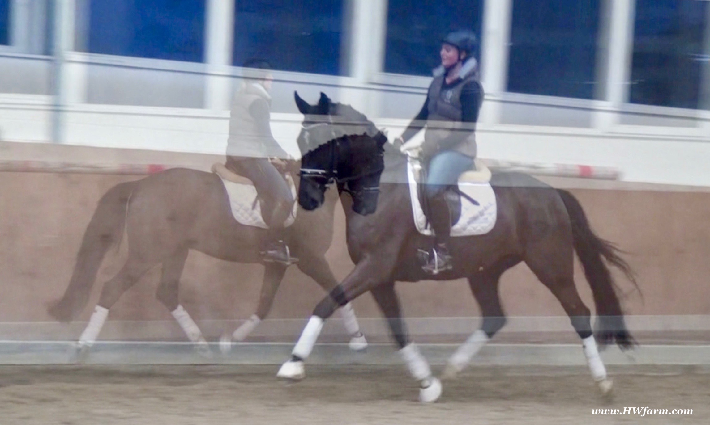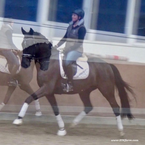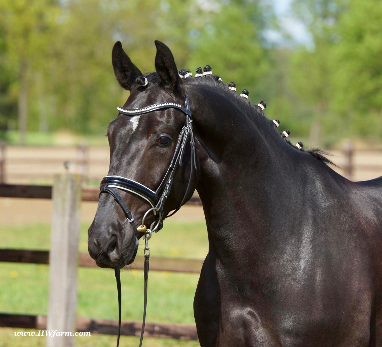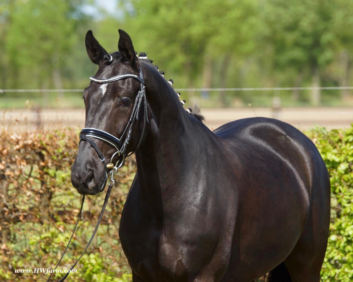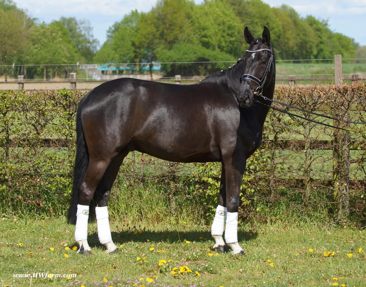 De Naldi HW, black Westphalian gelding, by Hanoverian stallion of the year De Niro/Gribaldi (sire of Totilas), born in 2015, standing approximately 169 cm or 16.2 hands. De Naldi HW, sired by the famous Hanoverian stallion of the year, De Niro. An exceptional stallion of superlative type and performance. De Niro's sire, Donnerhall, holds the highest dressage breeding value index (271) of all stallions. He placed second among 70 stallions at his performance test and went on to become DLG Champion in 1986. Donnerhall won more than 65 FEI Level and Grand Prix competitions and competed successfully until he was retired at 17-years of age. De Niro's dam was a successful dressage competitor producing an Approved stallion in Westfalia. His dam's sire, Akzent II, is regarded as one of the best sires of rideability in modern sport horse breeding producing many Approved stallions and expensive auction horses.