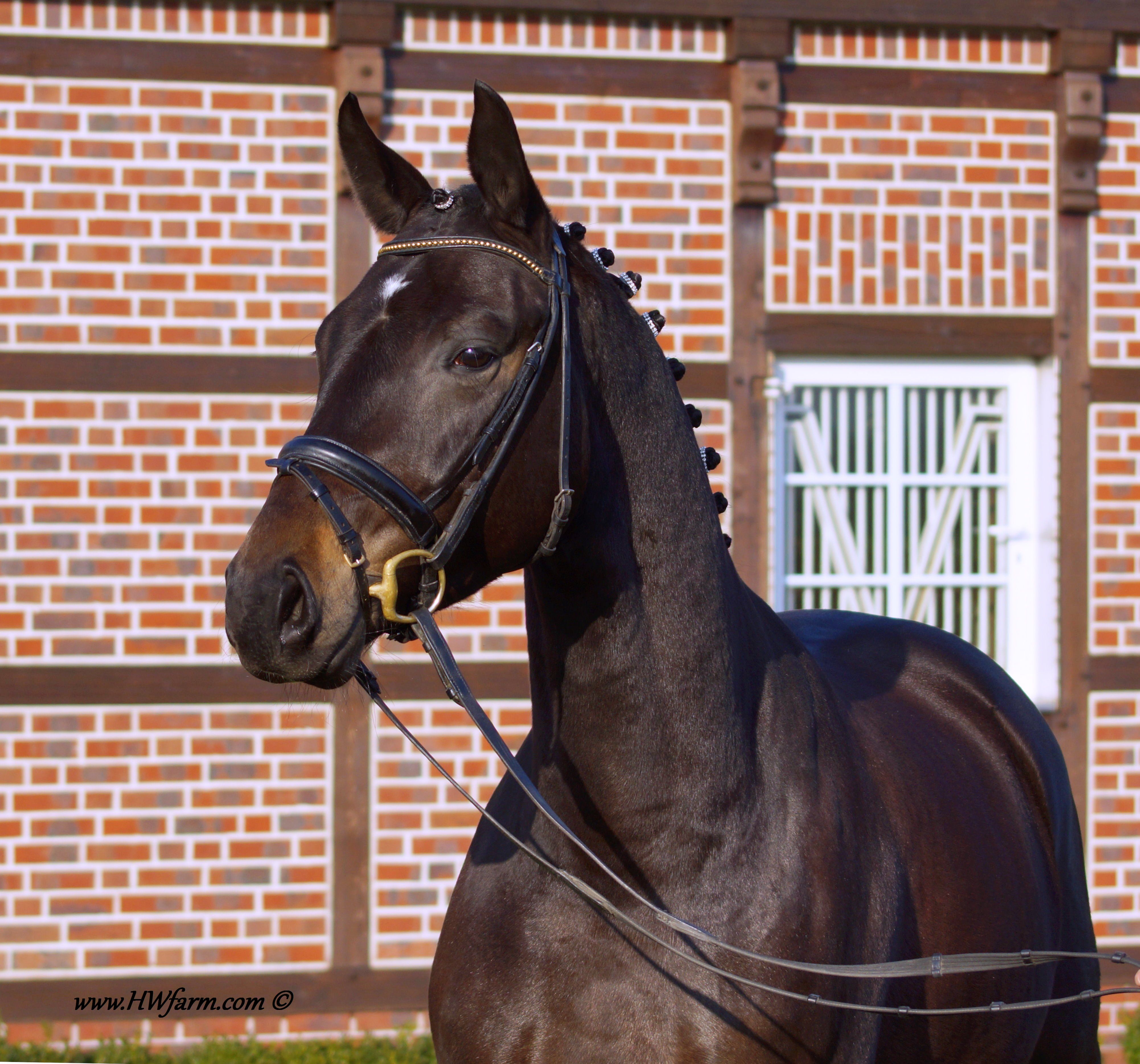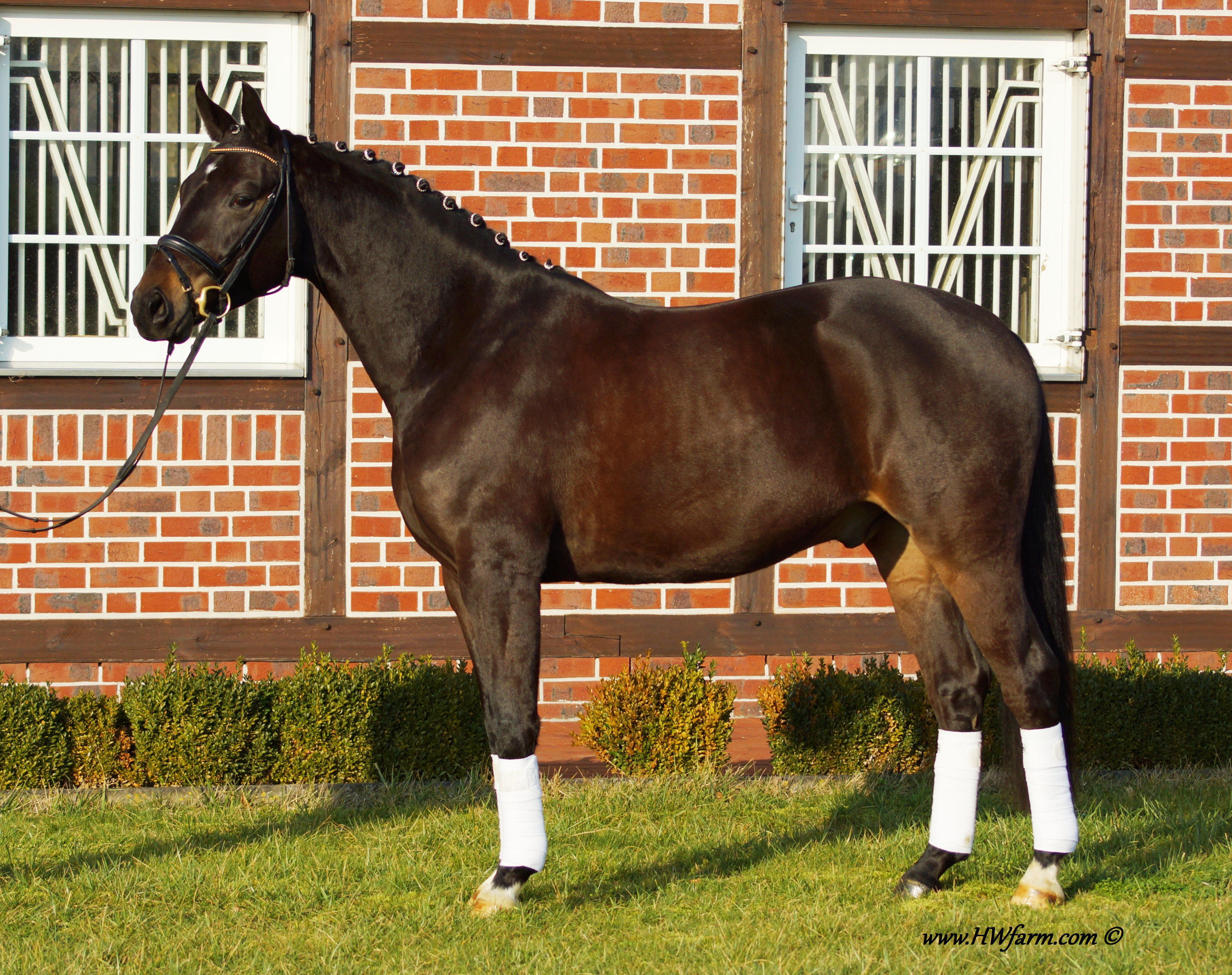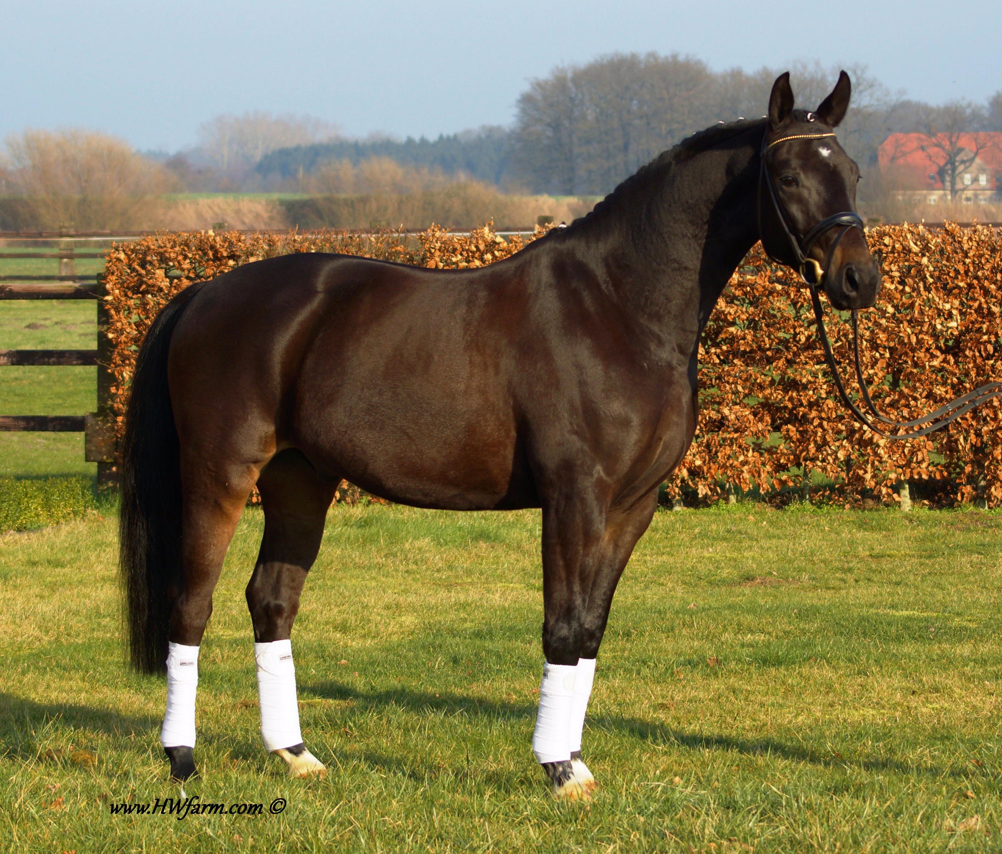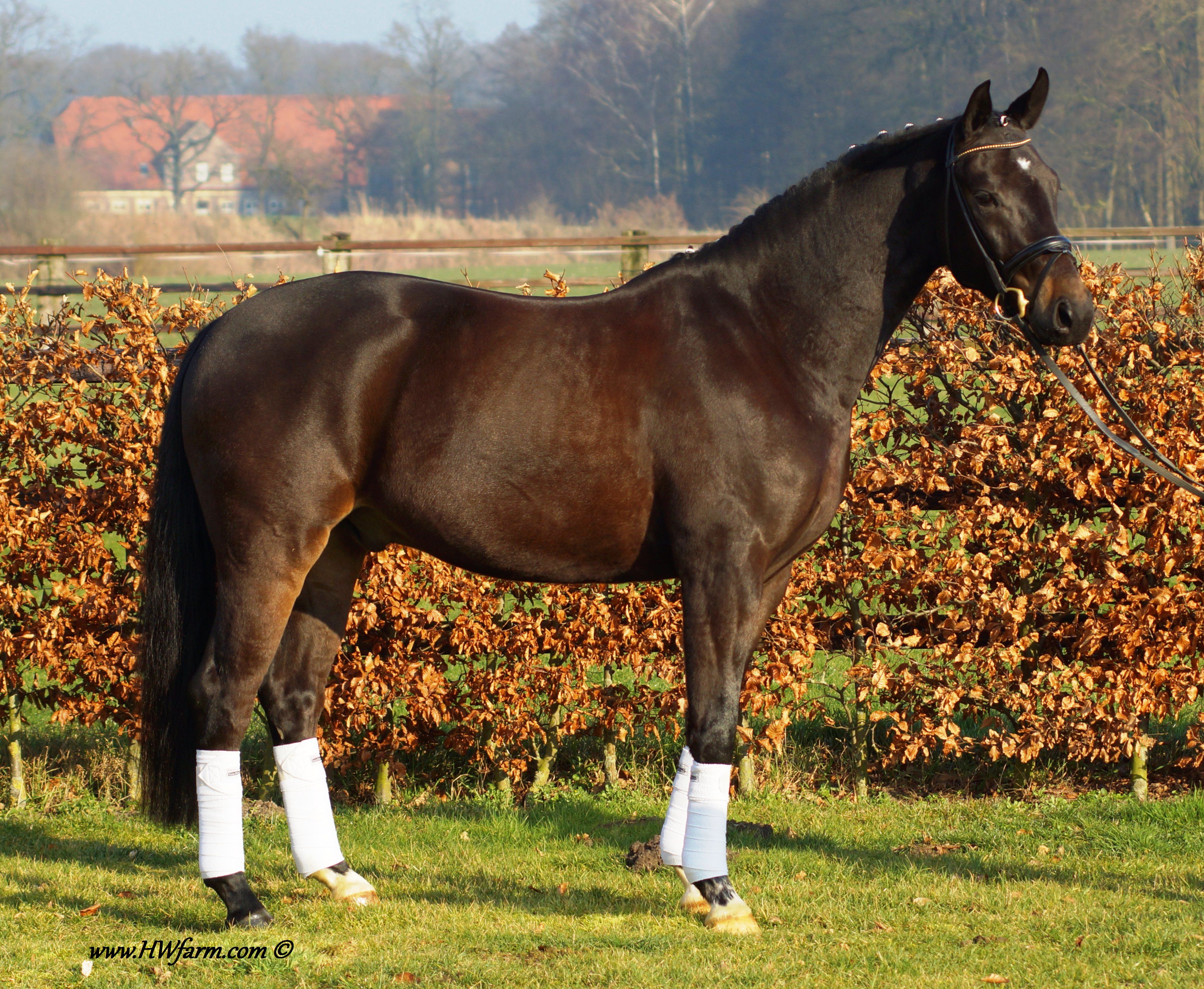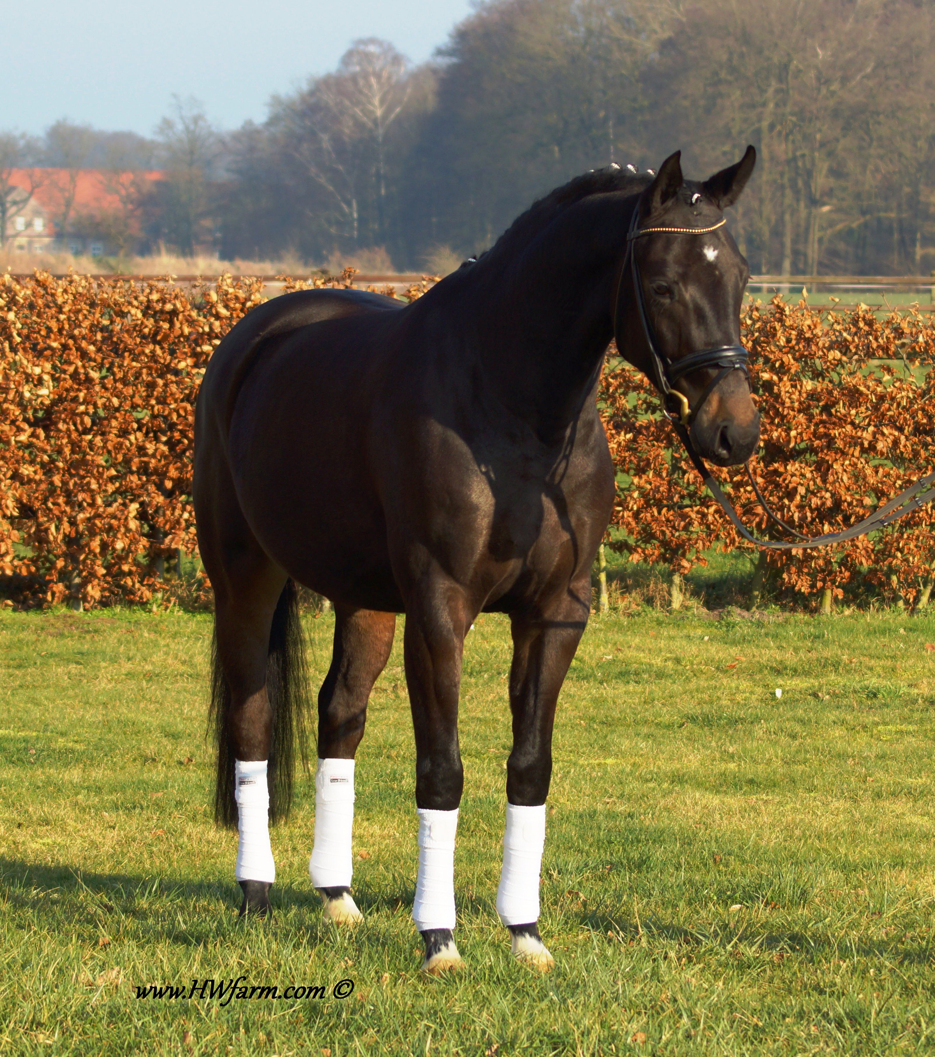 Duke HW, dark bay Oldenburg gelding by Delatio (De Niro/Rubinstein)/Stedinger/Donnerschlag, born in 2010, standing approximately 165 cm or 16.1 hands. Duke HW has an impressive pedigree, he is by the top stallion Delatio who combines world class blood lines of De Niro and Rubinstein. Delatio, with his chic black and brown appearance and its interesting bloodlines, is an asset for every dressage breeding. The father of Delatio, is the famous Elite Grand Prix dressage stallion De Niro. In 2000 he was declared the best new generation German Grand Prix horse. Winner of the German Championships of professional riders in Verden under Dolf-Dietram Keller. At 8 years of age he has already sired 19 licensed sons taking him to the forefront of today's breeding in Germany. Sire of Vice Federal champion in 2001 - Del MartinoDe Niro is a son of Donnerhall, who became a figurehead of the more recent Oldenburg breeding history, as double world champion and a top class hereditary transmitter of dressage horses. The dam Alicante , who was herself a successful dressage horse, had earlier produced the full-De Niro brother Dimension. The damsire Akzent II is regarded as one of the best procreators of rideability horses of modern day horse breeding. The pedigree is consolidated well by the strong performance thoroughbred Wiesenbaum xx and the siring legend Ferdinand. The damline is identical in its origins to that of the stallions Dewett (Zweibrücken state stallion), Gomez (Dillenburg state stallion), Laurion (private stallion Oldenburg ), Wapiti ( Celle state stallion) and Wogenbrecher (private stallion Hanover ). Laurion's full-sister, the international showjumping derby winner Landdame FRH/ Franke Sloothaak, also represents this dynasty. De Niro was one of the best jumping stallions at the 1995 Verden stallion market and ranged among the top at the 1996 stallion performance test in Adelheidsdorf, where he received the highest rideability score and became overall second in performance class I. De Niro has meanwhile won dressage competitions at the elementary and intermediate levels and qualified for the national dressage championships of 1998 and 1999. Merely aged seven, he already won Prix' St. Georges,Intermédiaire I and II as well as Grand Prix events during the 2000 season. In 2000, he was furthermore declared the best new generation Grand Prix horse and in 2001, he won the Championship of German Professional Riders, ridden by his trainer Dolf- Dietram Keller. This was followed in 2002, by wins in international Grand Prix events. De Niro was awarded the I-a main premium by the Oldenburg Association in 1997 as a result of his overwhelming breeding value rating. His progeny dominate the foal markets in Medingen, Vechta and Verden as evidenced by his son Day and Night, who was sold for the sum of DM 140,000 in Medingen in the year 2000. His sons are furthermore very popular at the approvals, demonstrated inter alia, by Der Lord, who went into the services of the Lower Saxon state stud of Celle and Divino de L, who is covering in Baden-Württemberg. Then there are De Vito, Donautanz , Depardieu (runnerup of the 2000 approval in Oldenburg and state champion in 2002) and Degas, who are stationed as loose box neighbours of their sire at the Hamstrup respectively Medingen stations, furthermore, Dionysos in Schleswig-Holstein, D-Online in Hesse, De Luxe in Saxony as well as Diego Velasquez and Dante Alighieri in Austria. The son Desert Moon, who is not being utilised in breeding yet, was third at the Hanoverian approval of 2001 and was the top lot of the 2001 stallion market at the knock-down price of DM 530,000. The likewise approved Donautanz came third in the 2002 federal championship of three-year old stallions. De Niro's daughter Die Weingard became I-b diamond ring mare at the 2000 Oldenburg Elite Mare Show in Rastede. In 2001, his daughter Edina unequivocally won the Oldenburg Elite Mare Show at the same location. Delatio's mother is the St. Pr. Stute Rubina, daughter of the famous Elite Grand Prix dressage stallion Rubinstein I. Rubinstein is known as a great improver for the breed. He consistently passes on his wonderful temperament and movement. The youngstock of Rubinstein are very popular with riders professional and amateur for their willingness to please. Delatio scored during his 70-day test in Adelheidsdorf (Ger) for all three gaits and rideability a 9. Delatio steps with much tact and flexibility, has a nice trot in which he shows a lot of rhythm and his canter is uphill stride. Delatio is successful in Prix St. George classes, under his rider Miranda Rongen. Delatio's offspring are in high demand, they have a nice appearance and can move very well. Duke HW's dam is by the famous stallion Stedinger. He is the radiant and unequivocal approval winner of the 2002 Oldenburg Stallion Days from our own breeding and rearing programme. He is blood impressed and large framed, with a formidable overall appearance and highly elastic in every respect. Stedinger is one of the best of his age class as regards his jumping performance. His sire Sandro Hit is regarded as the upholder of the Sacramento Song xx - Butes bloodline that established itself in Holstein and was disseminated in the warmblood breeds of Oldenburg and Hanover via Sandro. Sandro Hit was federal champion six-year old dressage horse in 1999 and world champion of the young horses in Arnheim. In the meantime, he has become one of the most sought after contemporary sires. The dam, Association premium mare Bold-Fantasy absolved an excellent mare performance test with a loose jumping score of 10.00, an extraneous rider score of 9.0 and an overall score of 8.67. She is a full-sister of the approved Lamar H, who is himself a successful dressage sports horse. The maternal bloodline is directly linked to all the epochal greats of Oldenburg breeding history through Landadel, Futuro and Adonis xx. The Oldenburg foundation line of the mare Besinda (by 