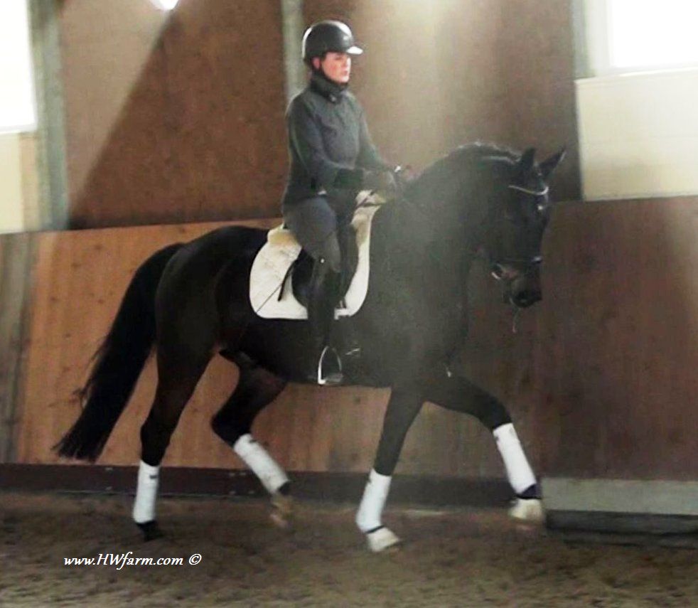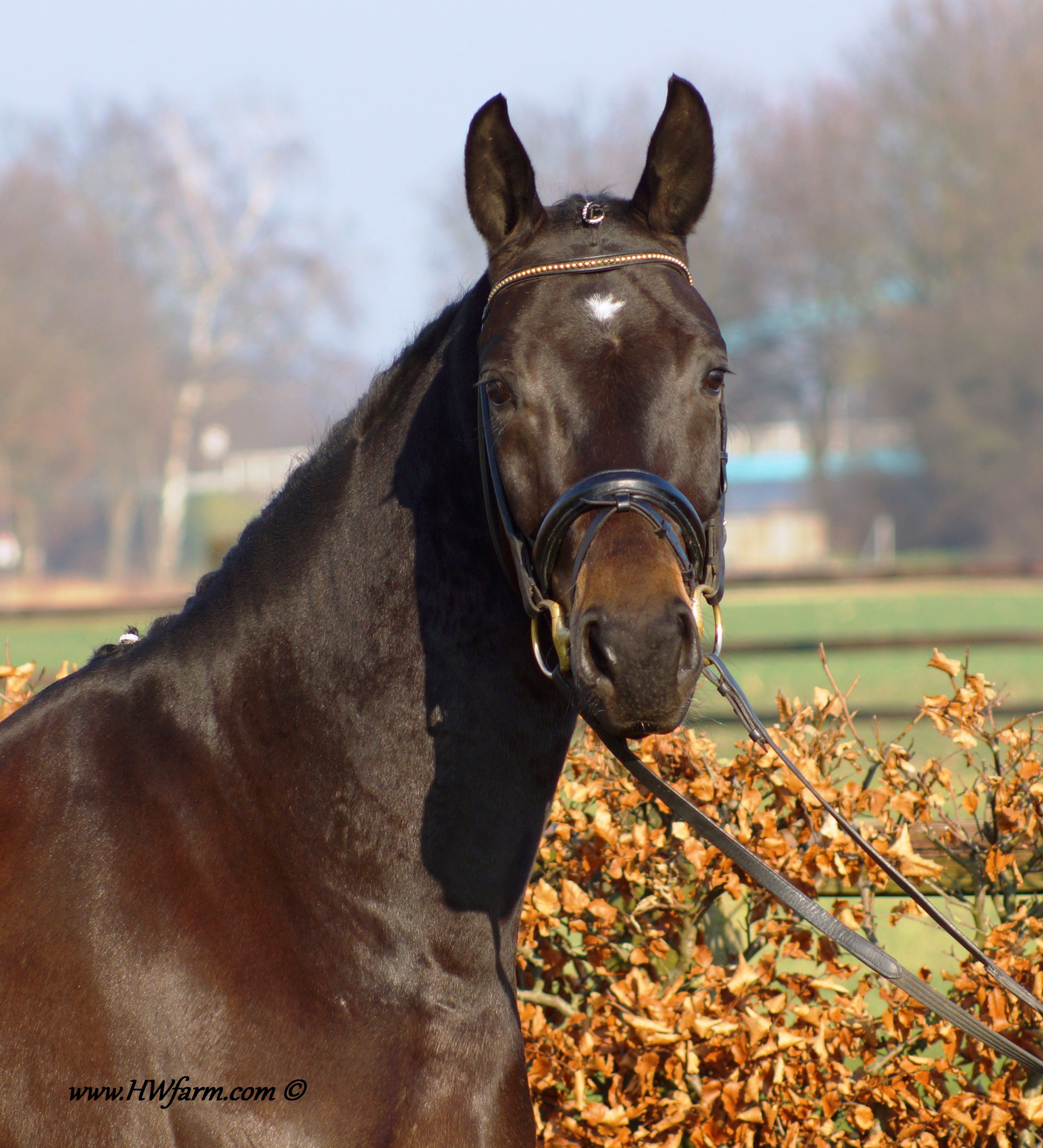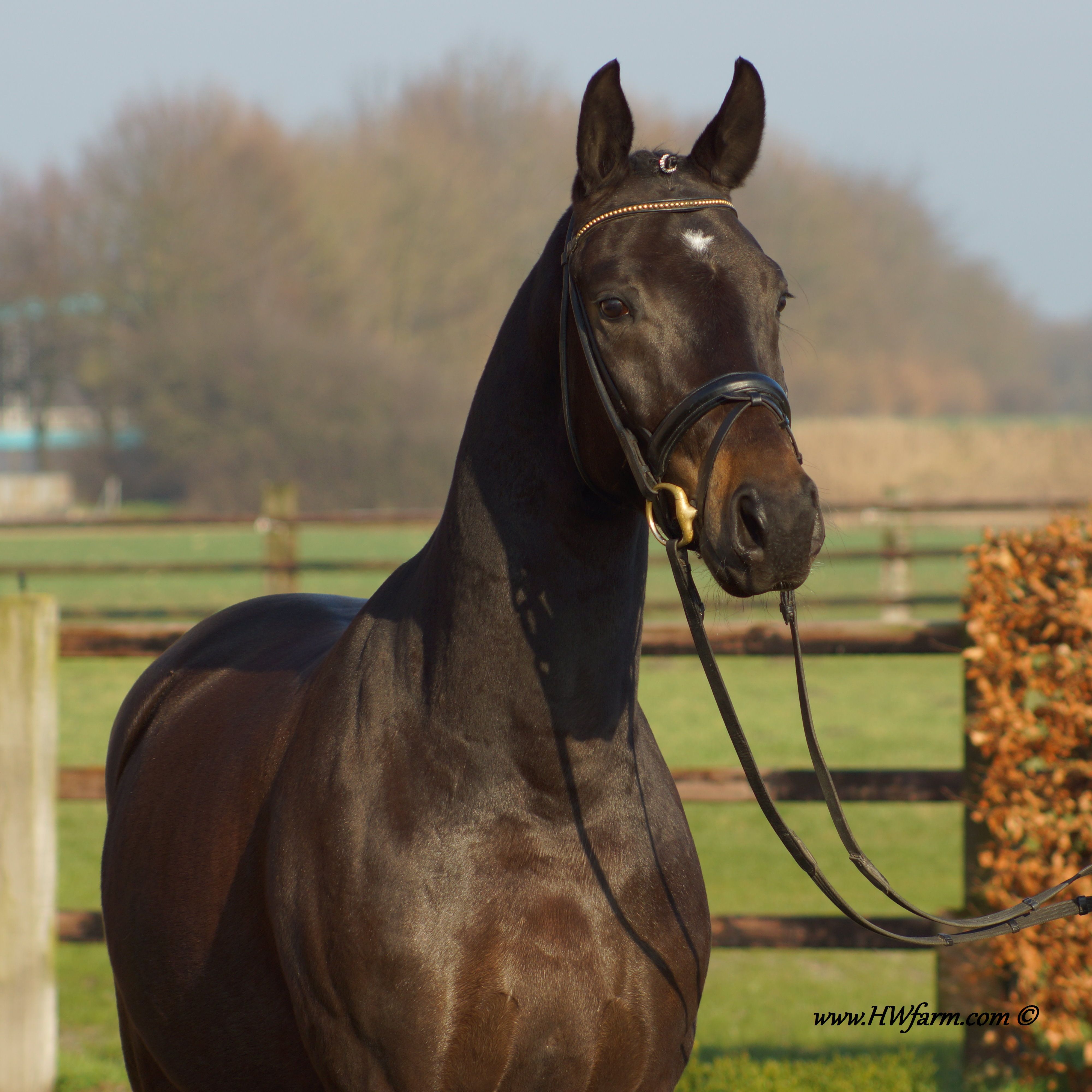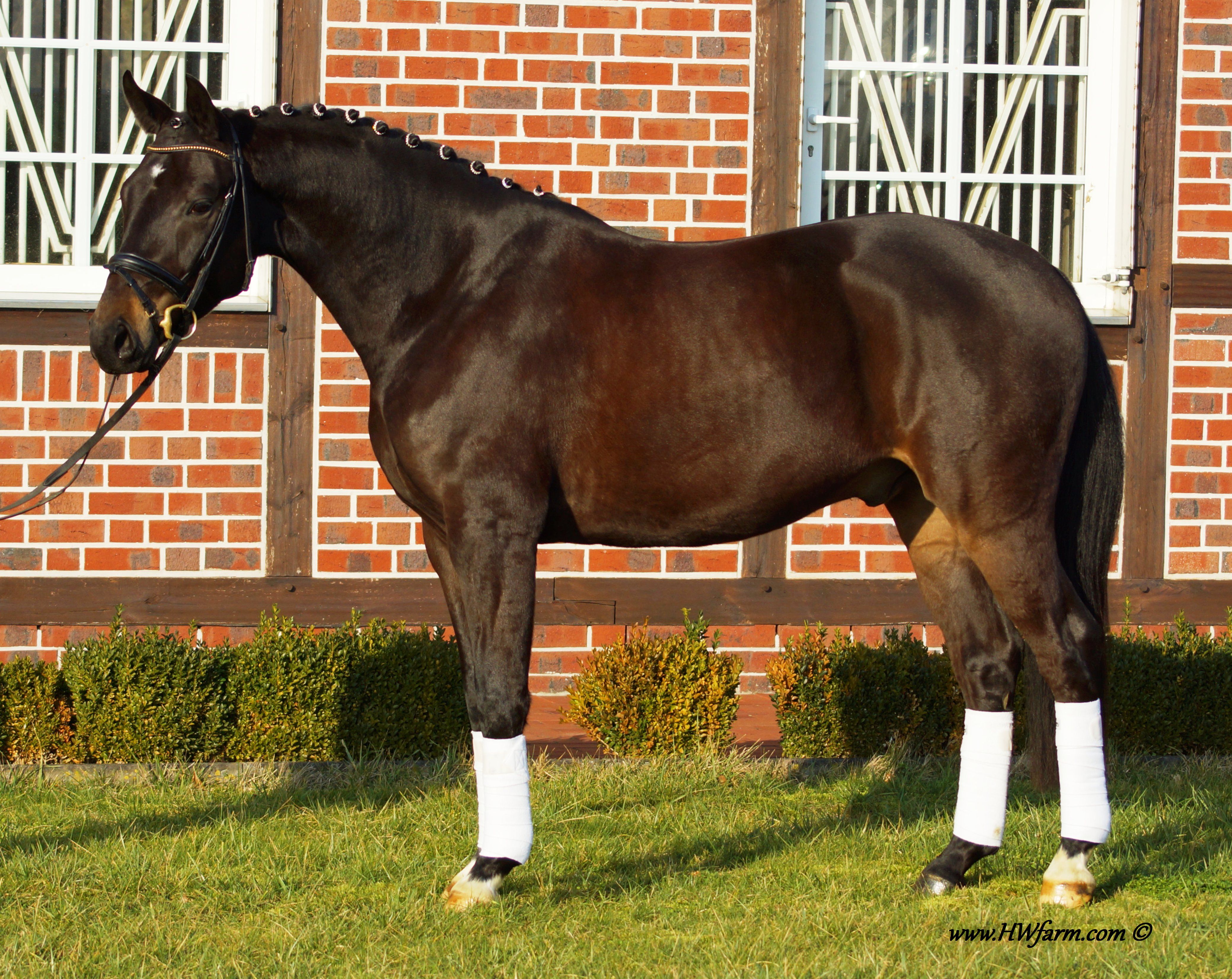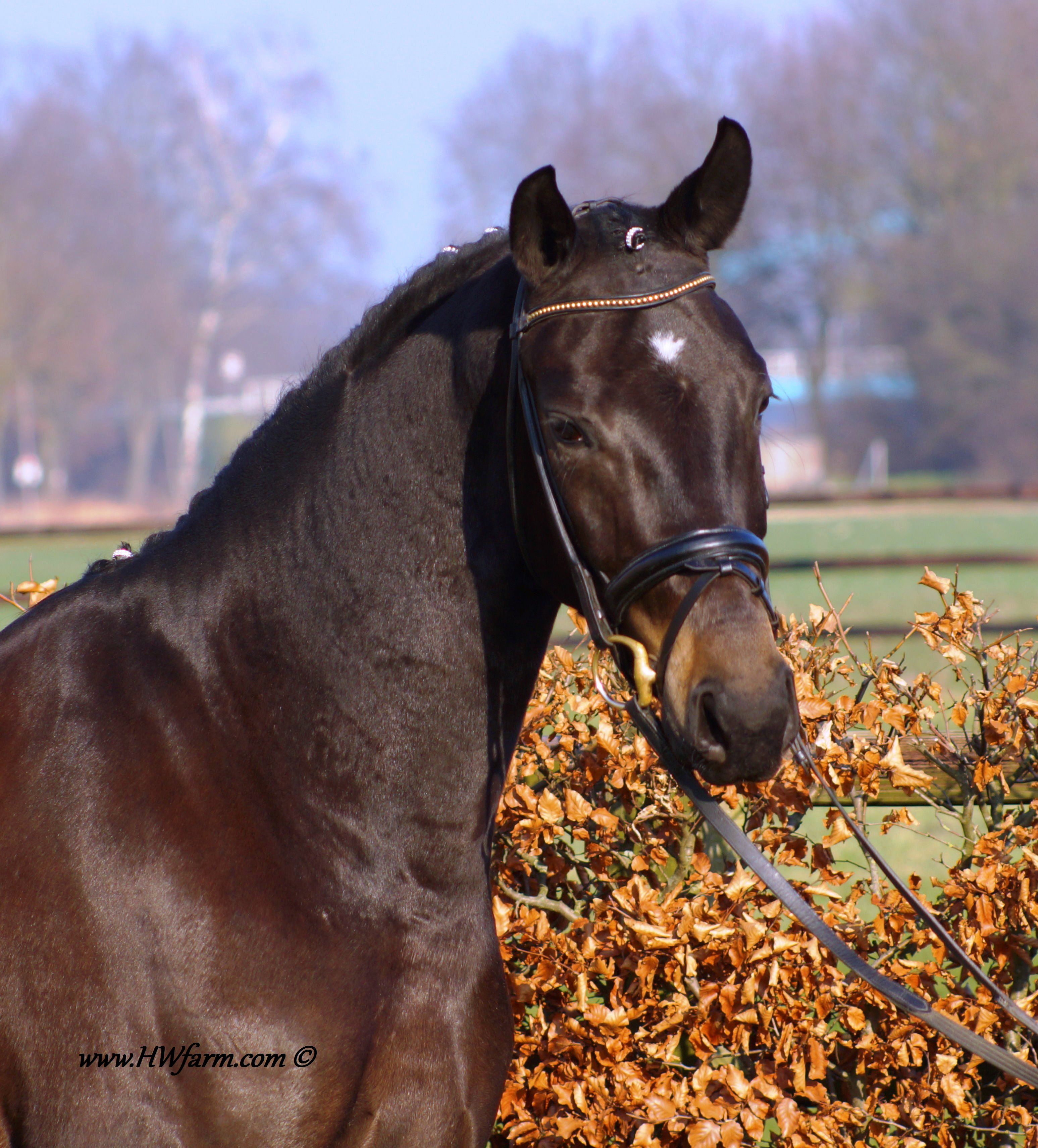 Duke HW, dark bay Oldenburg gelding by Delatio (De Niro/Rubinstein)/Stedinger/Donnerschlag, born in 2010, standing approximately 165 cm or 16.1 hands. Duke HW has an impressive pedigree, he is by the top stallion Delatio who combines world class blood lines of De Niro and Rubinstein. Delatio, with his chic black and brown appearance and its interesting bloodlines, is an asset for every dressage breeding. The father of Delatio, is the famous Elite Grand Prix dressage stallion De Niro. In 2000 he was declared the best new generation German Grand Prix horse. Winner of the German Championships of professional riders in Verden under Dolf-Dietram Keller. At 8 years of age he has already sired 19 licensed sons taking him to the forefront of today's breeding in Germany. Sire of Vice Federal champion in 2001 - Del MartinoDe Niro is a son of Donnerhall, who became a figurehead of the more recent Oldenburg breeding history, as double world champion and a top class hereditary transmitter of dressage horses. The dam Alicante , who was herself a successful dressage horse, had earlier produced the full-De Niro brother Dimension. The damsire Akzent II is regarded as one of the best procreators of rideability horses of modern day horse breeding. The pedigree is consolidated well by the strong performance thoroughbred Wiesenbaum xx and the siring legend Ferdinand. The damline is identical in its origins to that of the stallions Dewett (Zweibrücken state stallion), Gomez (Dillenburg state stallion), Laurion (private stallion Oldenburg ), Wapiti ( Celle state stallion) and Wogenbrecher (private stallion Hanover ). Laurion's full-sister, the international showjumping derby winner Landdame FRH/ Franke Sloothaak, also represents this dynasty. De Niro was one of the best jumping stallions at the 1995 Verden stallion market and ranged among the top at the 1996 stallion performance test in Adelheidsdorf, where he received the highest rideability score and became overall second in performance class I. De Niro has meanwhile won dressage competitions at the elementary and intermediate levels and qualified for the national dressage championships of 1998 and 1999. Merely aged seven, he already won Prix' St. Georges,Intermédiaire I and II as well as Grand Prix events during the 2000 season. In 2000, he was furthermore declared the best new generation Grand Prix horse and in 2001, he won the Championship of German Professional Riders, ridden by his trainer Dolf- Dietram Keller. This was followed in 2002, by wins in international Grand Prix events. De Niro was awarded the I-a main premium by the Oldenburg Association in 1997 as a result of his overwhelming breeding value rating. His progeny dominate the foal markets in Medingen, Vechta and Verden as evidenced by his son Day and Night, who was sold for the sum of DM 140,000 in Medingen in the year 2000. His sons are furthermore very popular at the approvals, demonstrated inter alia, by Der Lord, who went into the services of the Lower Saxon state stud of Celle and Divino de L, who is covering in Baden-Württemberg. Then there are De Vito, Donautanz , Depardieu (runnerup of the 2000 approval in Oldenburg and state champion in 2002) and Degas, who are stationed as loose box neighbours of their sire at the Hamstrup respectively Medingen stations, furthermore, Dionysos in Schleswig-Holstein, D-Online in Hesse, De Luxe in Saxony as well as Diego Velasquez and Dante Alighieri in Austria. The son Desert Moon, who is not being utilised in breeding yet, was third at the Hanoverian approval of 2001 and was the top lot of the 2001 stallion market at the knock-down price of DM 530,000. The likewise approved Donautanz came third in the 2002 federal championship of three-year old stallions. De Niro's daughter Die Weingard became I-b diamond ring mare at the 2000 Oldenburg Elite Mare Show in Rastede. In 2001, his daughter Edina unequivocally won the Oldenburg Elite Mare Show at the same location. Delatio's mother is the St. Pr. Stute Rubina, daughter of the famous Elite Grand Prix dressage stallion Rubinstein I. Rubinstein is known as a great improver for the breed. He consistently passes on his wonderful temperament and movement. The youngstock of Rubinstein are very popular with riders professional and amateur for their willingness to please. Delatio scored during his 70-day test in Adelheidsdorf (Ger) for all three gaits and rideability a 9. Delatio steps with much tact and flexibility, has a nice trot in which he shows a lot of rhythm and his canter is uphill stride. Delatio is successful in Prix St. George classes, under his rider Miranda Rongen. Delatio's offspring are in high demand, they have a nice appearance and can move very well. Duke HW's dam is by the famous stallion Stedinger. He is the radiant and unequivocal approval winner of the 2002 Oldenburg Stallion Days from our own breeding and rearing programme. He is blood impressed and large framed, with a formidable overall appearance and highly elastic in every respect. Stedinger is one of the best of his age class as regards his jumping performance. His sire Sandro Hit is regarded as the upholder of the Sacramento Song xx - Butes bloodline that established itself in Holstein and was disseminated in the warmblood breeds of Oldenburg and Hanover via Sandro. Sandro Hit was federal champion six-year old dressage horse in 1999 and world champion of the young horses in Arnheim. In the meantime, he has become one of the most sought after contemporary sires. The dam, Association premium mare Bold-Fantasy absolved an excellent mare performance test with a loose jumping score of 10.00, an extraneous rider score of 9.0 and an overall score of 8.67. She is a full-sister of the approved Lamar H, who is himself a successful dressage sports horse. The maternal bloodline is directly linked to all the epochal greats of Oldenburg breeding history through Landadel, Futuro and Adonis xx. The Oldenburg foundation line of the mare Besinda (by 