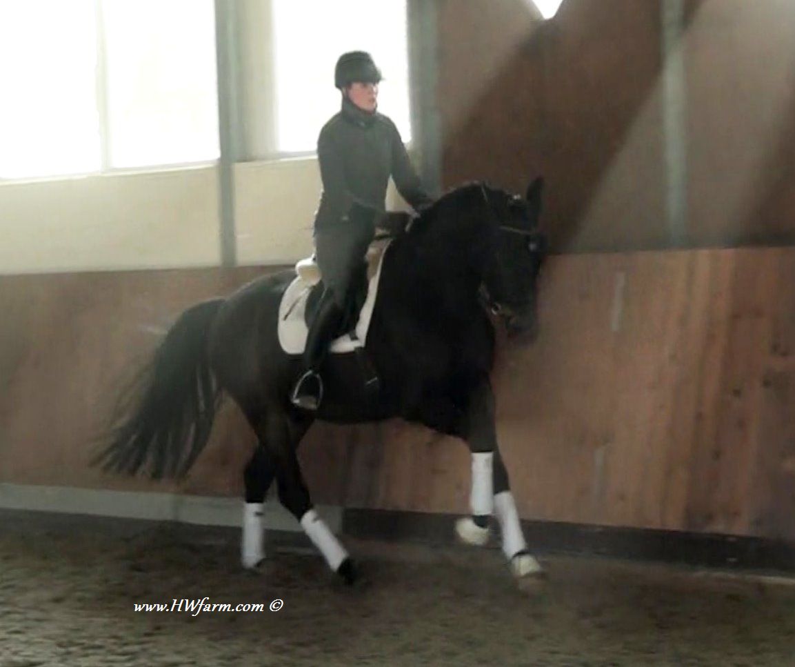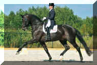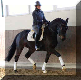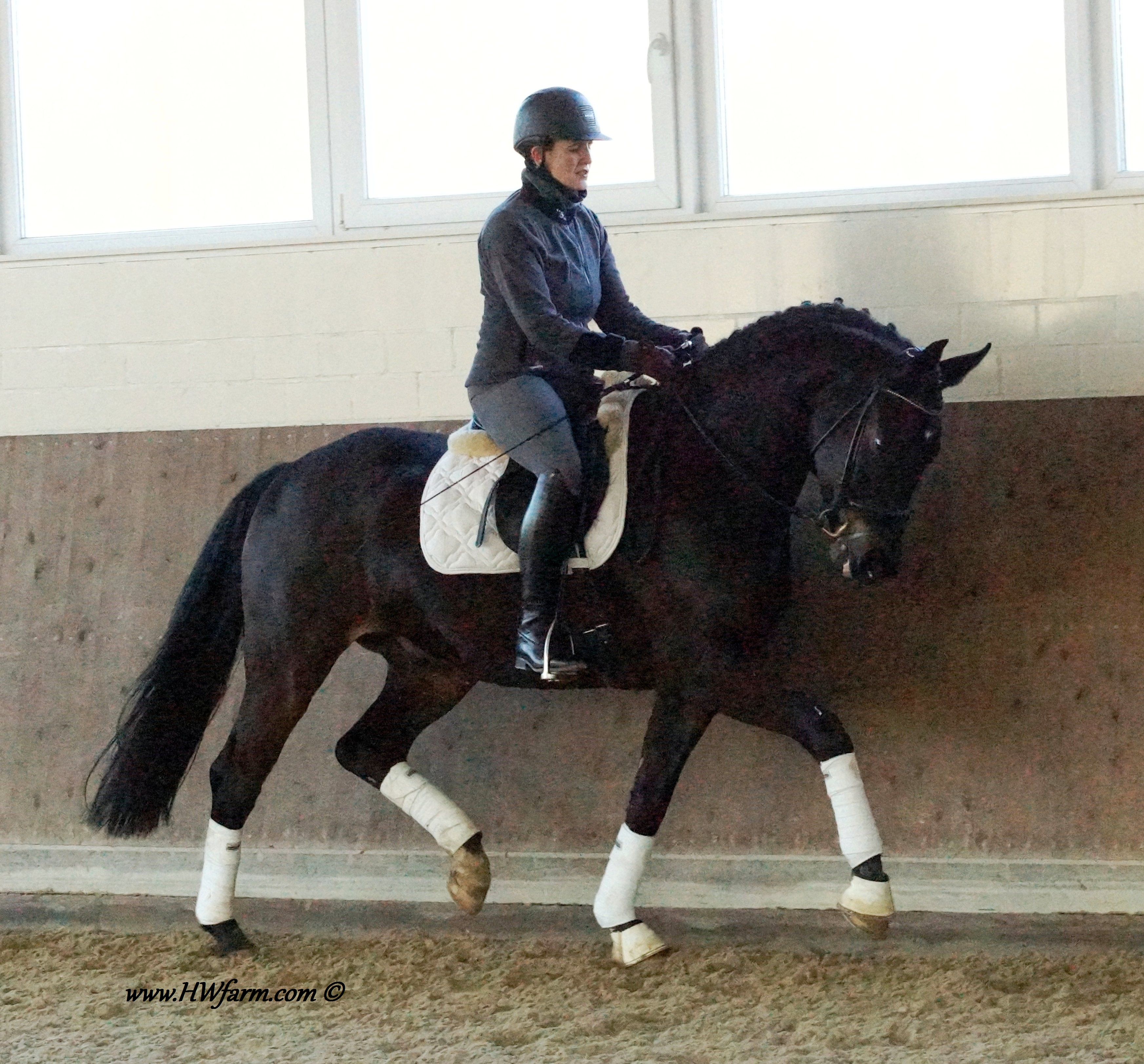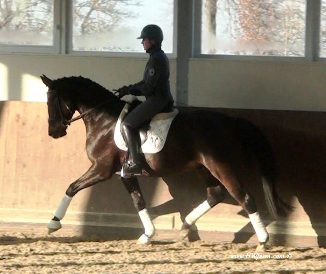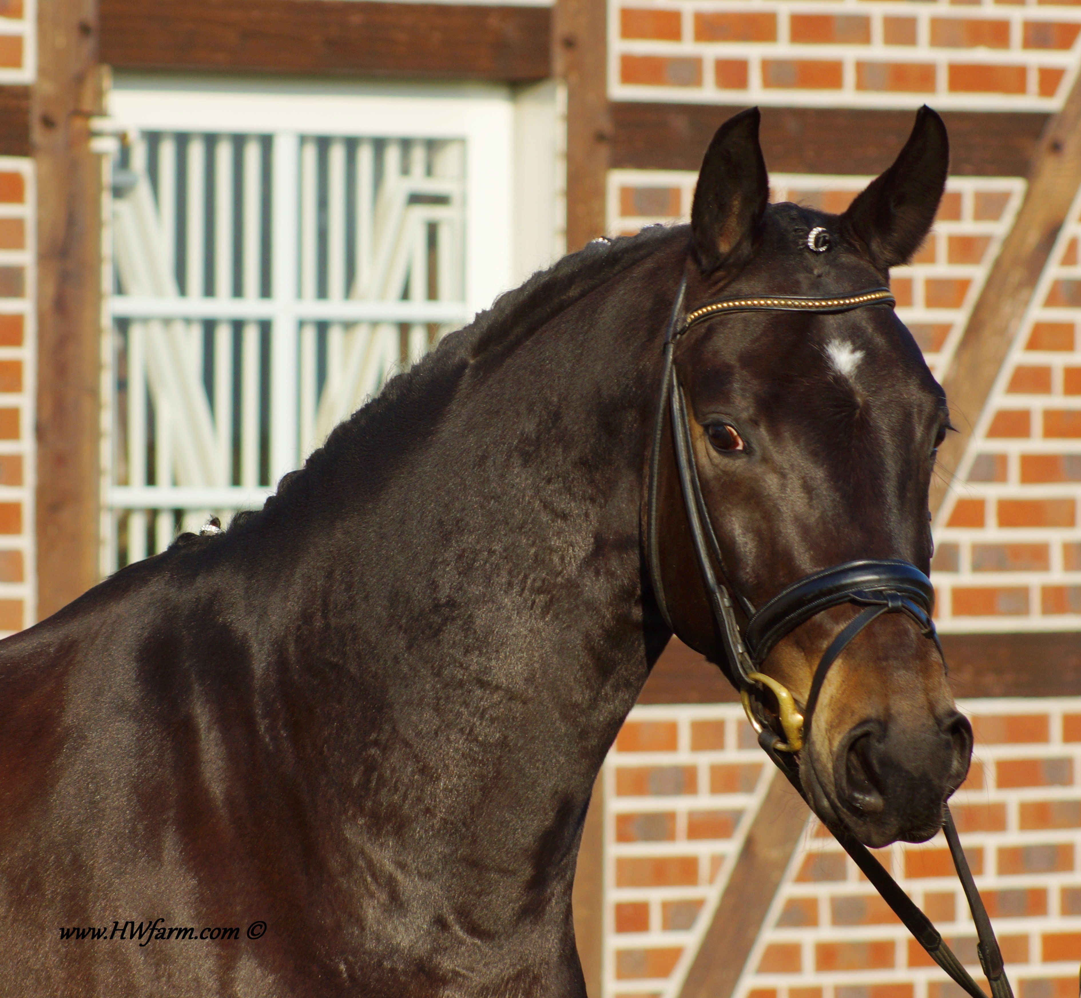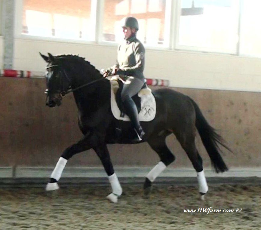 Duke HW, dark bay Oldenburg gelding by Delatio (De Niro/Rubinstein)/Stedinger/Donnerschlag, born in 2010, standing approximately 165 cm or 16.1 hands. Duke HW has an impressive pedigree, he is by the top stallion Delatio who combines world class blood lines of De Niro and Rubinstein. Delatio, with his chic black and brown appearance and its interesting bloodlines, is an asset for every dressage breeding. The father of Delatio, is the famous Elite Grand Prix dressage stallion De Niro. In 2000 he was declared the best new generation German Grand Prix horse. Winner of the German Championships of professional riders in Verden under Dolf-Dietram Keller. At 8 years of age he has already sired 19 licensed sons taking him to the forefront of today's breeding in Germany. Sire of Vice Federal champion in 2001 - Del MartinoDe Niro is a son of Donnerhall, who became a figurehead of the more recent Oldenburg breeding history, as double world champion and a top class hereditary transmitter of dressage horses. The dam Alicante , who was herself a successful dressage horse, had earlier produced the full-De Niro brother Dimension. The damsire Akzent II is regarded as one of the best procreators of rideability horses of modern day horse breeding. The pedigree is consolidated well by the strong performance thoroughbred Wiesenbaum xx and the siring legend Ferdinand. The damline is identical in its origins to that of the stallions Dewett (Zweibrücken state stallion), Gomez (Dillenburg state stallion), Laurion (private stallion Oldenburg ), Wapiti ( Celle state stallion) and Wogenbrecher (private stallion Hanover ). Laurion's full-sister, the international showjumping derby winner Landdame FRH/ Franke Sloothaak, also represents this dynasty. De Niro was one of the best jumping stallions at the 1995 Verden stallion market and ranged among the top at the 1996 stallion performance test in Adelheidsdorf, where he received the highest rideability score and became overall second in performance class I. De Niro has meanwhile won dressage competitions at the elementary and intermediate levels and qualified for the national dressage championships of 1998 and 1999. Merely aged seven, he already won Prix' St. Georges,Intermédiaire I and II as well as Grand Prix events during the 2000 season. In 2000, he was furthermore declared the best new generation Grand Prix horse and in 2001, he won the Championship of German Professional Riders, ridden by his trainer Dolf- Dietram Keller. This was followed in 2002, by wins in international Grand Prix events. De Niro was awarded the I-a main premium by the Oldenburg Association in 1997 as a result of his overwhelming breeding value rating. His progeny dominate the foal markets in Medingen, Vechta and Verden as evidenced by his son Day and Night, who was sold for the sum of DM 140,000 in Medingen in the year 2000. His sons are furthermore very popular at the approvals, demonstrated inter alia, by Der Lord, who went into the services of the Lower Saxon state stud of Celle and Divino de L, who is covering in Baden-Württemberg. Then there are De Vito, Donautanz , Depardieu (runnerup of the 2000 approval in Oldenburg and state champion in 2002) and Degas, who are stationed as loose box neighbours of their sire at the Hamstrup respectively Medingen stations, furthermore, Dionysos in Schleswig-Holstein, D-Online in Hesse, De Luxe in Saxony as well as Diego Velasquez and Dante Alighieri in Austria. The son Desert Moon, who is not being utilised in breeding yet, was third at the Hanoverian approval of 2001 and was the top lot of the 2001 stallion market at the knock-down price of DM 530,000. The likewise approved Donautanz came third in the 2002 federal championship of three-year old stallions. De Niro's daughter Die Weingard became I-b diamond ring mare at the 2000 Oldenburg Elite Mare Show in Rastede. In 2001, his daughter Edina unequivocally won the Oldenburg Elite Mare Show at the same location. Delatio's mother is the St. Pr. Stute Rubina, daughter of the famous Elite Grand Prix dressage stallion Rubinstein I. Rubinstein is known as a great improver for the breed. He consistently passes on his wonderful temperament and movement. The youngstock of Rubinstein are very popular with riders professional and amateur for their willingness to please. Delatio scored during his 70-day test in Adelheidsdorf (Ger) for all three gaits and rideability a 9. Delatio steps with much tact and flexibility, has a nice trot in which he shows a lot of rhythm and his canter is uphill stride. Delatio is successful in Prix St. George classes, under his rider Miranda Rongen. Delatio's offspring are in high demand, they have a nice appearance and can move very well. Duke HW's dam is by the famous stallion Stedinger. He is the radiant and unequivocal approval winner of the 2002 Oldenburg Stallion Days from our own breeding and rearing programme. He is blood impressed and large framed, with a formidable overall appearance and highly elastic in every respect. Stedinger is one of the best of his age class as regards his jumping performance. His sire Sandro Hit is regarded as the upholder of the Sacramento Song xx - Butes bloodline that established itself in Holstein and was disseminated in the warmblood breeds of Oldenburg and Hanover via Sandro. Sandro Hit was federal champion six-year old dressage horse in 1999 and world champion of the young horses in Arnheim. In the meantime, he has become one of the most sought after contemporary sires. The dam, Association premium mare Bold-Fantasy absolved an excellent mare performance test with a loose jumping score of 10.00, an extraneous rider score of 9.0 and an overall score of 8.67. She is a full-sister of the approved Lamar H, who is himself a successful dressage sports horse. The maternal bloodline is directly linked to all the epochal greats of Oldenburg breeding history through Landadel, Futuro and Adonis xx. The Oldenburg foundation line of the mare Besinda (by 