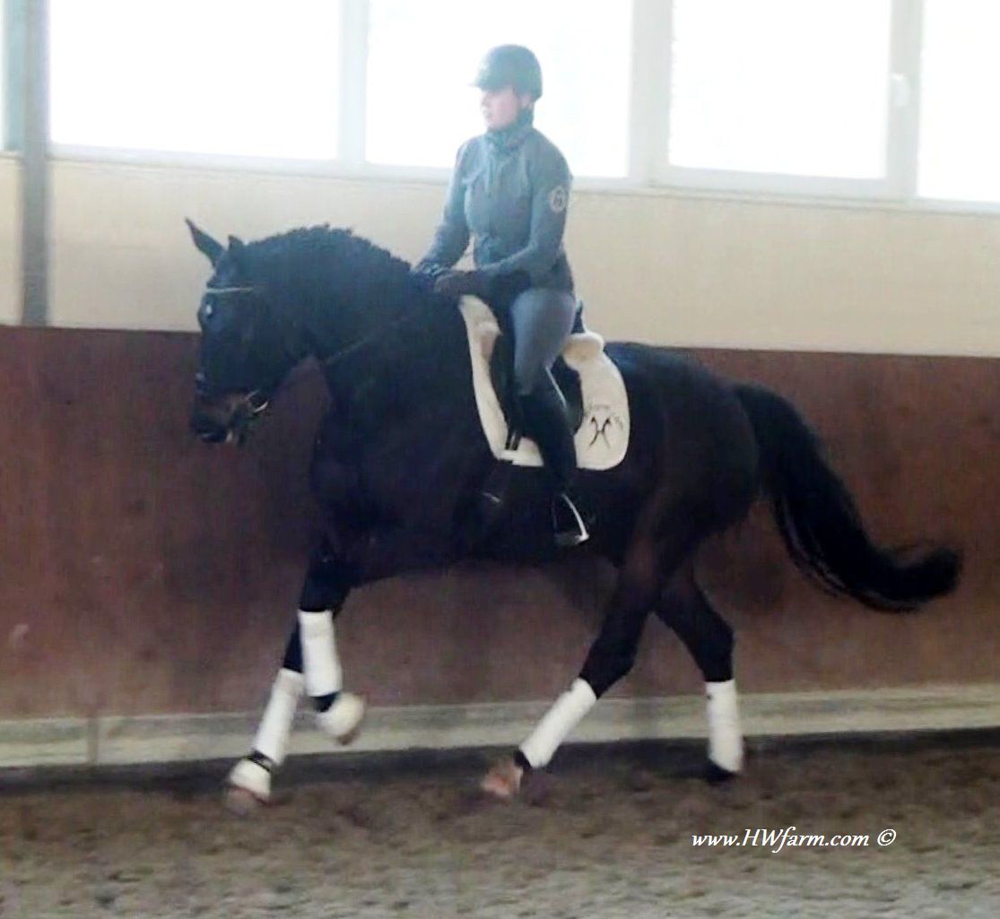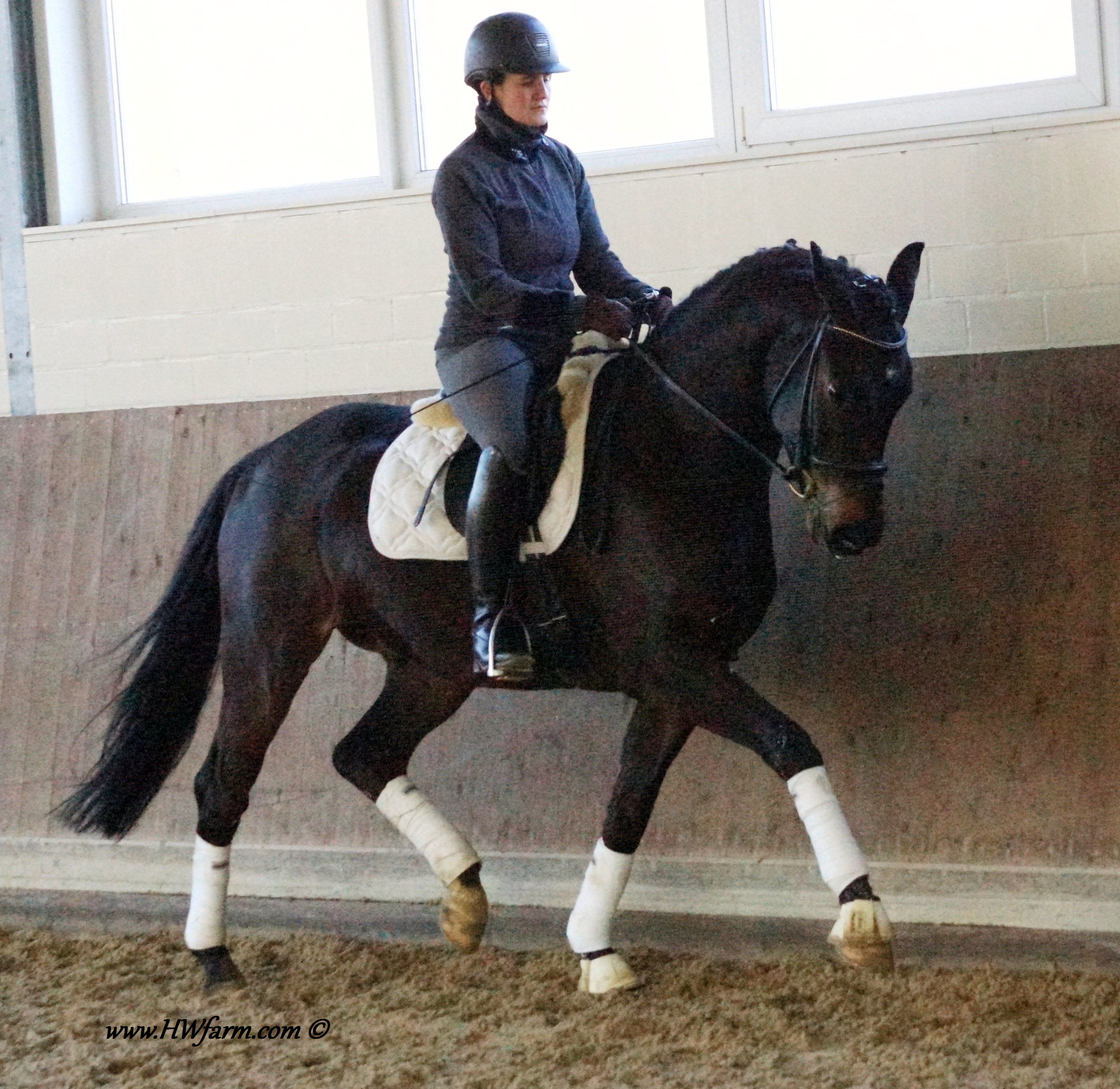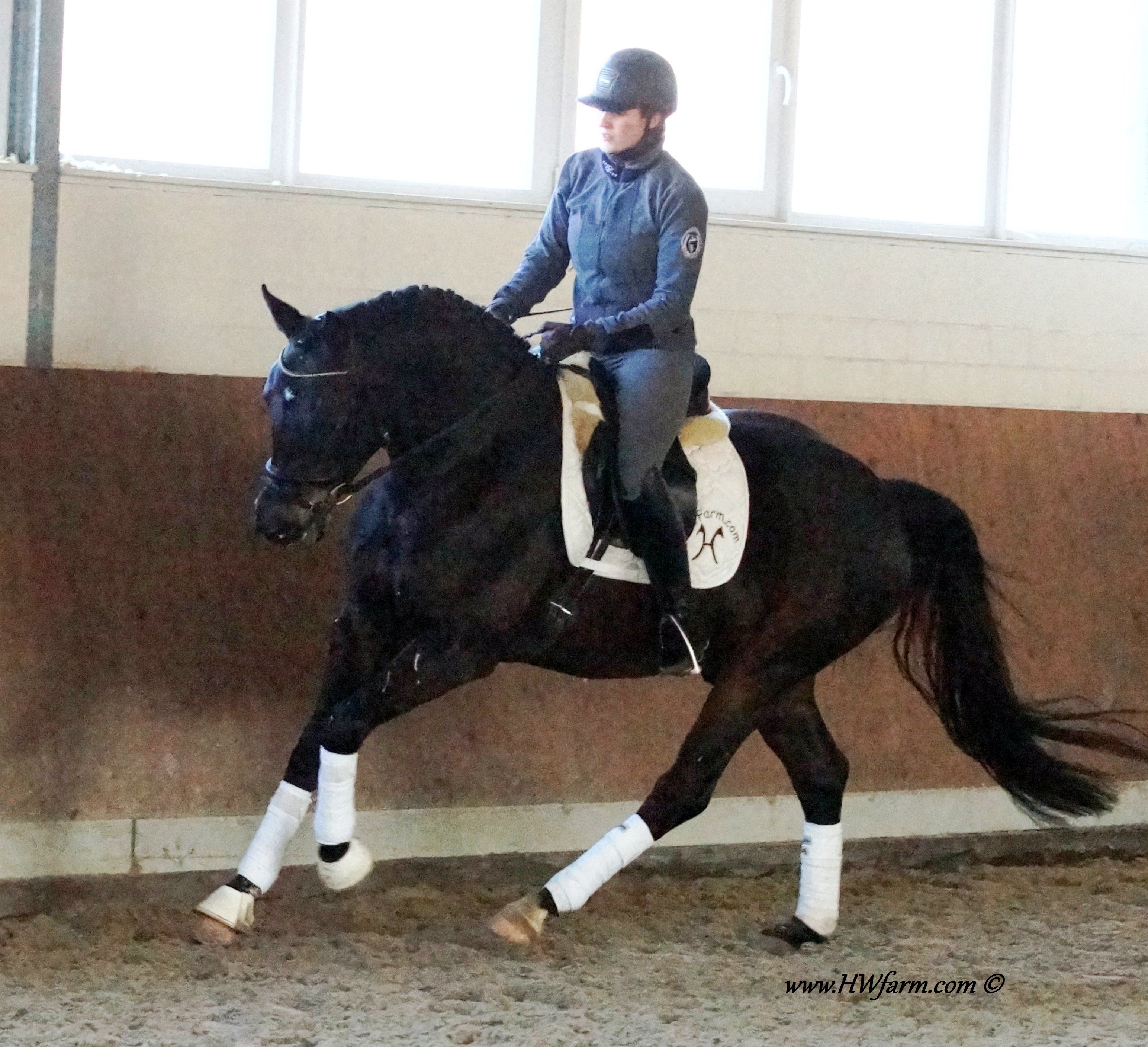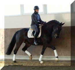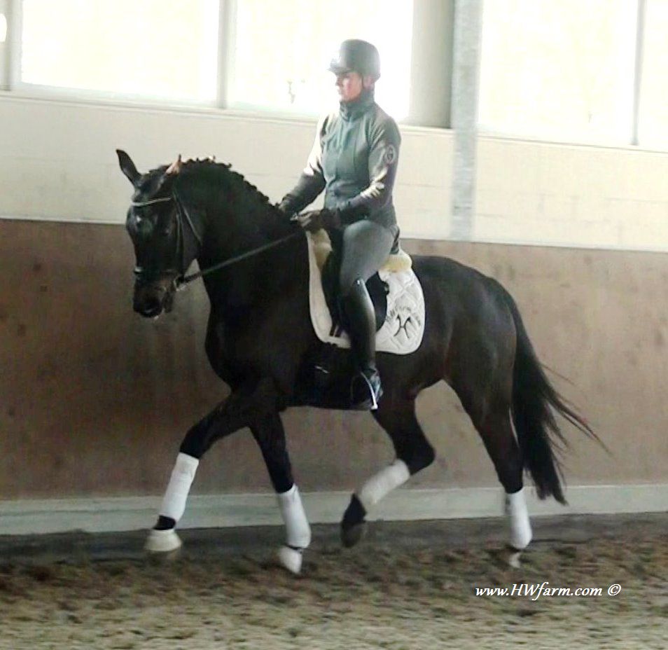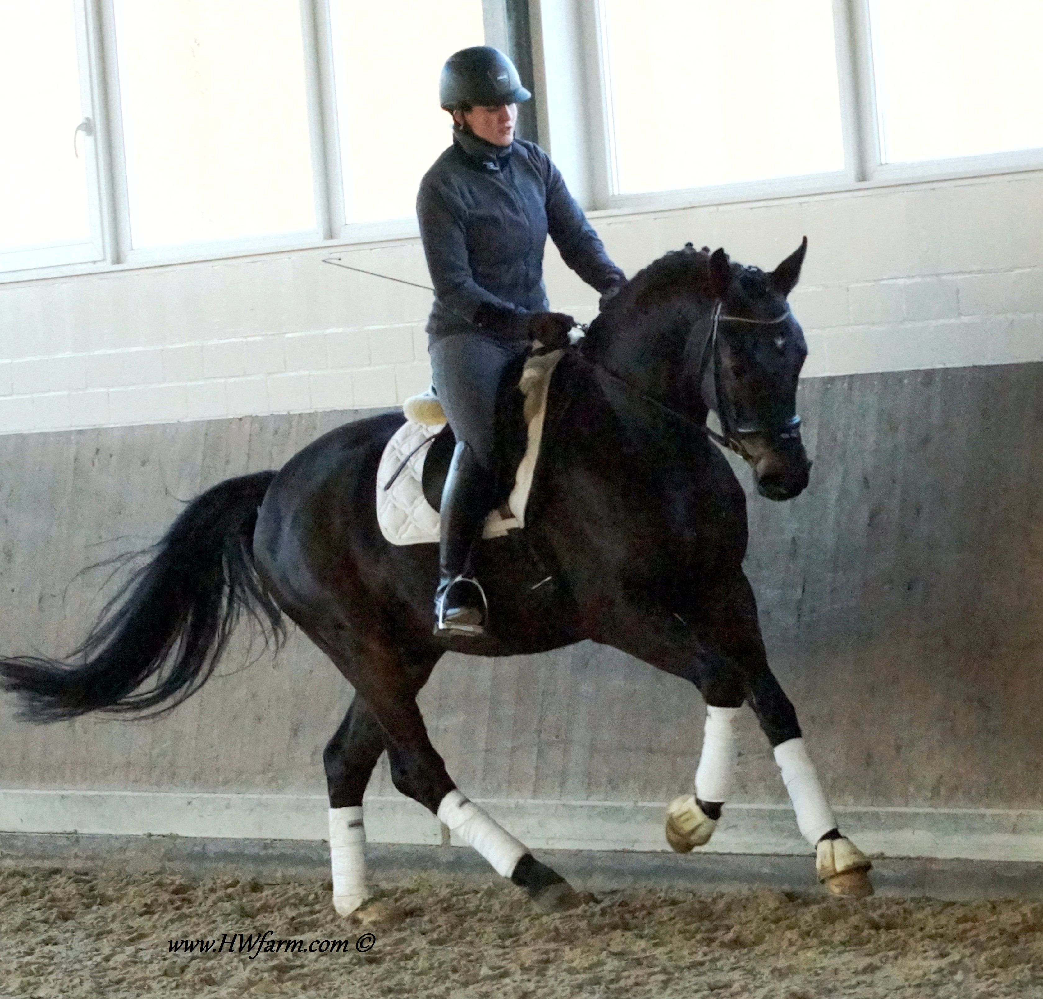Duke HW, dark bay Oldenburg gelding by Delatio (De Niro/Rubinstein)/Stedinger/Donnerschlag, born in 2010, standing approximately 165 cm or 16.1 hands. Duke HW has an impressive pedigree, he is by the top stallion Delatio who combines world class blood lines of De Niro and Rubinstein. Delatio, with his chic black and brown appearance and its interesting bloodlines, is an asset for every dressage breeding. The father of Delatio, is the famous Elite Grand Prix dressage stallion De Niro. In 2000 he was declared the best new generation German Grand Prix horse. Winner of the German Championships of professional riders in Verden under Dolf-Dietram Keller. At 8 years of age he has already sired 19 licensed sons taking him to the forefront of today's breeding in Germany. Sire of Vice Federal champion in 2001 - Del MartinoDe Niro is a son of Donnerhall, who became a figurehead of the more recent Oldenburg breeding history, as double world champion and a top class hereditary transmitter of dressage horses. The dam Alicante , who was herself a successful dressage horse, had earlier produced the full-De Niro brother Dimension. The damsire Akzent II is regarded as one of the best procreators of rideability horses of modern day horse breeding. The pedigree is consolidated well by the strong performance thoroughbred Wiesenbaum xx and the siring legend Ferdinand. The damline is identical in its origins to that of the stallions Dewett (Zweibrücken state stallion), Gomez (Dillenburg state stallion), Laurion (private stallion Oldenburg ), Wapiti ( Celle state stallion) and Wogenbrecher (private stallion Hanover ). Laurion's full-sister, the international showjumping derby winner Landdame FRH/ Franke Sloothaak, also represents this dynasty. De Niro was one of the best jumping stallions at the 1995 Verden stallion market and ranged among the top at the 1996 stallion performance test in Adelheidsdorf, where he received the highest rideability score and became overall second in performance class I. De Niro has meanwhile won dressage competitions at the elementary and intermediate levels and qualified for the national dressage championships of 1998 and 1999. Merely aged seven, he already won Prix' St. Georges,Intermédiaire I and II as well as Grand Prix events during the 2000 season. In 2000, he was furthermore declared the best new generation Grand Prix horse and in 2001, he won the Championship of German Professional Riders, ridden by his trainer Dolf- Dietram Keller. This was followed in 2002, by wins in international Grand Prix events. De Niro was awarded the I-a main premium by the Oldenburg Association in 1997 as a result of his overwhelming breeding value rating. His progeny dominate the foal markets in Medingen, Vechta and Verden as evidenced by his son Day and Night, who was sold for the sum of DM 140,000 in Medingen in the year 2000. His sons are furthermore very popular at the approvals, demonstrated inter alia, by Der Lord, who went into the services of the Lower Saxon state stud of Celle and Divino de L, who is covering in Baden-Württemberg. Then there are De Vito, Donautanz , Depardieu (runnerup of the 2000 approval in Oldenburg and state champion in 2002) and Degas, who are stationed as loose box neighbours of their sire at the Hamstrup respectively Medingen stations, furthermore, Dionysos in Schleswig-Holstein, D-Online in Hesse, De Luxe in Saxony as well as Diego Velasquez and Dante Alighieri in Austria. The son Desert Moon, who is not being utilised in breeding yet, was third at the Hanoverian approval of 2001 and was the top lot of the 2001 stallion market at the knock-down price of DM 530,000. The likewise approved Donautanz came third in the 2002 federal championship of three-year old stallions. De Niro's daughter Die Weingard became I-b diamond ring mare at the 2000 Oldenburg Elite Mare Show in Rastede. In 2001, his daughter Edina unequivocally won the Oldenburg Elite Mare Show at the same location. Delatio's mother is the St. Pr. Stute Rubina, daughter of the famous Elite Grand Prix dressage stallion Rubinstein I. Rubinstein is known as a great improver for the breed. He consistently passes on his wonderful temperament and movement. The youngstock of Rubinstein are very popular with riders professional and amateur for their willingness to please. Delatio scored during his 70-day test in Adelheidsdorf (Ger) for all three gaits and rideability a 9. Delatio steps with much tact and flexibility, has a nice trot in which he shows a lot of rhythm and his canter is uphill stride. Delatio is successful in Prix St. George classes, under his rider Miranda Rongen. Delatio's offspring are in high demand, they have a nice appearance and can move very well. Duke HW's dam is by the famous stallion Stedinger. He is the radiant and unequivocal approval winner of the 2002 Oldenburg Stallion Days from our own breeding and rearing programme. He is blood impressed and large framed, with a formidable overall appearance and highly elastic in every respect. Stedinger is one of the best of his age class as regards his jumping performance. His sire Sandro Hit is regarded as the upholder of the Sacramento Song xx - Butes bloodline that established itself in Holstein and was disseminated in the warmblood breeds of Oldenburg and Hanover via Sandro. Sandro Hit was federal champion six-year old dressage horse in 1999 and world champion of the young horses in Arnheim. In the meantime, he has become one of the most sought after contemporary sires. The dam, Association premium mare Bold-Fantasy absolved an excellent mare performance test with a loose jumping score of 10.00, an extraneous rider score of 9.0 and an overall score of 8.67. She is a full-sister of the approved Lamar H, who is himself a successful dressage sports horse. The maternal bloodline is directly linked to all the epochal greats of Oldenburg breeding history through Landadel, Futuro and Adonis xx. The Oldenburg foundation line of the mare Besinda (by 