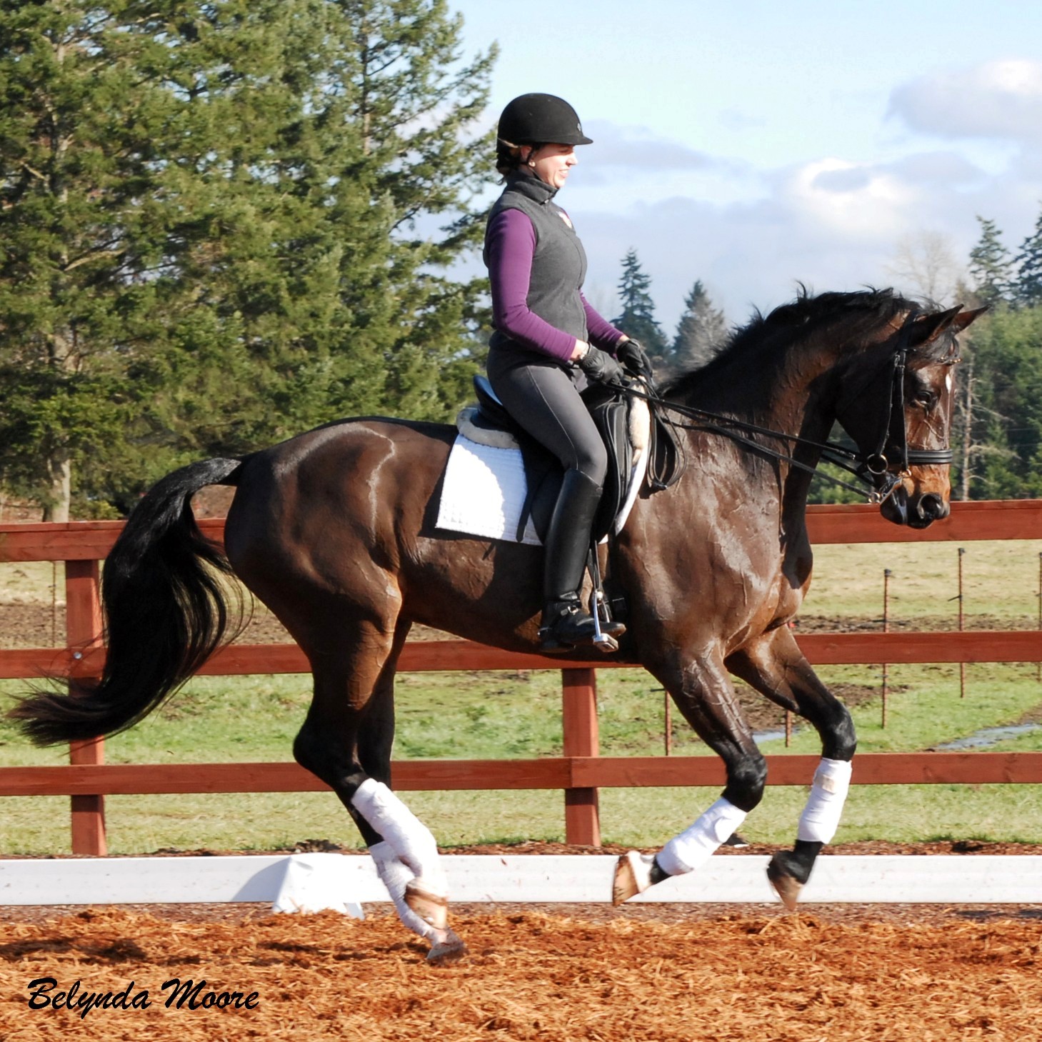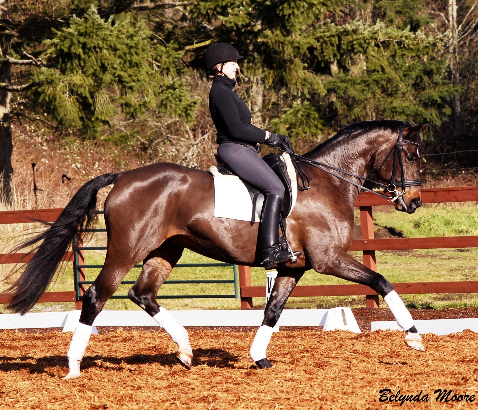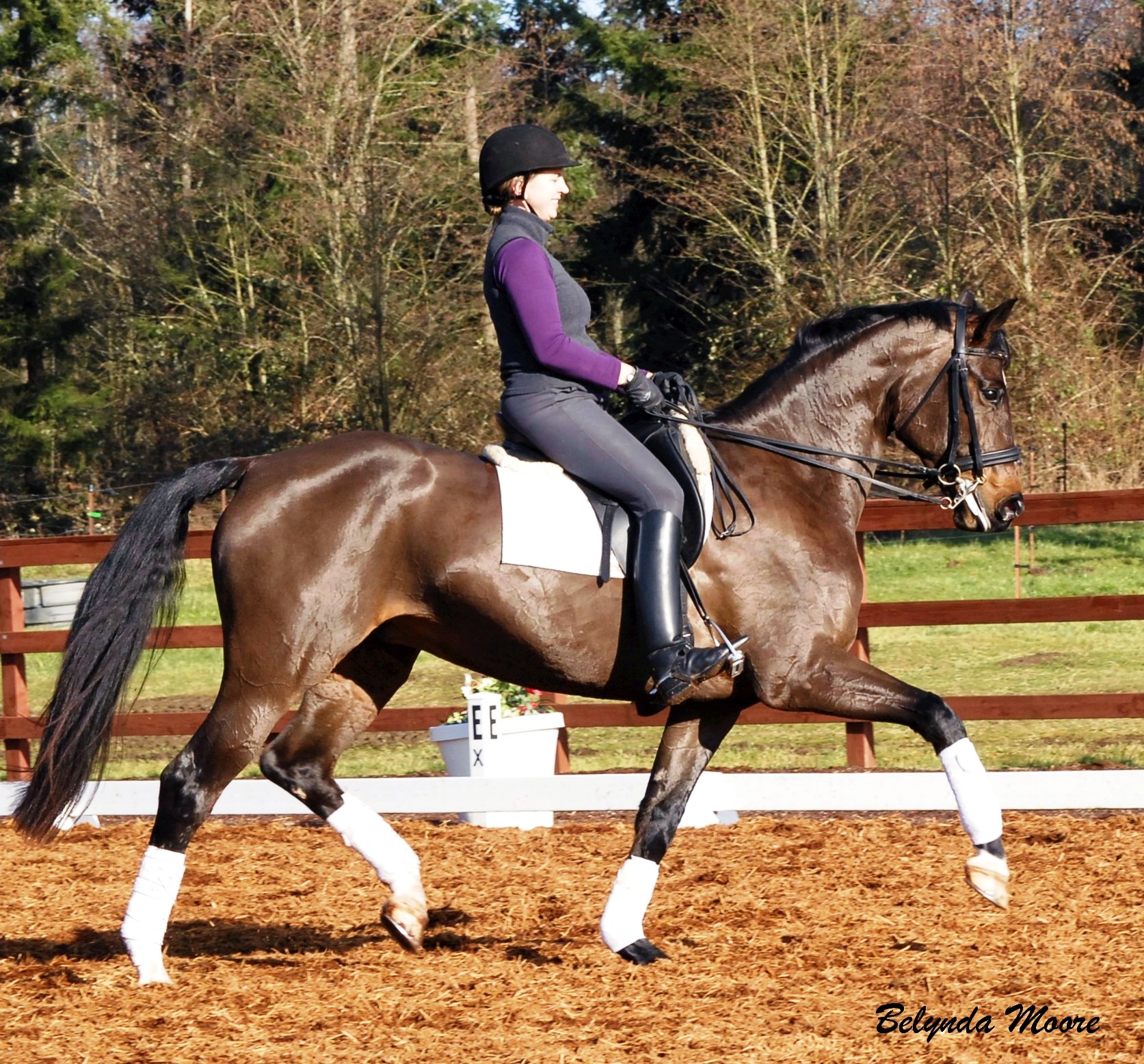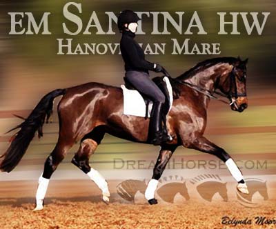 her Elite Candidate requirements in October 2008 in EM Santina HW, is a super elastic and fancy horse and she is a true STAR! She shows successfully and placed/won with a young rider in her saddle. No lunging, no fuzz, just tacked up and off to the ring to compete and to show how competitive she is. She scored already up to 71 % in her young life and collected blue ribbons left and right. She acts like a real pro, loves to travel and to work in new places. She is reliable and confident and very mature for her age. She keeps her cool during the tests, no matter if there is heavy rain on a metal roof or many other horses coming and going where she trains and shows. Good breeding shows, this mare is proof, that you can get the best horses out of super bloodlines. She is now winning at 4th level with a bright future and there is no limit for a horse like her. She will just turn out like her whole family, showing PSG at the age of 7! She for sure has all it takes to be successful in the dressage world and to go up the levels. This dream combination between Sandro Hit and Lanthan will catch your eye and attention due to her beauty and elegance. She is very elastic and her movement is truly exceptional and ideal. Lateral work is easy for her and the transitions are uphill and fluent. She is solid and winning at 4th level already and will do well at PSG in no time. She carries herself well on her hind legs, with outstanding freedom in the shoulder and the special "look at me" attitude. She lifts her shoulders and her canter is super uphill, well collected and so much fun to ride. This is a mare with champion quality. Always awake, cuddly and friendly as well as easy to handle. She is the type that's able to catch the onlookers attention. She is nicely forward without being hot. She loves to learn, no matter if it is dressage or jumping and she goes out on trail rides and is an angel all around. She tries very hard to please her handler and rider and is as uncomplicated as a mare can be. Santina HW has a super character. She is sweet, comes with lots of chrome and you'll fall in love with her in no time. She is a mare for the dressage rider with the biggest ambitions. Santina HW is vet checked with super x-rays! Please contact professional trainer Jennifer Schrader-Williams at (253) 381-2811 or email her at: dressagespecialties@yahoo.com. Or contact Irene at: Irene@HWfarm.com 239-772-7722