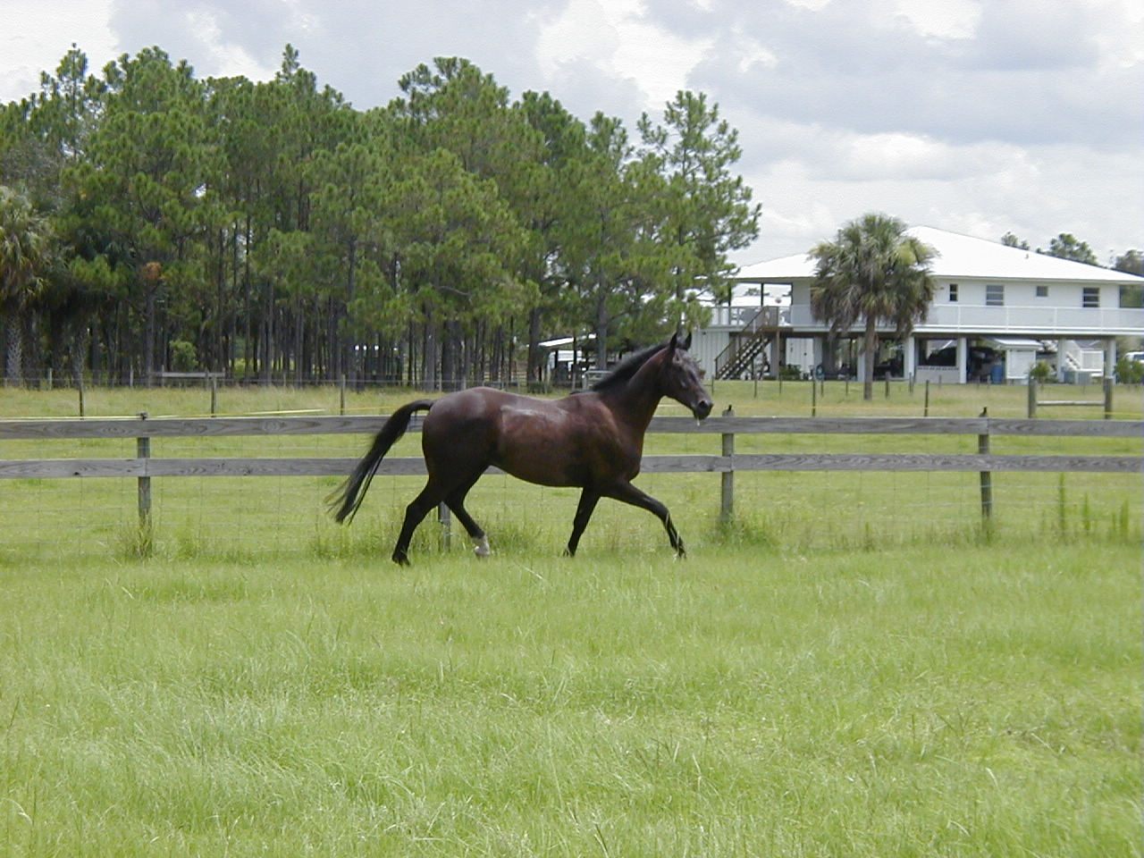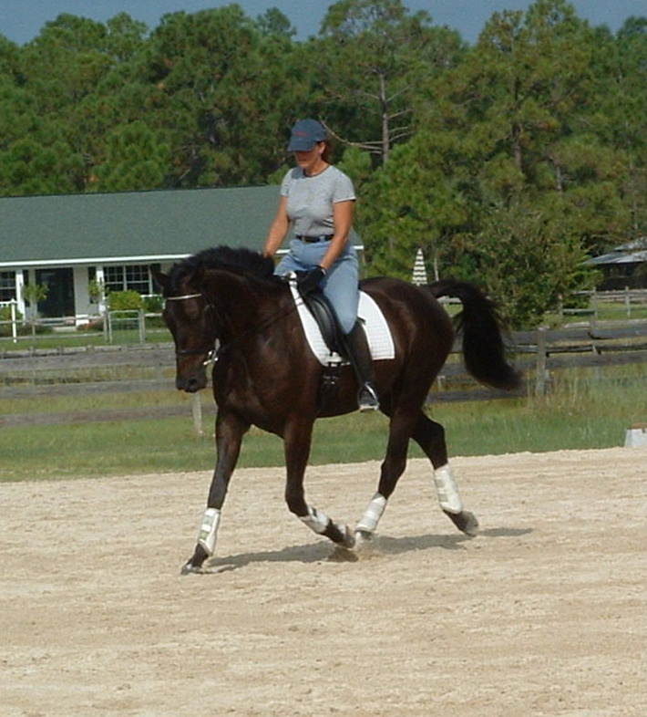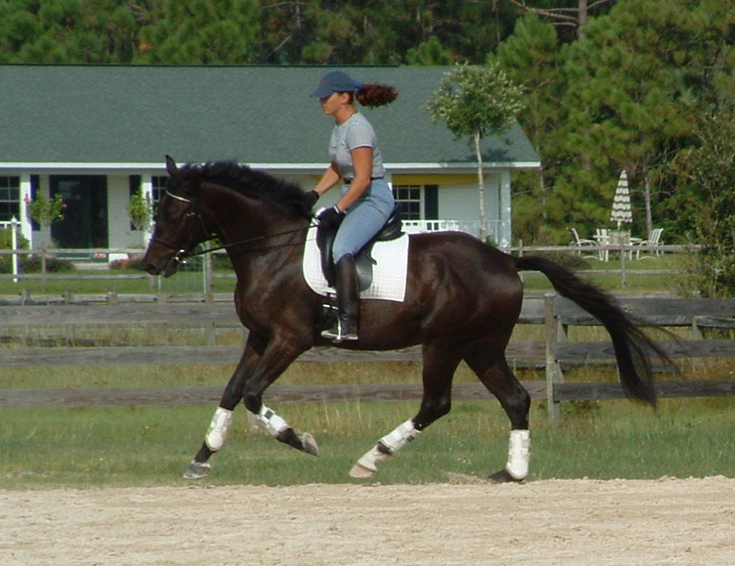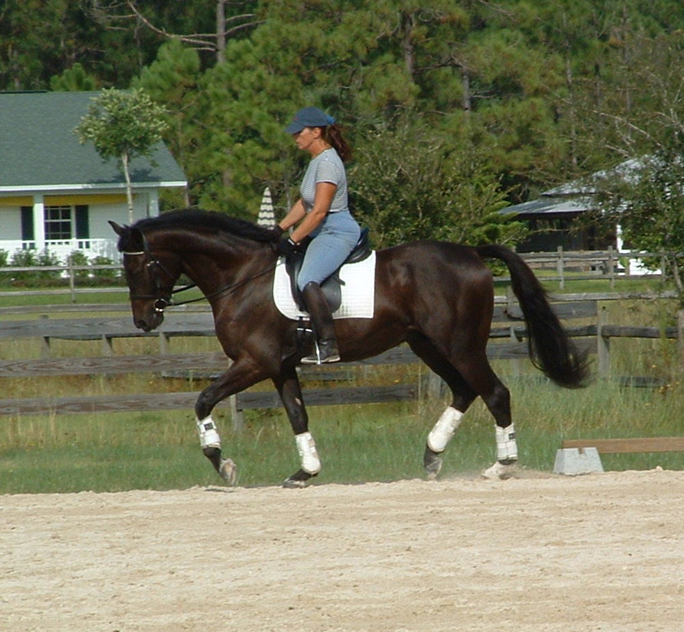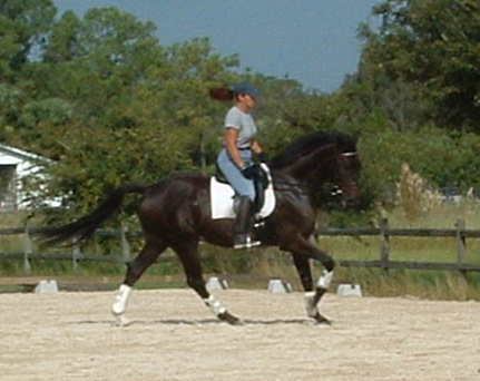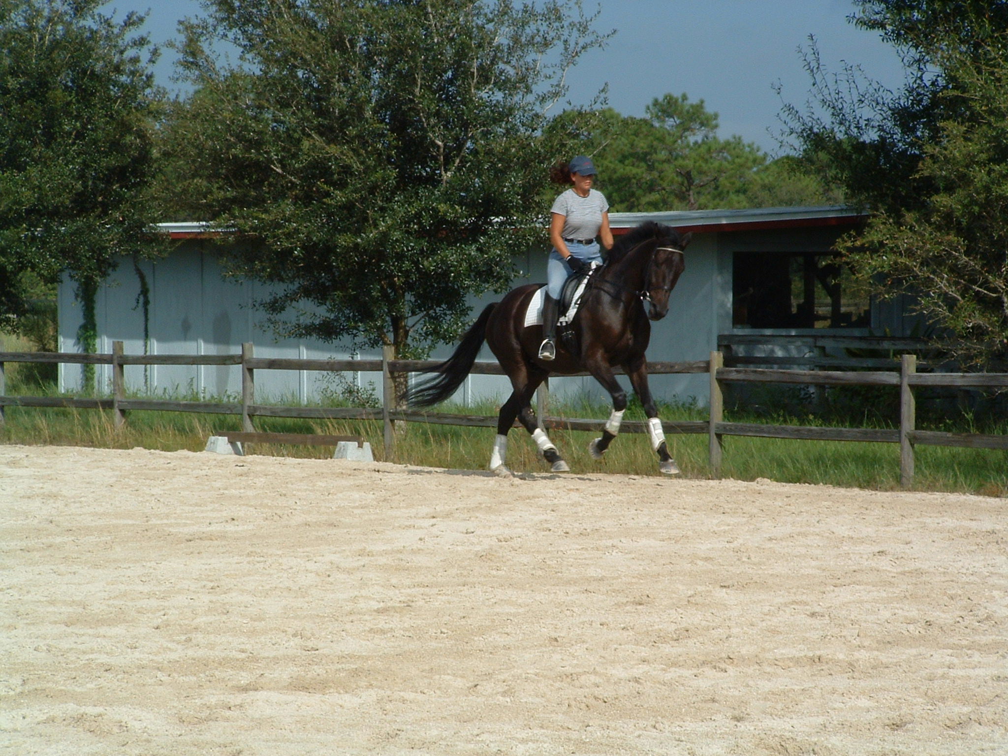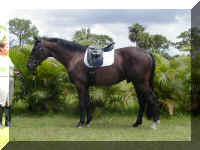 This handsome young Hanoverian gelding is the perfect combination of stellar good looks and incredible uphill movement. Falki currently stands 16.2 and has a few good growing years left. At just 4 years old (born Feb. 2, 2000), this dark bay Falkland/Prince Thatch son is already demonstrating the athletic prowess of his father with the sensitivity of his dam's sire. He was born with the natural balance in the canter that will take you straight to the FEI levels plus his expressive trot will make a statement of it's own. Falki clips, bathes, loads, and stands for the blacksmith. He also loves to have his face rubbed with a towel after work!