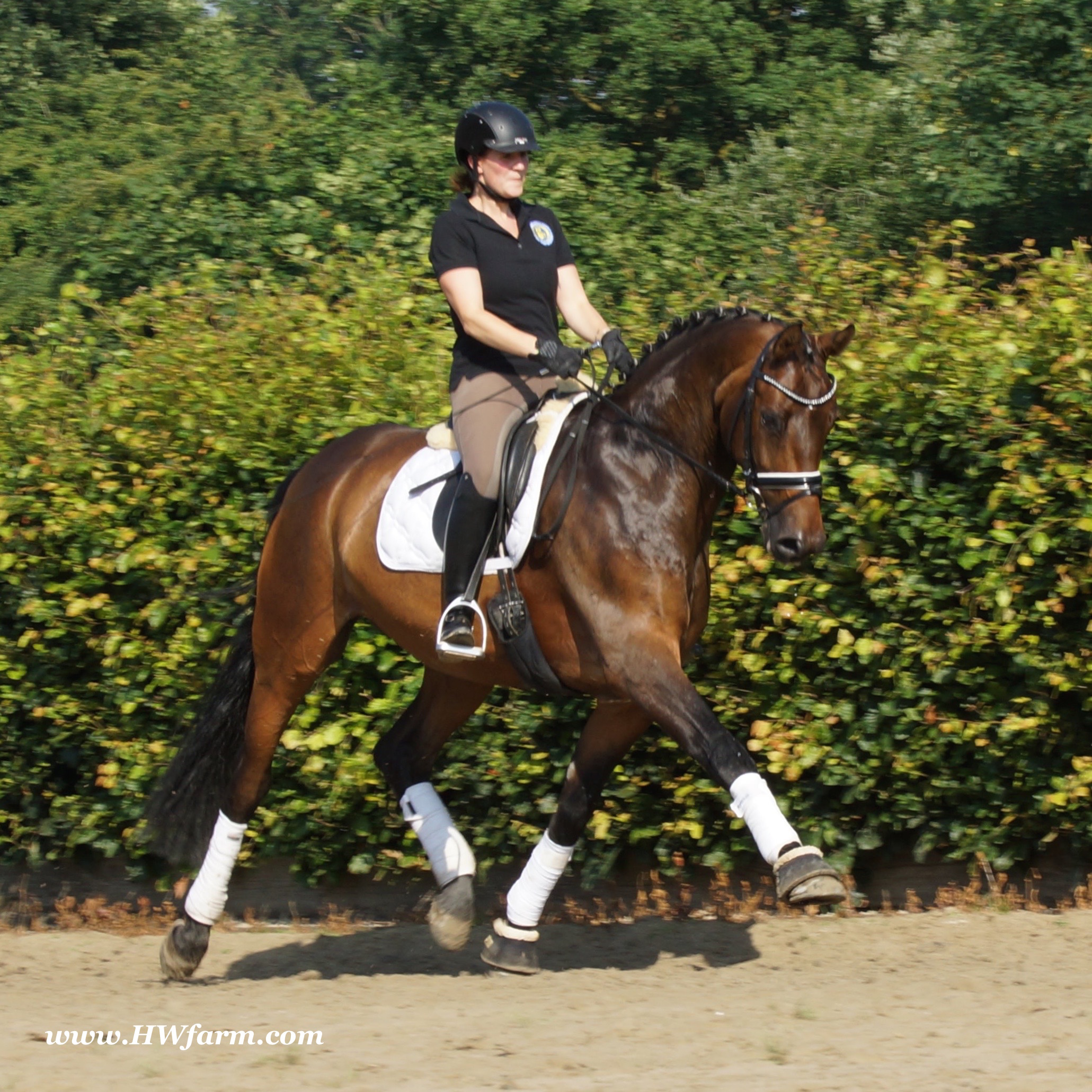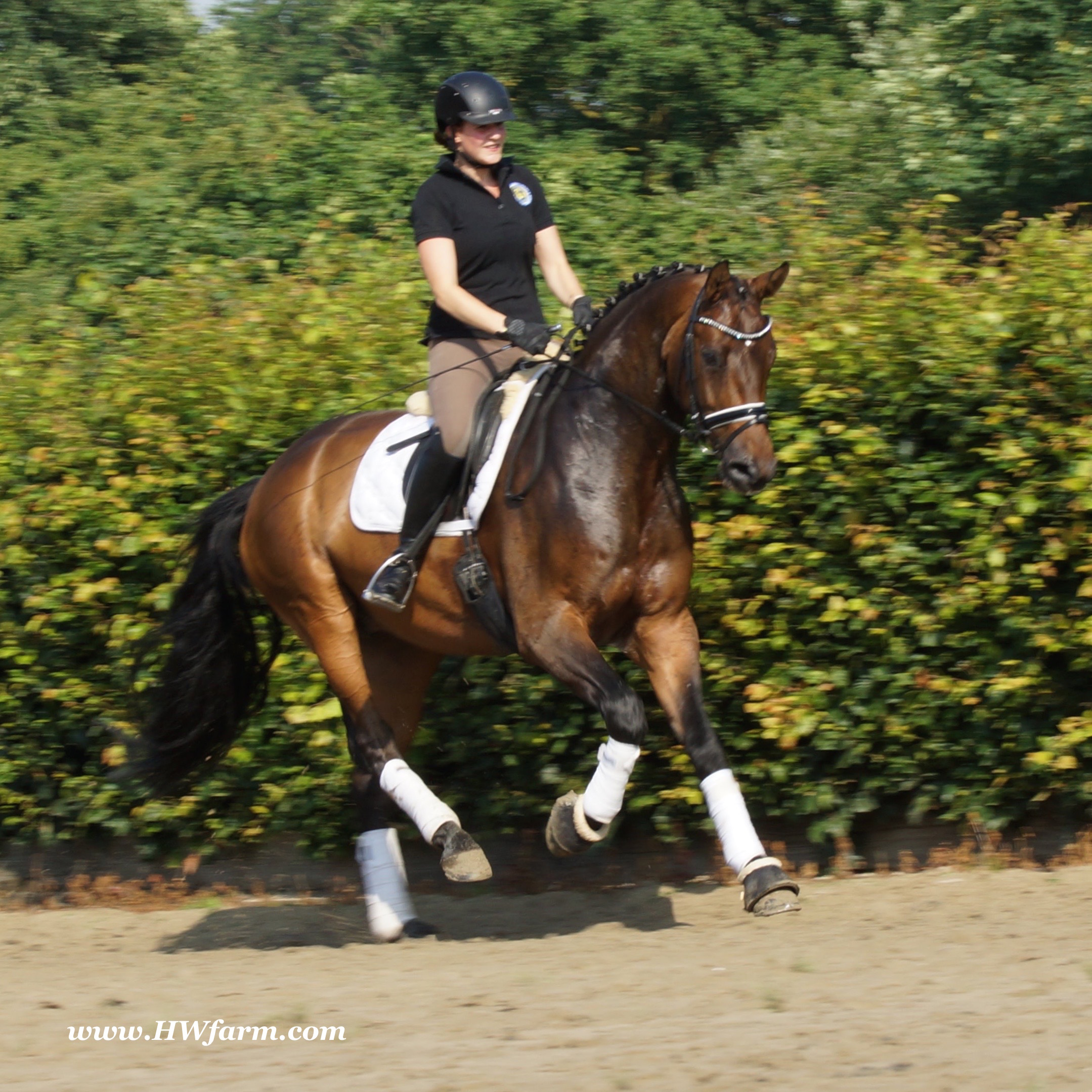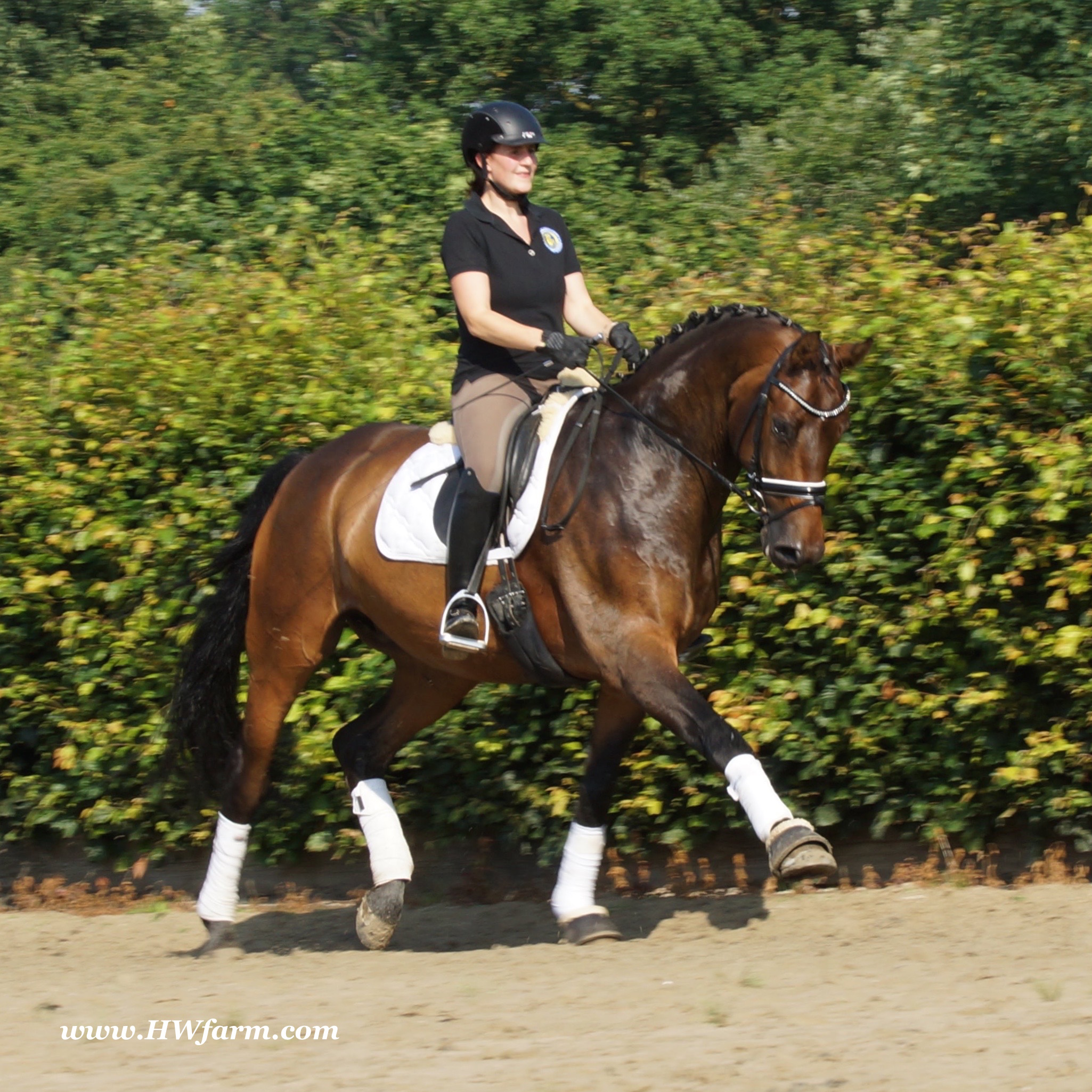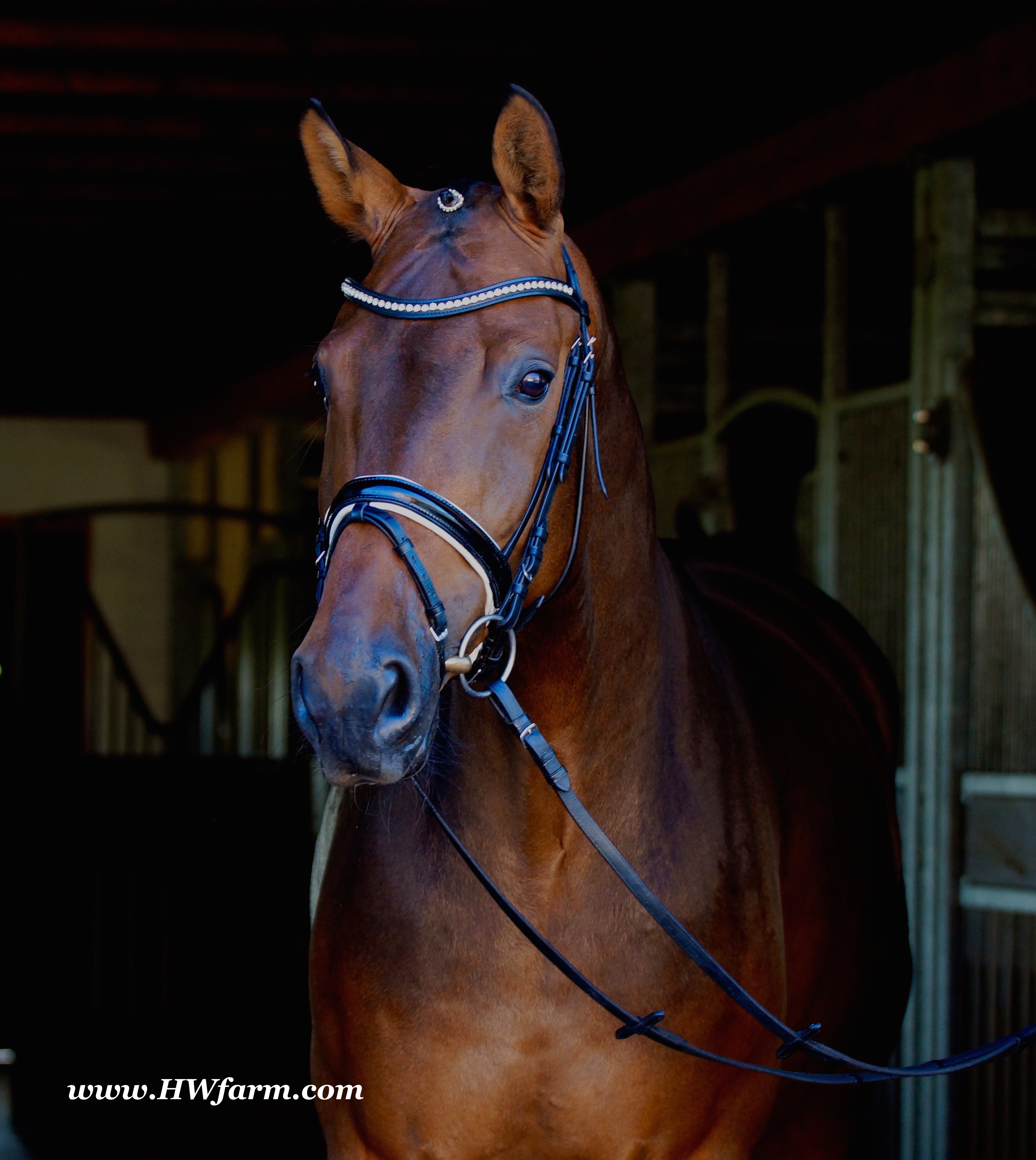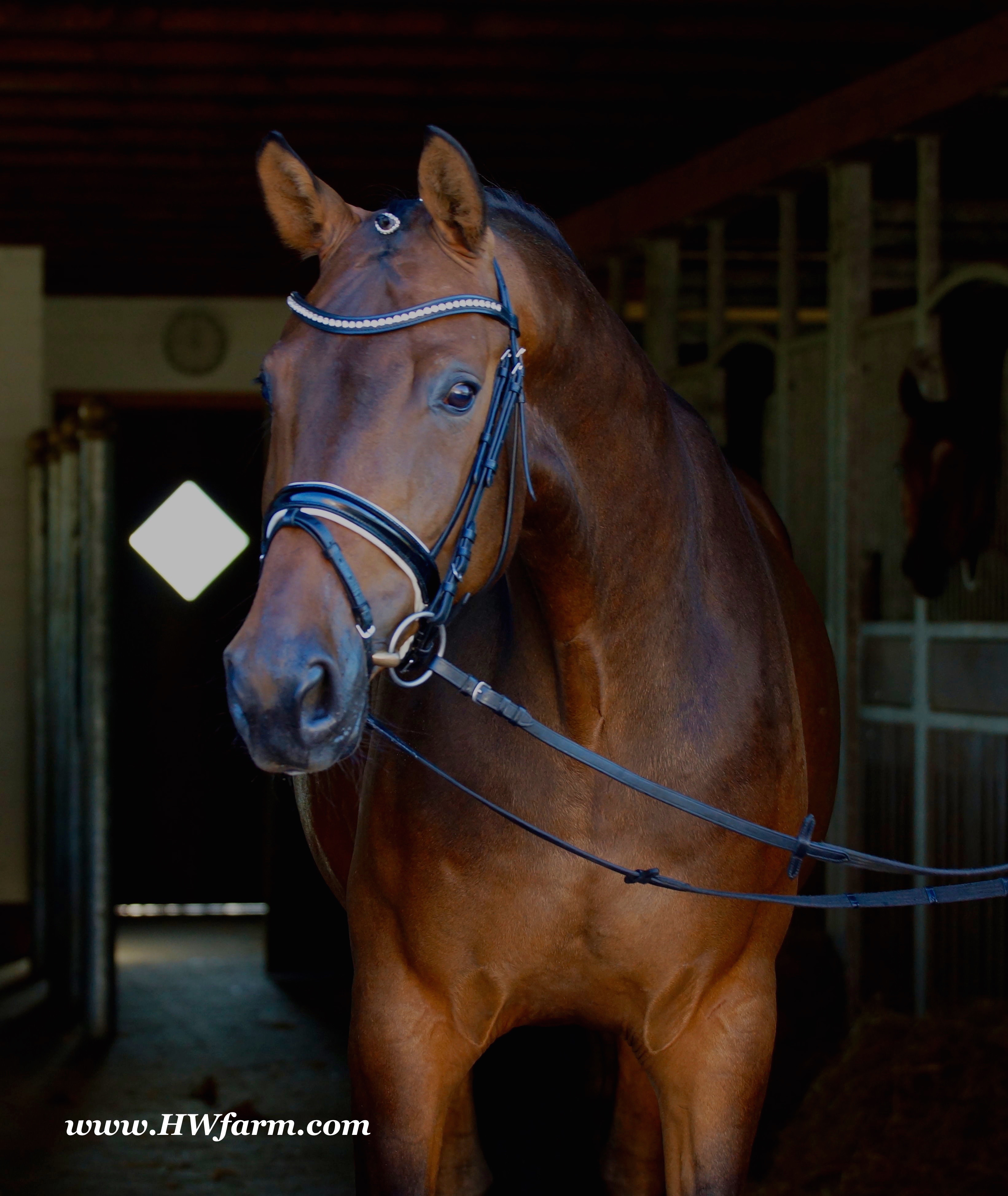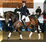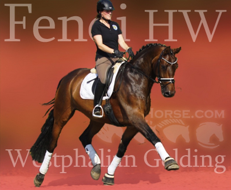 | Fendi HW, bay Westphalian gelding by Flovino/Ferragamo, born in 2009, standing approximately 172 cm or 16.3 hands. Fendi HW's sire is Flovino. He carries the famous Florestan blood and was second Reserve Champion at the 2004 NRW stallion approvals. He placed 1st in dressage at his performance test receiving a score of 136.52 points. He has had success in tests for young dressage since then. Flovino is a highly requested breeding stallion due to the number of foals that have qualified for the German foul championships, and the premium foals selected for auctions. Flovino is a full brother to the 2000 NRW champion stallion, Future. Flovino’s sire Florestan was born in 1986 and as a foal he impressed all with his type, expression and basic gaits. Temperament and character were highlights of this young colt.. Very lucrative offers were declined from USA, and Florestan was sold to the Westphalen State Stud who had put first option on him as a foal. From the Nordrhein Westphalen State Stud he has influenced warmblood breeding immensely. Florestan has clearly stamped a dynasty of performance and breeding horses. In 1988 Florestan was the undisputed winner of the Rheinland Licensing. He fulfilled expectations by Winning the Performance Test in Warendorf in 1989. He acheived a total index of 129.02. His critics were silenced after his first foal crops proved his reproducing powers. His foals all replicated their sire's excellent traits. Progeny from those first years impressed so much that Florestan was moved to the main breeding station in Warendorf. Florestan and his progeny are well known all over the world. To name a few, the Bundeschampions, Fidermark, Ferrara S, French Kiss, the World Dressage Champion, Fürst Heinrich, Florencio, 3rd place World Dressage Championship finals in Las Vegas, Floriano,the best horse in the finale of the German Dressage Derby, Florianus, Stallion Licensing Champions, Future (NRW) and French Kiss (Baden-Württemberg), Oldenburger Main Premium Winner, Fürst Heinrich and Florencio. Bavarian Main Premium Winner Florestano, the Performance Test Champions Faveur, Fidermark, Fielmann, and Freestyle, NRW winning mare Fiedergirl, top priced stallion from the Hanoverian Licensing 2006, First Dance and Westphalia Reserve Champion and NRW Auction top price, Fleur Rubin. These are just some of his progeny and their achievements.. Florestan showed very early that he could create his own stallion line and strengthen and continue the line from his ancestors. This is evident in his sons and grand sons. Florestan has delivered since 1993 at least one Licensed son each year and many of those were honored as Premium Stallions. In 2000, there were 15 sons at the NRW Licensing. Ten sons were licensed with the stallion, Future being Champion. Others included Fürst Heinrich, Floresco, Fielman and Floriano. Other associations have had their share of Florestan sons also. Fürstenreich, Fit for fun, and Florencio in Oldenburg, French Kiss in Baden-Württemberg, Florestano and Florentano in Bavaria, and First Dance in Hanover. Florestan progeny have always done well in competition and in 2003 Fürst Heinrich was World Dressage Champion as a 5 year old. In 2004 Florencio was World Dressage Champion as a 5 year old and French Kiss was World Dressage Champion as a 6 year old. In 2004 Florestan progeny dominated the NRW Licensing. The first three premium placing were by Florestan sons and Florestan himself.. Champion Stallion was Fidertanz (Fidermark), Reserve Champion was Fürst Grandios (Fürst Heinrich), 2nd Reserve Flovino (by Florestan). Nine sons in total were NRW Licensed that year and a further 13 stallions by Florestan sons and grand sons were also licensed. In 2006 Hanoverian licensed Stallion, First Dance sold for 400,000EU. Florestan's pedigree shows a successful combination from various bloodstreams coming together. His sire, Fidelio originated through Hanoverian breeding and was sired by Furioso II. Fidelio consistently produced very correct rideable horses with the desired movement and temperament. Florestan's dam, St.Pr.St. Raute was 3 year old Rheinland Champion Mare and was awarded State Premium. She fulfilled all expectations being a successful show and broodmare. She won her class at the Bundes Mare Show in Verden in 1983 and in 1986 at the State Mare Show she was also a winner, a big honour at this show as all top mares from other associations compete against each other. She wrote breeding history when she produced Florestan 1 and his siblings, including 3 sisters who were all honored with State Premium status. St.Pr.St. Wachtel by World Champ, St.Pr.St. Palucca by Paretti and St.Pr.St. Wapita by World Champ. Full brother Florestan II was Licensed and also stood at Warendorf stud. Two other progeny by St.Pt.St. Raute are with Robert Dover, dressage rider in USA. Florestan's sister St.Pr.St.Wachtel was the mother of three State Premium Mares, St.Pr.St. Phantasie, by Paretti, St.Pr.St. Dollnitz by Don Bedo I and St.Pr.St. Fayette by Feinsinn. Well known for his hereditary transmission, Florestan has a Dressage Breeding Index of 146 with 99% accuracy (2006). Over 100 sons have been Licensed and 190 mares awarded State Premium. 1620 offspring are registered as competition horses with combined winnings of over 1,500,000EU. Florestan not only produces top sons but also top mares for breeding and sport. His progeny are also consistently producing top quality. In Westphalia, Florestan or Florestan progeny have produced 6 times in 8 years, the Champion Mare. Florestan features as the Dam's Sire of hundreds of Licensed Stallions, Premium Mares and successful competition horses. Along with his achievements as a Sire, this makes him one of the most Influential Sires in Warmblood history. Fendi HW's dam is by the famous Ferragamo. He Was reserve champion of the 1992 licensing in Munster-Handorf and reserve champion stallion at his performance test in Warendorf. He received 135.96