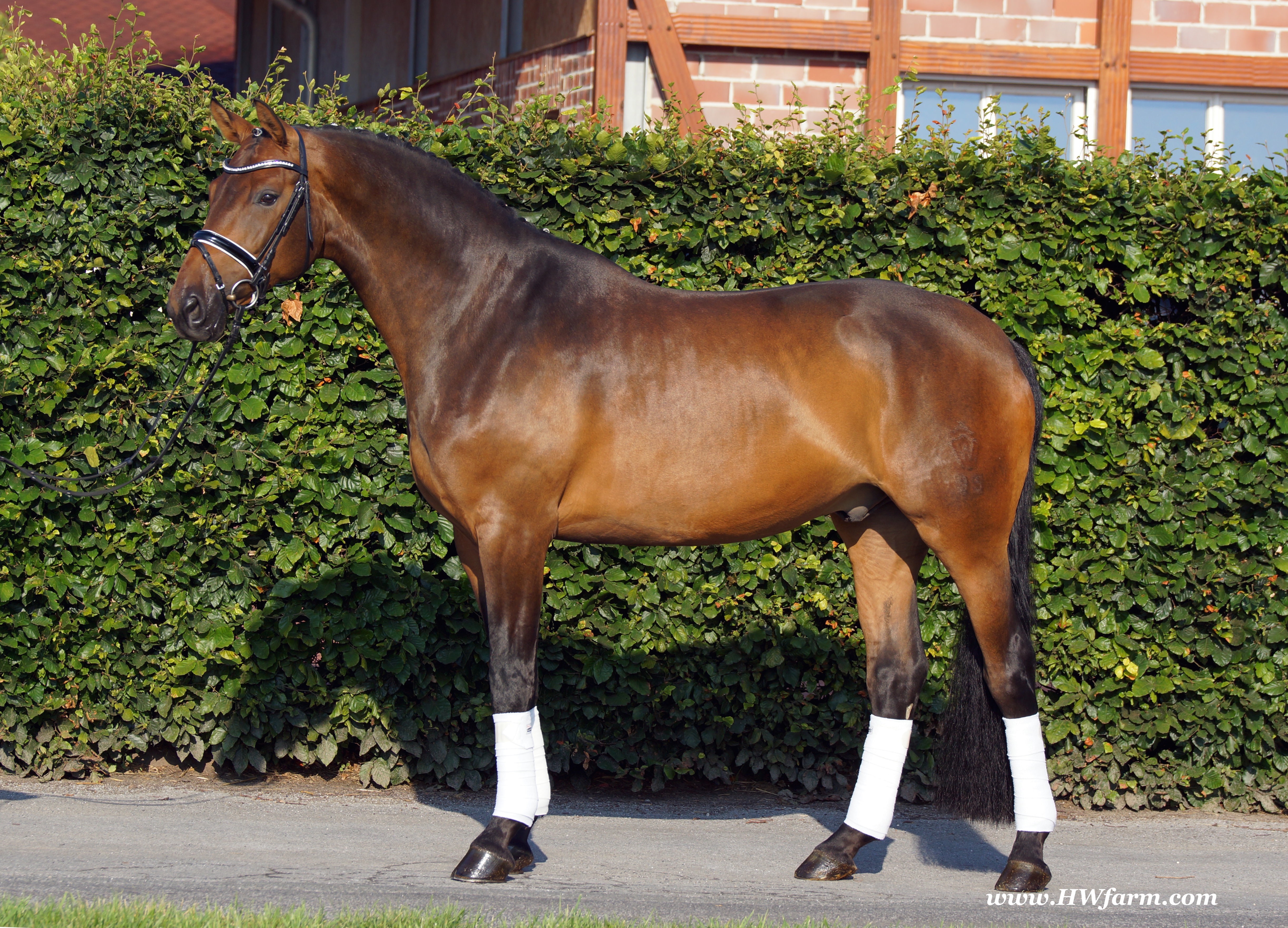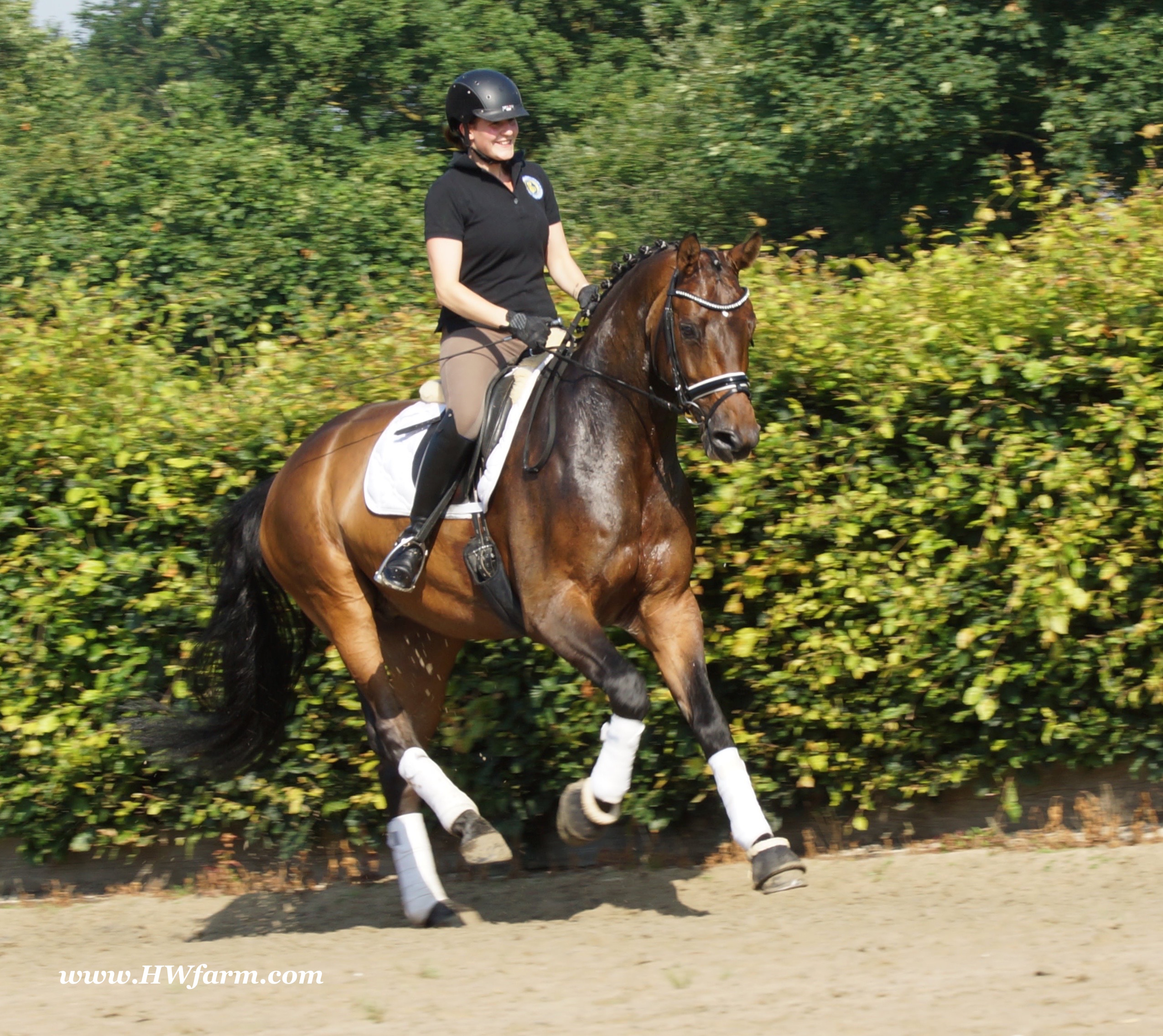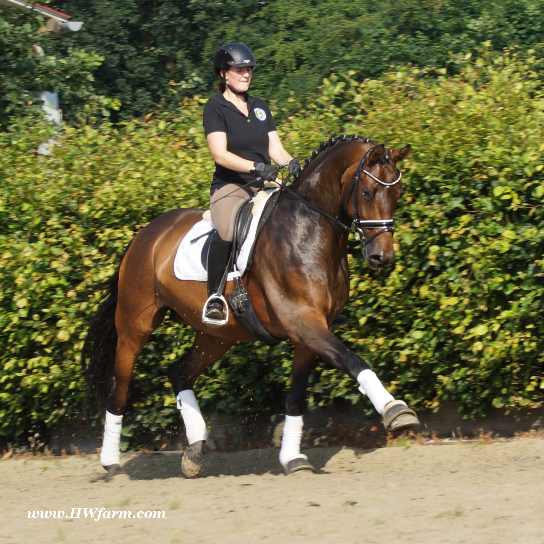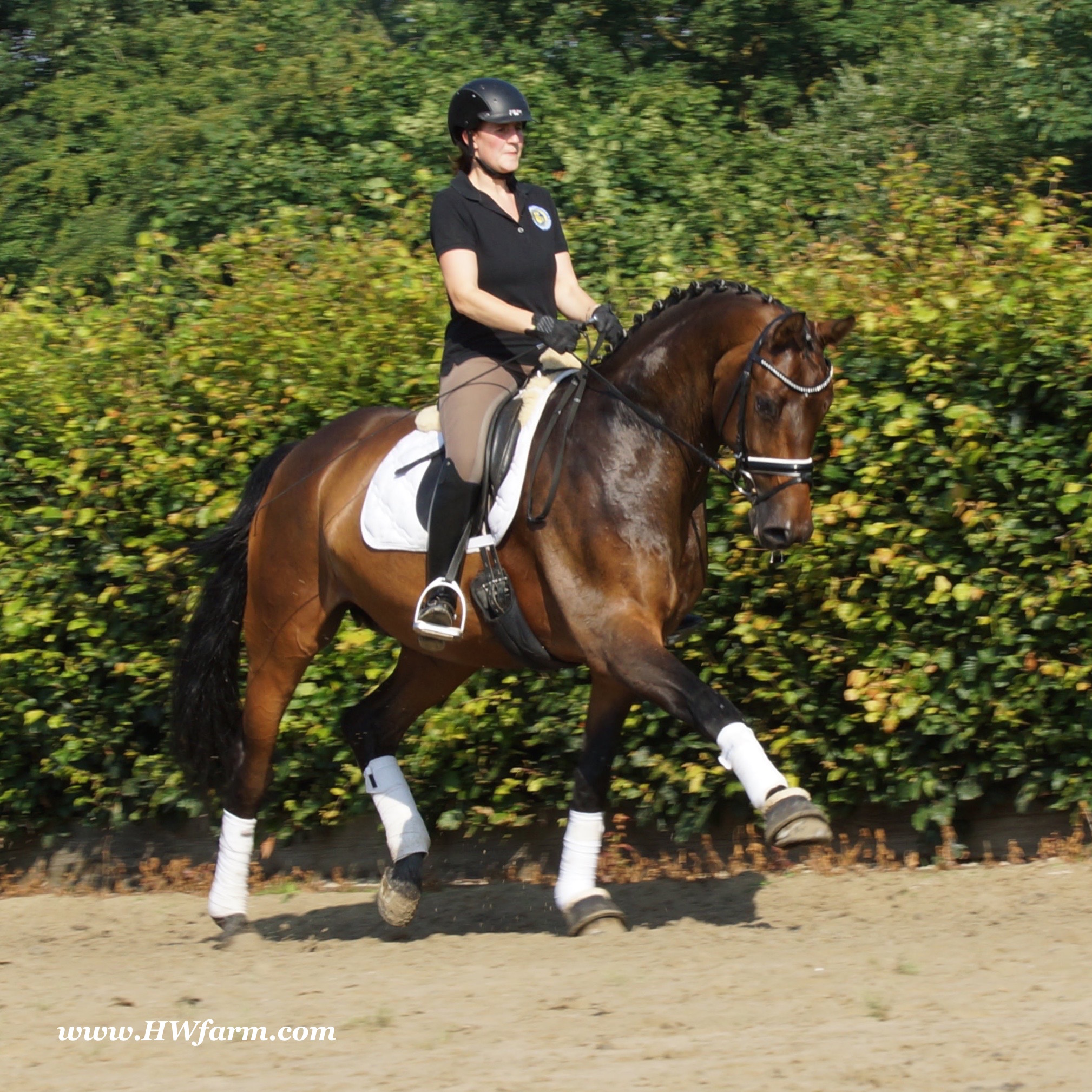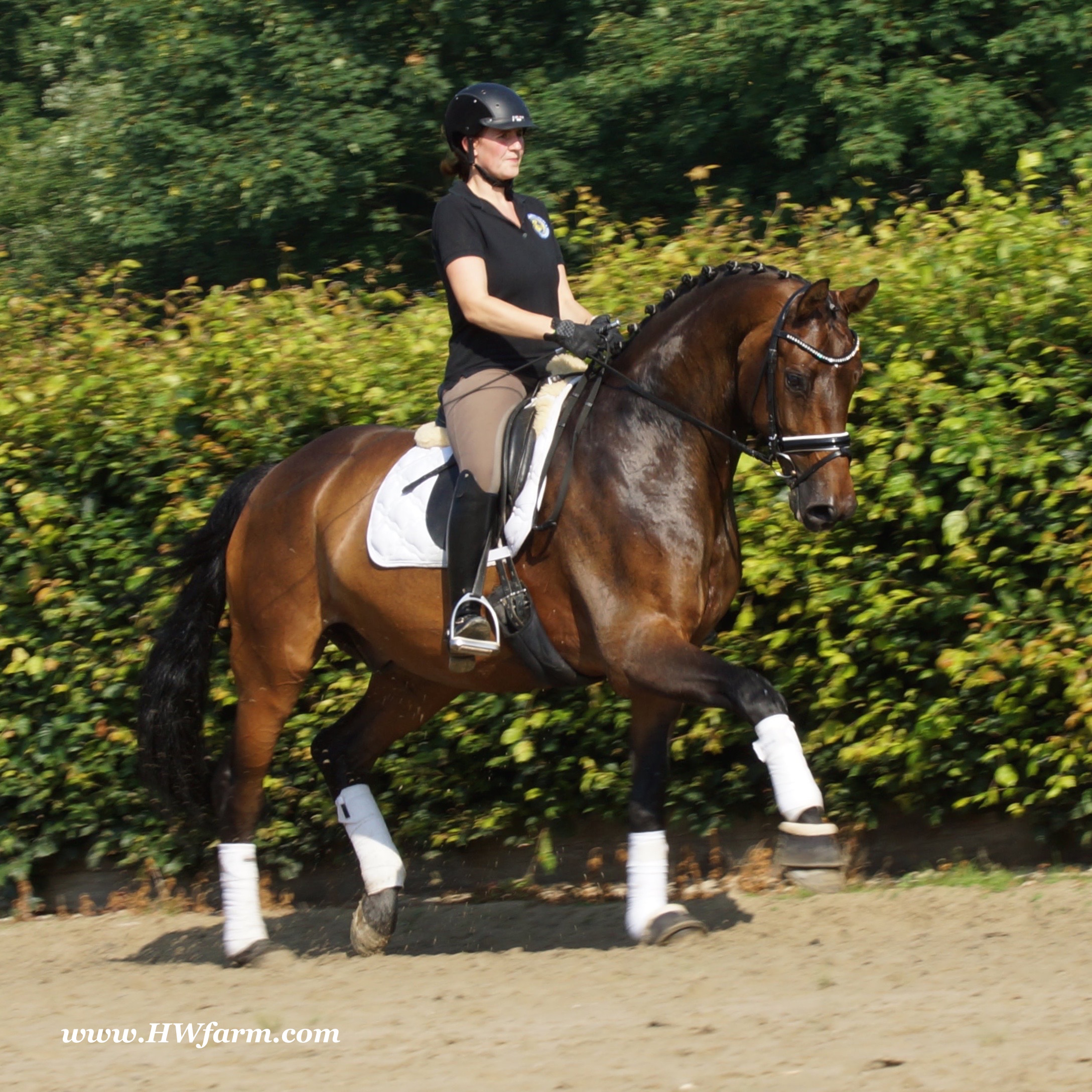 | Fendi HW, bay Westphalian gelding by Flovino/Ferragamo, born in 2009, standing approximately 172 cm or 16.3 hands. Fendi HW's sire is Flovino. He carries the famous Florestan blood and was second Reserve Champion at the 2004 NRW stallion approvals. He placed 1st in dressage at his performance test receiving a score of 136.52 points. He has had success in tests for young dressage since then. Flovino is a highly requested breeding stallion due to the number of foals that have qualified for the German foul championships, and the premium foals selected for auctions. Flovino is a full brother to the 2000 NRW champion stallion, Future. Flovino’s sire Florestan was born in 1986 and as a foal he impressed all with his type, expression and basic gaits. Temperament and character were highlights of this young colt.. Very lucrative offers were declined from USA, and Florestan was sold to the Westphalen State Stud who had put first option on him as a foal. From the Nordrhein Westphalen State Stud he has influenced warmblood breeding immensely. Florestan has clearly stamped a dynasty of performance and breeding horses. In 1988 Florestan was the undisputed winner of the Rheinland Licensing. He fulfilled expectations by Winning the Performance Test in Warendorf in 1989. He acheived a total index of 129.02. His critics were silenced after his first foal crops proved his reproducing powers. His foals all replicated their sire's excellent traits. Progeny from those first years impressed so much that Florestan was moved to the main breeding station in Warendorf. Florestan and his progeny are well known all over the world. To name a few, the Bundeschampions, Fidermark, Ferrara S, French Kiss, the World Dressage Champion, Fürst Heinrich, Florencio, 3rd place World Dressage Championship finals in Las Vegas, Floriano,the best horse in the finale of the German Dressage Derby, Florianus, Stallion Licensing Champions, Future (NRW) and French Kiss (Baden-Württemberg), Oldenburger Main Premium Winner, Fürst Heinrich and Florencio. Bavarian Main Premium Winner Florestano, the Performance Test Champions Faveur, Fidermark, Fielmann, and Freestyle, NRW winning mare Fiedergirl, top priced stallion from the Hanoverian Licensing 2006, First Dance and Westphalia Reserve Champion and NRW Auction top price, Fleur Rubin. These are just some of his progeny and their achievements.. Florestan showed very early that he could create his own stallion line and strengthen and continue the line from his ancestors. This is evident in his sons and grand sons. Florestan has delivered since 1993 at least one Licensed son each year and many of those were honored as Premium Stallions. In 2000, there were 15 sons at the NRW Licensing. Ten sons were licensed with the stallion, Future being Champion. Others included Fürst Heinrich, Floresco, Fielman and Floriano. Other associations have had their share of Florestan sons also. Fürstenreich, Fit for fun, and Florencio in Oldenburg, French Kiss in Baden-Württemberg, Florestano and Florentano in Bavaria, and First Dance in Hanover. Florestan progeny have always done well in competition and in 2003 Fürst Heinrich was World Dressage Champion as a 5 year old. In 2004 Florencio was World Dressage Champion as a 5 year old and French Kiss was World Dressage Champion as a 6 year old. In 2004 Florestan progeny dominated the NRW Licensing. The first three premium placing were by Florestan sons and Florestan himself.. Champion Stallion was Fidertanz (Fidermark), Reserve Champion was Fürst Grandios (Fürst Heinrich), 2nd Reserve Flovino (by Florestan). Nine sons in total were NRW Licensed that year and a further 13 stallions by Florestan sons and grand sons were also licensed. In 2006 Hanoverian licensed Stallion, First Dance sold for 400,000EU. Florestan's pedigree shows a successful combination from various bloodstreams coming together. His sire, Fidelio originated through Hanoverian breeding and was sired by Furioso II. Fidelio consistently produced very correct rideable horses with the desired movement and temperament. Florestan's dam, St.Pr.St. Raute was 3 year old Rheinland Champion Mare and was awarded State Premium. She fulfilled all expectations being a successful show and broodmare. She won her class at the Bundes Mare Show in Verden in 1983 and in 1986 at the State Mare Show she was also a winner, a big honour at this show as all top mares from other associations compete against each other. She wrote breeding history when she produced Florestan 1 and his siblings, including 3 sisters who were all honored with State Premium status. St.Pr.St. Wachtel by World Champ, St.Pr.St. Palucca by Paretti and St.Pr.St. Wapita by World Champ. Full brother Florestan II was Licensed and also stood at Warendorf stud. Two other progeny by St.Pt.St. Raute are with Robert Dover, dressage rider in USA. Florestan's sister St.Pr.St.Wachtel was the mother of three State Premium Mares, St.Pr.St. Phantasie, by Paretti, St.Pr.St. Dollnitz by Don Bedo I and St.Pr.St. Fayette by Feinsinn. Well known for his hereditary transmission, Florestan has a Dressage Breeding Index of 146 with 99% accuracy (2006). Over 100 sons have been Licensed and 190 mares awarded State Premium. 1620 offspring are registered as competition horses with combined winnings of over 1,500,000EU. Florestan not only produces top sons but also top mares for breeding and sport. His progeny are also consistently producing top quality. In Westphalia, Florestan or Florestan progeny have produced 6 times in 8 years, the Champion Mare. Florestan features as the Dam's Sire of hundreds of Licensed Stallions, Premium Mares and successful competition horses. Along with his achievements as a Sire, this makes him one of the most Influential Sires in Warmblood history. Fendi HW's dam is by the famous Ferragamo. He Was reserve champion of the 1992 licensing in Munster-Handorf and reserve champion stallion at his performance test in Warendorf. He received 135.96
