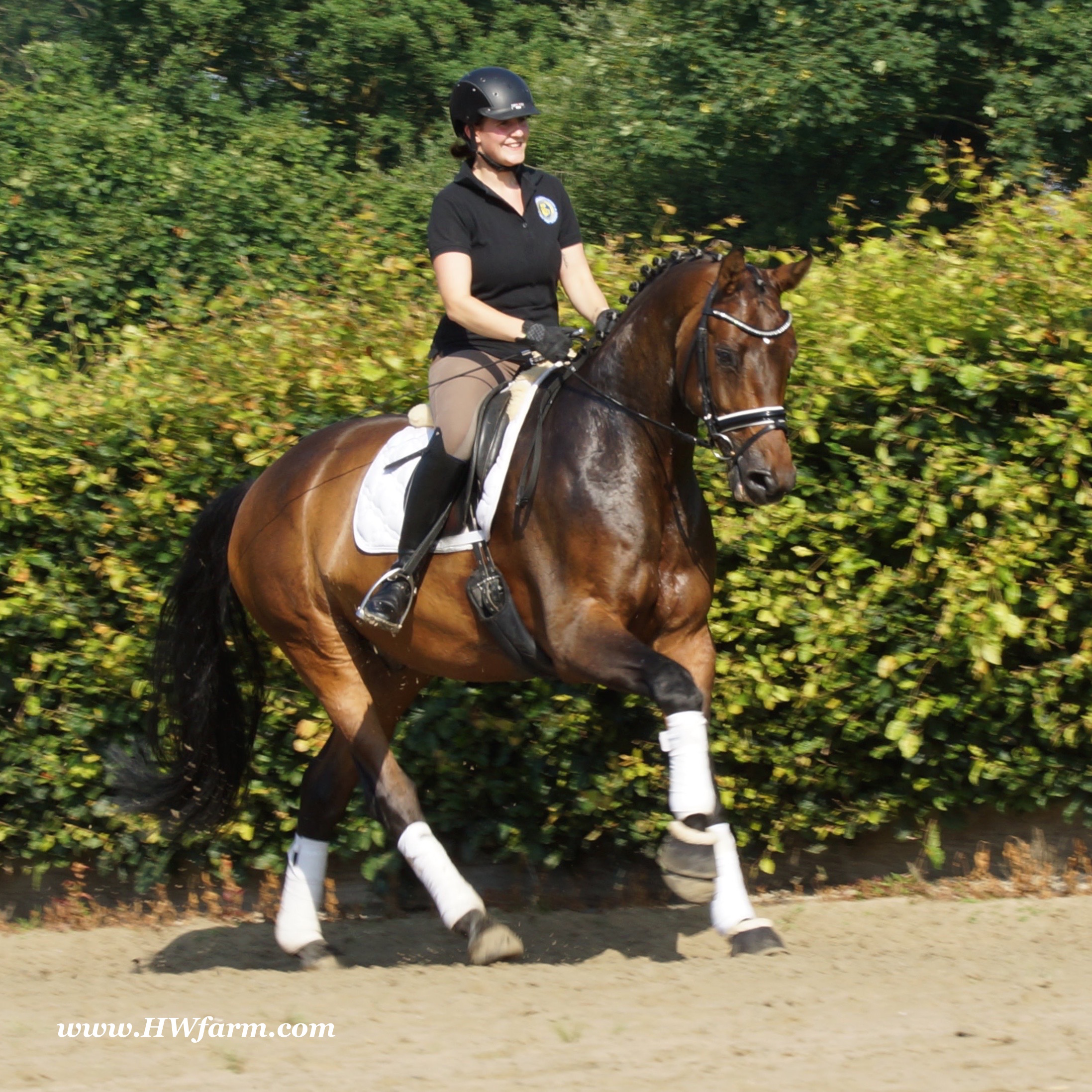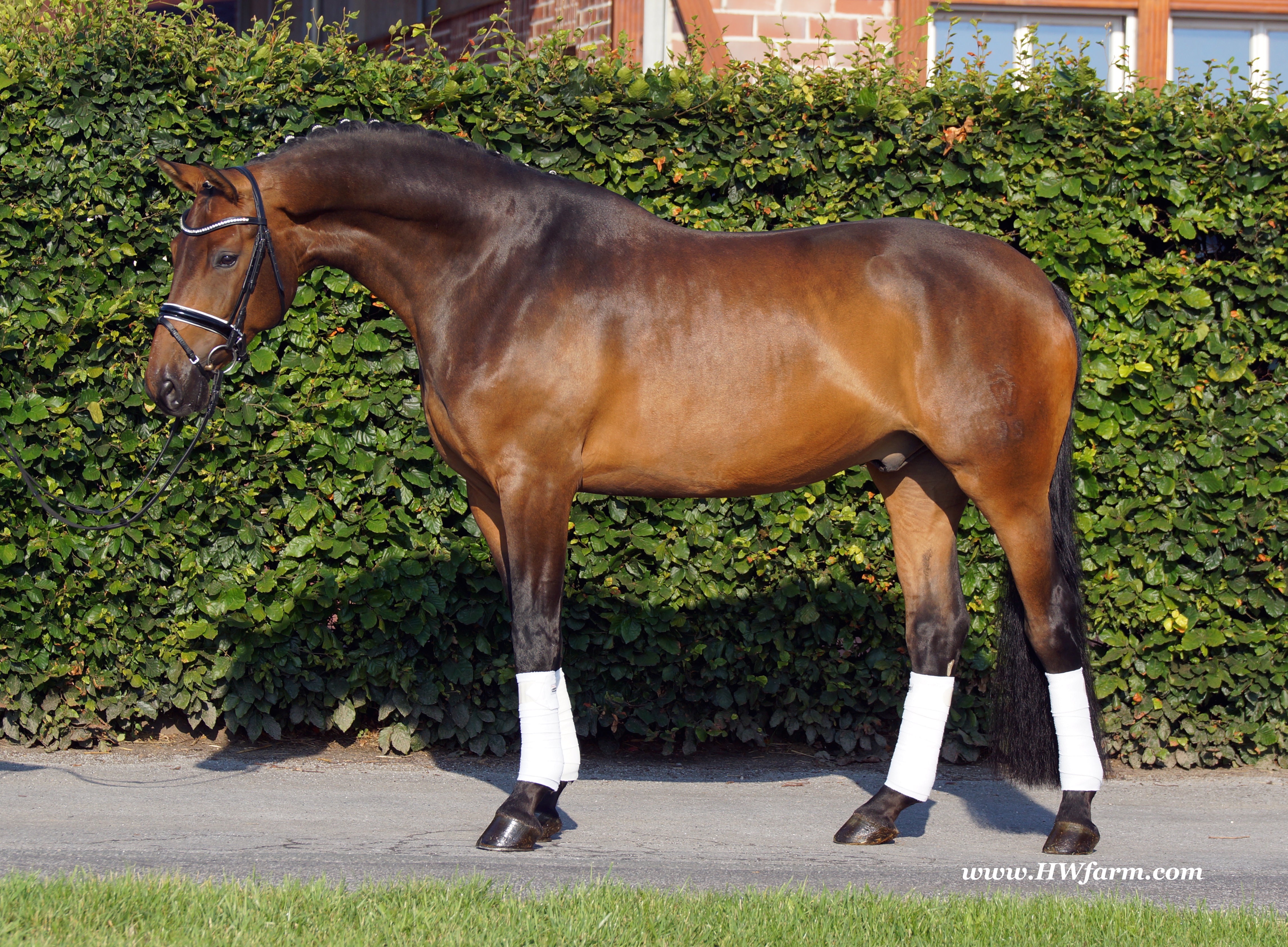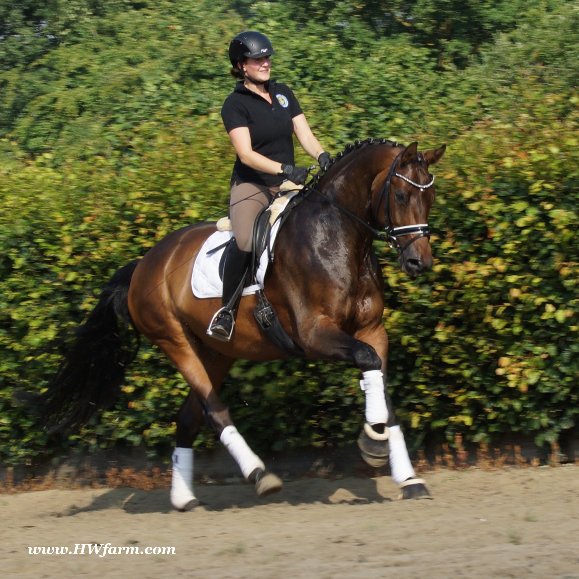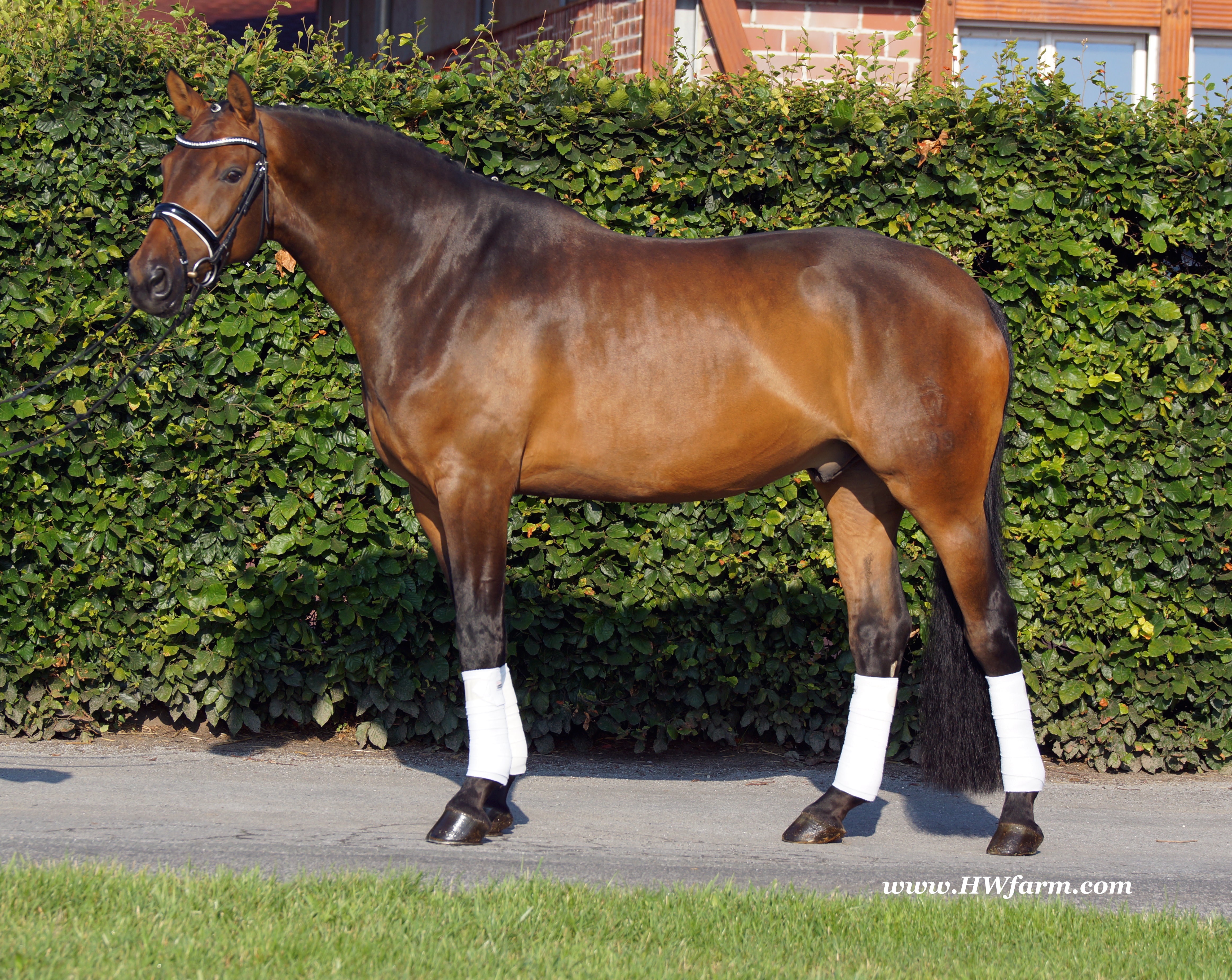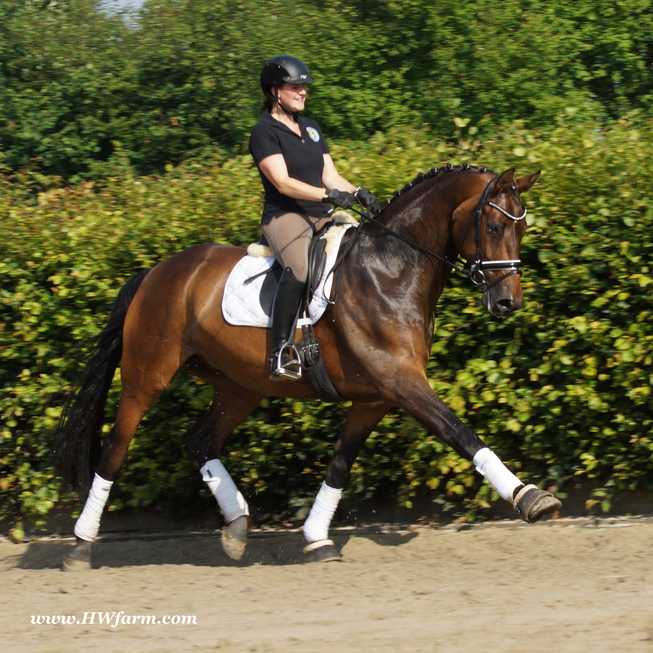 | Fendi HW, bay Westphalian gelding by Flovino/Ferragamo, born in 2009, standing approximately 172 cm or 16.3 hands. Fendi HW's sire is Flovino. He carries the famous Florestan blood and was second Reserve Champion at the 2004 NRW stallion approvals. He placed 1st in dressage at his performance test receiving a score of 136.52 points. He has had success in tests for young dressage since then. Flovino is a highly requested breeding stallion due to the number of foals that have qualified for the German foul championships, and the premium foals selected for auctions. Flovino is a full brother to the 2000 NRW champion stallion, Future. Flovino’s sire Florestan was born in 1986 and as a foal he impressed all with his type, expression and basic gaits. Temperament and character were highlights of this young colt.. Very lucrative offers were declined from USA, and Florestan was sold to the Westphalen State Stud who had put first option on him as a foal. From the Nordrhein Westphalen State Stud he has influenced warmblood breeding immensely. Florestan has clearly stamped a dynasty of performance and breeding horses. In 1988 Florestan was the undisputed winner of the Rheinland Licensing. He fulfilled expectations by Winning the Performance Test in Warendorf in 1989. He acheived a total index of 129.02. His critics were silenced after his first foal crops proved his reproducing powers. His foals all replicated their sire's excellent traits. Progeny from those first years impressed so much that Florestan was moved to the main breeding station in Warendorf. Florestan and his progeny are well known all over the world. To name a few, the Bundeschampions, Fidermark, Ferrara S, French Kiss, the World Dressage Champion, Fürst Heinrich, Florencio, 3rd place World Dressage Championship finals in Las Vegas, Floriano,the best horse in the finale of the German Dressage Derby, Florianus, Stallion Licensing Champions, Future (NRW) and French Kiss (Baden-Württemberg), Oldenburger Main Premium Winner, Fürst Heinrich and Florencio. Bavarian Main Premium Winner Florestano, the Performance Test Champions Faveur, Fidermark, Fielmann, and Freestyle, NRW winning mare Fiedergirl, top priced stallion from the Hanoverian Licensing 2006, First Dance and Westphalia Reserve Champion and NRW Auction top price, Fleur Rubin. These are just some of his progeny and their achievements.. Florestan showed very early that he could create his own stallion line and strengthen and continue the line from his ancestors. This is evident in his sons and grand sons. Florestan has delivered since 1993 at least one Licensed son each year and many of those were honored as Premium Stallions. In 2000, there were 15 sons at the NRW Licensing. Ten sons were licensed with the stallion, Future being Champion. Others included Fürst Heinrich, Floresco, Fielman and Floriano. Other associations have had their share of Florestan sons also. Fürstenreich, Fit for fun, and Florencio in Oldenburg, French Kiss in Baden-Württemberg, Florestano and Florentano in Bavaria, and First Dance in Hanover. Florestan progeny have always done well in competition and in 2003 Fürst Heinrich was World Dressage Champion as a 5 year old. In 2004 Florencio was World Dressage Champion as a 5 year old and French Kiss was World Dressage Champion as a 6 year old. In 2004 Florestan progeny dominated the NRW Licensing. The first three premium placing were by Florestan sons and Florestan himself.. Champion Stallion was Fidertanz (Fidermark), Reserve Champion was Fürst Grandios (Fürst Heinrich), 2nd Reserve Flovino (by Florestan). Nine sons in total were NRW Licensed that year and a further 13 stallions by Florestan sons and grand sons were also licensed. In 2006 Hanoverian licensed Stallion, First Dance sold for 400,000EU. Florestan's pedigree shows a successful combination from various bloodstreams coming together. His sire, Fidelio originated through Hanoverian breeding and was sired by Furioso II. Fidelio consistently produced very correct rideable horses with the desired movement and temperament. Florestan's dam, St.Pr.St. Raute was 3 year old Rheinland Champion Mare and was awarded State Premium. She fulfilled all expectations being a successful show and broodmare. She won her class at the Bundes Mare Show in Verden in 1983 and in 1986 at the State Mare Show she was also a winner, a big honour at this show as all top mares from other associations compete against each other. She wrote breeding history when she produced Florestan 1 and his siblings, including 3 sisters who were all honored with State Premium status. St.Pr.St. Wachtel by World Champ, St.Pr.St. Palucca by Paretti and St.Pr.St. Wapita by World Champ. Full brother Florestan II was Licensed and also stood at Warendorf stud. Two other progeny by St.Pt.St. Raute are with Robert Dover, dressage rider in USA. Florestan's sister St.Pr.St.Wachtel was the mother of three State Premium Mares, St.Pr.St. Phantasie, by Paretti, St.Pr.St. Dollnitz by Don Bedo I and St.Pr.St. Fayette by Feinsinn. Well known for his hereditary transmission, Florestan has a Dressage Breeding Index of 146 with 99% accuracy (2006). Over 100 sons have been Licensed and 190 mares awarded State Premium. 1620 offspring are registered as competition horses with combined winnings of over 1,500,000EU. Florestan not only produces top sons but also top mares for breeding and sport. His progeny are also consistently producing top quality. In Westphalia, Florestan or Florestan progeny have produced 6 times in 8 years, the Champion Mare. Florestan features as the Dam's Sire of hundreds of Licensed Stallions, Premium Mares and successful competition horses. Along with his achievements as a Sire, this makes him one of the most Influential Sires in Warmblood history. Fendi HW's dam is by the famous Ferragamo. He Was reserve champion of the 1992 licensing in Munster-Handorf and reserve champion stallion at his performance test in Warendorf. He received 135.96