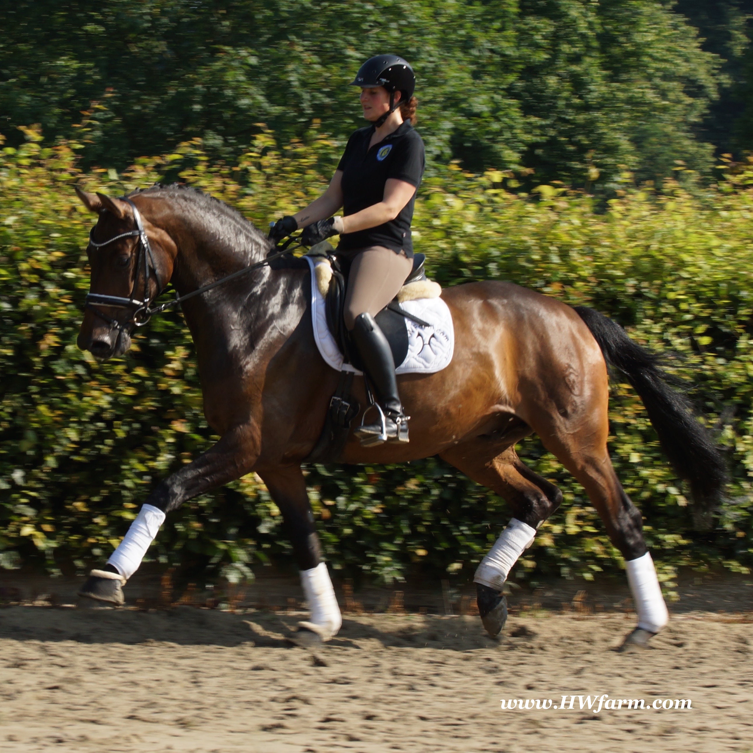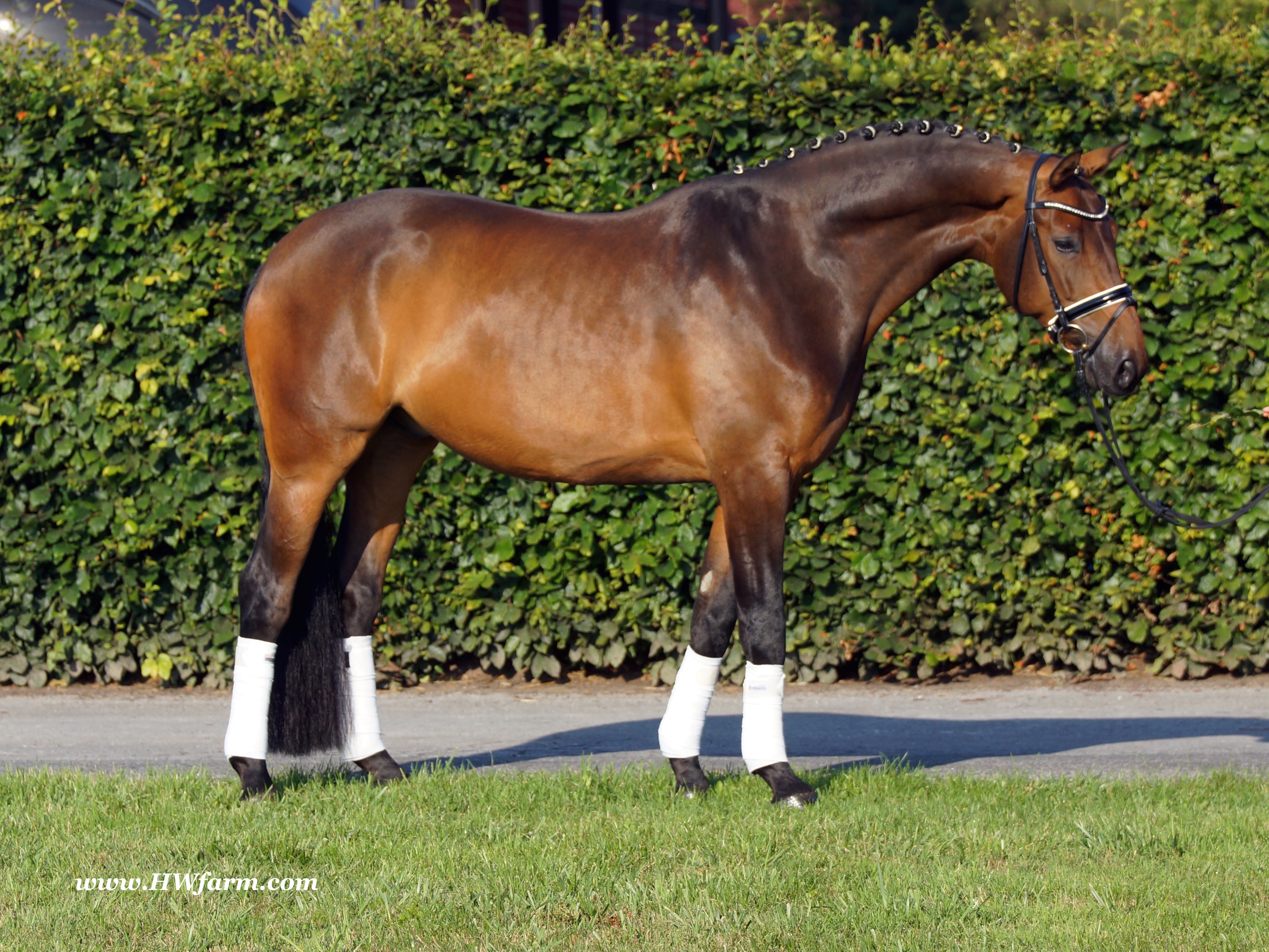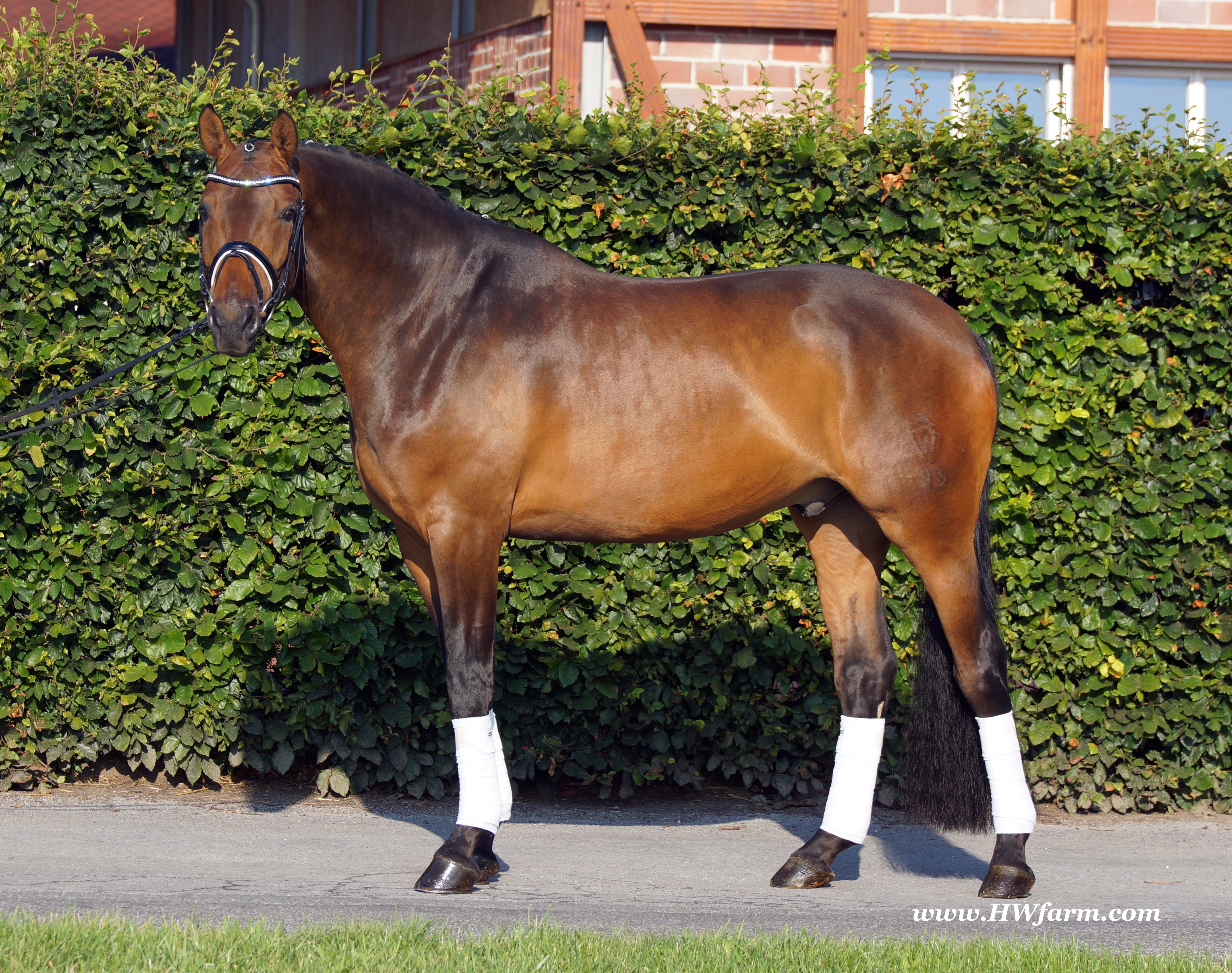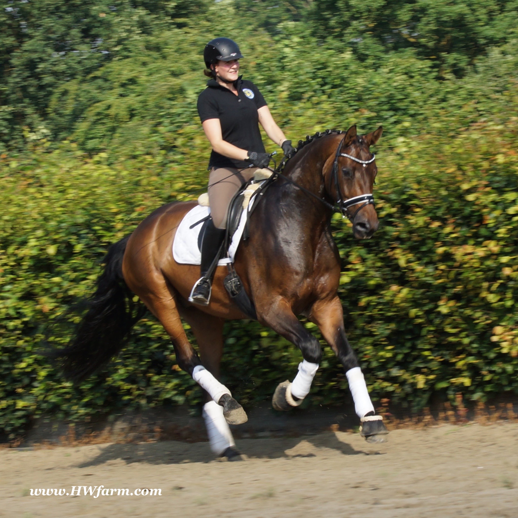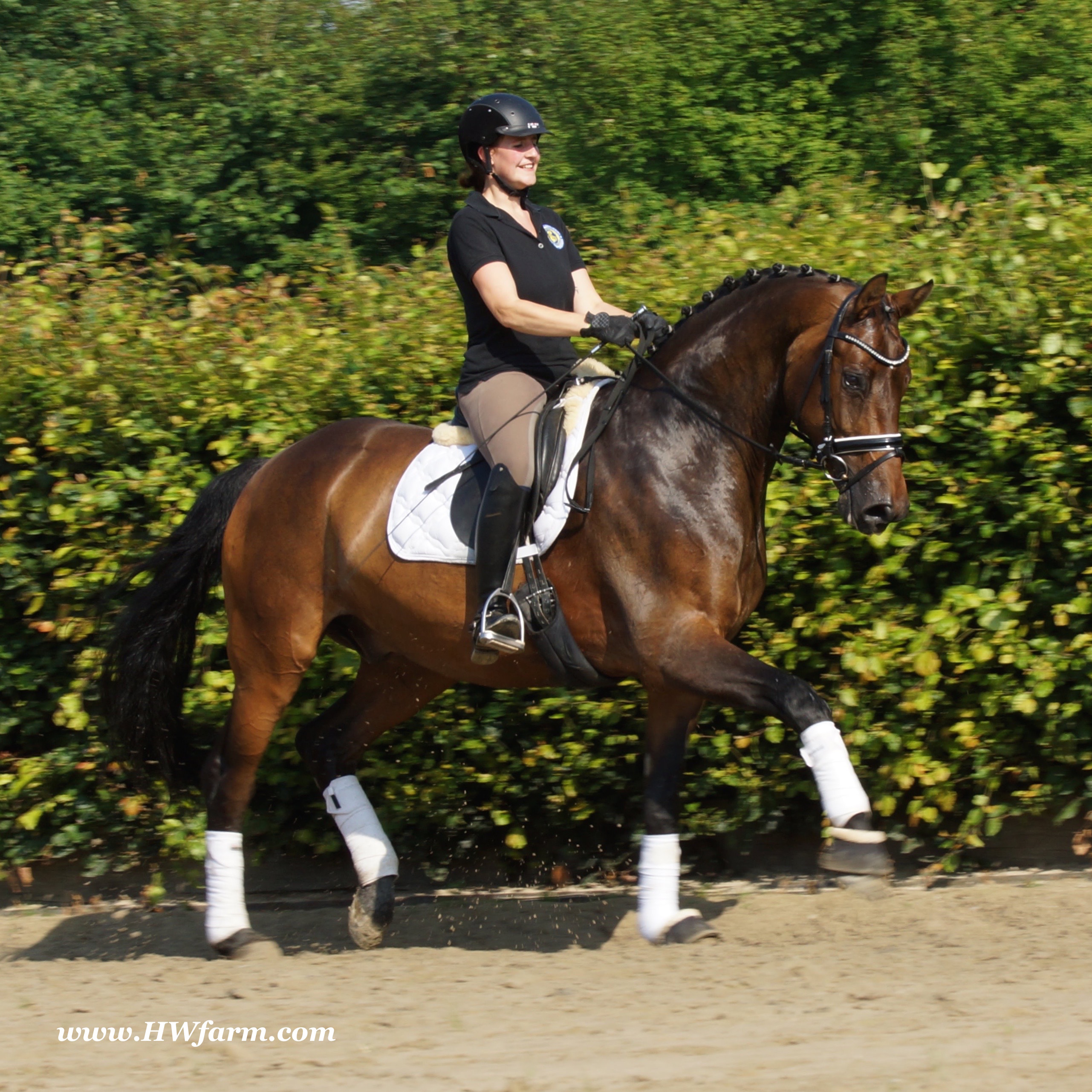 | Fendi HW, bay Westphalian gelding by Flovino/Ferragamo, born in 2009, standing approximately 172 cm or 16.3 hands. Fendi HW's sire is Flovino. He carries the famous Florestan blood and was second Reserve Champion at the 2004 NRW stallion approvals. He placed 1st in dressage at his performance test receiving a score of 136.52 points. He has had success in tests for young dressage since then. Flovino is a highly requested breeding stallion due to the number of foals that have qualified for the German foul championships, and the premium foals selected for auctions. Flovino is a full brother to the 2000 NRW champion stallion, Future. Flovino’s sire Florestan was born in 1986 and as a foal he impressed all with his type, expression and basic gaits. Temperament and character were highlights of this young colt.. Very lucrative offers were declined from USA, and Florestan was sold to the Westphalen State Stud who had put first option on him as a foal. From the Nordrhein Westphalen State Stud he has influenced warmblood breeding immensely. Florestan has clearly stamped a dynasty of performance and breeding horses. In 1988 Florestan was the undisputed winner of the Rheinland Licensing. He fulfilled expectations by Winning the Performance Test in Warendorf in 1989. He acheived a total index of 129.02. His critics were silenced after his first foal crops proved his reproducing powers. His foals all replicated their sire's excellent traits. Progeny from those first years impressed so much that Florestan was moved to the main breeding station in Warendorf. Florestan and his progeny are well known all over the world. To name a few, the Bundeschampions, Fidermark, Ferrara S, French Kiss, the World Dressage Champion, Fürst Heinrich, Florencio, 3rd place World Dressage Championship finals in Las Vegas, Floriano,the best horse in the finale of the German Dressage Derby, Florianus, Stallion Licensing Champions, Future (NRW) and French Kiss (Baden-Württemberg), Oldenburger Main Premium Winner, Fürst Heinrich and Florencio. Bavarian Main Premium Winner Florestano, the Performance Test Champions Faveur, Fidermark, Fielmann, and Freestyle, NRW winning mare Fiedergirl, top priced stallion from the Hanoverian Licensing 2006, First Dance and Westphalia Reserve Champion and NRW Auction top price, Fleur Rubin. These are just some of his progeny and their achievements.. Florestan showed very early that he could create his own stallion line and strengthen and continue the line from his ancestors. This is evident in his sons and grand sons. Florestan has delivered since 1993 at least one Licensed son each year and many of those were honored as Premium Stallions. In 2000, there were 15 sons at the NRW Licensing. Ten sons were licensed with the stallion, Future being Champion. Others included Fürst Heinrich, Floresco, Fielman and Floriano. Other associations have had their share of Florestan sons also. Fürstenreich, Fit for fun, and Florencio in Oldenburg, French Kiss in Baden-Württemberg, Florestano and Florentano in Bavaria, and First Dance in Hanover. Florestan progeny have always done well in competition and in 2003 Fürst Heinrich was World Dressage Champion as a 5 year old. In 2004 Florencio was World Dressage Champion as a 5 year old and French Kiss was World Dressage Champion as a 6 year old. In 2004 Florestan progeny dominated the NRW Licensing. The first three premium placing were by Florestan sons and Florestan himself.. Champion Stallion was Fidertanz (Fidermark), Reserve Champion was Fürst Grandios (Fürst Heinrich), 2nd Reserve Flovino (by Florestan). Nine sons in total were NRW Licensed that year and a further 13 stallions by Florestan sons and grand sons were also licensed. In 2006 Hanoverian licensed Stallion, First Dance sold for 400,000EU. Florestan's pedigree shows a successful combination from various bloodstreams coming together. His sire, Fidelio originated through Hanoverian breeding and was sired by Furioso II. Fidelio consistently produced very correct rideable horses with the desired movement and temperament. Florestan's dam, St.Pr.St. Raute was 3 year old Rheinland Champion Mare and was awarded State Premium. She fulfilled all expectations being a successful show and broodmare. She won her class at the Bundes Mare Show in Verden in 1983 and in 1986 at the State Mare Show she was also a winner, a big honour at this show as all top mares from other associations compete against each other. She wrote breeding history when she produced Florestan 1 and his siblings, including 3 sisters who were all honored with State Premium status. St.Pr.St. Wachtel by World Champ, St.Pr.St. Palucca by Paretti and St.Pr.St. Wapita by World Champ. Full brother Florestan II was Licensed and also stood at Warendorf stud. Two other progeny by St.Pt.St. Raute are with Robert Dover, dressage rider in USA. Florestan's sister St.Pr.St.Wachtel was the mother of three State Premium Mares, St.Pr.St. Phantasie, by Paretti, St.Pr.St. Dollnitz by Don Bedo I and St.Pr.St. Fayette by Feinsinn. Well known for his hereditary transmission, Florestan has a Dressage Breeding Index of 146 with 99% accuracy (2006). Over 100 sons have been Licensed and 190 mares awarded State Premium. 1620 offspring are registered as competition horses with combined winnings of over 1,500,000EU. Florestan not only produces top sons but also top mares for breeding and sport. His progeny are also consistently producing top quality. In Westphalia, Florestan or Florestan progeny have produced 6 times in 8 years, the Champion Mare. Florestan features as the Dam's Sire of hundreds of Licensed Stallions, Premium Mares and successful competition horses. Along with his achievements as a Sire, this makes him one of the most Influential Sires in Warmblood history. Fendi HW's dam is by the famous Ferragamo. He Was reserve champion of the 1992 licensing in Munster-Handorf and reserve champion stallion at his performance test in Warendorf. He received 135.96