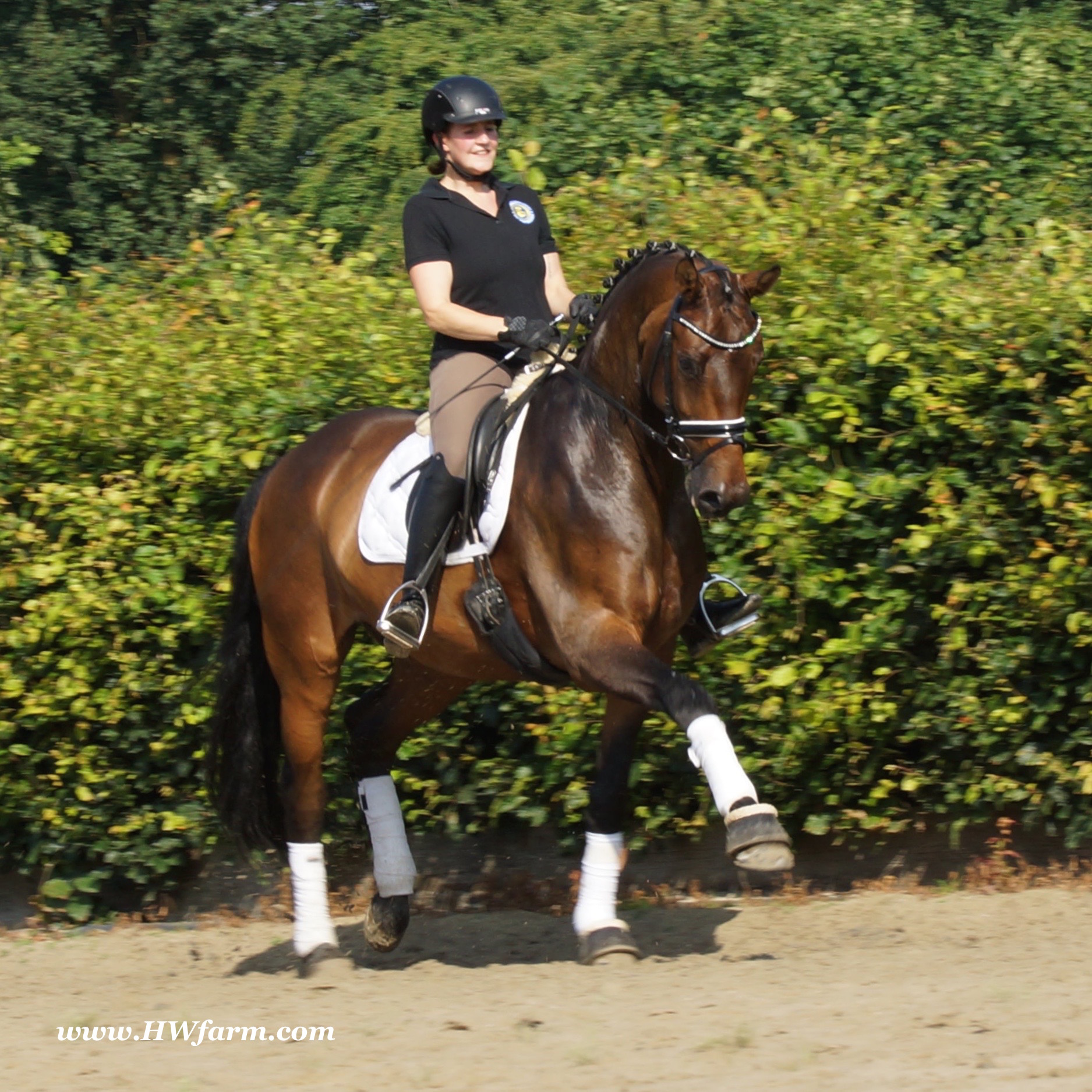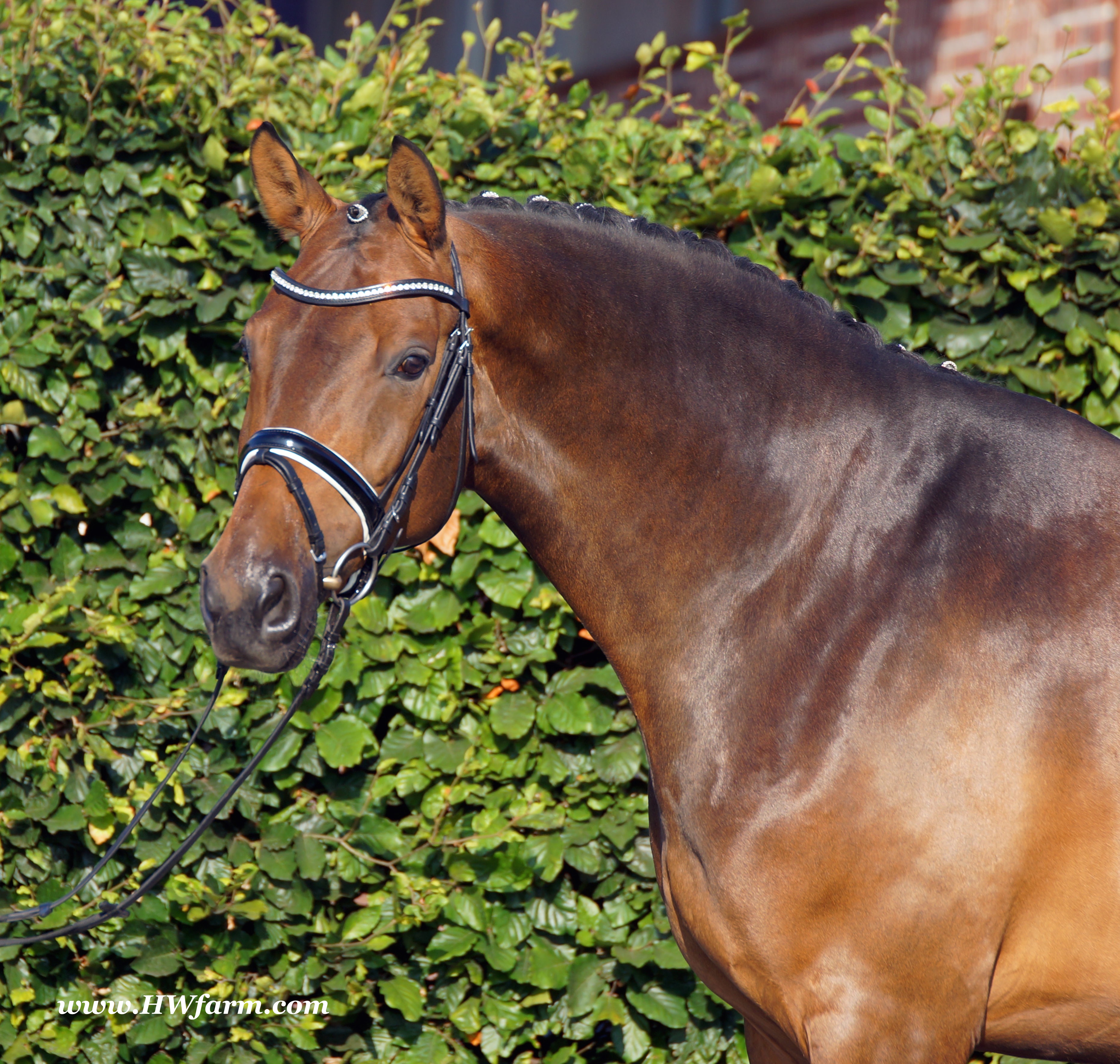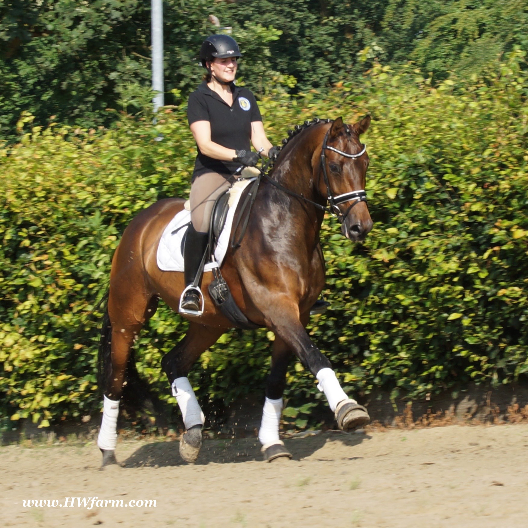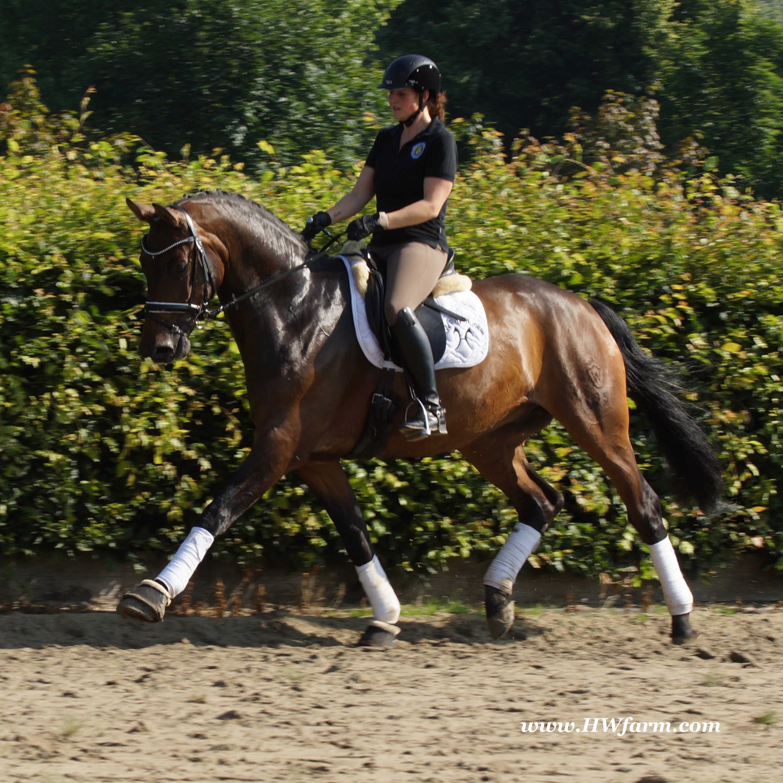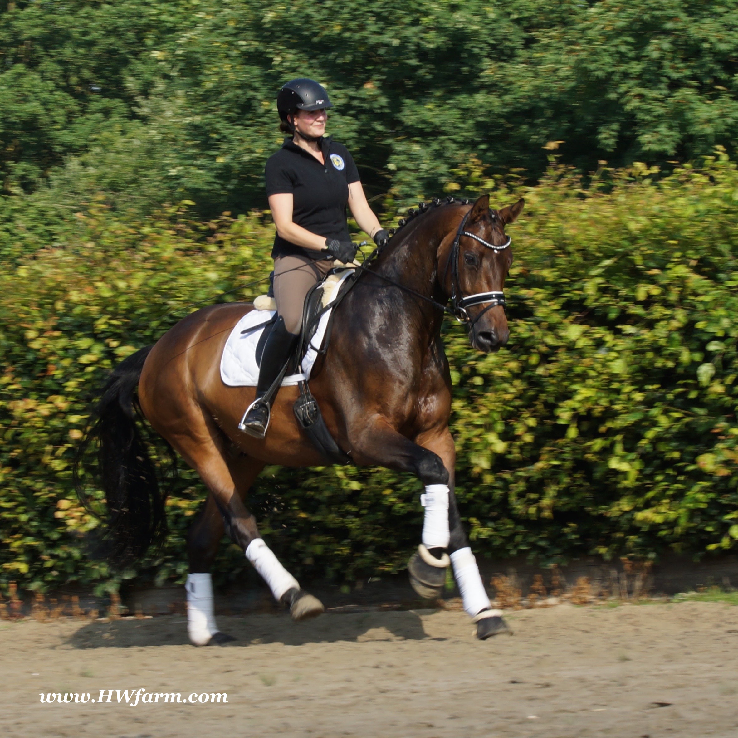 | Fendi HW, bay Westphalian gelding by Flovino/Ferragamo, born in 2009, standing approximately 172 cm or 16.3 hands. Fendi HW's sire is Flovino. He carries the famous Florestan blood and was second Reserve Champion at the 2004 NRW stallion approvals. He placed 1st in dressage at his performance test receiving a score of 136.52 points. He has had success in tests for young dressage since then. Flovino is a highly requested breeding stallion due to the number of foals that have qualified for the German foul championships, and the premium foals selected for auctions. Flovino is a full brother to the 2000 NRW champion stallion, Future. Flovino’s sire Florestan was born in 1986 and as a foal he impressed all with his type, expression and basic gaits. Temperament and character were highlights of this young colt.. Very lucrative offers were declined from USA, and Florestan was sold to the Westphalen State Stud who had put first option on him as a foal. From the Nordrhein Westphalen State Stud he has influenced warmblood breeding immensely. Florestan has clearly stamped a dynasty of performance and breeding horses. In 1988 Florestan was the undisputed winner of the Rheinland Licensing. He fulfilled expectations by Winning the Performance Test in Warendorf in 1989. He acheived a total index of 129.02. His critics were silenced after his first foal crops proved his reproducing powers. His foals all replicated their sire's excellent traits. Progeny from those first years impressed so much that Florestan was moved to the main breeding station in Warendorf. Florestan and his progeny are well known all over the world. To name a few, the Bundeschampions, Fidermark, Ferrara S, French Kiss, the World Dressage Champion, Fürst Heinrich, Florencio, 3rd place World Dressage Championship finals in Las Vegas, Floriano,the best horse in the finale of the German Dressage Derby, Florianus, Stallion Licensing Champions, Future (NRW) and French Kiss (Baden-Württemberg), Oldenburger Main Premium Winner, Fürst Heinrich and Florencio. Bavarian Main Premium Winner Florestano, the Performance Test Champions Faveur, Fidermark, Fielmann, and Freestyle, NRW winning mare Fiedergirl, top priced stallion from the Hanoverian Licensing 2006, First Dance and Westphalia Reserve Champion and NRW Auction top price, Fleur Rubin. These are just some of his progeny and their achievements.. Florestan showed very early that he could create his own stallion line and strengthen and continue the line from his ancestors. This is evident in his sons and grand sons. Florestan has delivered since 1993 at least one Licensed son each year and many of those were honored as Premium Stallions. In 2000, there were 15 sons at the NRW Licensing. Ten sons were licensed with the stallion, Future being Champion. Others included Fürst Heinrich, Floresco, Fielman and Floriano. Other associations have had their share of Florestan sons also. Fürstenreich, Fit for fun, and Florencio in Oldenburg, French Kiss in Baden-Württemberg, Florestano and Florentano in Bavaria, and First Dance in Hanover. Florestan progeny have always done well in competition and in 2003 Fürst Heinrich was World Dressage Champion as a 5 year old. In 2004 Florencio was World Dressage Champion as a 5 year old and French Kiss was World Dressage Champion as a 6 year old. In 2004 Florestan progeny dominated the NRW Licensing. The first three premium placing were by Florestan sons and Florestan himself.. Champion Stallion was Fidertanz (Fidermark), Reserve Champion was Fürst Grandios (Fürst Heinrich), 2nd Reserve Flovino (by Florestan). Nine sons in total were NRW Licensed that year and a further 13 stallions by Florestan sons and grand sons were also licensed. In 2006 Hanoverian licensed Stallion, First Dance sold for 400,000EU. Florestan's pedigree shows a successful combination from various bloodstreams coming together. His sire, Fidelio originated through Hanoverian breeding and was sired by Furioso II. Fidelio consistently produced very correct rideable horses with the desired movement and temperament. Florestan's dam, St.Pr.St. Raute was 3 year old Rheinland Champion Mare and was awarded State Premium. She fulfilled all expectations being a successful show and broodmare. She won her class at the Bundes Mare Show in Verden in 1983 and in 1986 at the State Mare Show she was also a winner, a big honour at this show as all top mares from other associations compete against each other. She wrote breeding history when she produced Florestan 1 and his siblings, including 3 sisters who were all honored with State Premium status. St.Pr.St. Wachtel by World Champ, St.Pr.St. Palucca by Paretti and St.Pr.St. Wapita by World Champ. Full brother Florestan II was Licensed and also stood at Warendorf stud. Two other progeny by St.Pt.St. Raute are with Robert Dover, dressage rider in USA. Florestan's sister St.Pr.St.Wachtel was the mother of three State Premium Mares, St.Pr.St. Phantasie, by Paretti, St.Pr.St. Dollnitz by Don Bedo I and St.Pr.St. Fayette by Feinsinn. Well known for his hereditary transmission, Florestan has a Dressage Breeding Index of 146 with 99% accuracy (2006). Over 100 sons have been Licensed and 190 mares awarded State Premium. 1620 offspring are registered as competition horses with combined winnings of over 1,500,000EU. Florestan not only produces top sons but also top mares for breeding and sport. His progeny are also consistently producing top quality. In Westphalia, Florestan or Florestan progeny have produced 6 times in 8 years, the Champion Mare. Florestan features as the Dam's Sire of hundreds of Licensed Stallions, Premium Mares and successful competition horses. Along with his achievements as a Sire, this makes him one of the most Influential Sires in Warmblood history. Fendi HW's dam is by the famous Ferragamo. He Was reserve champion of the 1992 licensing in Munster-Handorf and reserve champion stallion at his performance test in Warendorf. He received 135.96