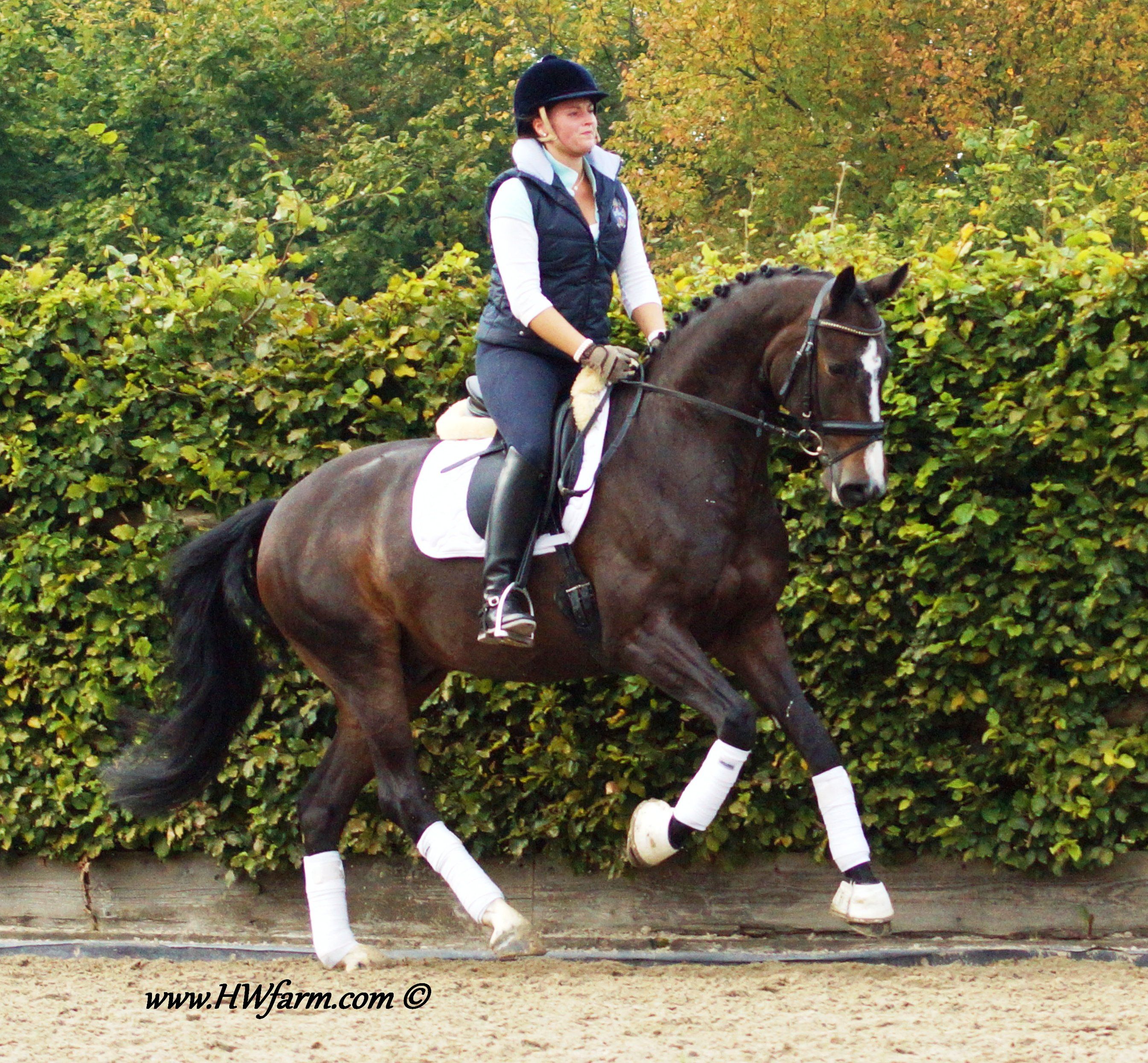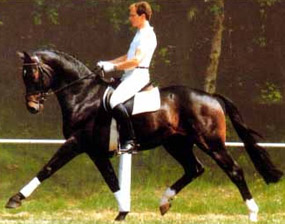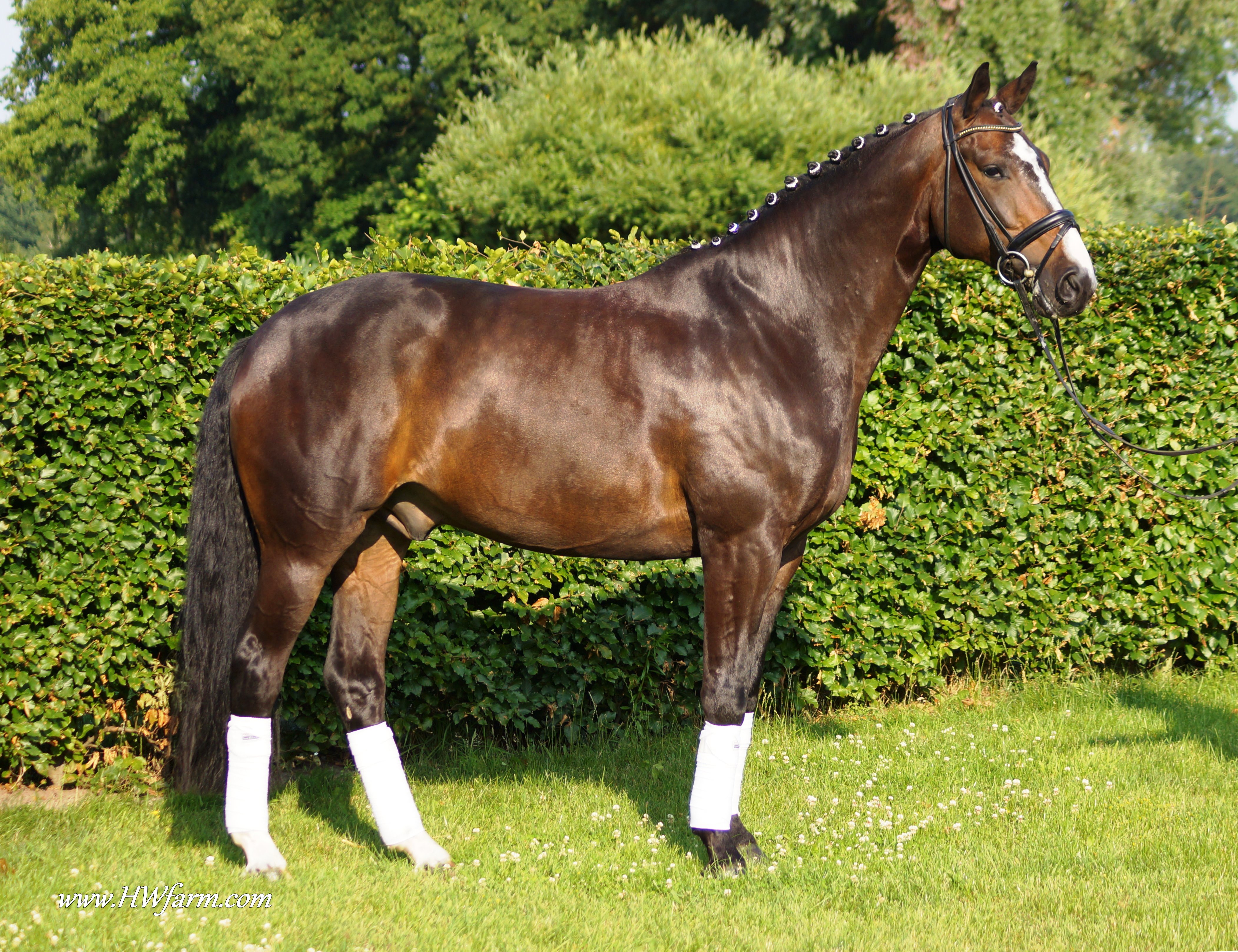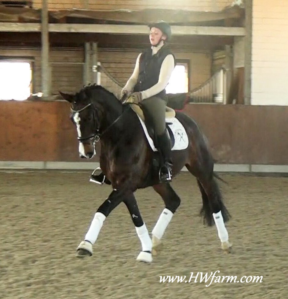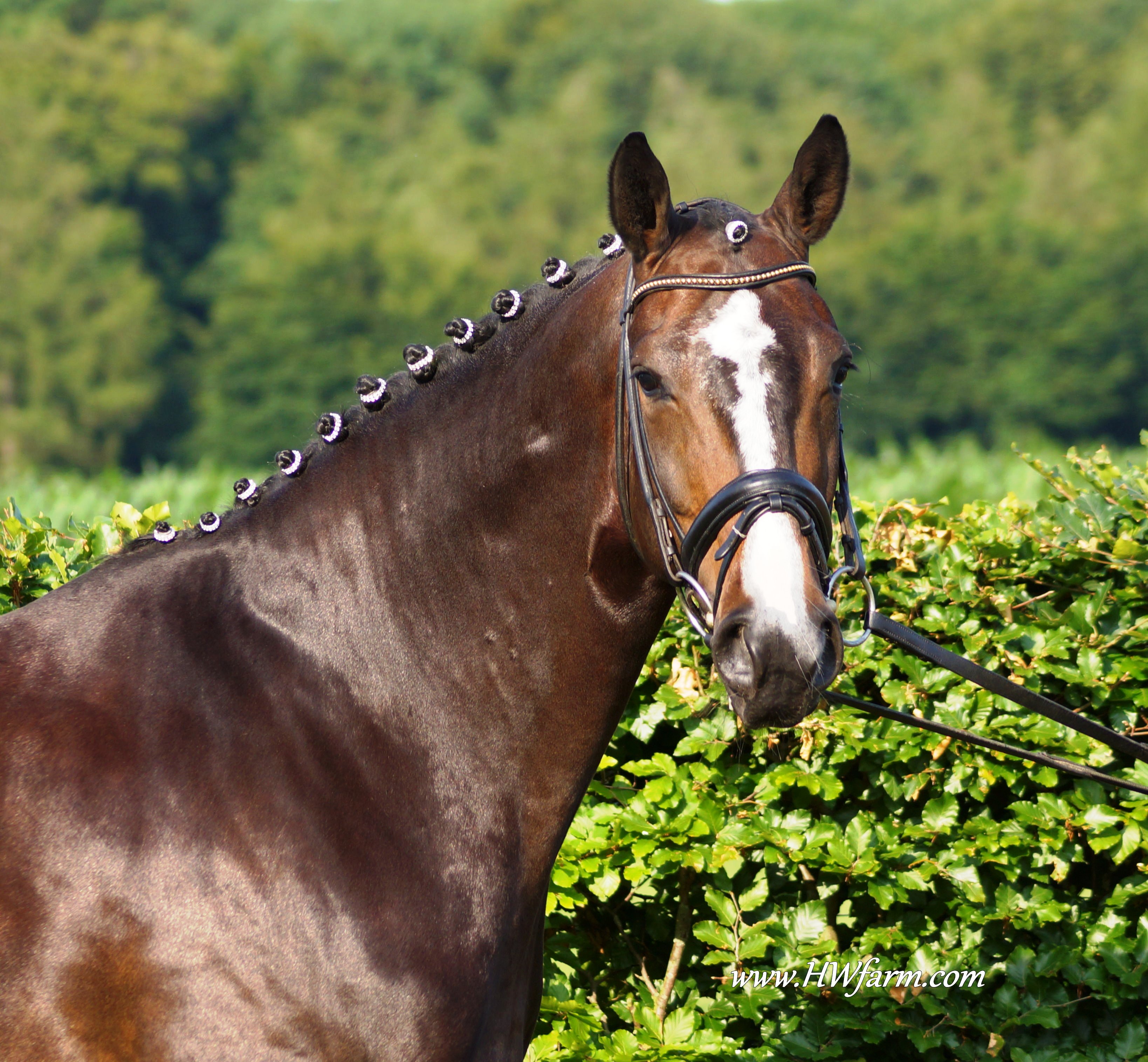 Festival HW, bay Rhineland gelding by Flatley/Grosso Z, born 2008, standing approximately 164 cm or 16.1 hands. Festival HW is a young star who knows how to impress due to his type, movement and character. His sire Flatley is owned by Isabell Werth, she had discovered him as a foal. This fascinating stallion was, with Isabell Werth was in the saddle, highly successful at the International Dressage Show. In previous years, Flatley had put his exceptional skills to the test already: In 2008 he was nominated for the VTV Championships at the NRW main in Munster. In 2009, he qualified for the National Championships. "He has good approaches to serious lessons, is willing to work and has a great character," says Isabell Werth. His first foal crop brought the former state champion and one approved son. His foals have been decorated several times with gold and achieved top prices at auctions. The first offspring under saddle are already victorious in young horse tests. The competition genes are in the blood, Flatley is by the famous Fürst Piccolo, a 100 Day Performance Test Winner! Fürst Piccolo's sire Fidermark was the vice champion of the NRW approvals in 1994 and won the Warendorf state stallion performance test with a big margin in 1995. Further successes followed in 1996. He dominated the "Optimum of Westphalian Riding Horses" sovereignty in Munster . He also became the Buneschampion in his home town of Warendorf . He then went on to win the LVM stallion championship in Munster Handorf. He has had many wins in the Prix St George and Intermediaire I under Marlies Van Baalen and he is trained by Johann Hinnemann. In 2003 he made his debut successfully at Grand Prix. His first foal crops produced sensational foals. They dominated the Westphalian Foal shows and the NRW elite foal auctions. In 1998 his first approved son Fein Sinn won the 100 day test, the first of several including the impressive moving Fürst Piccolo. He has over 15 licensed sons and many state premium mares to his credit already. He is a sire who will dominate German breeding for many years to come. He is ranked highly on the FN breeding values list. The dam sire Mephistopheles, a son of the Trakehner Mackensen derives from a Romadour II mare, establishing a blood connection to the paternal side via Rheingold. Mephistopheles sired the performance test winner Jacquare. Rembrandt in the third generation was a performance test winner with Trakehner blood. Fürst Piccolo was a premium stallion at the NRW main approval in 1999 and won the 100 day test in 2000 with high scores. He is an amazing moving stallion and his first few foal crops have dominated the Westphalian elite foal auctions.