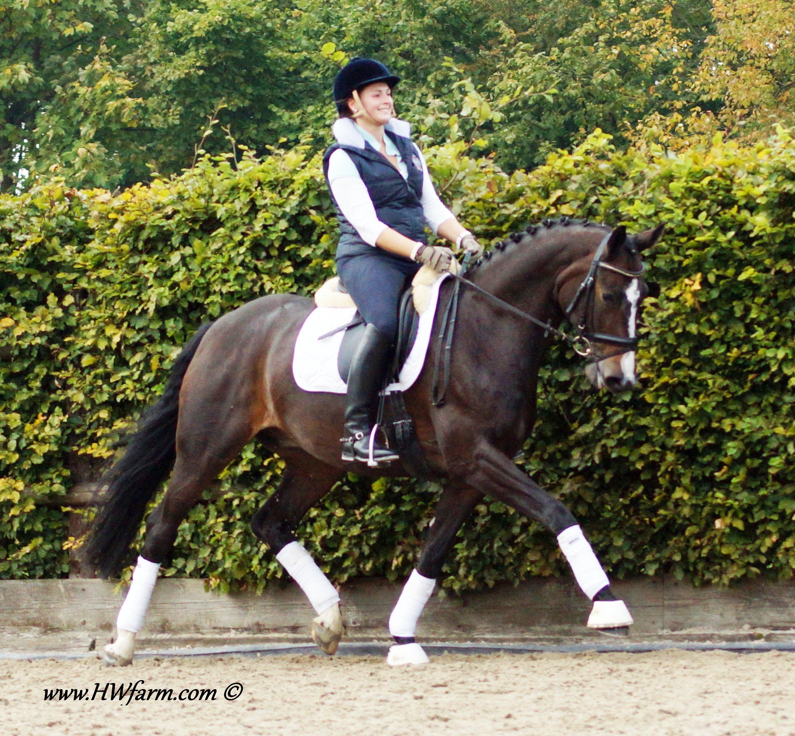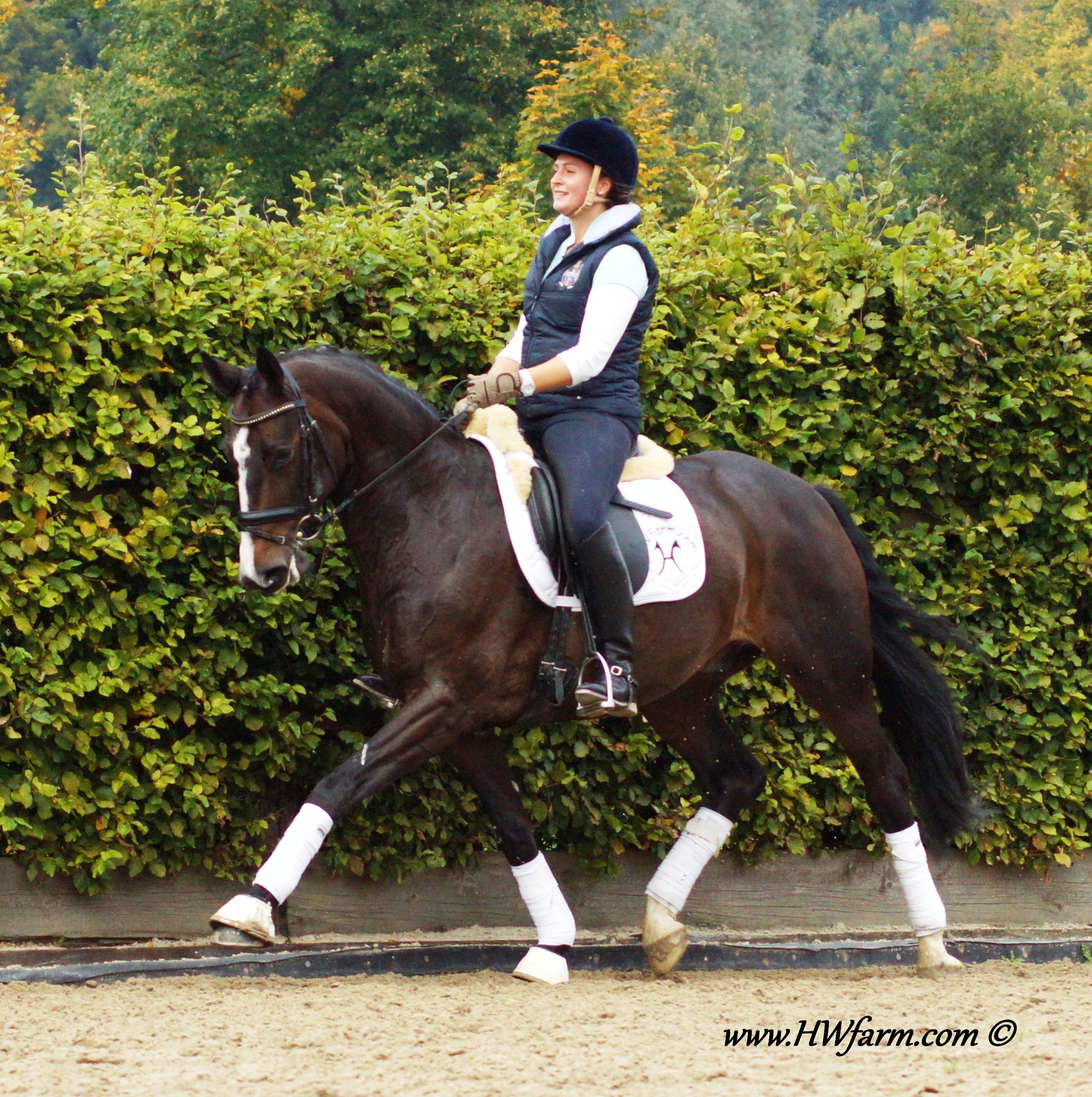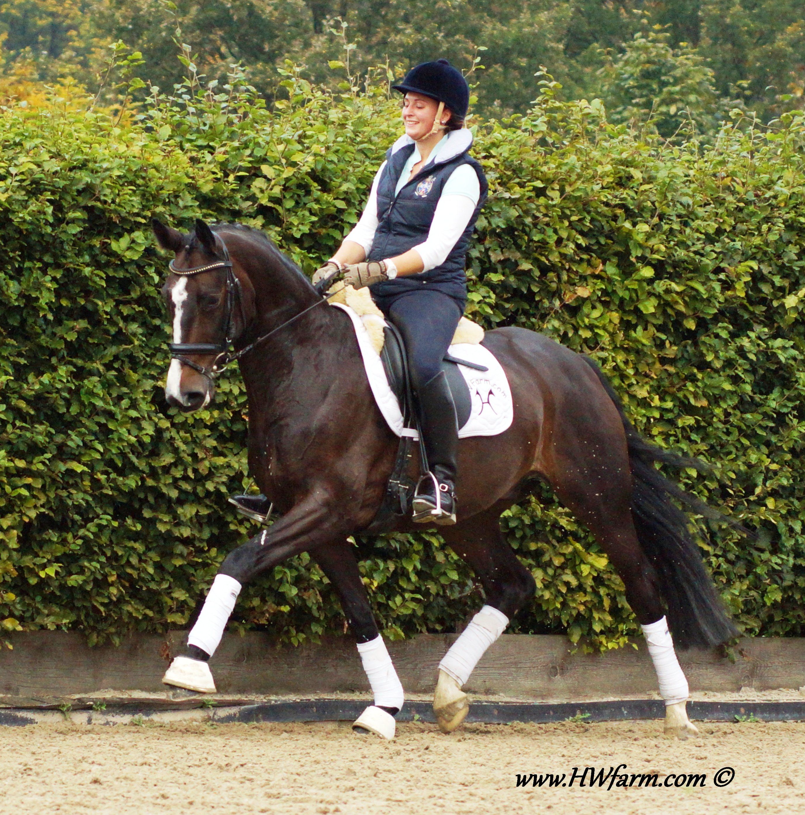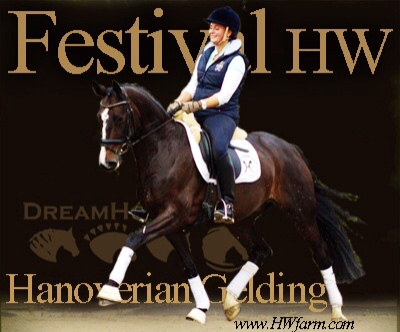 Festival HW's dam is by the famous stallion Grosso Z, he is known to be a performance sire and to produce versatile offspring with a very handable temperament and personality. FN Breeding indices as of 2001: Dressage 132 Jumping 139 A high percentage of his children are showing the upper levels with great success: 13 of his children made it up the levels in dressage, 28 in jumping, 17 are winning in three day events at S-level within Germany's borderlines. Grosso Z also has some show record of his own and placed himself in dressage up to S-level and show jumping up to M-level next to his breeding carreer. Grosso Z has produced international jumping star Goldfever and the international dressage stallion, Goethe. Goldfever has competed under Ludger Beerbaum in two Olympics, a Continental Championship, a World Cup Final and is still competing and winning! Grosso Z is a descendent of the Hanoverian `G` line and a product of Léon Melchior`s Zangersheide. Grosso Z was crowned the Champion Stallion of Belgium and the Champion Stallion of the Stallion Performance test. Festival HW is an elastic mover with lots of schwung and a free shoulder as well as a very good rhythm and balance, the perfect FEI horse. His under saddle work was carefully started in 2011, he is doing really well, already at 2nd level and his ride ability is just amazing. He is a real diamond in the rough. He is willing, forward without being hot and has an outstanding character with a really sweet demeanor. Festival HW will just need to look at you with his soft eyes and you are in love. He is ridden by a young rider as of now and will suit a young rider, adult amateur and has the gaits to impress professionals as well. The judges will love him due to his expression and "show me" attitude, take him to shows and collect your ribbons. He is fun all around and easy to manage in the stall. He is in daily training and progressing really nicely. He will enable you to fulfill your dreams with all his abilities. With this outstanding pedigree, all genes for a successful career under saddle are given. Pretty is, what pretty does? Well, this boy has it all! Festival HW has an outstanding walk, a super canter and a great rhythm and schwung in his trot with an elegant technique. He has a strong motor and a free shoulder, he is very impressive in his movements and he has the look at me attitude which will grab the attention from onlookers and judges alike. He is the modern type with an outstanding confirmation and comes in a pretty color and definitely the looks of a stallion (even as he is a gelding!). His exterior as well as his interior could not be any better. He knows how to be cross tied, he loves to get a shower, goes in the hot walker and enjoys his time in the solarium. He is an all around dream horse for the ambitioned rider. Festival HW is a true gentleman so to speak. He is sweet, cuddly, thrives for attention and has the quality stars are made of as well as a super pedigree, what more could you ask for? He is the partner you were looking for all along! X-rayed! Please contact Irene: Irene@HWfarm.com 239-772-7722 (ask for Irene, managing member of Horse Sales LLC) We take pride in answering every e-mail right away (at least at the same day) and to return each call. If you don't get a reply - please try again, our spam filter might have gotten in the way?!