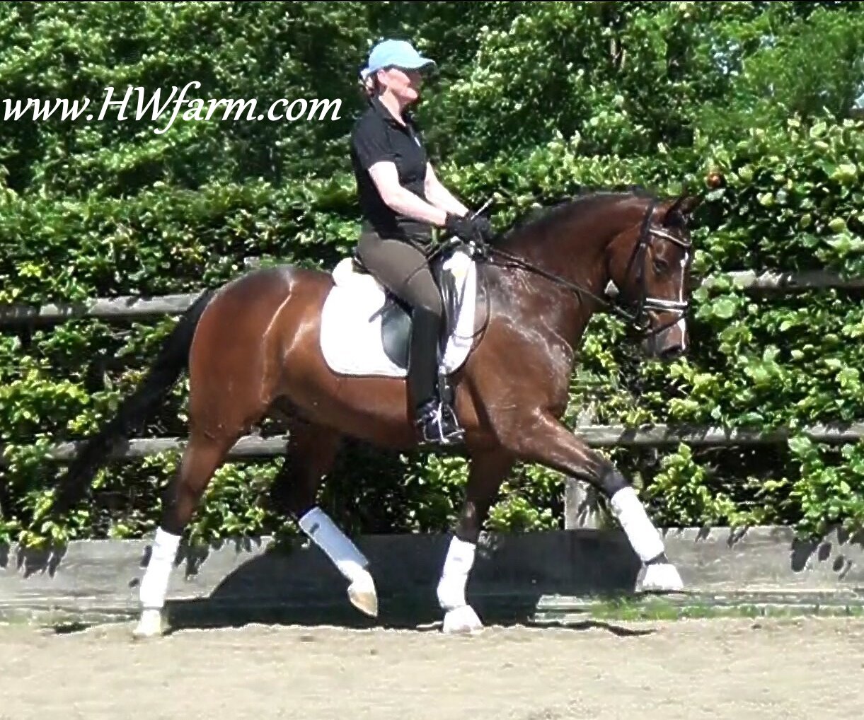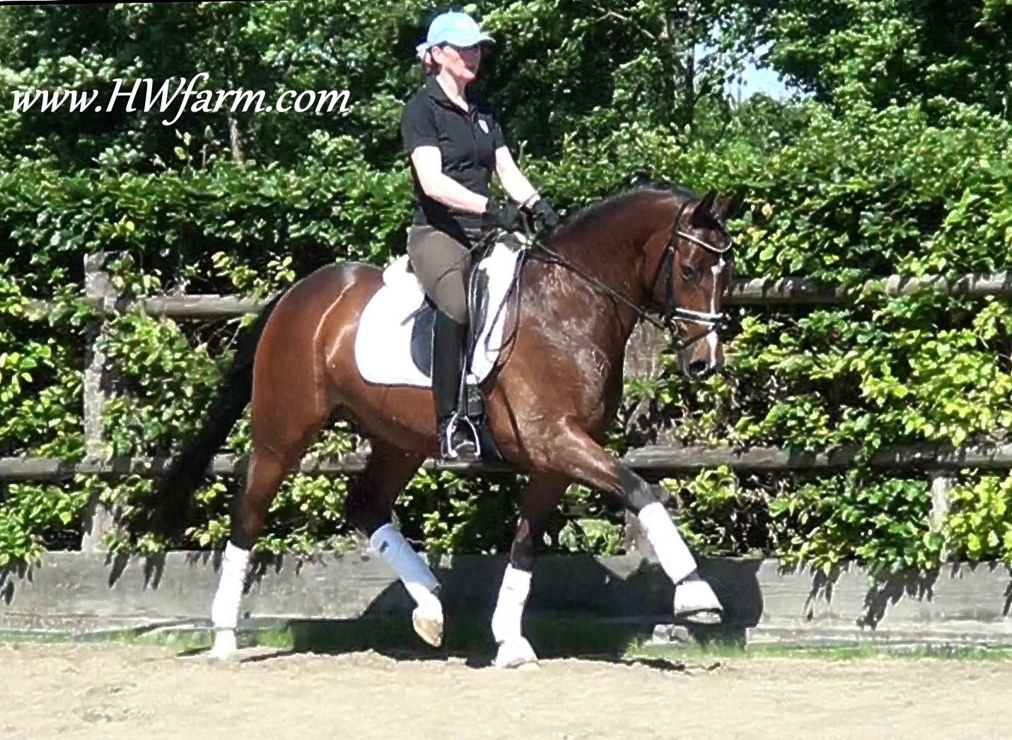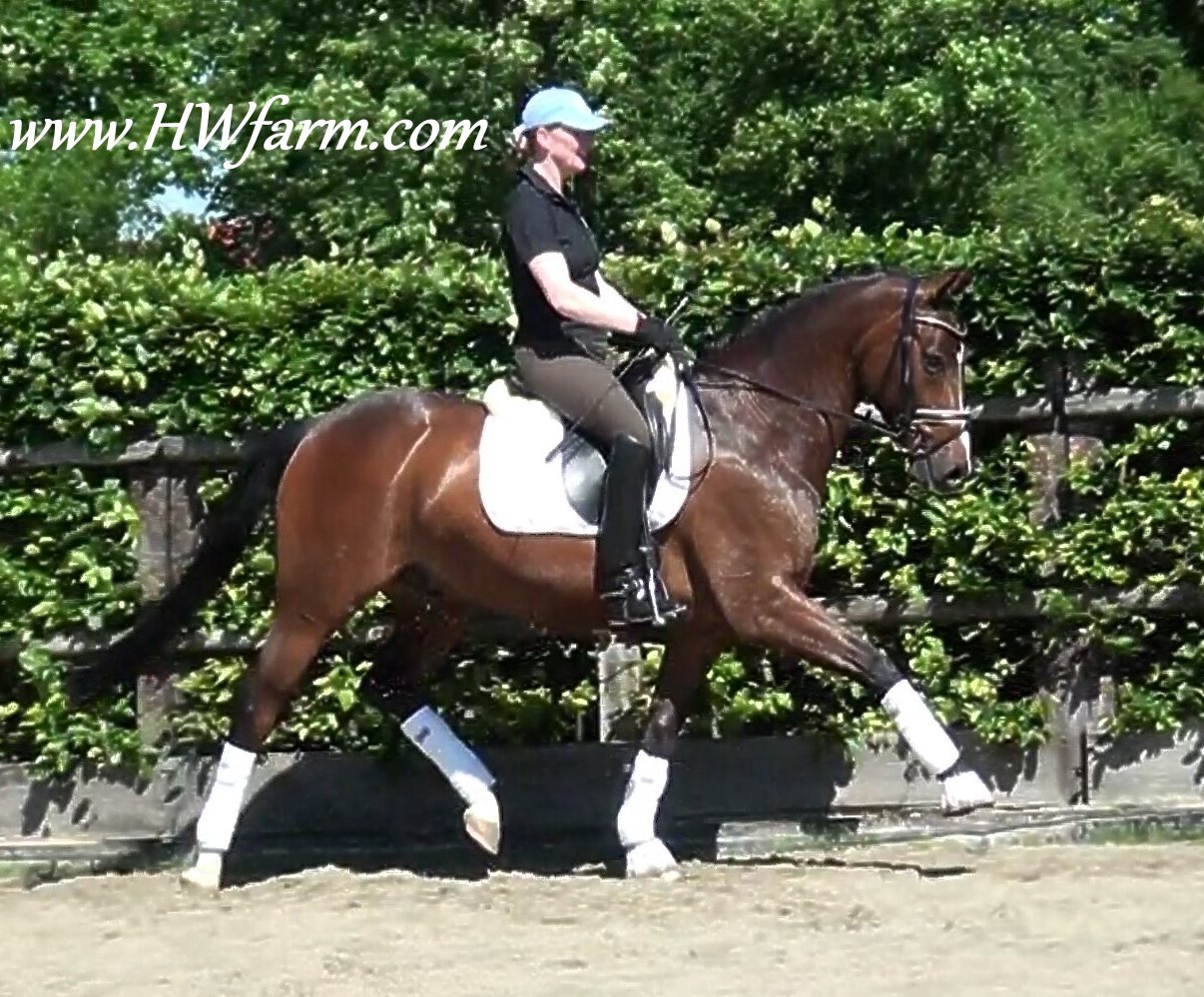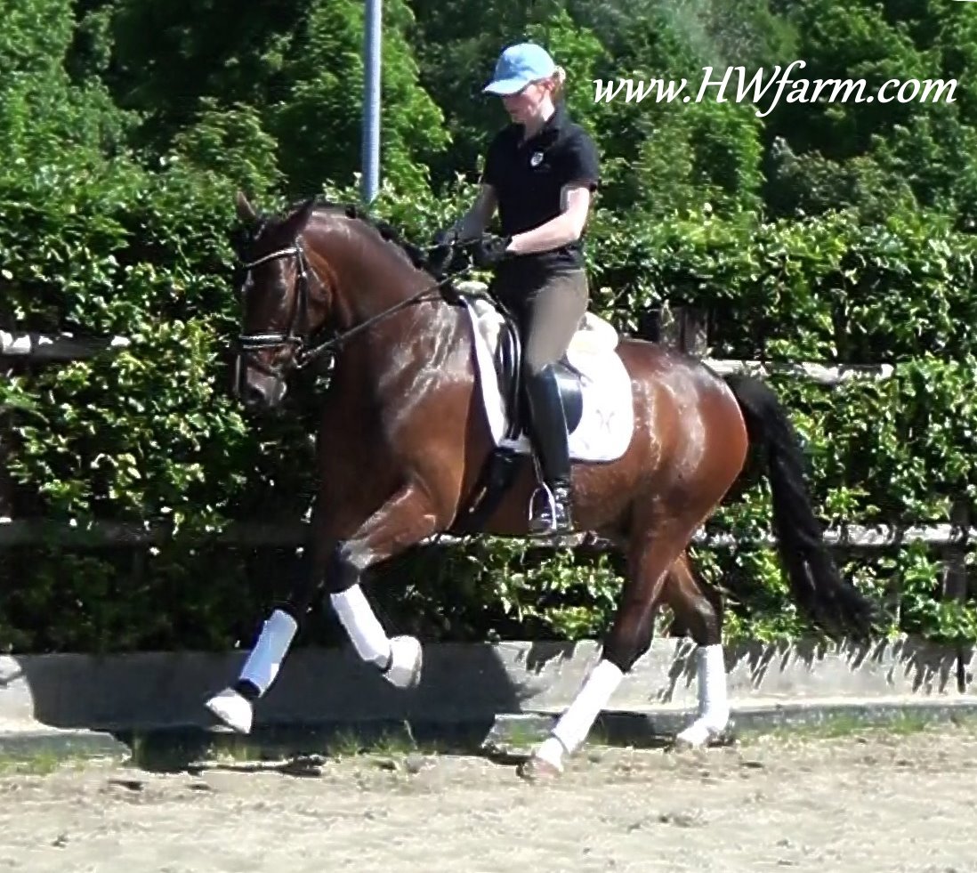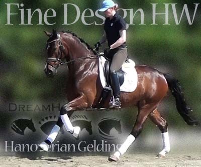 Fine Design HW, bay Rhinelander gelding by Fidertanz/Donnerschlag, born in 2007, standing approximately 163 cm or 16 hands Nobel and elegant, Fidertanz genes merge with Donnerhall heritage. Fine Design HW is a charming young gentleman with great bloodlines. He is by the top star of the 14th Westphalian stallion licensing in 2004, Fidertanz. With standing ovations he left the arena and became champion stallion. His exceptional basic gaits, brilliant jumping manner, balanced nature and perfect conformation hasn't given rise to any doubt about this victory. His sire Fidermark won the stallion performance test, was National Young Horse Champion, winner of the Optimum and Grand Prix tests. His dam sire Ravallo also won the stallion performance test with a total index of 155 points (dressage 157.52 points - 1st range, jumping 127.7 points - 5th range). Frühlingstraum II has been regarded as one of the pillars of the Westphalian breeding. With Romadour II Fidertanz has been inbred three times to the famous Ramzes x. Fidertanz' dam, grand dam and grand-grand dam were state premium mares. Lots of approved stallions and highly successful sports horses derive from this damline. The Westphalian licensing champion of 2005, Fidertanz, was proclaimed Hauptpraemium Sieger during the stallion parade. Out of a group of 7 stallions, Fidertanz was selected as best stallion. Owned by Wahlers and Böckmann, Fidertanz scored well in his performance test and the Oldenburg Verband was especially impressed with his first crop of foals. Fine Design HW's dam is by Donnerschlag. For many years the main sire at St. Ludwig, Donnerschlag left his distinctive mark on an era of breeding at the respected stud. His career had many high points,". . . enough to fill a book." At his 1990 stallion performance test, he showed a multitude of talents. In 1993 he was winner of a finals class at the Federal Championship for dressage horses, at Manheim. Donnerschlag posted many wins and placings at Grand Prix and World Cup , Intermediare level. His sire, Donnerhall was a stallion of legendary proportions, who achieved the unbelievable sire production index for dressage of 274 points! His dam, Pirola was a full sister to Pik Bube I and II. Bred to Raphael she bred the stallion Regazzo, now in Sweden. Her dam line is based on international jumper Dohlenfürsten. As a sire Donnerschlag has excelled--he has over two dozen offspring competing in "S" dressage, and a large number of gold medal and high-priced auction foals. He also has a large number of approved sons, including Dream of Heidelberg I and II, Donnerwind, and many more. His son Fontainbleu is a dressage champion in France. Donnerschlag's daughter Dona won the Rheinland elite mare show in 1998, and Donna Doria the Oldenburg elite mare show and the state riding championship. Fine Design HW is a typical Fidertanz son, he will catch your attention with his beauty and elegance. A true eye candy. He has three very good basic gaits. Stunning uphill canter, the trot swings nicely through his body, with an active hindleg and free shoulder. His walk is always rhythmic, no matter if collected or extended walk. Everybody will love this one, the judges and the audience alike will be excited to see him. He is highly successful in L-Dressage (equivalent to 2nd level, in the snaffle and double bridle), with scores up to 7.4 and 2nd place in a group of 42 horses. He is a horse willing to learn daily, very sweet and with his super work ethic and attitude, a horse that fascinates his rider every day of the year. He is so much fun. Even kids bring him out to and back in from the pasture in Germany, a small horse, with a very big heart. The rider in the video is 174 cm or 5.8' and looks just fine on him as well as he'd truly be a lady's horse for a smaller person if desired. He's looking for his life partner to go out and keep up his successful competition record. He is truly uncomplicated on the ground and under saddle. He's just a sweetheart all around. Fine Design HW is suitable for an amateur, young rider or professional alike to continue his training and go on from there. He is easy to easy to sit and behaves like a much older horse. He gets along well with other horses and loves human attention. He is very level headed. He wants to be in your pockets all the time and thrives for his personal grooming time. Loads and bathes and is pleasant all around as well as a super partner. He is ready to go to his new owner and impress with his looks and potential for the upper level. This boy will go his way up the levels with ease and fun, hopefully you will be the one guiding him there and getting all the nice compliments you are looking for. X-rays on file! Contact Irene at: Irene@HWfarm.com 239-772-7722 (ask for Irene, managing member of Horse Sales LLC) We take pride in answering every e-mail right away (at least at the same day) and to return each call. If you don't get a reply - please try again, our spam filter might have gotten in the way?!