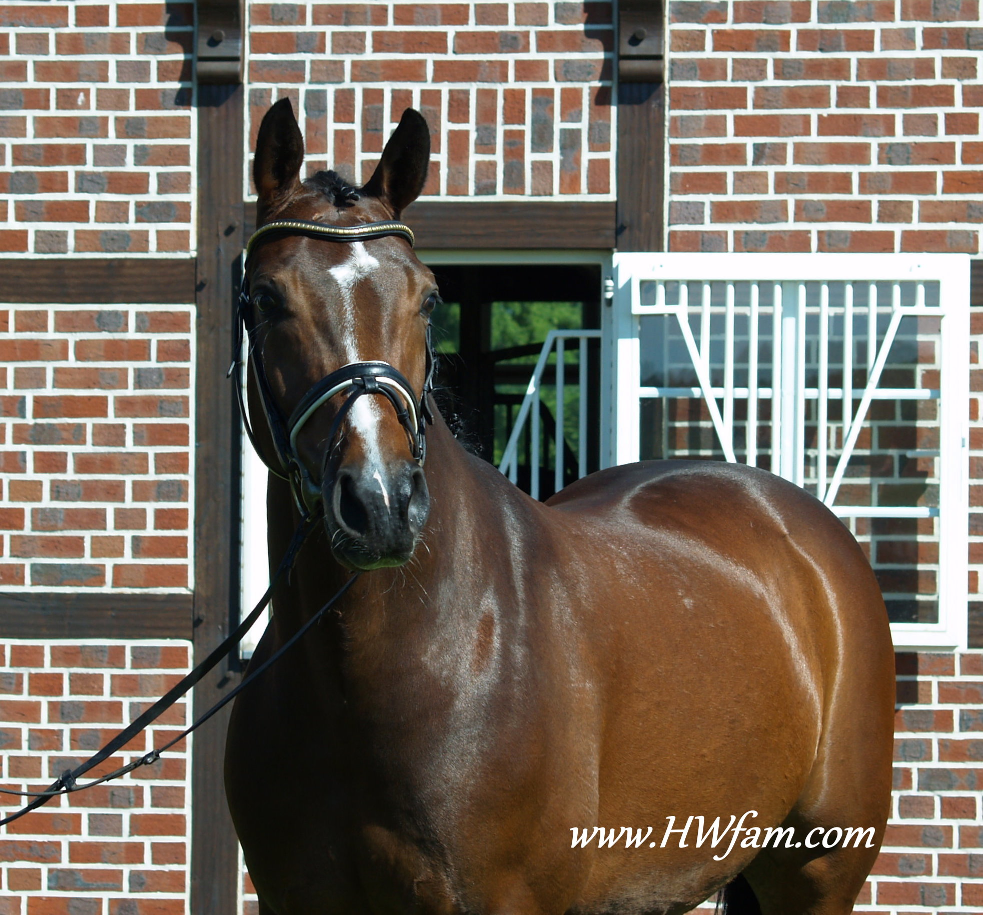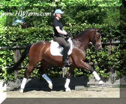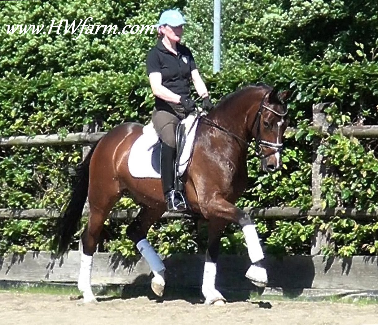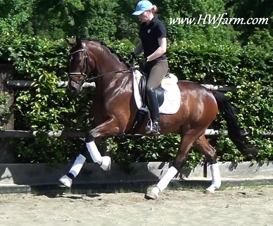 Fine Design HW, bay Rhinelander gelding by Fidertanz/Donnerschlag, born in 2007, standing approximately 163 cm or 16 hands Nobel and elegant, Fidertanz genes merge with Donnerhall heritage. Fine Design HW is a charming young gentleman with great bloodlines. He is by the top star of the 14th Westphalian stallion licensing in 2004, Fidertanz. With standing ovations he left the arena and became champion stallion. His exceptional basic gaits, brilliant jumping manner, balanced nature and perfect conformation hasn't given rise to any doubt about this victory. His sire Fidermark won the stallion performance test, was National Young Horse Champion, winner of the Optimum and Grand Prix tests. His dam sire Ravallo also won the stallion performance test with a total index of 155 points (dressage 157.52 points - 1st range, jumping 127.7 points - 5th range). Frühlingstraum II has been regarded as one of the pillars of the Westphalian breeding. With Romadour II Fidertanz has been inbred three times to the famous Ramzes x. Fidertanz' dam, grand dam and grand-grand dam were state premium mares. Lots of approved stallions and highly successful sports horses derive from this damline. The Westphalian licensing champion of 2005, Fidertanz, was proclaimed Hauptpraemium Sieger during the stallion parade. Out of a group of 7 stallions, Fidertanz was selected as best stallion. Owned by Wahlers and Böckmann, Fidertanz scored well in his performance test and the Oldenburg Verband was especially impressed with his first crop of foals. Fine Design HW's dam is by Donnerschlag. For many years the main sire at St. Ludwig, Donnerschlag left his distinctive mark on an era of breeding at the respected stud. His career had many high points,". . . enough to fill a book." At his 1990 stallion performance test, he showed a multitude of talents. In 1993 he was winner of a finals class at the Federal Championship for dressage horses, at Manheim. Donnerschlag posted many wins and placings at Grand Prix and World Cup , Intermediare level. His sire, Donnerhall was a stallion of legendary proportions, who achieved the unbelievable sire production index for dressage of 274 points! His dam, Pirola was a full sister to Pik Bube I and II. Bred to Raphael she bred the stallion Regazzo, now in Sweden. Her dam line is based on international jumper Dohlenfürsten. As a sire Donnerschlag has excelled--he has over two dozen offspring competing in "S" dressage, and a large number of gold medal and high-priced auction foals. He also has a large number of approved sons, including Dream of Heidelberg I and II, Donnerwind, and many more. His son Fontainbleu is a dressage champion in France. Donnerschlag's daughter Dona won the Rheinland elite mare show in 1998, and Donna Doria the Oldenburg elite mare show and the state riding championship. Fine Design HW is a typical Fidertanz son, he will catch your attention with his beauty and elegance. A true eye candy. He has three very good basic gaits. Stunning uphill canter, the trot swings nicely through his body, with an active hindleg and free shoulder. His walk is always rhythmic, no matter if collected or extended walk. Everybody will love this one, the judges and the audience alike will be excited to see him. He is highly successful in L-Dressage (equivalent to 2nd level, in the snaffle and double bridle), with scores up to 7.4 and 2nd place in a group of 42 horses. He is a horse willing to learn daily, very sweet and with his super work ethic and attitude, a horse that fascinates his rider every day of the year. He is so much fun. Even kids bring him out to and back in from the pasture in Germany, a small horse, with a very big heart. The rider in the video is 174 cm or 5.8' and looks just fine on him as well as he'd truly be a lady's horse for a smaller person if desired. He's looking for his life partner to go out and keep up his successful competition record. He is truly uncomplicated on the ground and under saddle. He's just a sweetheart all around. Fine Design HW is suitable for an amateur, young rider or professional alike to continue his training and go on from there. He is easy to easy to sit and behaves like a much older horse. He gets along well with other horses and loves human attention. He is very level headed. He wants to be in your pockets all the time and thrives for his personal grooming time. Loads and bathes and is pleasant all around as well as a super partner. He is ready to go to his new owner and impress with his looks and potential for the upper level. This boy will go his way up the levels with ease and fun, hopefully you will be the one guiding him there and getting all the nice compliments you are looking for. X-rays on file! Contact Irene at: Irene@HWfarm.com 239-772-7722 (ask for Irene, managing member of Horse Sales LLC) We take pride in answering every e-mail right away (at least at the same day) and to return each call. If you don't get a reply - please try again, our spam filter might have gotten in the way?!