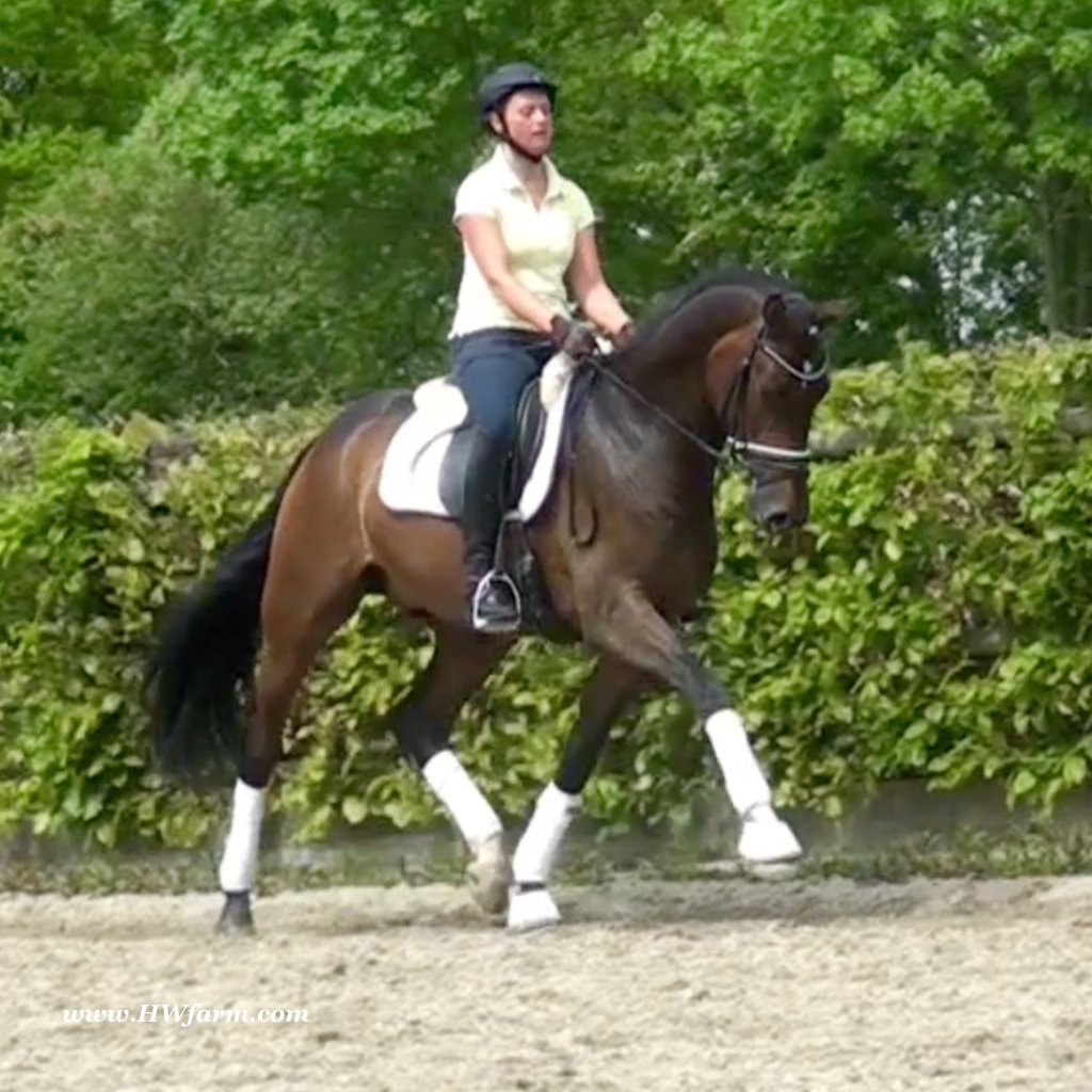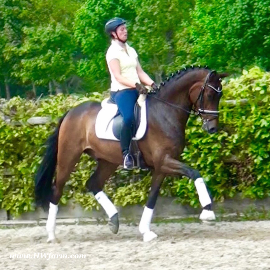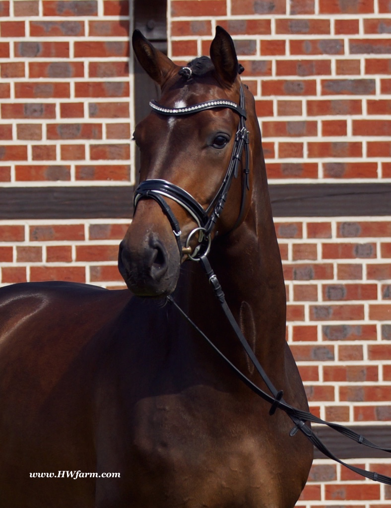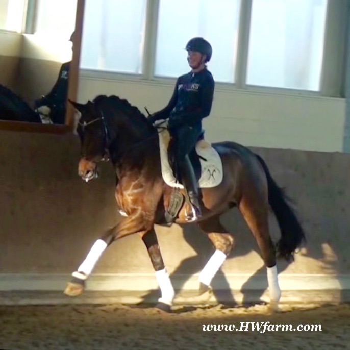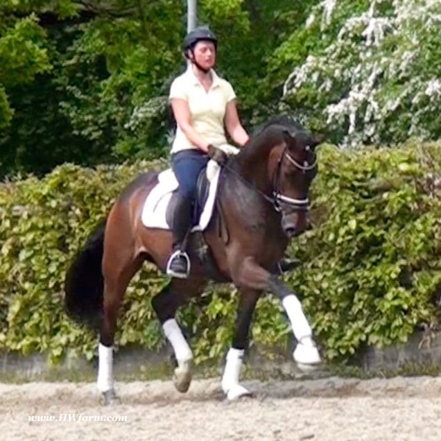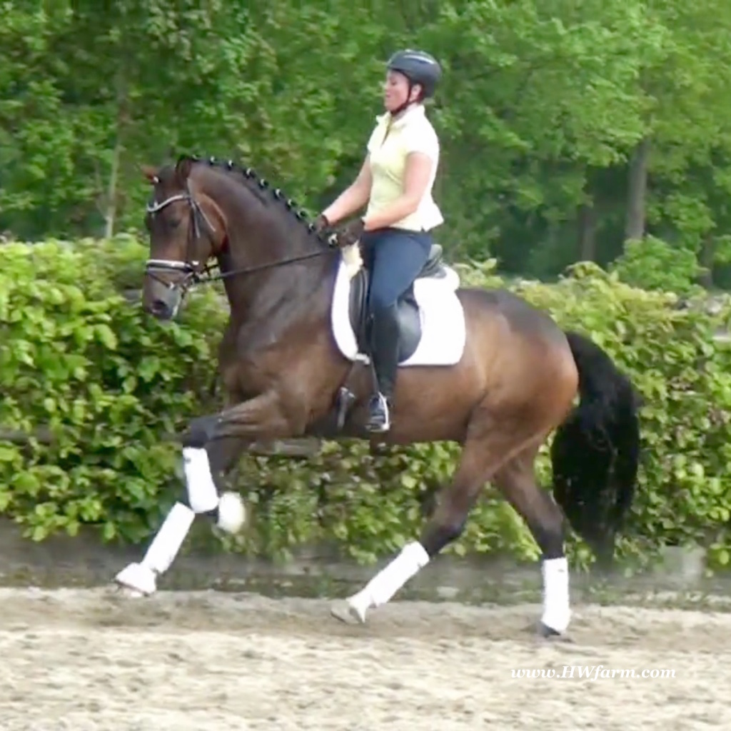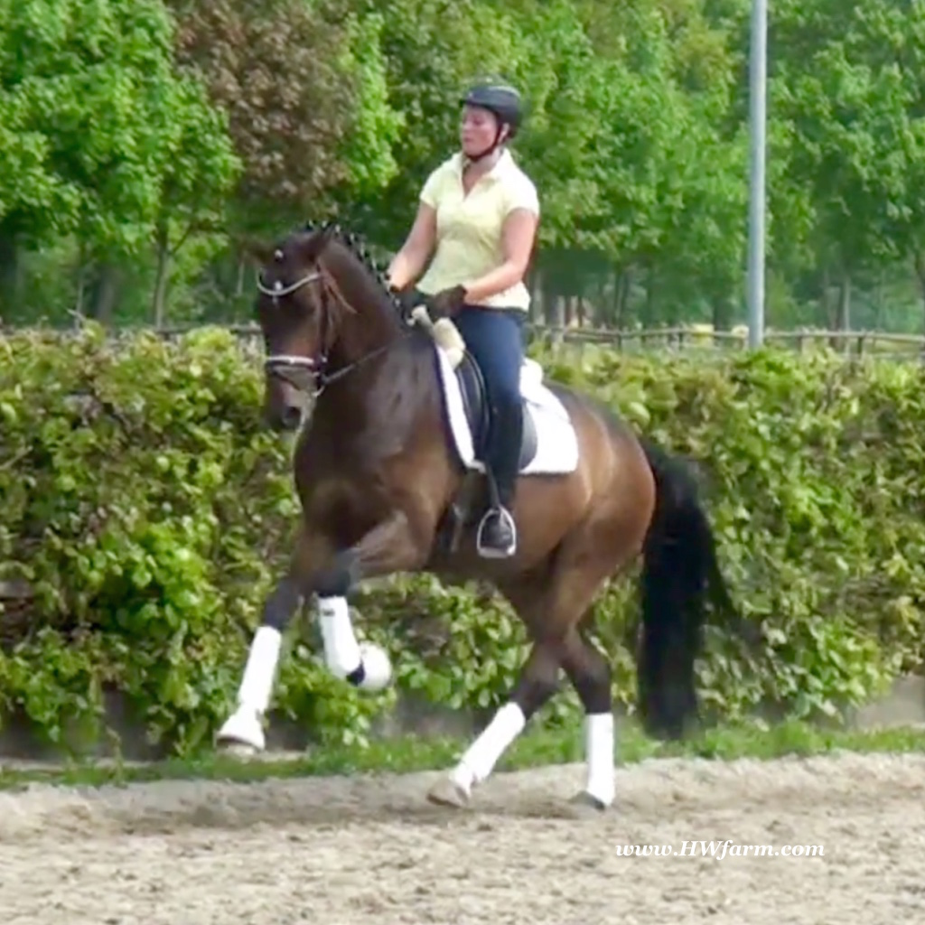Dimension himself (by Donnerhall x Akzent II), passed away at age 22. Bred by Brigitte Pahl, Dimension was licensed in Munster in 1993. He competed up to M level and sired two licensed sons, Diderot and Don Camillo. Dimension was successful up to 3rd level dressage and 2nd level jumping, he was licensed in Münster-Handort and stood with the Oldenburg stallion station Höffmann. Dimension produced highly sought after offspring, a 1996 colt, named Der-rik, sold at Deutsche Mark 38.000 and the cold Doudly sold at Deutsche Mark 44.000, really super high prices, especially concerning the earlier times in the horse world. Two of his sons are licensed, Diderot and Don Camillo. Dimension had around 300 actively competing offspring, also the 4th level dressage horses Don Herny/Johan Vanthienen and Donar Ass/Carline Mümken. Dimension (full brother to De Niro): Fine Magic HW makes all dreams come true. He is a horse of highly sought after quality and a super fancy mover, who knows to impress due to his type, movement and work ethic, combined with an excellent self carriage and balance! Truly beautiful in- and exterior, with a super nice, mesmerizing head. Fine Magic HW is a very sweet boy and has the talent to do it all. With his sane attitude, he's easy to ride and trustworthy. He is an elastic mover with lots of impulsion, has a free shoulder as well as a very good rhythm, the perfect future FEI horse. He is truly breathtaking! This boy has a very active hind leg, reaching far under his belly. Check out his dynamic trot and beautiful uphill canter! Super smart, far advanced for his age and always willing to learn new things, he's already at 2nd level! Amazing lofty, well balanced counter canter and fantastic lateral work come easy to him. Fine Magic HW, or call him Magic Mike in the barn - if you'd like, will climb up the levels with ease. All exercises come naturally to him, as he has the built, movement and athleticism to work in dressage and he sure will excel in piaffe and passage. This extremely talented gentleman has international potential. Fine Magic HW will just look at you with his soft eyes and cast his love spell. The judges will recognize him due to his expression and "show me" attitude, take him to shows and collect your ribbons. Show him off at clinics and get yourself noticed. He is fun all around. He is in daily training and progressing really nicely, raised and correctly handled at the same barn all his life, in knowledgable hands and daily attention to all details. He grew up in a small stallion herd and is used to paddock time and was socialized correctly. Fine Magic HW is easy to handle in hand and under saddle, just an all around super baby, looking for his new mommy. The goal of HW Farm is, to raise and train highly talented young horses in Germany for riders in the USA and all over the world. Fine Magic HW, is a phenomenal dressage gelding, but is super athletic and would also excel in other disciplines. X-rays on file! Please contact Irene: Irene@HWfarm.com 239-772-7722 (ask for Irene, managing member of Horse Sales LLC) We take pride in answering every e-mail right away (at least at the same day) and to return each call. If you don't get a reply - please try again, our spam filter might have gotten in the way?!