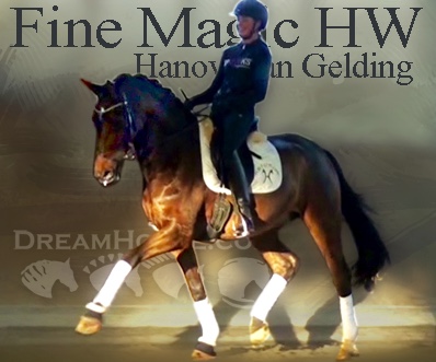 | Fine Magic HW, bay Westphalian gelding, by Fineliner/ Dimension born in 2011, standing approximately 169 cm or 16.2 hands. Fine Magic HW's sire is the premium stallion Fineliner. He competed successfully at the Bundeschampionat 2009, for the Hanoverian Association and was also qualified, for the 2010 Bundeschampionat. The blackbay stunner Fineliner is by Florencio x Regazzoni x Silvio I. This long-legged movement artist, makes hearts beat faster. That in combination with his stunning and sincere character complete this wonderful horse. He is also very convincing under saddle. He presents himself with a lot of balance, a lot of schwung and moves uphill. That the immense talent of Fineliner is not a coincidence, is proven by the impressive result list of his young sire Florencio. In Verden, Florencio became World Champion Young Horses as a five year old, as well as a six year old, at the Bundeschampionat he became reserve champion and his performance test he won with notes you can only dream of. The dam line of Fineliner is an in Germany highly appreciated line. Out of this dam line descent international jumping horses and Olympic horses such as: Don Rudolpho / Franke Sloothaak, Pirol / Helena Weinberg, Piko / Hauke Schmidt, Santana / Olympia Athen and Don Agram / Rene Teb-bel and approved stallions as: Stakato Gold (v. Stakato), Don Rudolpho (v. Dompatz / Franke Sloothaak), Dirano (v. Don Juan), Wiener Franz (v. Wiener Wald) and Gala Star Z (v. Graf gotthard). In 2015, Finliner was super successful in the USA, in Florida, Wellington, with his owner Michael Klimke. They did very well at the international show, winning both Prix St. George tests and the Inter. Here is more info on that: Wellington, Florida (March 24, 2015)- Michael Klimke from Munster, Germany, has been busy during the South Florida winter show season with ride after ride and win after win during the Adequan Global Dressage Festival. His quiet riding with nearly invisible aids on a variety of horses have been rewarded by the judges as well as by Metlar Premium Performance Saddlery, North American distributor of Neue Schule bits. Metlar named Klimke the latest recipient of the Neue Schule Best Hands Award in recognition of his superb hands and excellent contact through the bit with his horses. During the Adequan Global Dressage Festival 10 CDI-W, Klimke and his own Fineliner 2, a 10-year-old Hanoverian gelding (Florencio I-Relana, Regazonni), notched two first-place finishes in the FEI Intermediaire II with a 71.171 percent and a 67.237 percent. "He is in the stage between small tour to big tour," Klimke explained about Fineliner 2. "I won the CDI Prix St. Georges in January with him, and now he has stepped forward to win the Intermediare II. My proudest moment with him is, that I found that he can be a good Grand Prix horse and I know that he's trying hard." Fine Magic HW's dam is by Dimension, a full brother to De Niro! De Niro's sire, Donnerhall, holds the highest dressage breeding value index (271) of all stallions. He placed second among 70 stallions at his performance test and went on to be-come DLG Champion in 1986. Donnerhall won more than 65 FEI Level and Grand Prix competitions and competed successfully until he was retired at 17-years of age. De Niro's dam was a successful dressage competitor producing an Approved stallion in Westfalia. His dam's sire, Akzent II, is regarded as one of the best sires of rideability in modern sport horse breeding producing many Approved stallions and expensive auction horses.