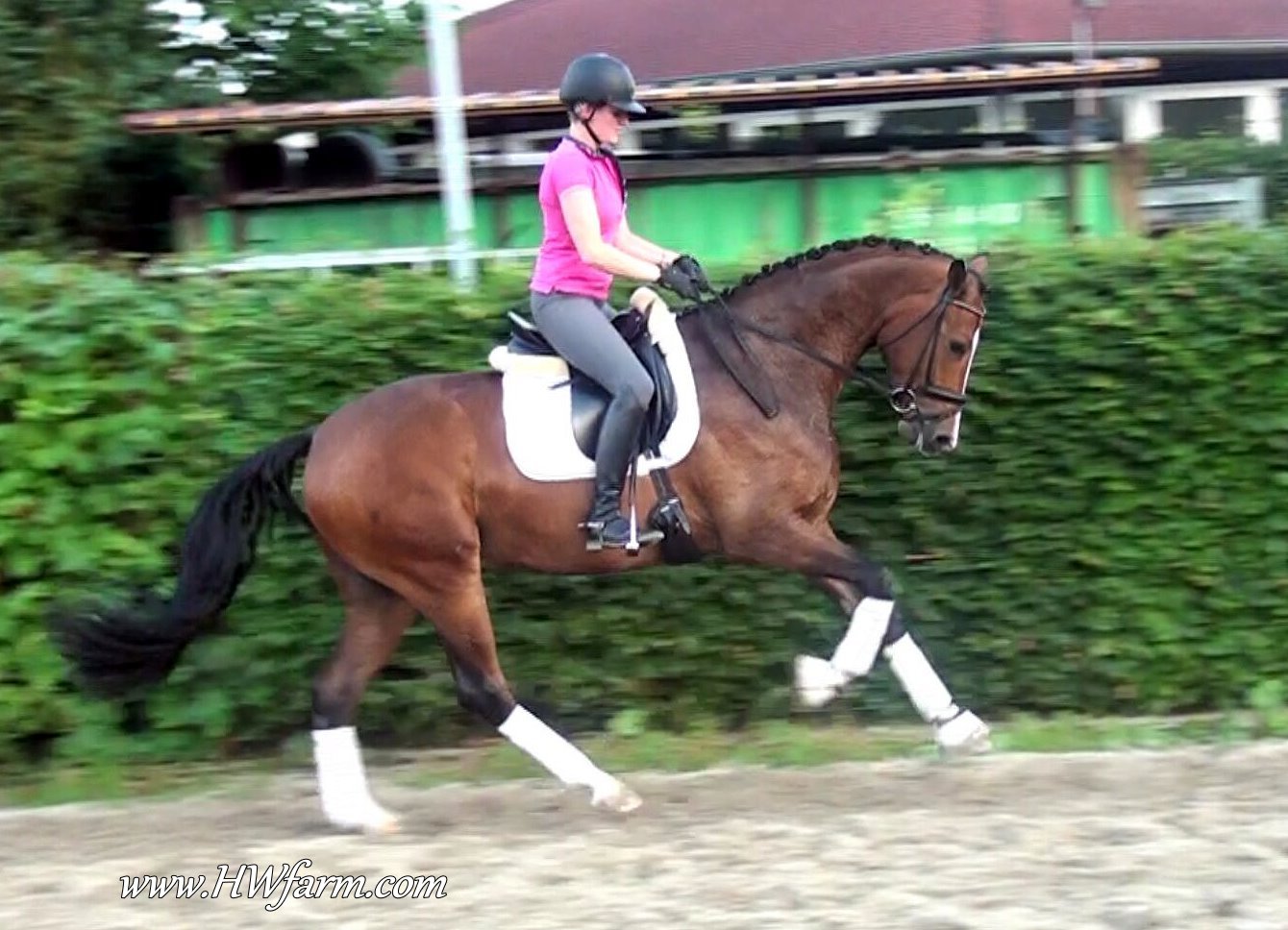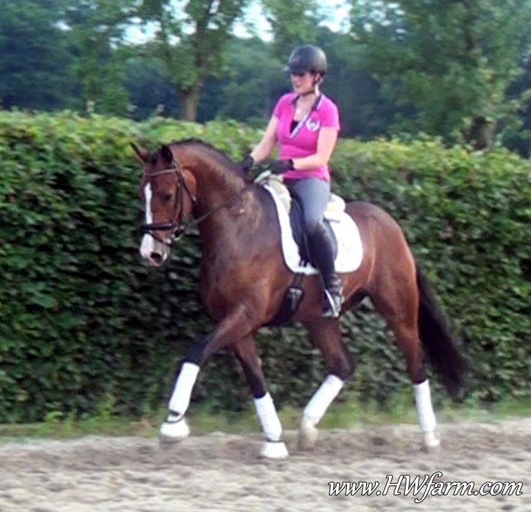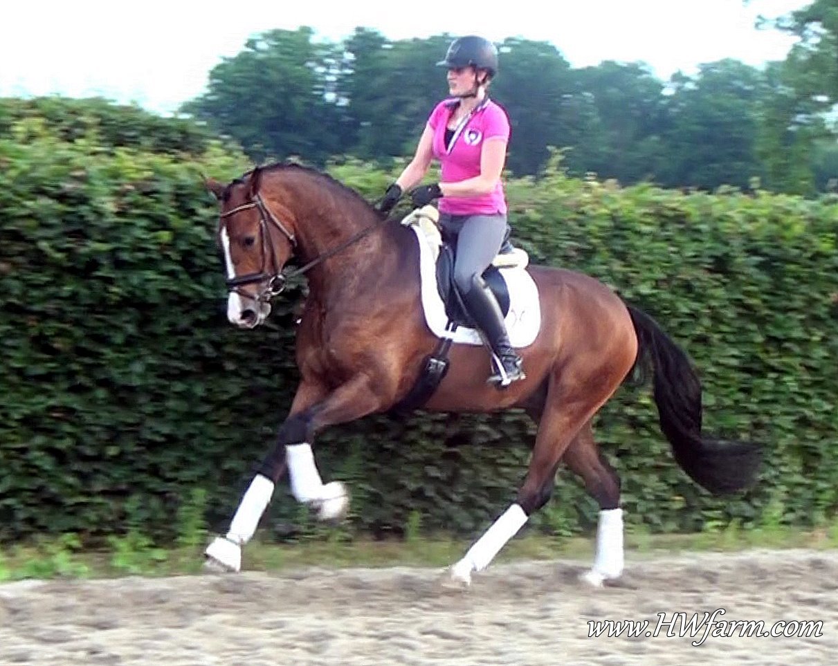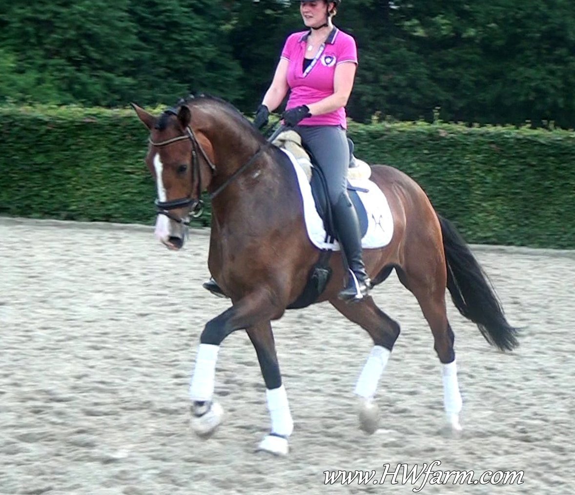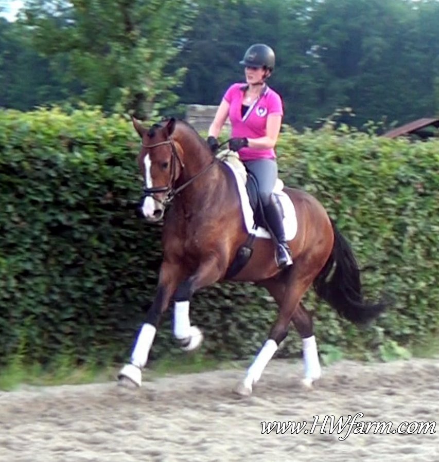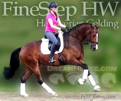 FineStep HW, Westphalian gelding by Florenciano/Medici, born in 2009, standing approximately 168 cm or 16.2 hands. FineStep HW is a noble and elegant young gentleman. He is by the top star Florenciano. Florenciano's sire Florencio I (Florestan/Weltmeyer), became the 2003 Vice Bundeschampion of four year old stallions after winning the Westphalian Champion title in Münster-Handorf. In 2004, after winning the Dutch Pavo Cup under Hans-Peter Minderhoud/NED, he took the title World Champion of five year old dressage horses in Verden with a record score: overall 9.8, with a 10.0 for his canter. In 2005 they repeated this feat at the same venue in the class for six year olds with a total score of 9.5. Florencio I was the sire of numerous top priced auction foals and the champion colt at the German Foal Championships in Lienen. In 2004 the Oldenburg Verband awarded Florencio the main premium with emphasis on dressage. Along with Florenciano, five other sons from his first crop were also licensed in Oldenburg and Westphalia. The dam line has its origins in the Netherlands . The dam, St.Pr.St. Lundi T, won eight M-level dressage tests and was awarded dressage performance mare status. The dam's sire, Havidoff, who is by the Grand Prix stallion, Clavecimbel, received the Dutch "keur" status. Many of his off-spring have been successful up to Grand Prix level such as his licensed son, Paganini. The granddam, Anuska, produced several off-spring that were successful in dressage rings. This dam line also produced the licensed stallion, Zoöloog (by Gondolier), who placed in international dressage, the world class jumper, Mister Spoon (by Zadoc)/Candice King/USA and Nietje (by Ziehim), who won gold at the 2006 WEG in Aachen in the carriage and four class with the Dutch team, as well as numerous State premium mares and auction horses. Performance record: 2010 - a year for sport In addition to wins in dressage competitions of class M ** qualified Florenciano at Hermannsburg in May 2010 for the German Federal Championships of the six year old dressage horses in Warendorf. In addition to the sporting success Florenciano has thus all the conditions associated with the breed recognition complies with flying colors. Genetic sit up he was again. With many auction foal auction on German courts and the winning colt of the mare and foal show in Ratingen, he made repeated attention. 2009 - a year for breeding Because of a very good first crop which consequently increased demand from breeders, Florenciano was made available to breeders for the entire breeding season and only competed in sport occasionally. He was highly successful in these few shows, winning and placing up front in novice (A) and elementary (L) level tests for young dressage horses. 2008 - Florenciano won the Optimum! In the year 2008, Florenciano enhanced his record in sport. With his permanent rider and trainer, the Olympic Game winner Ingrid Klimke in the saddle, he sovereignly won his first novice (A) level test for young dressage horses with a score of 9.0! This victory was immediately followed by another; Florenciano and Ingrid Klimke won the prestigious Optimum, Westphalian's traditional benchmark test for four-year old German riding horses with a total score of 9.0! 2007 - Florenciano puts on a great performance! Florencio finished his 30-day test in Münster-Handorf as the best in the class: His exceptional rideability was rewarded the highest score, a 9.75. But in the other areas as well, this strong type stallion received top scores above 9.0: Character 9.25, trot 9.13, canter 9.19. With a score of 8.13 in jumping, Florenciano proved his over-average talent in this area as well and his walk was given a 7.63. These scores put him at the head of the class. Breeding record: Florenciano's first foal crop was even better than we had dared to dream. At the 19th NRW Pedigree Auction, his colt, Four Season, was the most expensive dressage foal. Four Season Two youngsters qualified for the German Foal Championships. Even Klaus Balkenhol, the Olympic winning rider, bought a little dream mover by Florenciano. "The quality of all of his crops is impressive. The uniformity of the traits Florenciano passes on, his wonderful looks as well as his highly elastic movements, is worthy of special mention." (RuP 08/08 Dr. F. Marahrens, Manager and Breeding Director of the Westphalian Pferdestammbuch) Florenciano is by Florencio, the famous dark bay Westphalian Stallion by Florestan I/Weltmeyer/World Cup I. Florencio won with a record-breaking score at World Championships of the 5-year-old dressage horses in Verden. 10.0 points for the canter, 9.8 for the walk, 9.7 for the trot, 9.6 for the suppleness, and 9.9 points for the overall impression. Astronomical results for a stallion which seems to be from a different sphere: Florencio wins the World Championship of the 5-year-old dressage horses. With the total score of 9.80, the dark bay Westphalian under his Dutch rider Hans Peter Minderhoud established a new championship record. Quote by Hans-Peter Minderhoud: "Florencio is very special. He has a great character and knows exactly when it should happen. He gives a little extra. I am very fond of him. He is very intelligent and really plays with his exercises. He has great talent ". FineStep HW's dam is by Medici, going back to Montmatre and Mon Cheri by Matcho, truly old and steady stallion lines, very popular for their successes and foundation bloodlines. FineStep HW shows typical Florestan heritance, in looks, movement, brains, temperament, he's the total package. He will catch your attention with his beauty and elegance. He is a true eye candy, smart and willing to please. He has three very good, solid basic gaits and is super balanced, working at 2nd level with a steady and uphill counter canter. He is easy to sit and impresses with his stunning, uphill canter, his trot swings nicely through his body with a soft back and an active hindleg as well as a free 