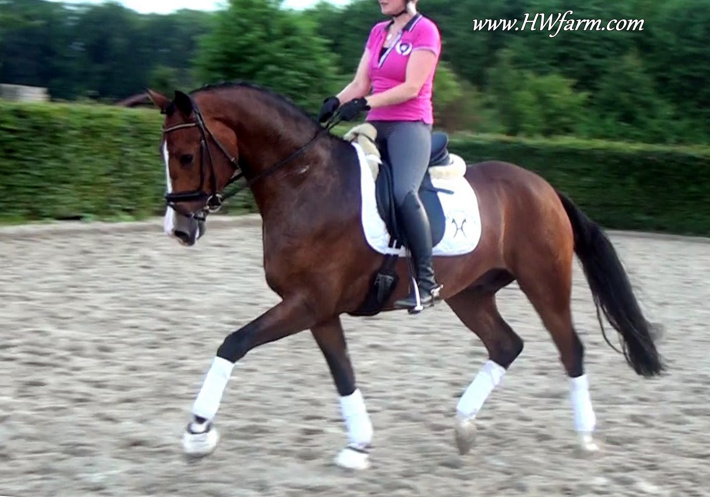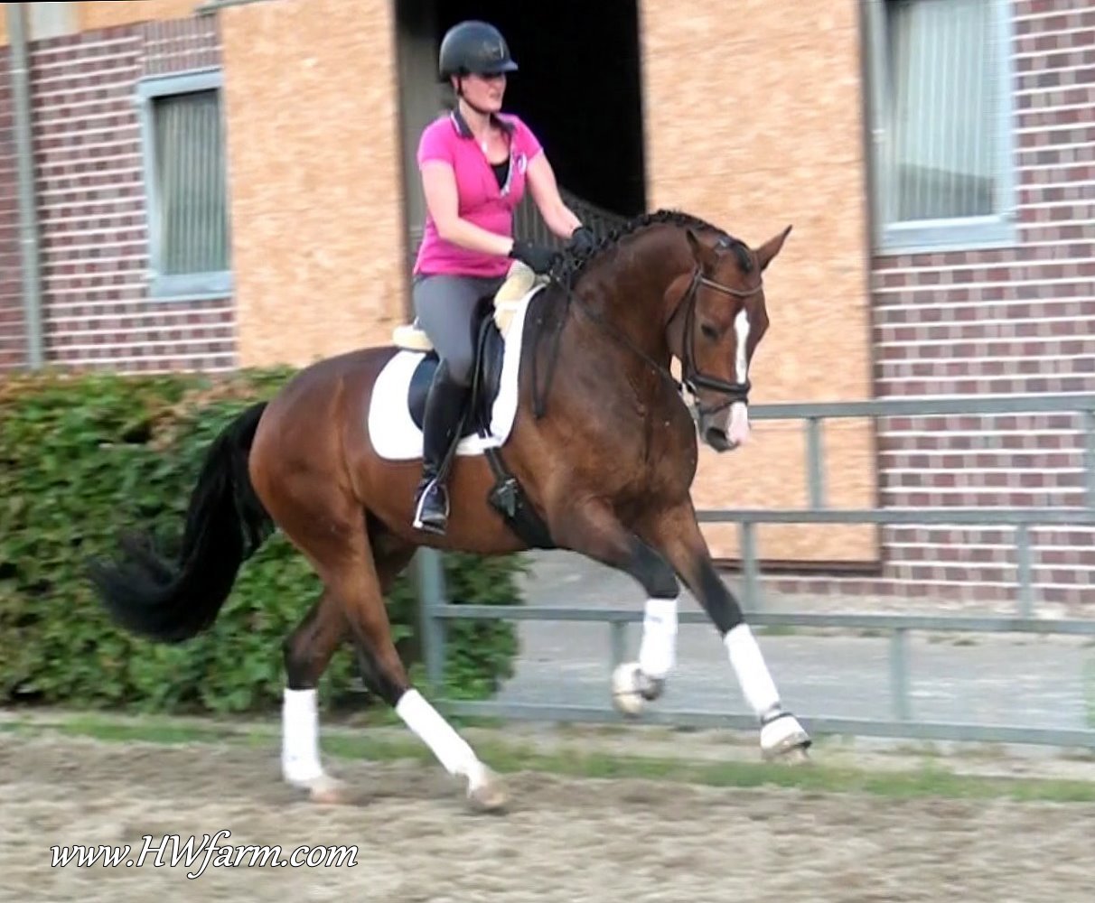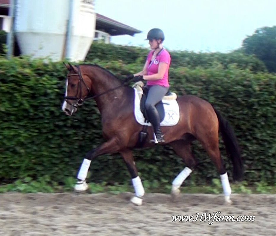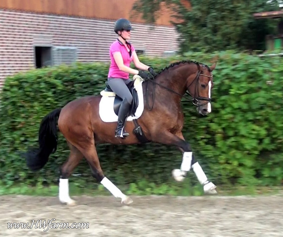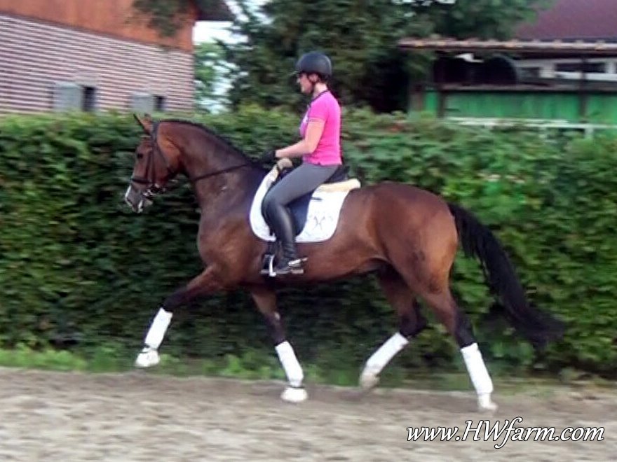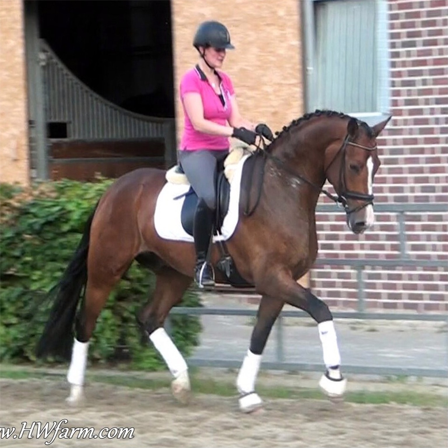 FineStep HW, Westphalian gelding by Florenciano/Medici, born in 2009, standing approximately 168 cm or 16.2 hands. FineStep HW is a noble and elegant young gentleman. He is by the top star Florenciano. Florenciano's sire Florencio I (Florestan/Weltmeyer), became the 2003 Vice Bundeschampion of four year old stallions after winning the Westphalian Champion title in Münster-Handorf. In 2004, after winning the Dutch Pavo Cup under Hans-Peter Minderhoud/NED, he took the title World Champion of five year old dressage horses in Verden with a record score: overall 9.8, with a 10.0 for his canter. In 2005 they repeated this feat at the same venue in the class for six year olds with a total score of 9.5. Florencio I was the sire of numerous top priced auction foals and the champion colt at the German Foal Championships in Lienen. In 2004 the Oldenburg Verband awarded Florencio the main premium with emphasis on dressage. Along with Florenciano, five other sons from his first crop were also licensed in Oldenburg and Westphalia. The dam line has its origins in the Netherlands . The dam, St.Pr.St. Lundi T, won eight M-level dressage tests and was awarded dressage performance mare status. The dam's sire, Havidoff, who is by the Grand Prix stallion, Clavecimbel, received the Dutch "keur" status. Many of his off-spring have been successful up to Grand Prix level such as his licensed son, Paganini. The granddam, Anuska, produced several off-spring that were successful in dressage rings. This dam line also produced the licensed stallion, Zoöloog (by Gondolier), who placed in international dressage, the world class jumper, Mister Spoon (by Zadoc)/Candice King/USA and Nietje (by Ziehim), who won gold at the 2006 WEG in Aachen in the carriage and four class with the Dutch team, as well as numerous State premium mares and auction horses. Performance record: 2010 - a year for sport In addition to wins in dressage competitions of class M ** qualified Florenciano at Hermannsburg in May 2010 for the German Federal Championships of the six year old dressage horses in Warendorf. In addition to the sporting success Florenciano has thus all the conditions associated with the breed recognition complies with flying colors. Genetic sit up he was again. With many auction foal auction on German courts and the winning colt of the mare and foal show in Ratingen, he made repeated attention. 2009 - a year for breeding Because of a very good first crop which consequently increased demand from breeders, Florenciano was made available to breeders for the entire breeding season and only competed in sport occasionally. He was highly successful in these few shows, winning and placing up front in novice (A) and elementary (L) level tests for young dressage horses. 2008 - Florenciano won the Optimum! In the year 2008, Florenciano enhanced his record in sport. With his permanent rider and trainer, the Olympic Game winner Ingrid Klimke in the saddle, he sovereignly won his first novice (A) level test for young dressage horses with a score of 9.0! This victory was immediately followed by another; Florenciano and Ingrid Klimke won the prestigious Optimum, Westphalian's traditional benchmark test for four-year old German riding horses with a total score of 9.0! 2007 - Florenciano puts on a great performance! Florencio finished his 30-day test in Münster-Handorf as the best in the class: His exceptional rideability was rewarded the highest score, a 9.75. But in the other areas as well, this strong type stallion received top scores above 9.0: Character 9.25, trot 9.13, canter 9.19. With a score of 8.13 in jumping, Florenciano proved his over-average talent in this area as well and his walk was given a 7.63. These scores put him at the head of the class. Breeding record: Florenciano's first foal crop was even better than we had dared to dream. At the 19th NRW Pedigree Auction, his colt, Four Season, was the most expensive dressage foal. Four Season Two youngsters qualified for the German Foal Championships. Even Klaus Balkenhol, the Olympic winning rider, bought a little dream mover by Florenciano. "The quality of all of his crops is impressive. The uniformity of the traits Florenciano passes on, his wonderful looks as well as his highly elastic movements, is worthy of special mention." (RuP 08/08 Dr. F. Marahrens, Manager and Breeding Director of the Westphalian Pferdestammbuch) Florenciano is by Florencio, the famous dark bay Westphalian Stallion by Florestan I/Weltmeyer/World Cup I. Florencio won with a record-breaking score at World Championships of the 5-year-old dressage horses in Verden. 10.0 points for the canter, 9.8 for the walk, 9.7 for the trot, 9.6 for the suppleness, and 9.9 points for the overall impression. Astronomical results for a stallion which seems to be from a different sphere: Florencio wins the World Championship of the 5-year-old dressage horses. With the total score of 9.80, the dark bay Westphalian under his Dutch rider Hans Peter Minderhoud established a new championship record. Quote by Hans-Peter Minderhoud: "Florencio is very special. He has a great character and knows exactly when it should happen. He gives a little extra. I am very fond of him. He is very intelligent and really plays with his exercises. He has great talent ". FineStep HW's dam is by Medici, going back to Montmatre and Mon Cheri by Matcho, truly old and steady stallion lines, very popular for their successes and foundation bloodlines. FineStep HW shows typical Florestan heritance, in looks, movement, brains, temperament, he's the total package. He will catch your attention with his beauty and elegance. He is a true eye candy, smart and willing to please. He has three very good, solid basic gaits and is super balanced, working at 2nd level with a steady and uphill counter canter. He is easy to sit and impresses with his stunning, uphill canter, his trot swings nicely through his body with a soft back and an active hindleg as well as a free 