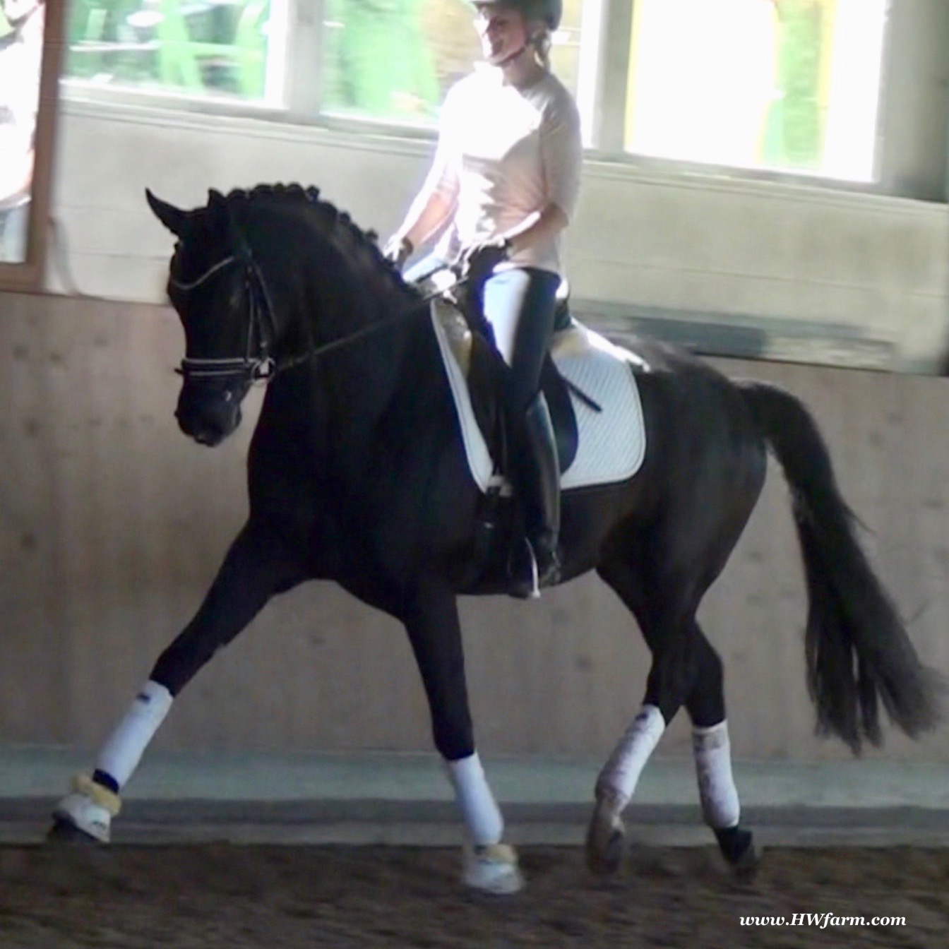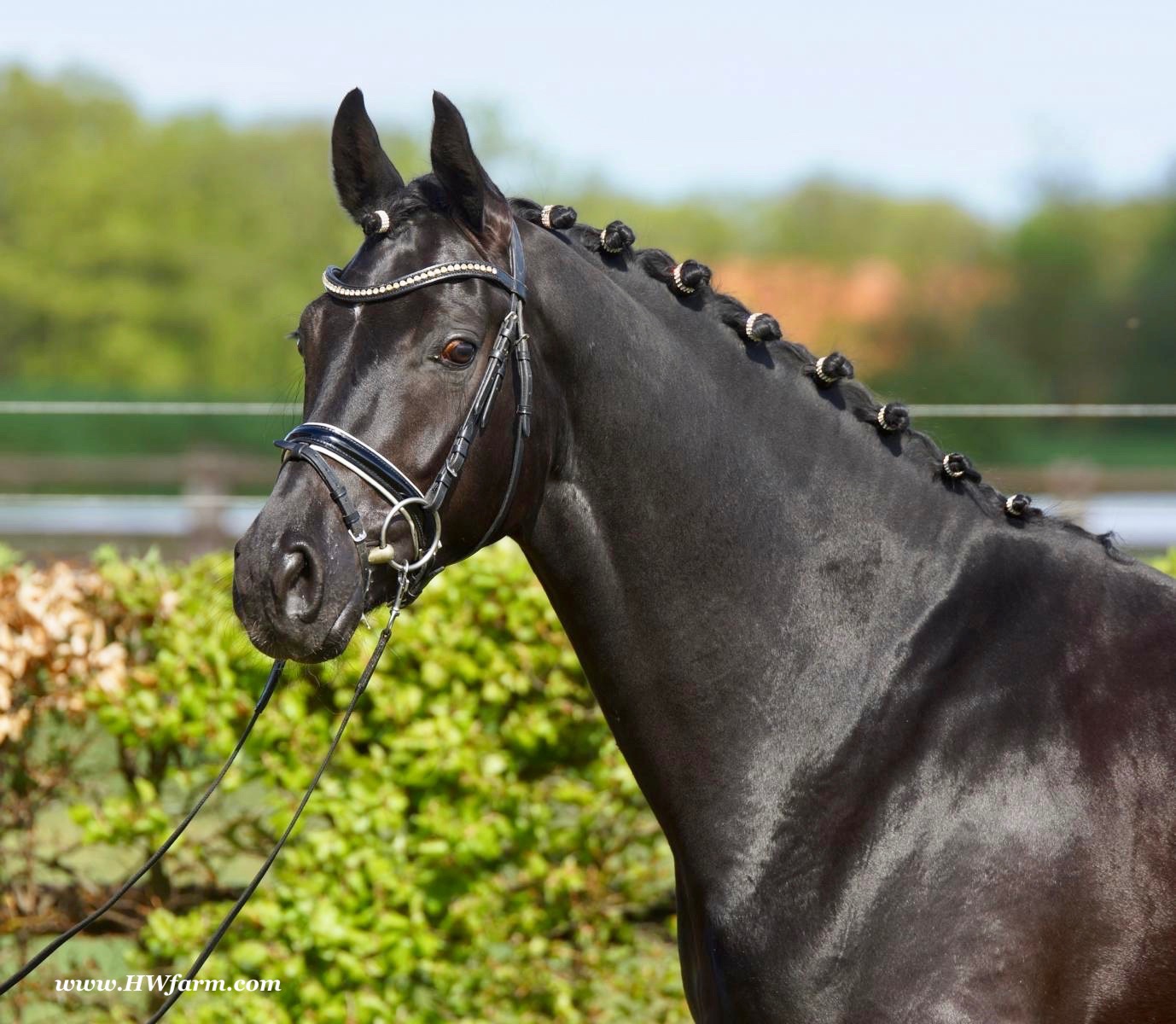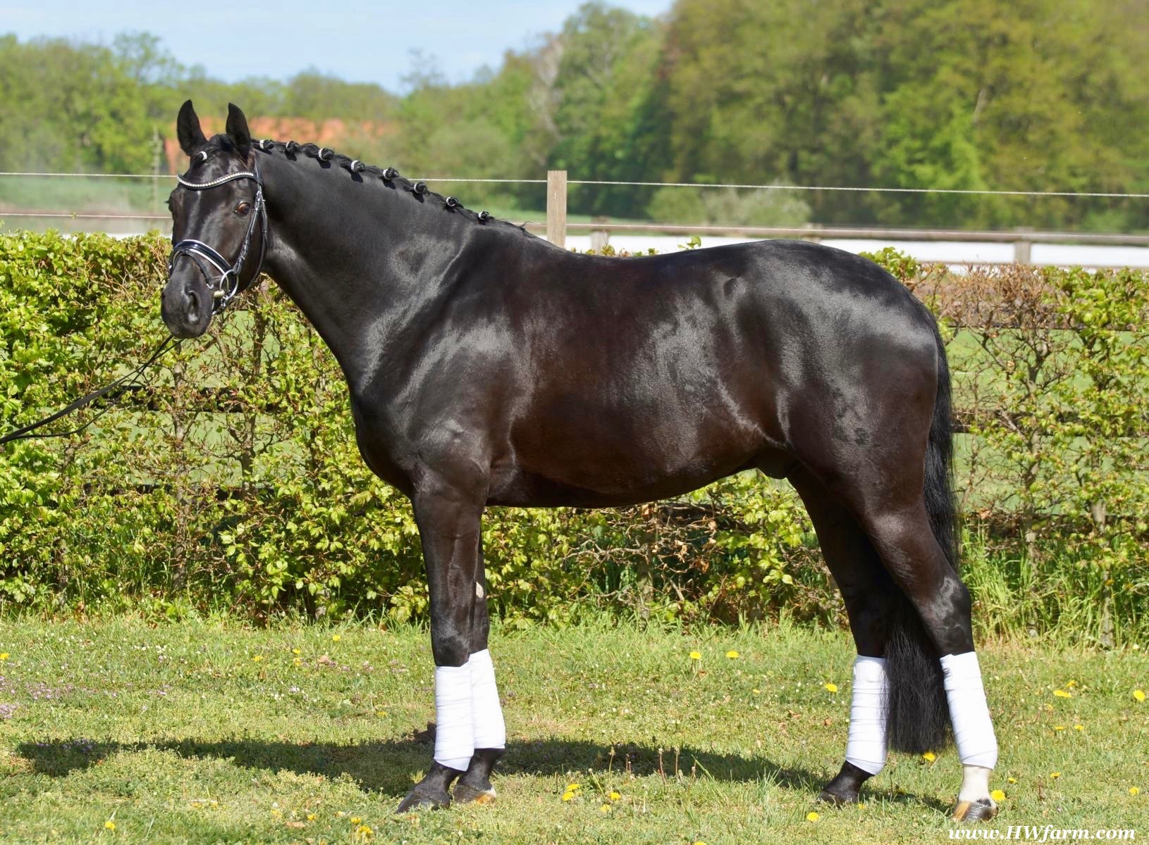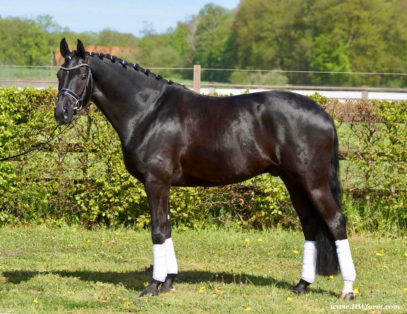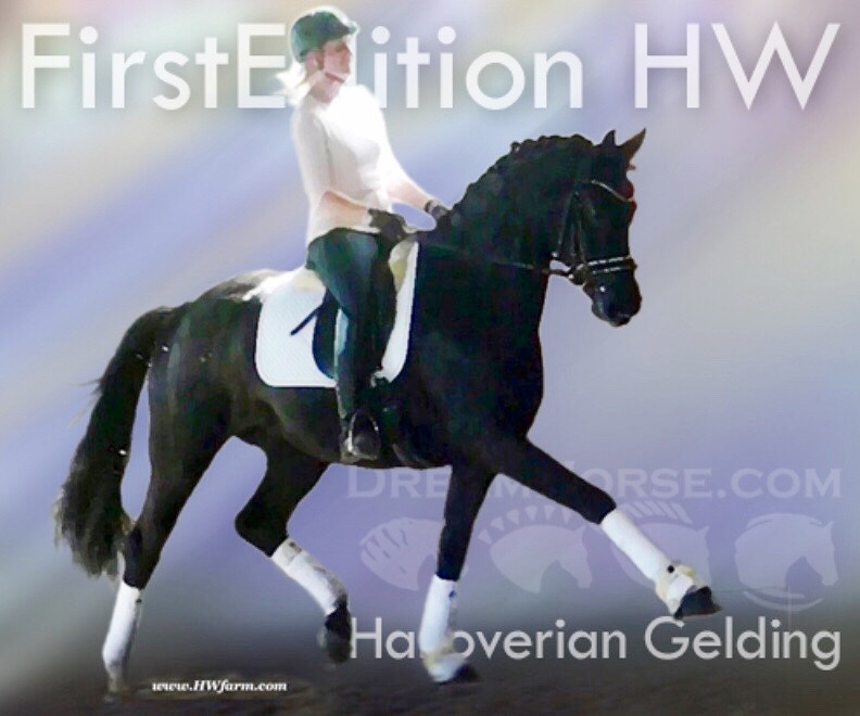 FirstEdition HW, black Hanoverian gelding, by Fuerst Romancier/ Bundeschampion Fidermark, born in 2015, standing approximately 169 cm or 16.2 hands. FirstEdition HW is by the famous stallion Fuerst Romancier - a stallion with world wide radiance. In dressage arenas, Fürst Romancier's offspring set the tone. After making his international debut at the CHIO Aachen, First Romance was unbeatable in the Burg Cup final with Dorothee Schneider. The Burg Cup finalist Fürst Levantino won the Future's Champion Cup in Hagen a.T.W. with Marlene Sieverding and Team Silver at the European Championships in Fontaine-bleau/FRA. Flying Dancer OLD/Dorothee Schneider, auction top price, was very well-placed at the World Championships for Young Horses. Best of Mount St. John OLD was Vice Regional Champion and fifth at the German National Championships. The Olden-burg Champion Mare, German Champion and P.S.I. auction top price Fasine OLD has already been placed in S-level (advanced) dressage competitions. Her two full broth-ers, For Romance I (licensing and main premium winner, top price of the Stallion Mar-ket, and Burg Cup finalist) and For Romance II (premium stallion) as well as Fürst Levantino and Fürst Jazz belong to the over 30 licensed sons of Fürst Romancier. Fürst Romancier was awarded the Oldenburg main premium. In 2009, he was fourth at the World Championships for Young Horses and at the Ger-man Championships, becoming the most successful stallion of his generation. His sire Fürst Heinrich, was Champion Stallion in 2001, winner of the main premium in 2002, World Champion of five-year-old dressage horses in 2003, and has produced 53 li-censed stallions, including Fürstenball, licensing and main premium champion, German champion and elite sire. His dam produced two other S-level dressage horses, Scarlatti (by San Amour) and Freestyler (v. Fürst Heinrich). The dam sire Romancier, successful up to Prix St. Georges, comes from the Olympian lineage of Dodona, from which de-scend Rembrandt/Nicole Uphoff, Ahlerich/Dr. Reiner Klimke, Amon and Rubinstein. Fürst Romancier represents the very successful Oldenburg Edoste line, from which also descend German Champion and European Championship participant Exupéry, Reserve German Champion Landjuwel Gold, Olympic Grand-Prix horse Petit Prince/Ellen Bontje/NED, Grand Prix horse Avignon and the international show-jumping winners Questa Vittoria/Thomas Kleis and Quintera/Leon Thijssen/NED.