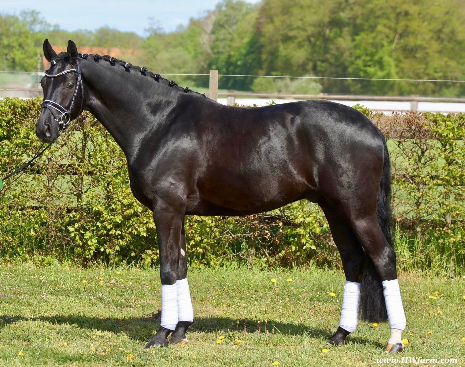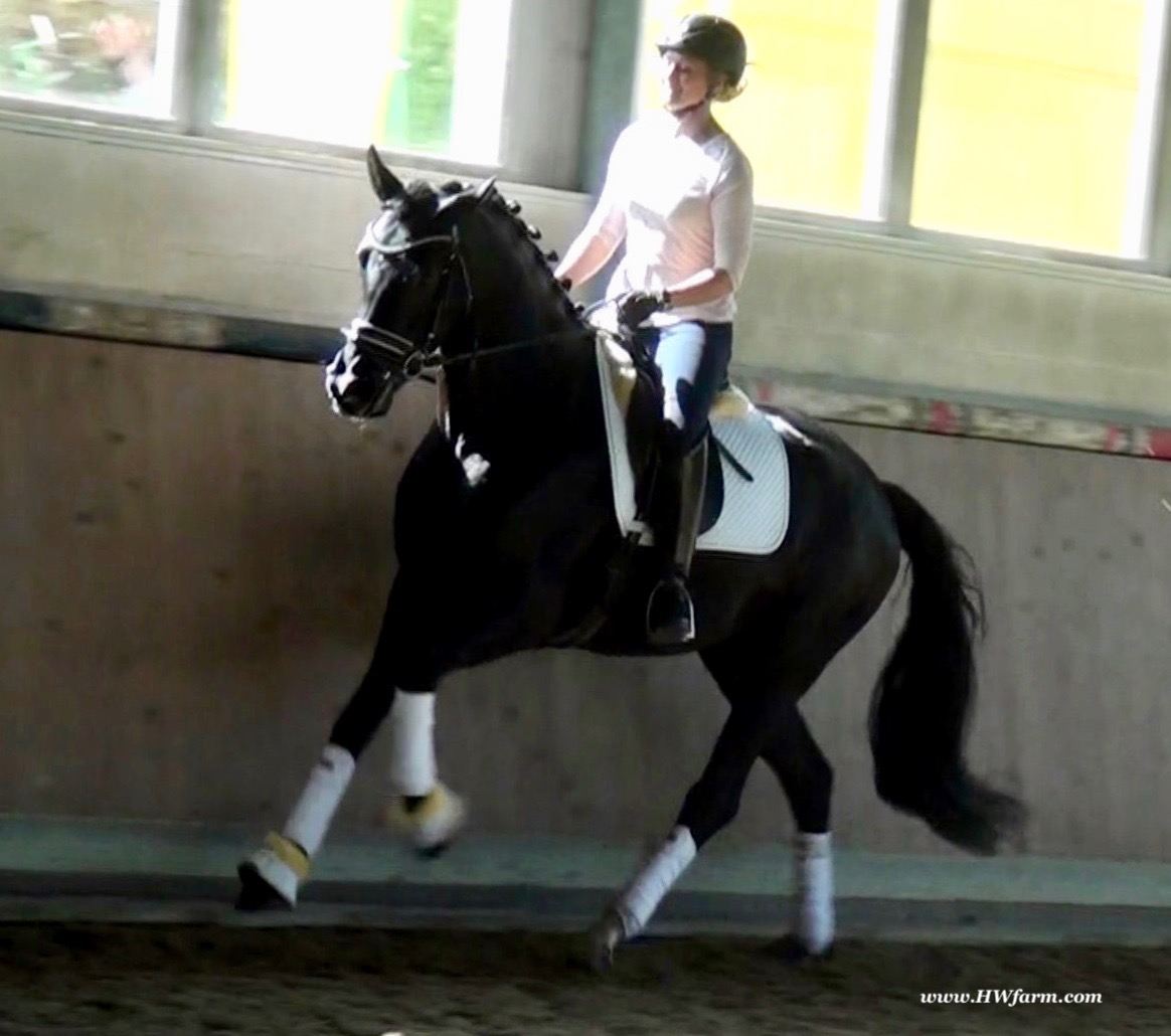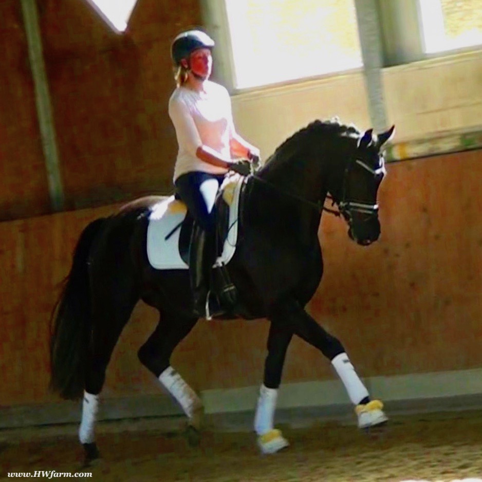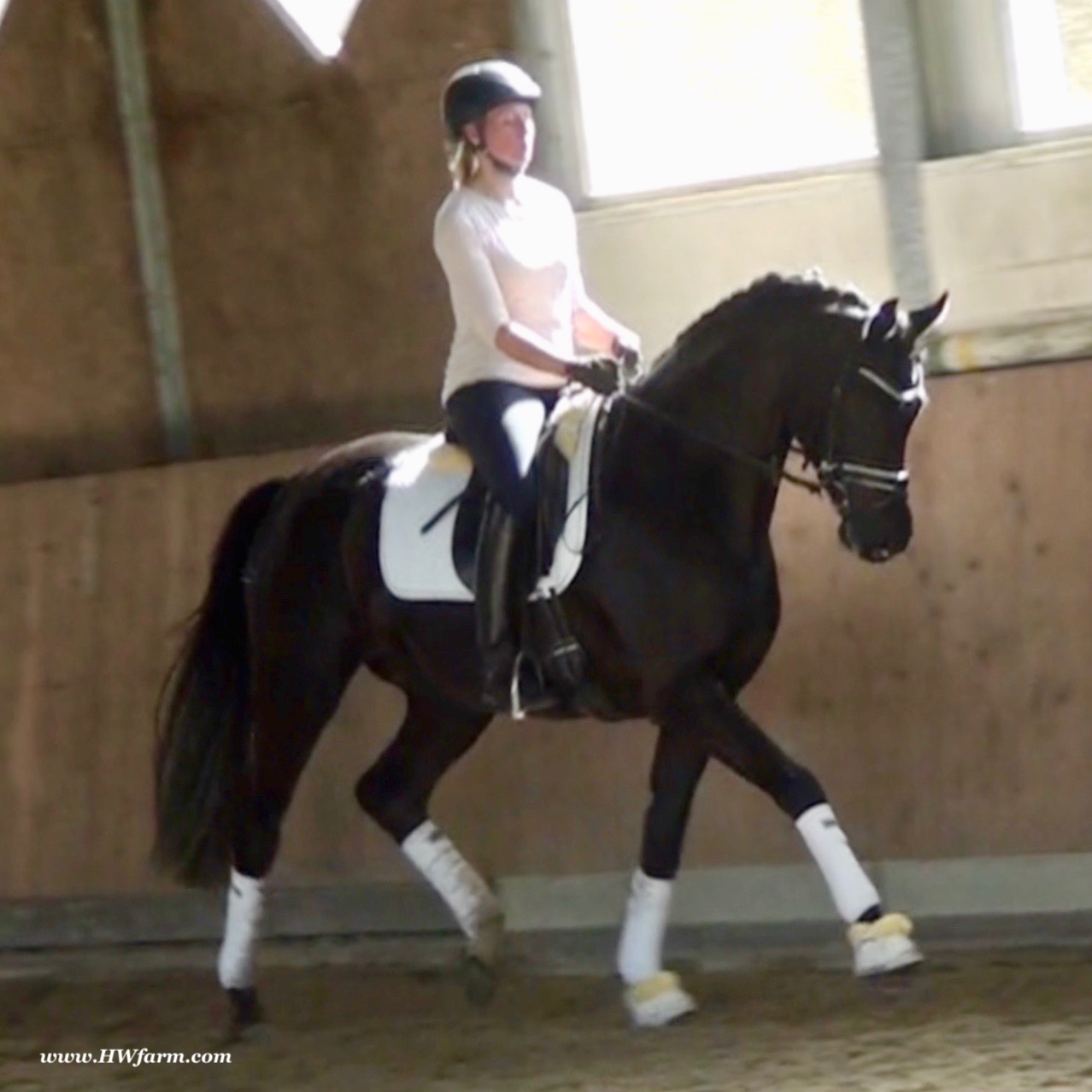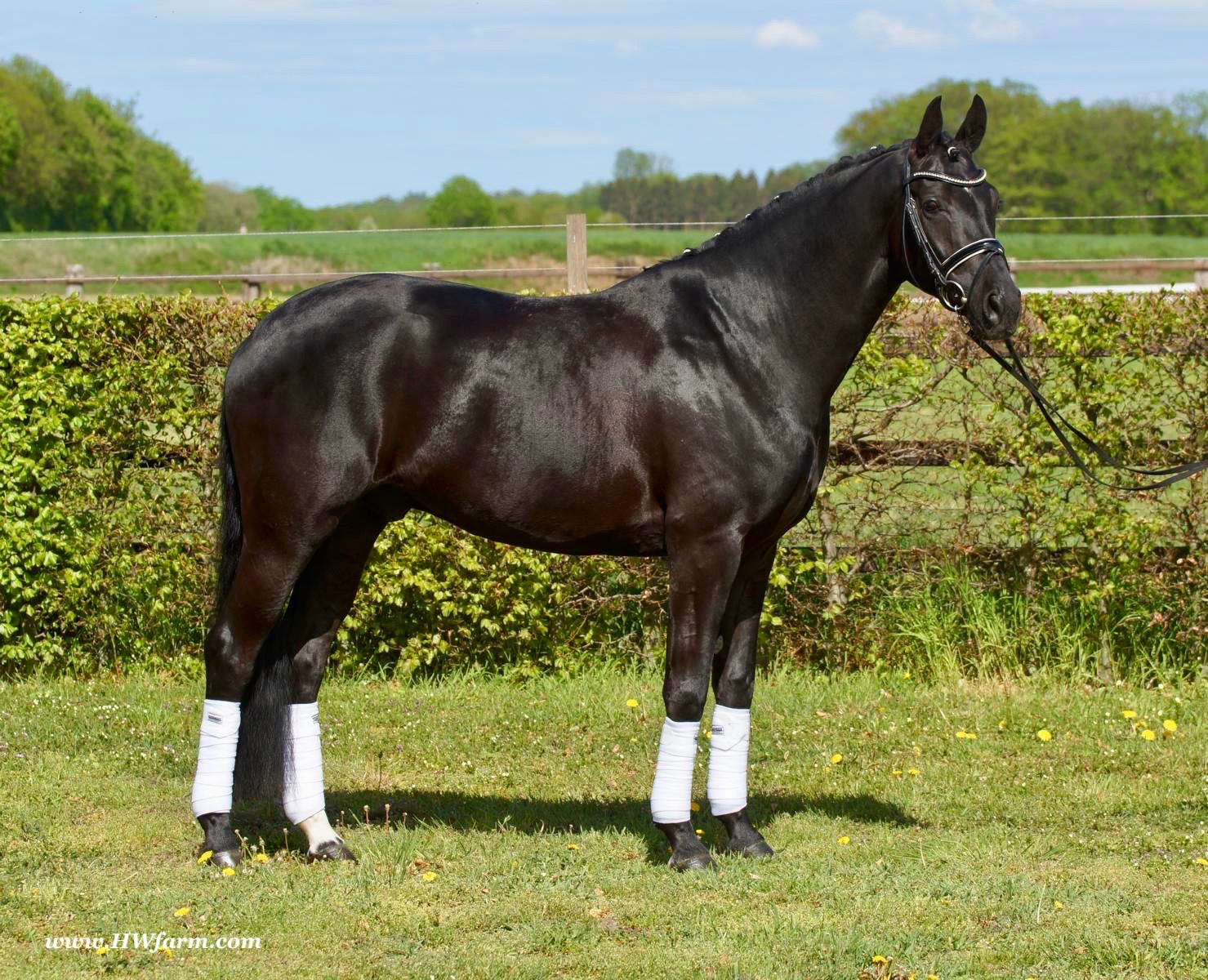 FirstEdition HW, black Hanoverian gelding, by Fuerst Romancier/ Bundeschampion Fidermark, born in 2015, standing approximately 169 cm or 16.2 hands. FirstEdition HW is by the famous stallion Fuerst Romancier - a stallion with world wide radiance. In dressage arenas, Fürst Romancier's offspring set the tone. After making his international debut at the CHIO Aachen, First Romance was unbeatable in the Burg Cup final with Dorothee Schneider. The Burg Cup finalist Fürst Levantino won the Future's Champion Cup in Hagen a.T.W. with Marlene Sieverding and Team Silver at the European Championships in Fontaine-bleau/FRA. Flying Dancer OLD/Dorothee Schneider, auction top price, was very well-placed at the World Championships for Young Horses. Best of Mount St. John OLD was Vice Regional Champion and fifth at the German National Championships. The Olden-burg Champion Mare, German Champion and P.S.I. auction top price Fasine OLD has already been placed in S-level (advanced) dressage competitions. Her two full broth-ers, For Romance I (licensing and main premium winner, top price of the Stallion Mar-ket, and Burg Cup finalist) and For Romance II (premium stallion) as well as Fürst Levantino and Fürst Jazz belong to the over 30 licensed sons of Fürst Romancier. Fürst Romancier was awarded the Oldenburg main premium. In 2009, he was fourth at the World Championships for Young Horses and at the Ger-man Championships, becoming the most successful stallion of his generation. His sire Fürst Heinrich, was Champion Stallion in 2001, winner of the main premium in 2002, World Champion of five-year-old dressage horses in 2003, and has produced 53 li-censed stallions, including Fürstenball, licensing and main premium champion, German champion and elite sire. His dam produced two other S-level dressage horses, Scarlatti (by San Amour) and Freestyler (v. Fürst Heinrich). The dam sire Romancier, successful up to Prix St. Georges, comes from the Olympian lineage of Dodona, from which de-scend Rembrandt/Nicole Uphoff, Ahlerich/Dr. Reiner Klimke, Amon and Rubinstein. Fürst Romancier represents the very successful Oldenburg Edoste line, from which also descend German Champion and European Championship participant Exupéry, Reserve German Champion Landjuwel Gold, Olympic Grand-Prix horse Petit Prince/Ellen Bontje/NED, Grand Prix horse Avignon and the international show-jumping winners Questa Vittoria/Thomas Kleis and Quintera/Leon Thijssen/NED.