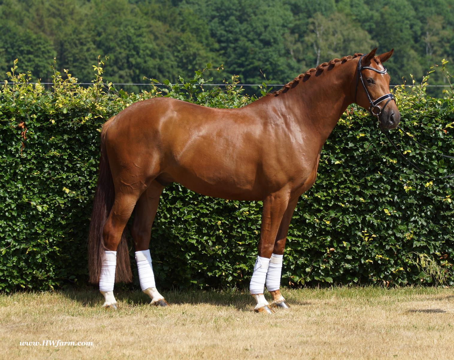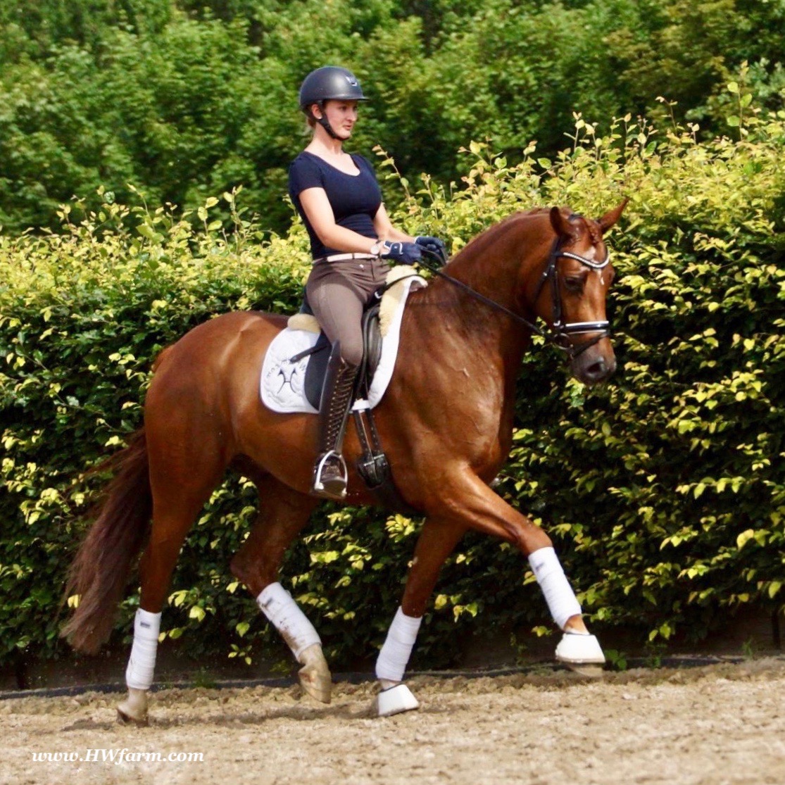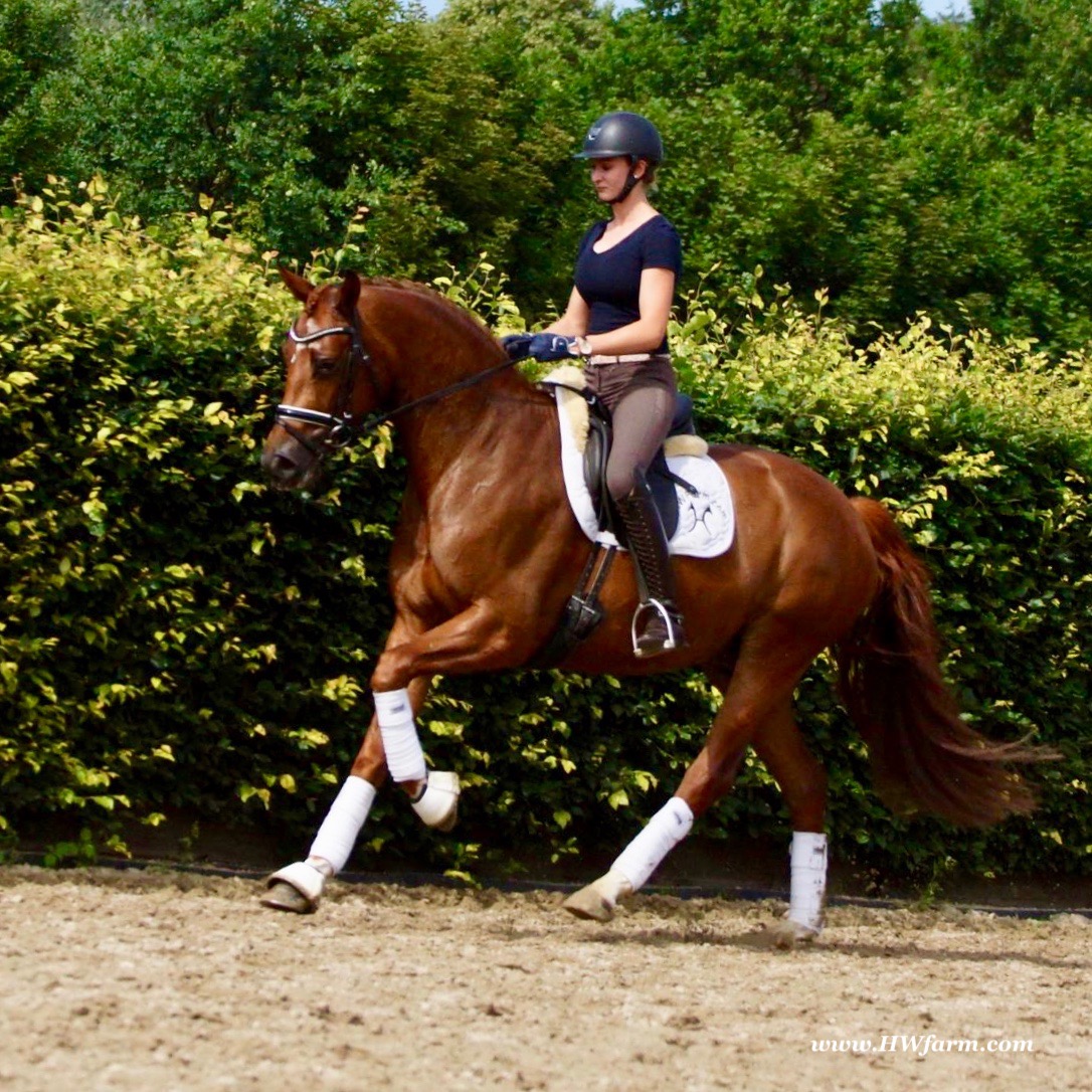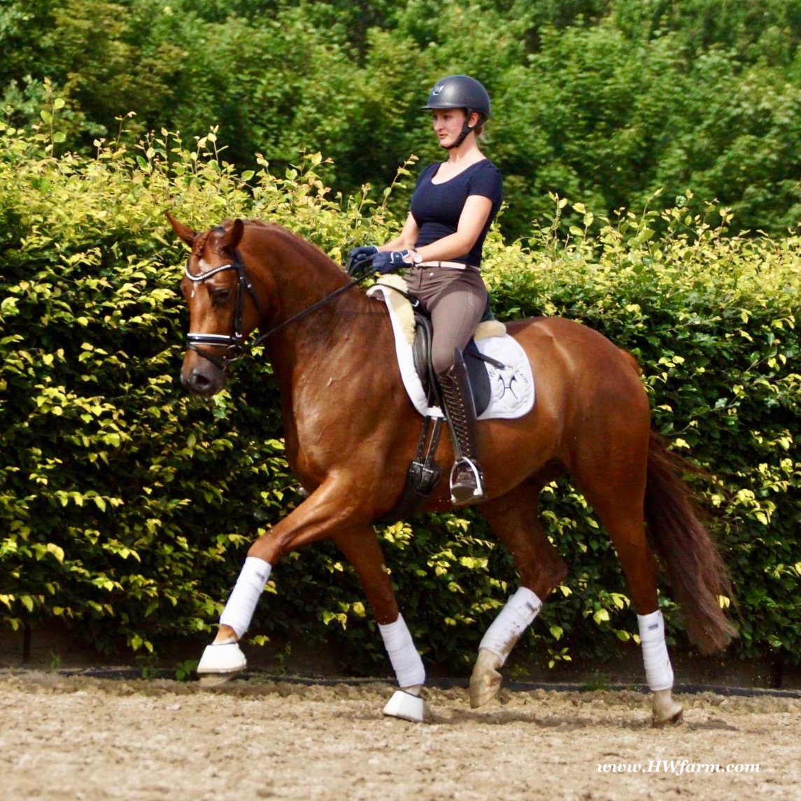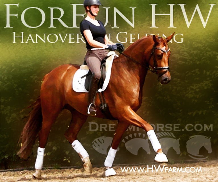 ForFun HW, chestnut Westphalian gelding, by For Romance (Fuerst Romancier / Sir Donnerhall II)/Bundeschampion Dresemann, born in 2014, standing approximately 169 cm or 16.2 hands. ForFun HW is by the famous stallion For Romance - the epitome of a model sire - and from a Voltaire dam line that has been accorded great success. Blessed with three excellent gaits, his canter and trot can only be described with superlatives and his character is also noteworthy. He stood out brilliantly in the strong lot of stallions at the 2011 Oldenburg Verband licensing and the enthusiastic spectators in Vechta gave him standing ovations. As expected, For Romance passed his 30-day test in Schlieckau with super scores. He received a 9.25 for his trot and rideability, a 9.0 for his canter and an 8.88 for character. In the third generation of his pedigree you find Don Schufro who took the Danish Champion title and won team bronze at the 2008 Olympic Games in Hong Kong under Andreas Helgstrand/DEN. He is also the sire of many champions. For Romance's dam line goes back to Voltaire, a Furioso II son who was well-known in breeding and sport the world over. This line is also the origin of the licensed stallions Dusty, Furinos and Platino as well as many international sport horses that were highly successful in show jumping as well as dressage. His sire, Fürst Romancier, was licensed in 2007 and made headlines just two years later when he took fourth place in the World Championships for young dressage horses in the class for five year olds and also fourth place at the Bundeschampionate in Warendorf. Matthias Alexander Rath has taken over Fürst Romancier's training, in 2012. For Romance's full sister Fasine took the Oldenburg Champion Mare title - a feat that is so far unique in the history of the Oldenburg Verband. The dam's sire, Sir Donnerhall I, gained trademark status early on in his career. He was the 2nd Reserve Champion at his licensing, State Champion, the record-breaking winner of his stallion performance test, Vice World Champion of young dressage horses and Bundeschampion as well as the main premium winner of stallions with emphasis on dressage. More than 50 of his sons have been licensed. In 2010, three of his progeny took Vice Bundeschampion titles in Warendorf: Silbermond - the NRW Champion Stallion, Appassionata and the licensed Snap Shot. He has also siree numerous top auction horses. Dresemann is ForFun HW's dam sire, a pitch black dance master, with fascinating in and exterior. He won the Bundeschampionate with the highest points (four 10's) ever given by judges at that show. An elegant gentleman, with an near unmatched movement. His bloodlines combine the famous Donnerhall and Weltmeyer lines, the most influential and important genes of the presence. The black sire Daidalos was Landesridinghorse Champion in Hanover/Bremen. He was successful in Dressage classes, winning under Heiner Schiergen all the way to the Bundeschampionat. Dresemann was the sensation at the Bundeschampionat 2002: Dresemann, under Elisabeth Niehues-Rembeck, a sight that will be unforgettable. He qualified already with the highest scores of 8.8 and it was obvious, that he would be in the finale. This dream in black, got the highest scores ever given out at the Bundeschamiopnat by the guest riders and was totally the sensation of the year: - Trot 10,0 - Canter 10,0 - Walk 8,5 - Conformation 9,5 - Overall Impression 9,5 - Guest Rider I 10,0 - Guest Rider II 10,0 After this perfect performance, he was named Bundeschampion of the 3 year old riding horse stallions, with a total of 67.5, followed by 2nd place with 63. What an obvious victory that was. His dam St. Pr. St. Whitney had a stellar mare performance test. Dam sire Wolkenstein II was the Bundeschampion and stallion performance test winner. His breeding index is the most successful of all Weltmeyer sons. The picture per-fect beautiful black Dresemann in third Generation was educated up to Grand Prix and a very highly sought after stallion in Celle as well as in France. The grand dam Gina is a sister to the famous Dillenburg stallion Grafenberg. Via Grenadier, Lugano I, Wöhler, Poet xx, Jason ox, he has the best genes you could be looking for. Keuring in NRW December Münster Handorf. This stellar stallion came in with a score of 8.33 as 3rd place out of 33 participants. His ride ability, trot and canter, were 1st place, no doubt. In the year 2003, he was victorious in many dressage horse classes. In 2004, Dresemann participated at the world young horse championships in Verden as well as being in the finale of the Bundeschampionat 5 year olds. In 2005 as well, Dreseman was able to continue his successful career, finale of the world championships of the young dressage horses in Verden as well as finale of the Bundeschampionships for 6 year old dressage horses. Dreseman then was highly placed all the way up to dressage horse classes Intermediare I. In 2007, his breeding index of 160 was one of the best in the riding horse books. In the meantime he was trained all the way to Grand Prix, there is no limit to what this horse can do. ForFun HW himself, is a stunning horse has all the personality a person could ever hope for, he's easy to ride and handle, no wonder with these bloodlines!!! ForFun HW is already at second level, with fluent counter canter and the flying changes will be easy for him. This boy is far advanced in his training and he shows super nice extensions and airtime. Check out his amazing hind leg, reaching far under his body and lifting it up in the air with ease. He just glides and barely touches the ground. Ridden inside and outside, always giving 100%, no matter what he's asked to do. He loves to please his handler and rider, to learn new things is his hobby. This sweet boy, enjoys to work eagerly under saddle. All concentrated on his job in the dressage arena and with his quick hind leg, passage and piaffe will come naturally to him. ForFun HW is supple and