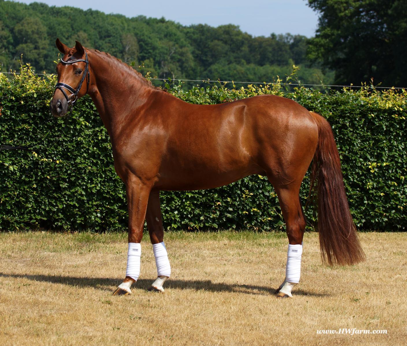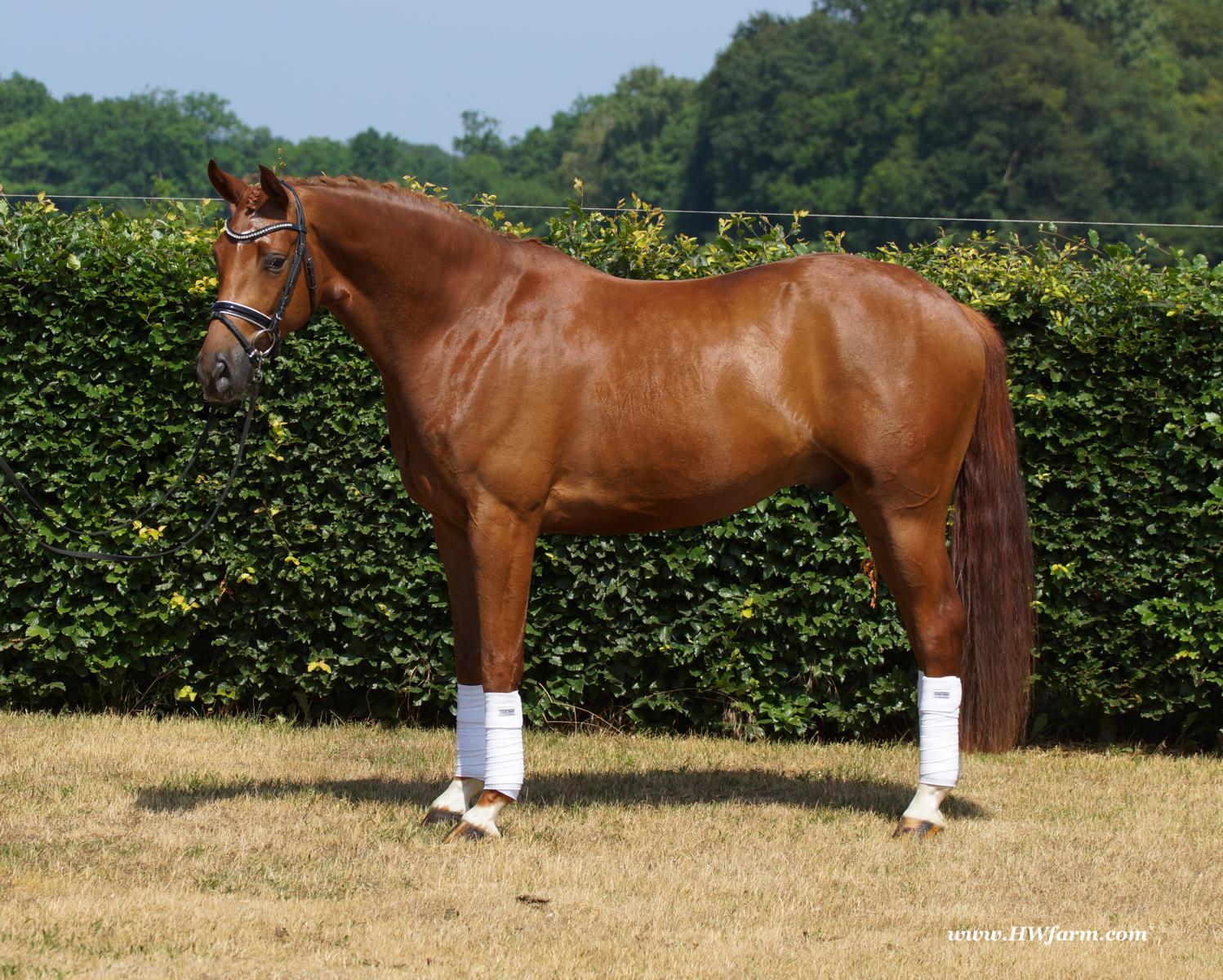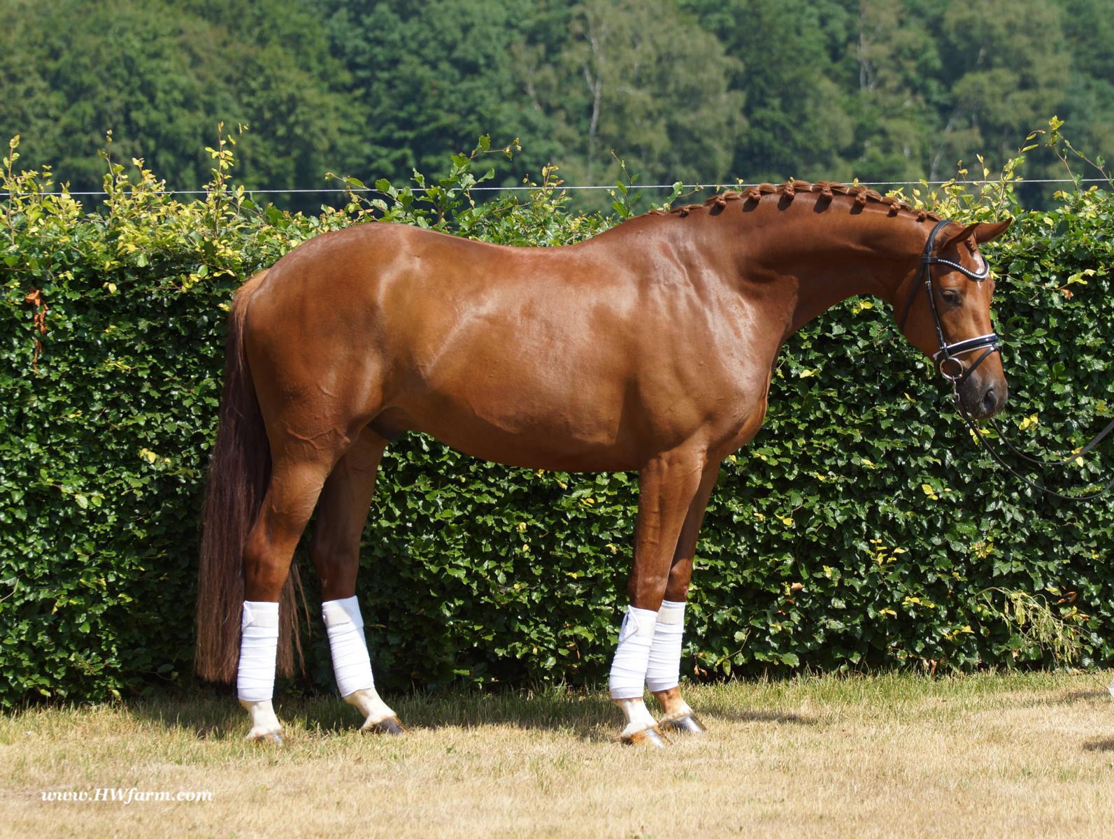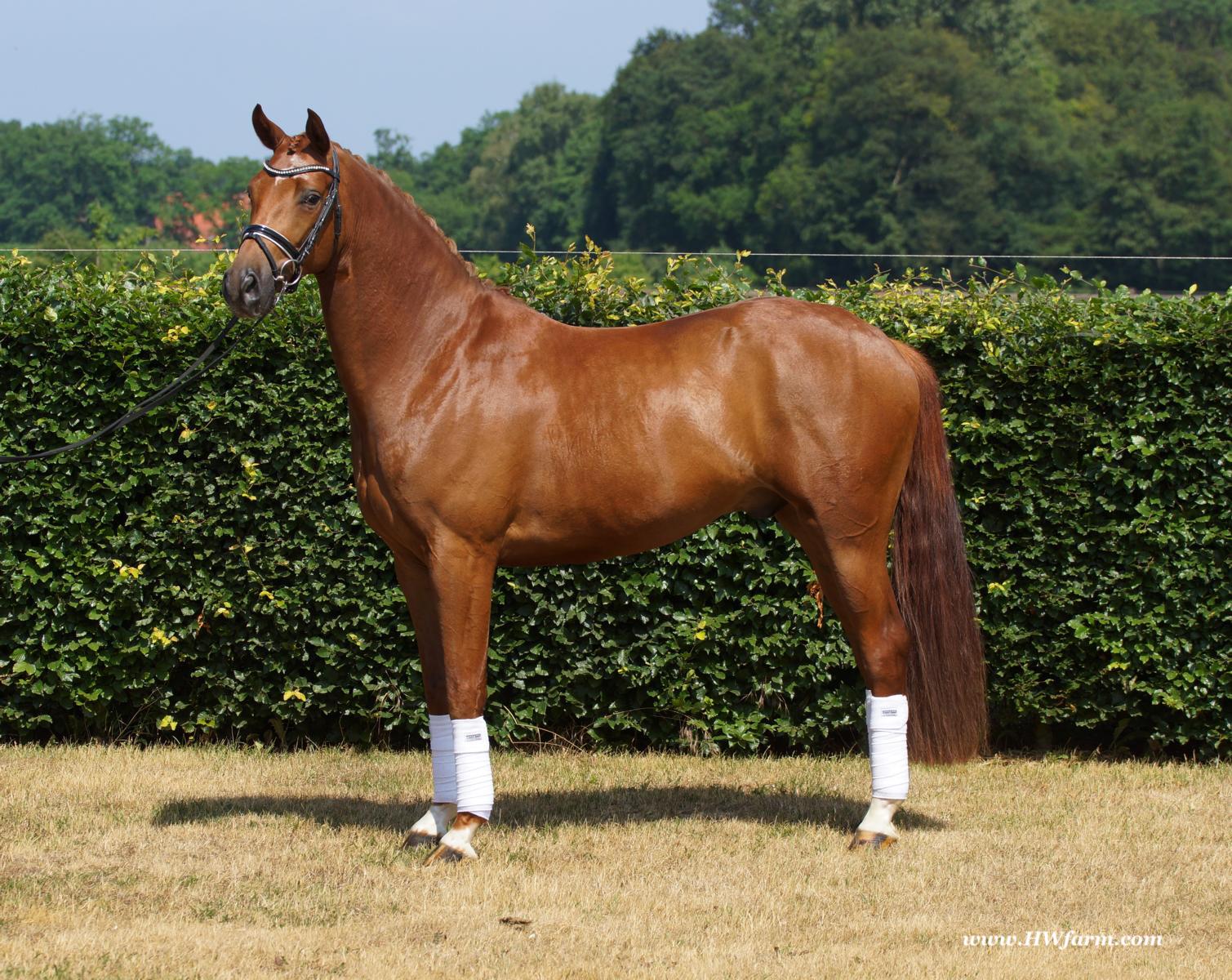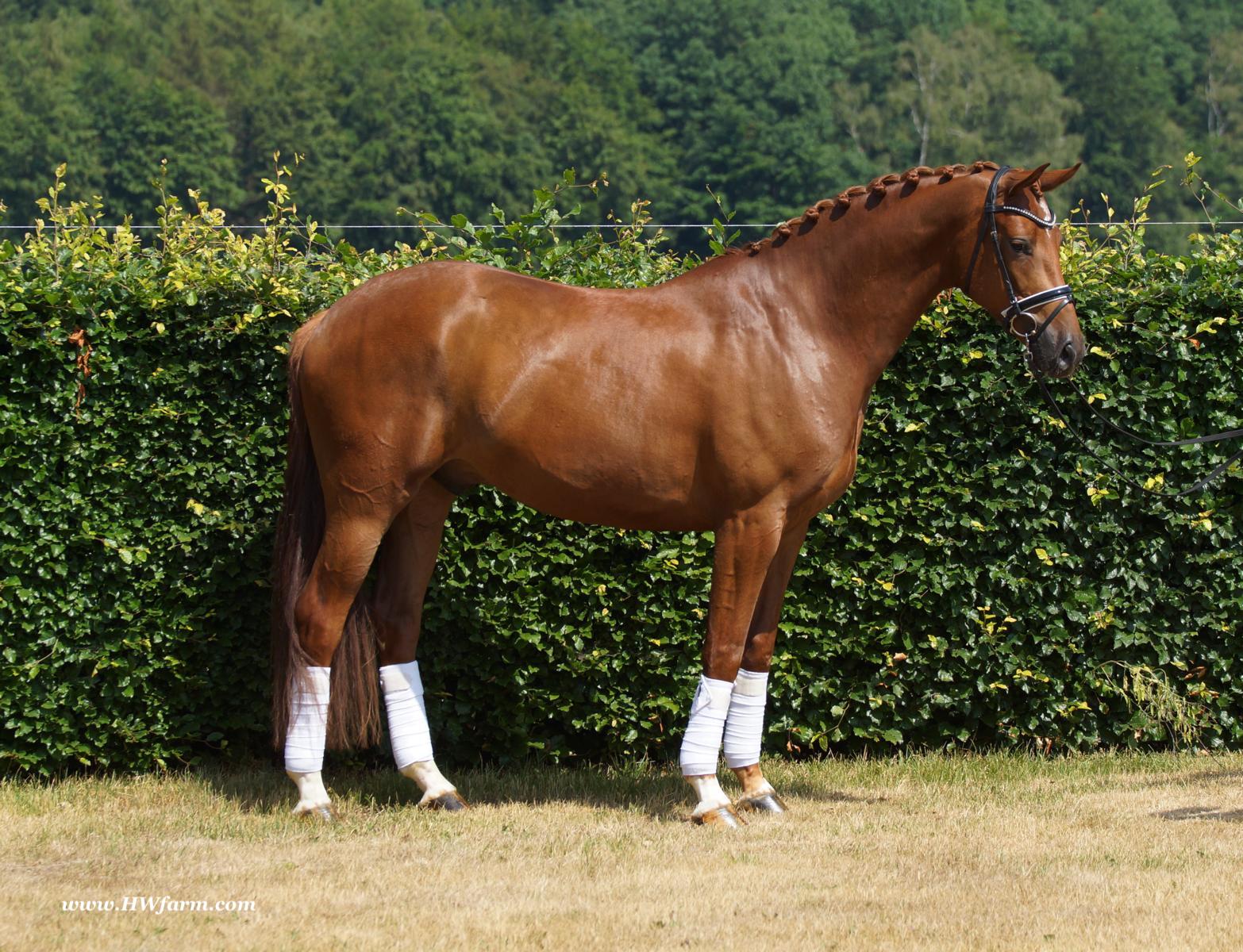 ForFun HW, chestnut Westphalian gelding, by For Romance (Fuerst Romancier / Sir Donnerhall II)/Bundeschampion Dresemann, born in 2014, standing approximately 169 cm or 16.2 hands. ForFun HW is by the famous stallion For Romance - the epitome of a model sire - and from a Voltaire dam line that has been accorded great success. Blessed with three excellent gaits, his canter and trot can only be described with superlatives and his character is also noteworthy. He stood out brilliantly in the strong lot of stallions at the 2011 Oldenburg Verband licensing and the enthusiastic spectators in Vechta gave him standing ovations. As expected, For Romance passed his 30-day test in Schlieckau with super scores. He received a 9.25 for his trot and rideability, a 9.0 for his canter and an 8.88 for character. In the third generation of his pedigree you find Don Schufro who took the Danish Champion title and won team bronze at the 2008 Olympic Games in Hong Kong under Andreas Helgstrand/DEN. He is also the sire of many champions. For Romance's dam line goes back to Voltaire, a Furioso II son who was well-known in breeding and sport the world over. This line is also the origin of the licensed stallions Dusty, Furinos and Platino as well as many international sport horses that were highly successful in show jumping as well as dressage. His sire, Fürst Romancier, was licensed in 2007 and made headlines just two years later when he took fourth place in the World Championships for young dressage horses in the class for five year olds and also fourth place at the Bundeschampionate in Warendorf. Matthias Alexander Rath has taken over Fürst Romancier's training, in 2012. For Romance's full sister Fasine took the Oldenburg Champion Mare title - a feat that is so far unique in the history of the Oldenburg Verband. The dam's sire, Sir Donnerhall I, gained trademark status early on in his career. He was the 2nd Reserve Champion at his licensing, State Champion, the record-breaking winner of his stallion performance test, Vice World Champion of young dressage horses and Bundeschampion as well as the main premium winner of stallions with emphasis on dressage. More than 50 of his sons have been licensed. In 2010, three of his progeny took Vice Bundeschampion titles in Warendorf: Silbermond - the NRW Champion Stallion, Appassionata and the licensed Snap Shot. He has also siree numerous top auction horses. Dresemann is ForFun HW's dam sire, a pitch black dance master, with fascinating in and exterior. He won the Bundeschampionate with the highest points (four 10's) ever given by judges at that show. An elegant gentleman, with an near unmatched movement. His bloodlines combine the famous Donnerhall and Weltmeyer lines, the most influential and important genes of the presence. The black sire Daidalos was Landesridinghorse Champion in Hanover/Bremen. He was successful in Dressage classes, winning under Heiner Schiergen all the way to the Bundeschampionat. Dresemann was the sensation at the Bundeschampionat 2002: Dresemann, under Elisabeth Niehues-Rembeck, a sight that will be unforgettable. He qualified already with the highest scores of 8.8 and it was obvious, that he would be in the finale. This dream in black, got the highest scores ever given out at the Bundeschamiopnat by the guest riders and was totally the sensation of the year: - Trot 10,0 - Canter 10,0 - Walk 8,5 - Conformation 9,5 - Overall Impression 9,5 - Guest Rider I 10,0 - Guest Rider II 10,0 After this perfect performance, he was named Bundeschampion of the 3 year old riding horse stallions, with a total of 67.5, followed by 2nd place with 63. What an obvious victory that was. His dam St. Pr. St. Whitney had a stellar mare performance test. Dam sire Wolkenstein II was the Bundeschampion and stallion performance test winner. His breeding index is the most successful of all Weltmeyer sons. The picture per-fect beautiful black Dresemann in third Generation was educated up to Grand Prix and a very highly sought after stallion in Celle as well as in France. The grand dam Gina is a sister to the famous Dillenburg stallion Grafenberg. Via Grenadier, Lugano I, Wöhler, Poet xx, Jason ox, he has the best genes you could be looking for. Keuring in NRW December Münster Handorf. This stellar stallion came in with a score of 8.33 as 3rd place out of 33 participants. His ride ability, trot and canter, were 1st place, no doubt. In the year 2003, he was victorious in many dressage horse classes. In 2004, Dresemann participated at the world young horse championships in Verden as well as being in the finale of the Bundeschampionat 5 year olds. In 2005 as well, Dreseman was able to continue his successful career, finale of the world championships of the young dressage horses in Verden as well as finale of the Bundeschampionships for 6 year old dressage horses. Dreseman then was highly placed all the way up to dressage horse classes Intermediare I. In 2007, his breeding index of 160 was one of the best in the riding horse books. In the meantime he was trained all the way to Grand Prix, there is no limit to what this horse can do. ForFun HW himself, is a stunning horse has all the personality a person could ever hope for, he's easy to ride and handle, no wonder with these bloodlines!!! ForFun HW is already at second level, with fluent counter canter and the flying changes will be easy for him. This boy is far advanced in his training and he shows super nice extensions and airtime. Check out his amazing hind leg, reaching far under his body and lifting it up in the air with ease. He just glides and barely touches the ground. Ridden inside and outside, always giving 100%, no matter what he's asked to do. He loves to please his handler and rider, to learn new things is his hobby. This sweet boy, enjoys to work eagerly under saddle. All concentrated on his job in the dressage arena and with his quick hind leg, passage and piaffe will come naturally to him. ForFun HW is supple and