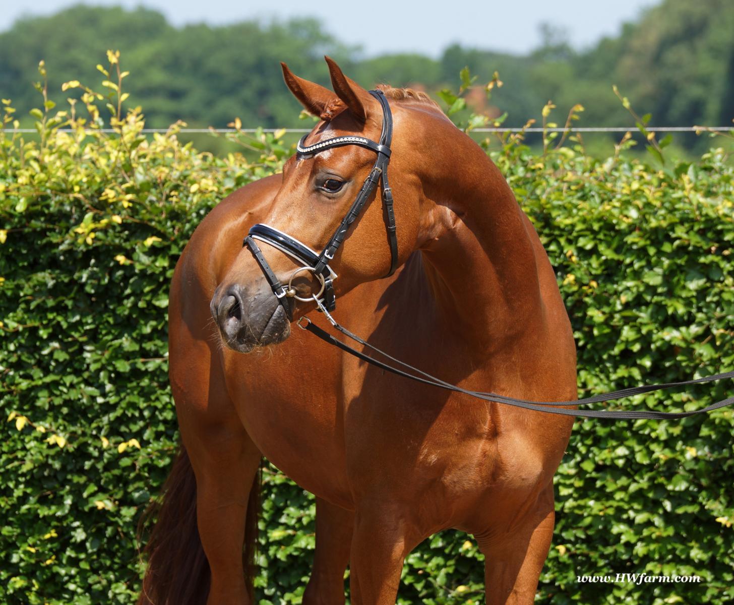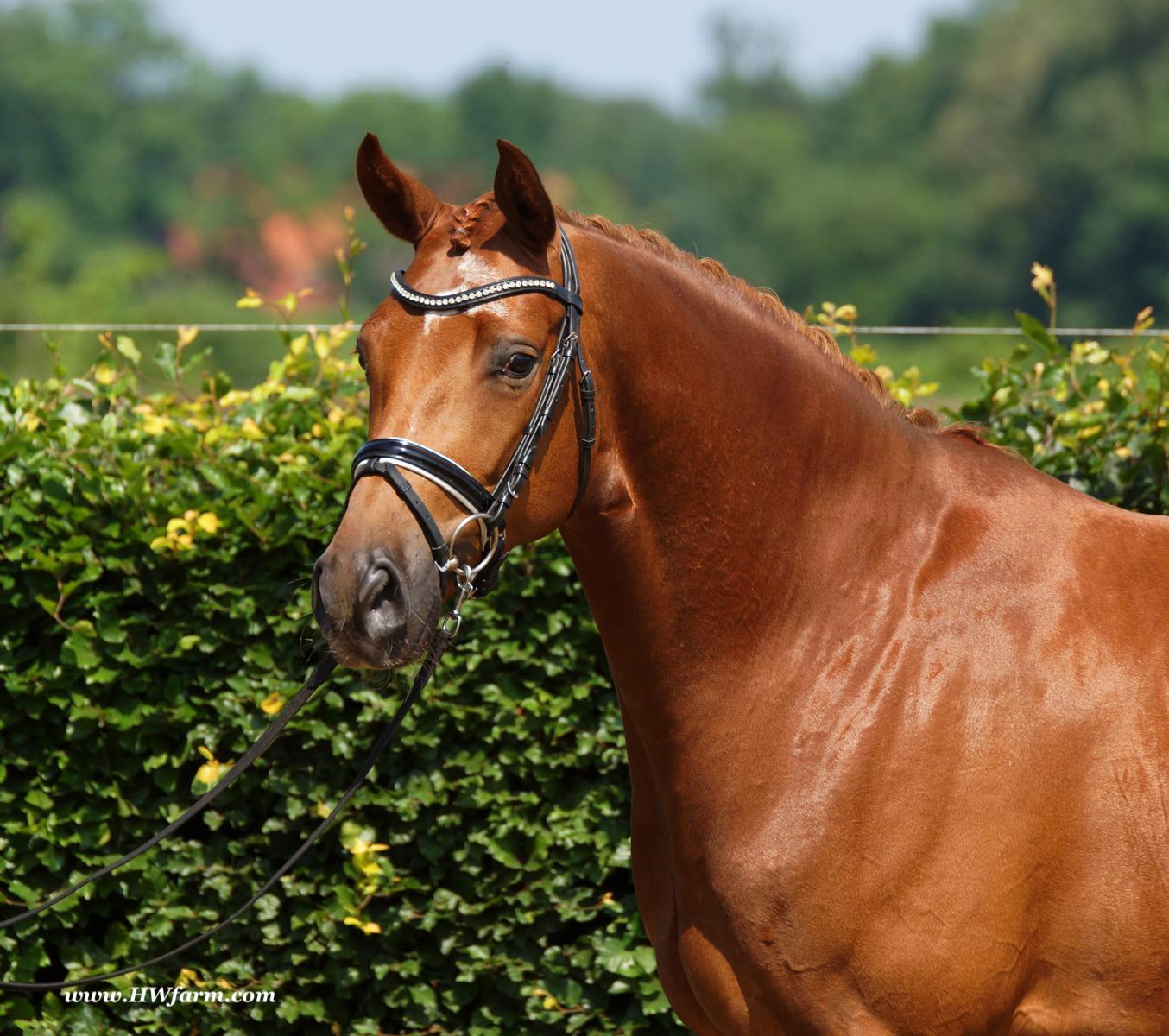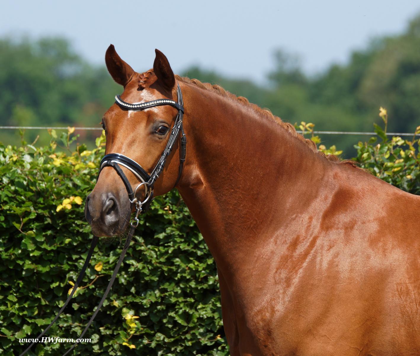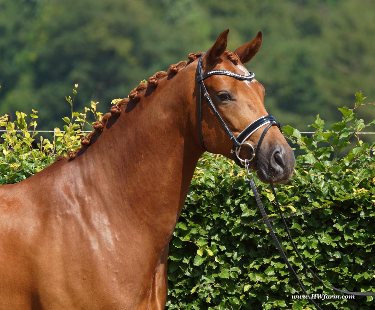 ForFun HW, chestnut Westphalian gelding, by For Romance (Fuerst Romancier / Sir Donnerhall II)/Bundeschampion Dresemann, born in 2014, standing approximately 169 cm or 16.2 hands. ForFun HW is by the famous stallion For Romance - the epitome of a model sire - and from a Voltaire dam line that has been accorded great success. Blessed with three excellent gaits, his canter and trot can only be described with superlatives and his character is also noteworthy. He stood out brilliantly in the strong lot of stallions at the 2011 Oldenburg Verband licensing and the enthusiastic spectators in Vechta gave him standing ovations. As expected, For Romance passed his 30-day test in Schlieckau with super scores. He received a 9.25 for his trot and rideability, a 9.0 for his canter and an 8.88 for character. In the third generation of his pedigree you find Don Schufro who took the Danish Champion title and won team bronze at the 2008 Olympic Games in Hong Kong under Andreas Helgstrand/DEN. He is also the sire of many champions. For Romance's dam line goes back to Voltaire, a Furioso II son who was well-known in breeding and sport the world over. This line is also the origin of the licensed stallions Dusty, Furinos and Platino as well as many international sport horses that were highly successful in show jumping as well as dressage. His sire, Fürst Romancier, was licensed in 2007 and made headlines just two years later when he took fourth place in the World Championships for young dressage horses in the class for five year olds and also fourth place at the Bundeschampionate in Warendorf. Matthias Alexander Rath has taken over Fürst Romancier's training, in 2012. For Romance's full sister Fasine took the Oldenburg Champion Mare title - a feat that is so far unique in the history of the Oldenburg Verband. The dam's sire, Sir Donnerhall I, gained trademark status early on in his career. He was the 2nd Reserve Champion at his licensing, State Champion, the record-breaking winner of his stallion performance test, Vice World Champion of young dressage horses and Bundeschampion as well as the main premium winner of stallions with emphasis on dressage. More than 50 of his sons have been licensed. In 2010, three of his progeny took Vice Bundeschampion titles in Warendorf: Silbermond - the NRW Champion Stallion, Appassionata and the licensed Snap Shot. He has also siree numerous top auction horses. Dresemann is ForFun HW's dam sire, a pitch black dance master, with fascinating in and exterior. He won the Bundeschampionate with the highest points (four 10's) ever given by judges at that show. An elegant gentleman, with an near unmatched movement. His bloodlines combine the famous Donnerhall and Weltmeyer lines, the most influential and important genes of the presence. The black sire Daidalos was Landesridinghorse Champion in Hanover/Bremen. He was successful in Dressage classes, winning under Heiner Schiergen all the way to the Bundeschampionat. Dresemann was the sensation at the Bundeschampionat 2002: Dresemann, under Elisabeth Niehues-Rembeck, a sight that will be unforgettable. He qualified already with the highest scores of 8.8 and it was obvious, that he would be in the finale. This dream in black, got the highest scores ever given out at the Bundeschamiopnat by the guest riders and was totally the sensation of the year: - Trot 10,0 - Canter 10,0 - Walk 8,5 - Conformation 9,5 - Overall Impression 9,5 - Guest Rider I 10,0 - Guest Rider II 10,0 After this perfect performance, he was named Bundeschampion of the 3 year old riding horse stallions, with a total of 67.5, followed by 2nd place with 63. What an obvious victory that was. His dam St. Pr. St. Whitney had a stellar mare performance test. Dam sire Wolkenstein II was the Bundeschampion and stallion performance test winner. His breeding index is the most successful of all Weltmeyer sons. The picture per-fect beautiful black Dresemann in third Generation was educated up to Grand Prix and a very highly sought after stallion in Celle as well as in France. The grand dam Gina is a sister to the famous Dillenburg stallion Grafenberg. Via Grenadier, Lugano I, Wöhler, Poet xx, Jason ox, he has the best genes you could be looking for. Keuring in NRW December Münster Handorf. This stellar stallion came in with a score of 8.33 as 3rd place out of 33 participants. His ride ability, trot and canter, were 1st place, no doubt. In the year 2003, he was victorious in many dressage horse classes. In 2004, Dresemann participated at the world young horse championships in Verden as well as being in the finale of the Bundeschampionat 5 year olds. In 2005 as well, Dreseman was able to continue his successful career, finale of the world championships of the young dressage horses in Verden as well as finale of the Bundeschampionships for 6 year old dressage horses. Dreseman then was highly placed all the way up to dressage horse classes Intermediare I. In 2007, his breeding index of 160 was one of the best in the riding horse books. In the meantime he was trained all the way to Grand Prix, there is no limit to what this horse can do. ForFun HW himself, is a stunning horse has all the personality a person could ever hope for, he's easy to ride and handle, no wonder with these bloodlines!!! ForFun HW is already at second level, with fluent counter canter and the flying changes will be easy for him. This boy is far advanced in his training and he shows super nice extensions and airtime. Check out his amazing hind leg, reaching far under his body and lifting it up in the air with ease. He just glides and barely touches the ground. Ridden inside and outside, always giving 100%, no matter what he's asked to do. He loves to please his handler and rider, to learn new things is his hobby. This sweet boy, enjoys to work eagerly under saddle. All concentrated on his job in the dressage arena and with his quick hind leg, passage and piaffe will come naturally to him. ForFun HW is supple and